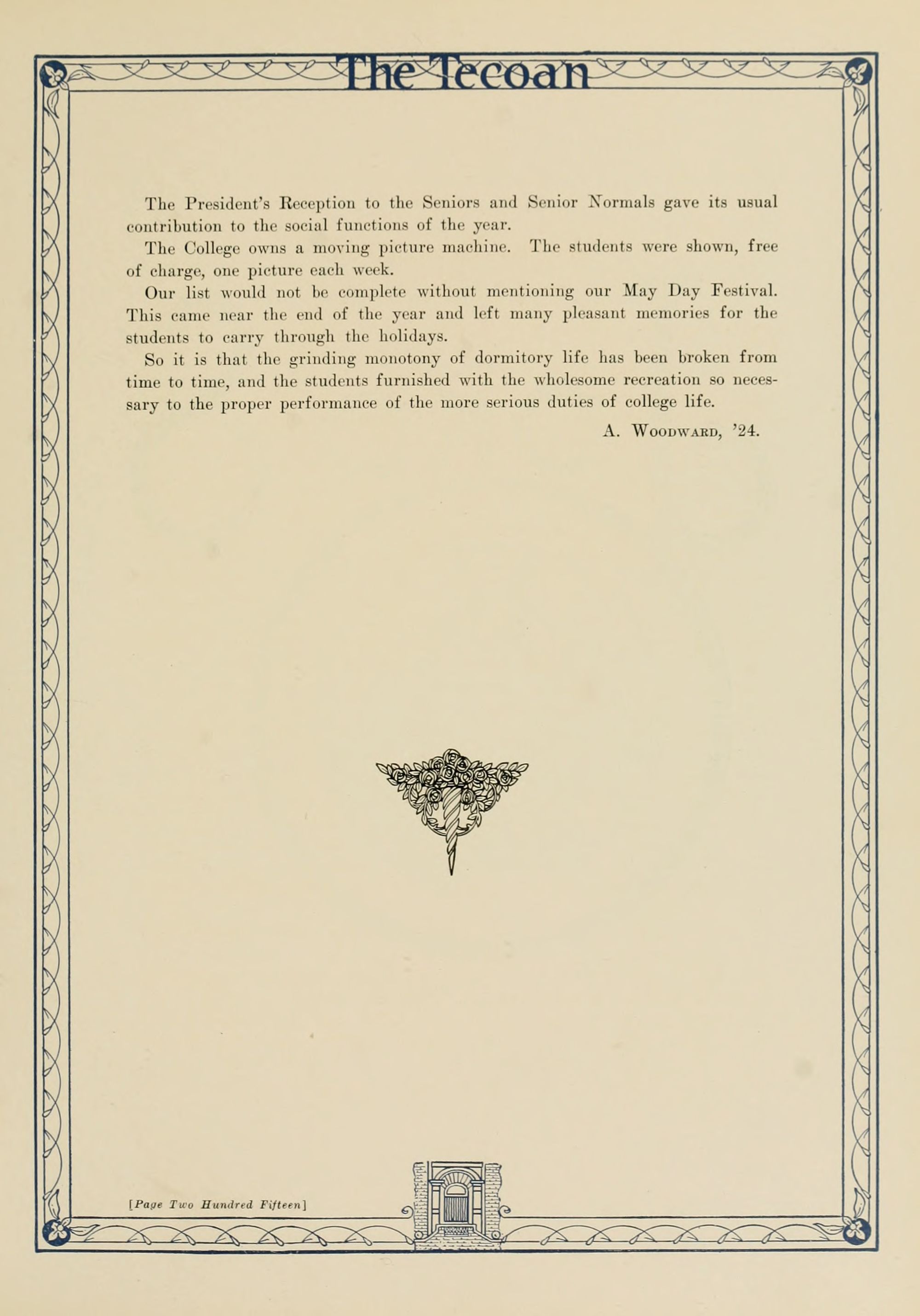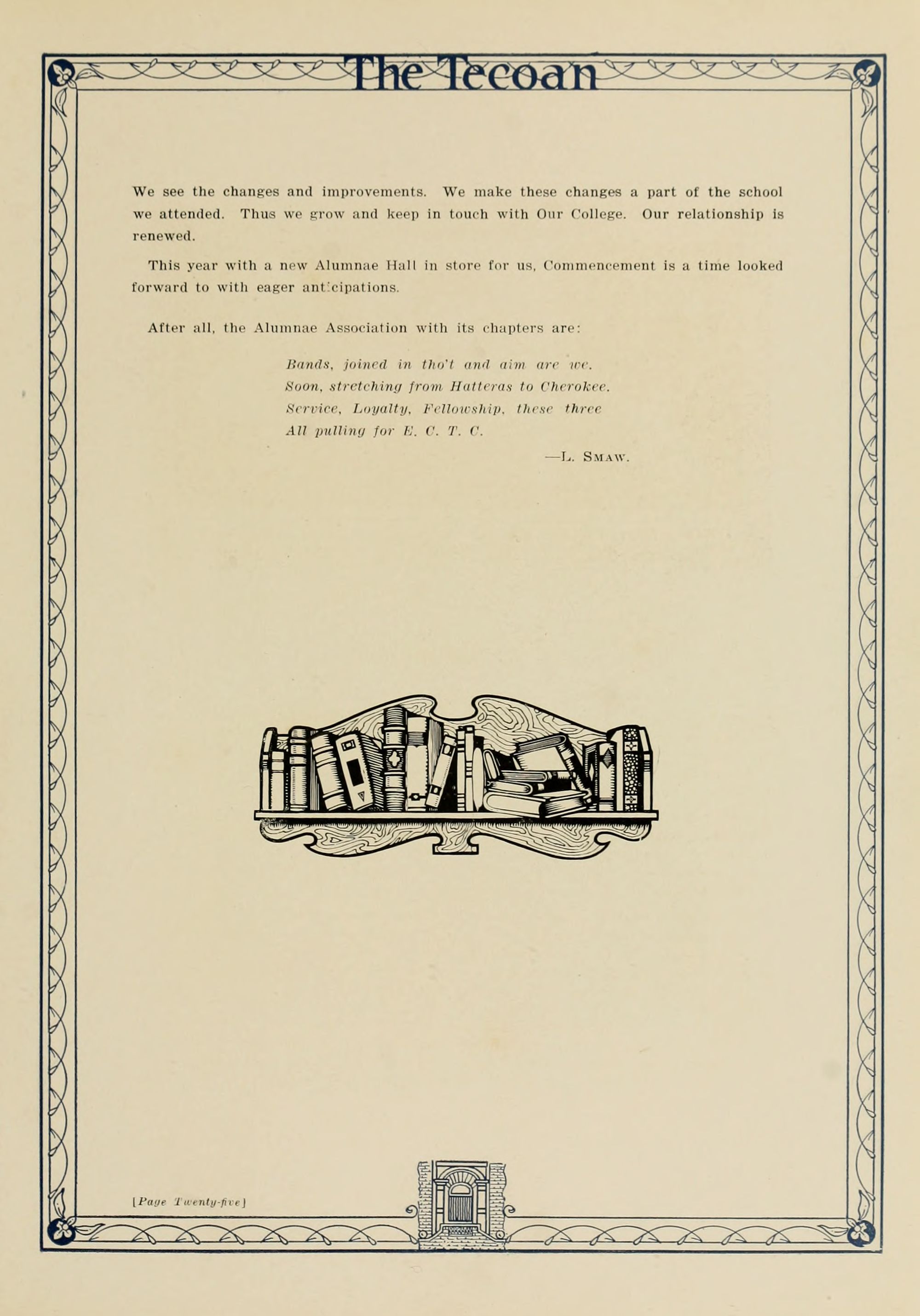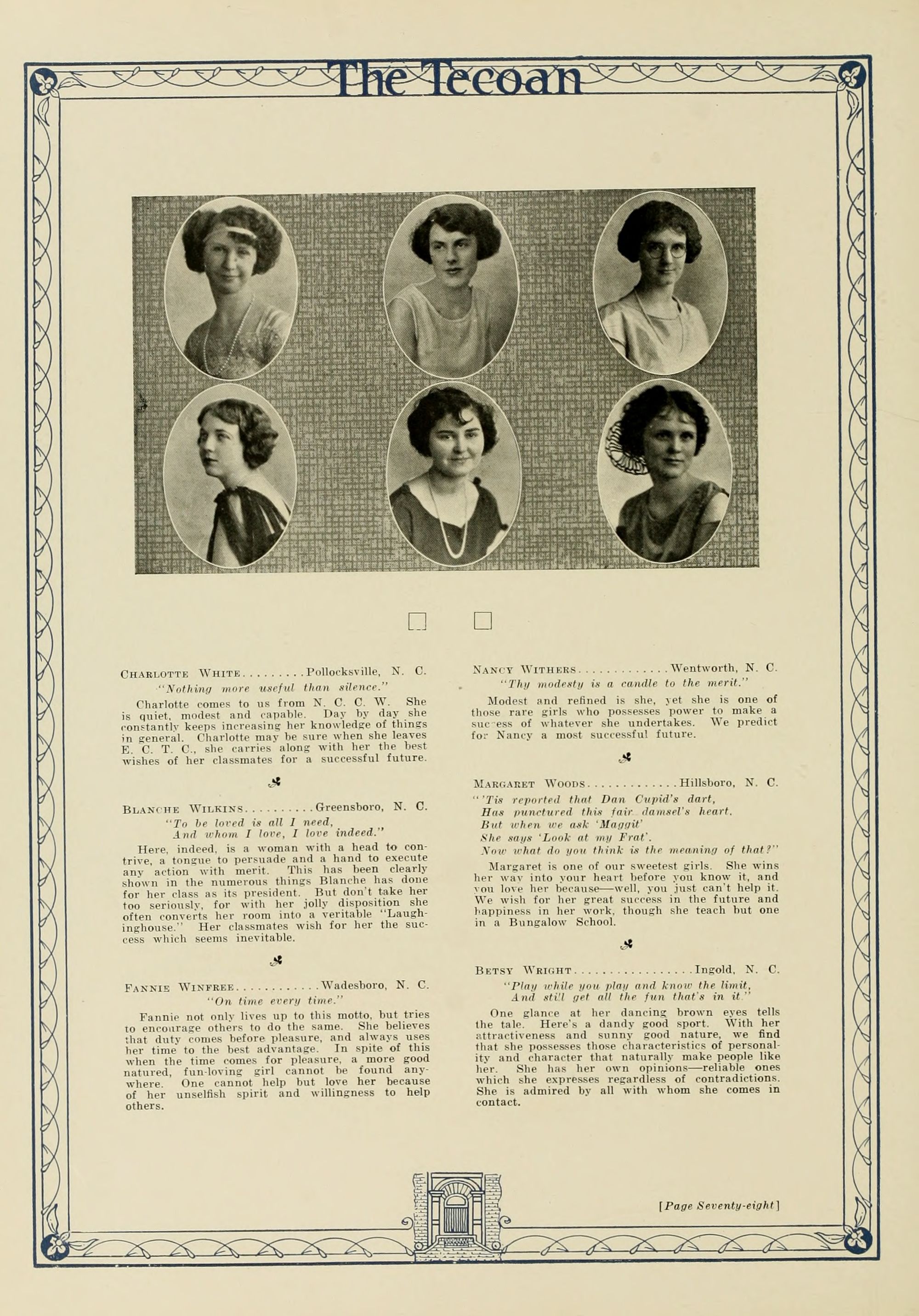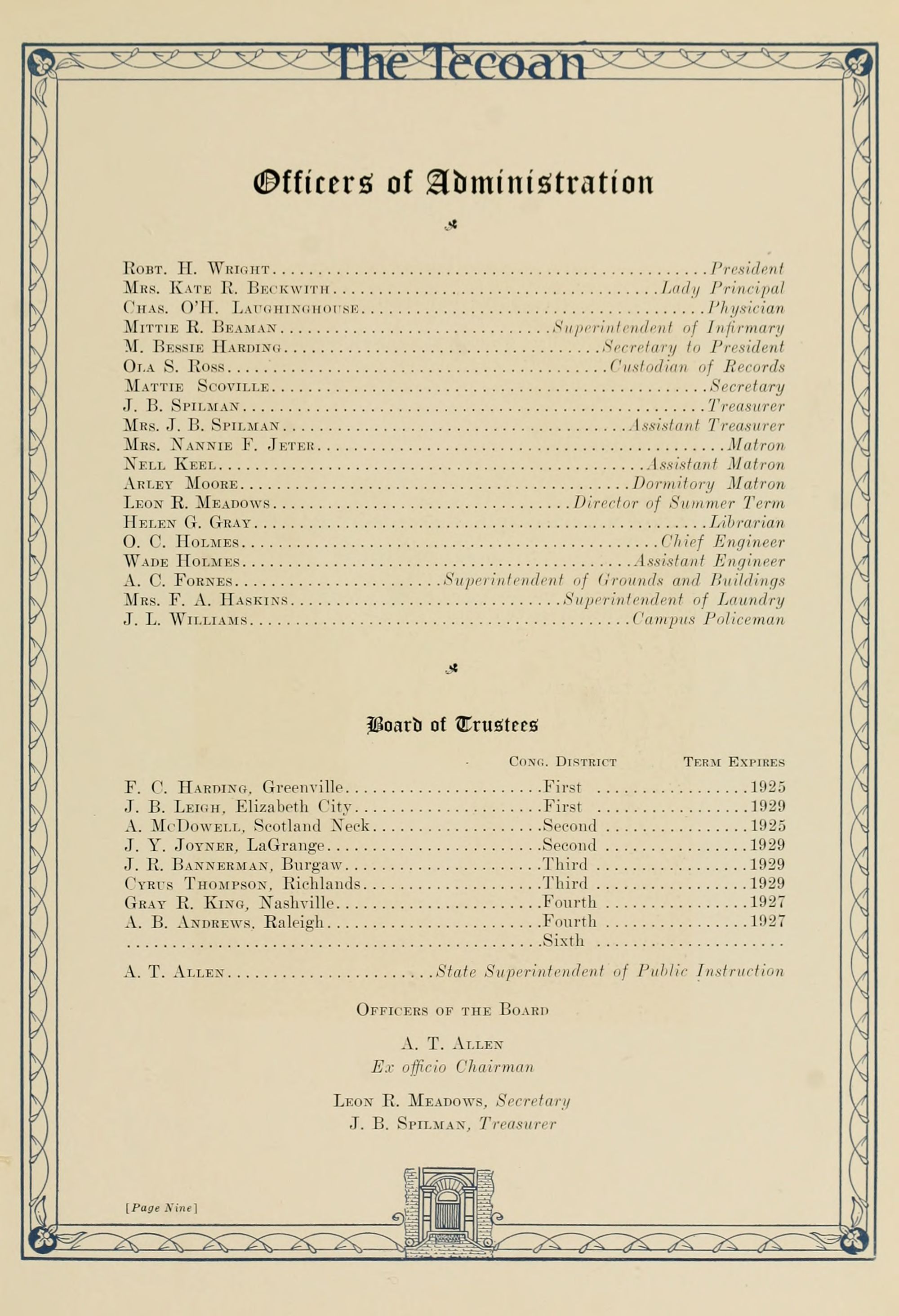 In presenting the second volume of The Tecoan, the students of East Carolina Teachers College offer no apologies for the contents of the book; it is but a brief chronicle of the everyday events and scenes of our college life. Had life at Teachers College been different, the book would have been different. Every effort has been put forth to give a picture of conditions as they actually existed during the school year 1923-'24; it is the only pictorial record of the year's events, therefore, we believe it will be valuable for future reference.