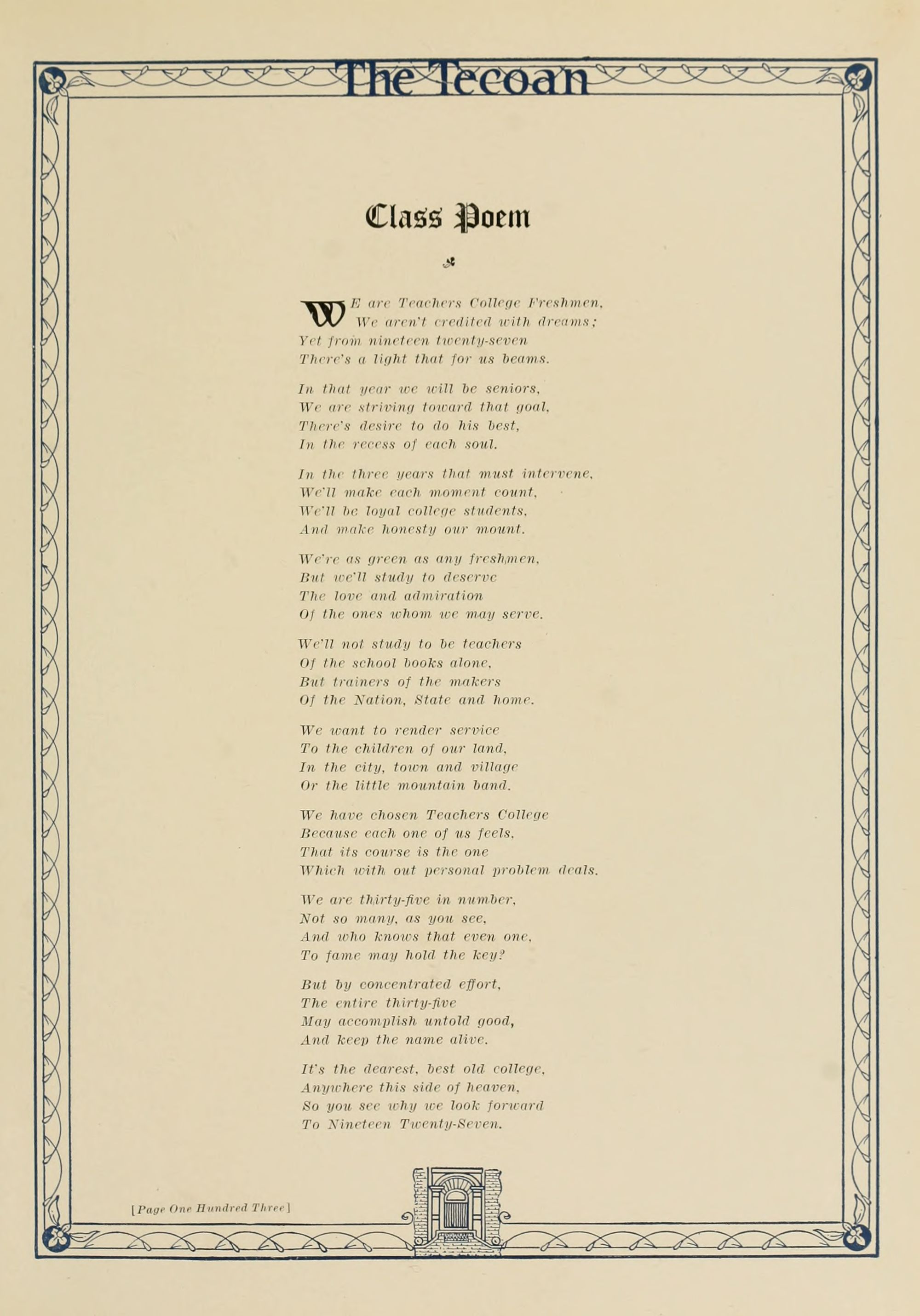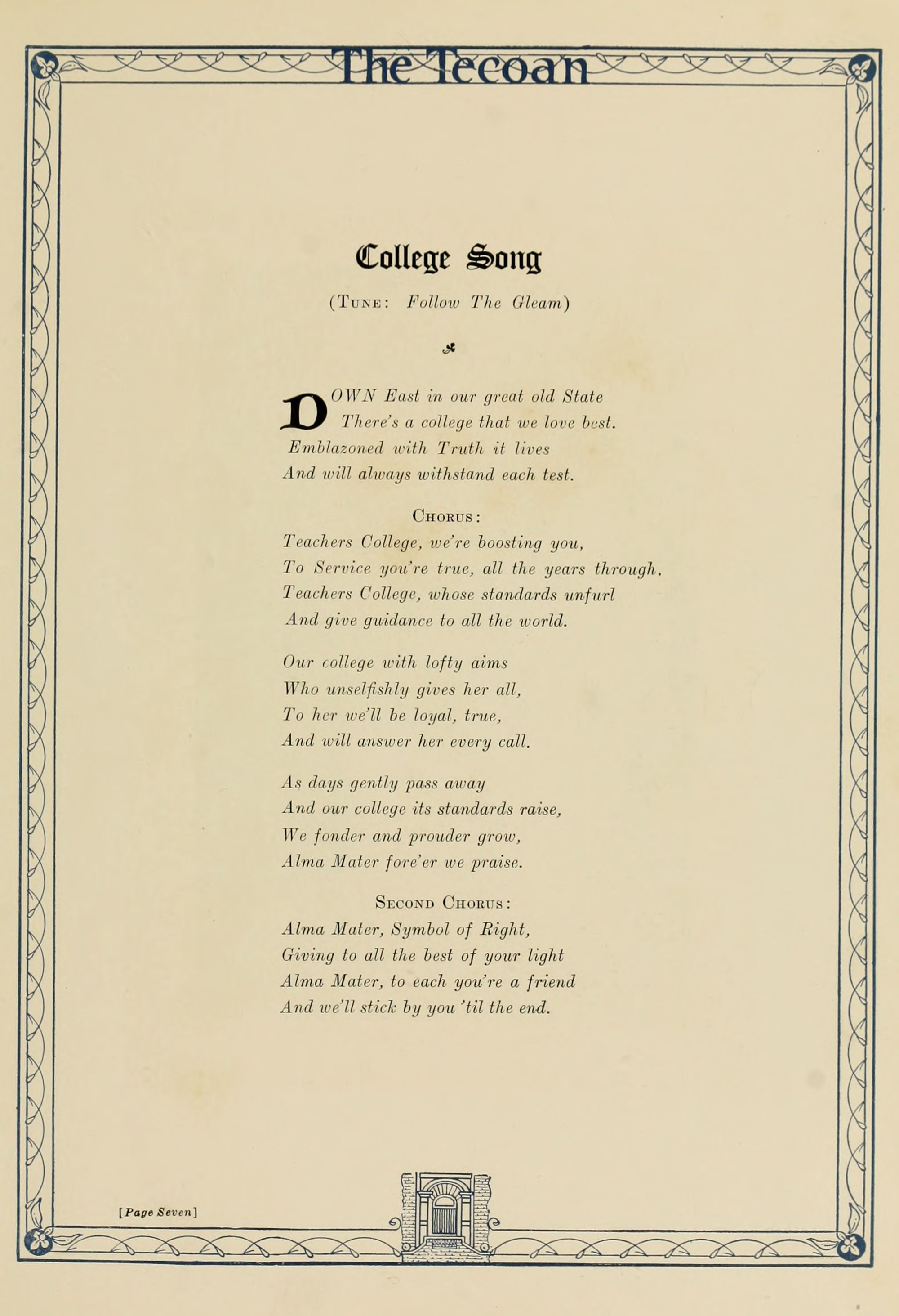 Teachers College, whose standards unfurl And give guidance to all the world.