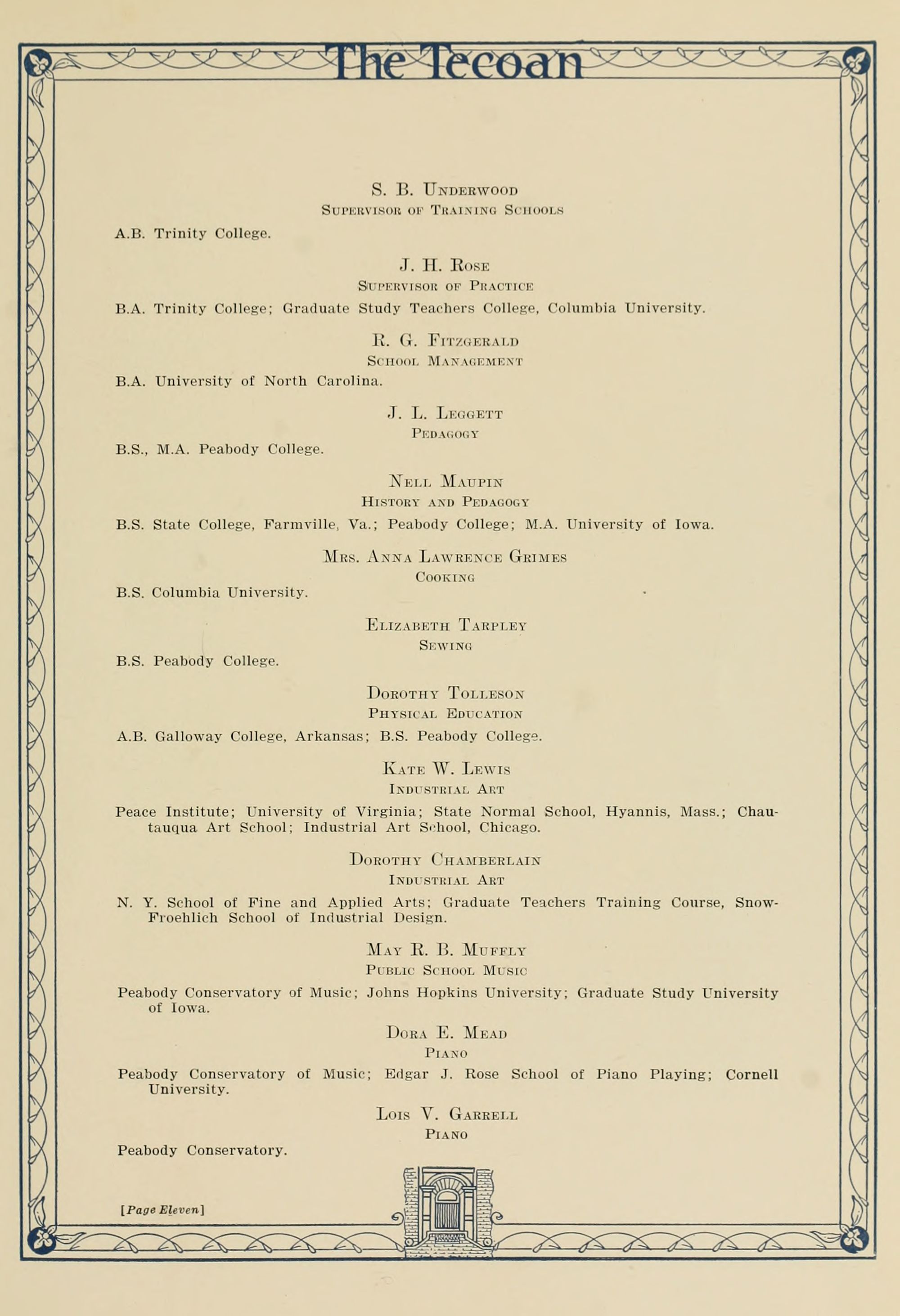 J. H. Rose Supervisor of Practice B.A. Trinity College;Graduate Study Teachers College, Columbia University.
