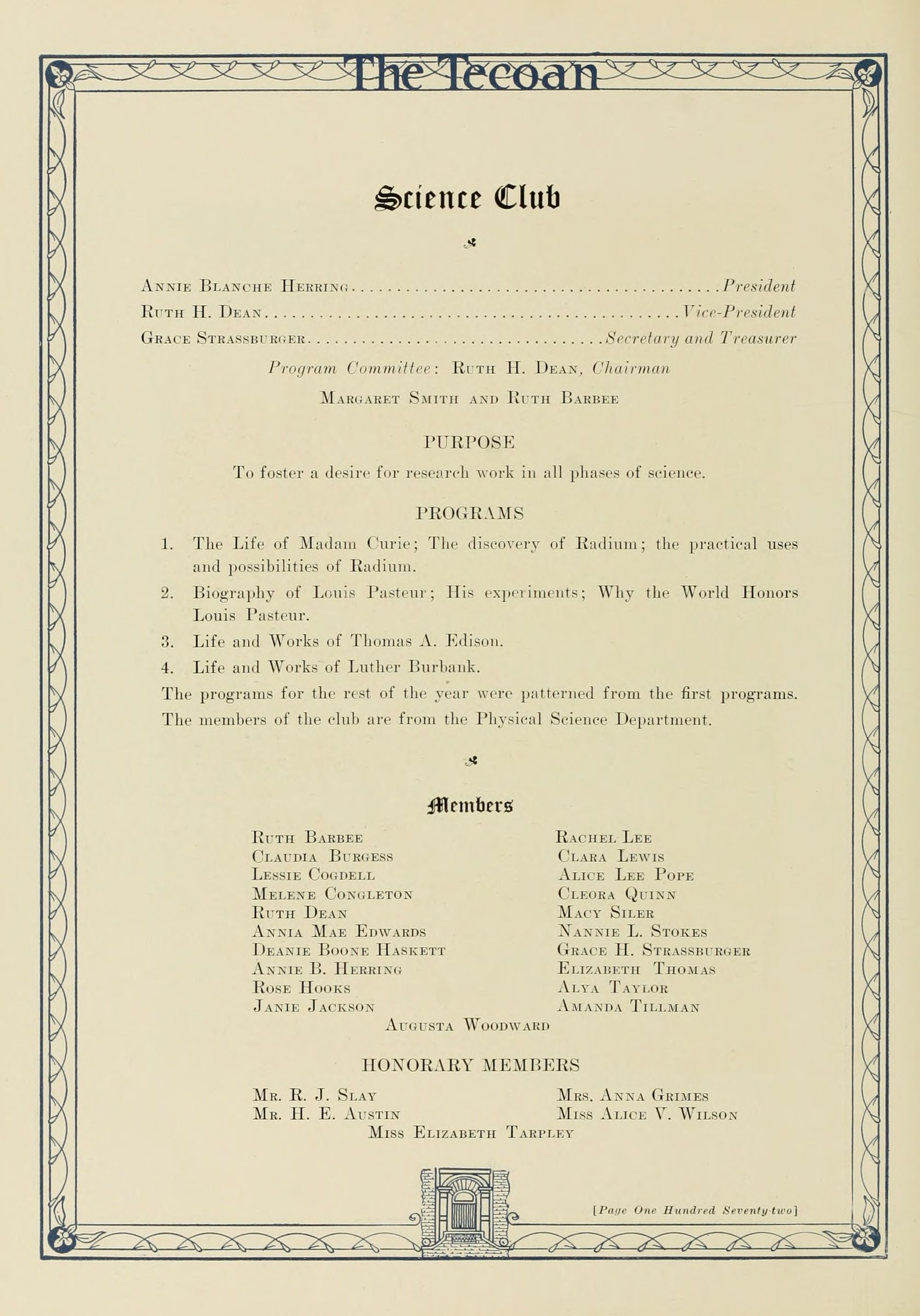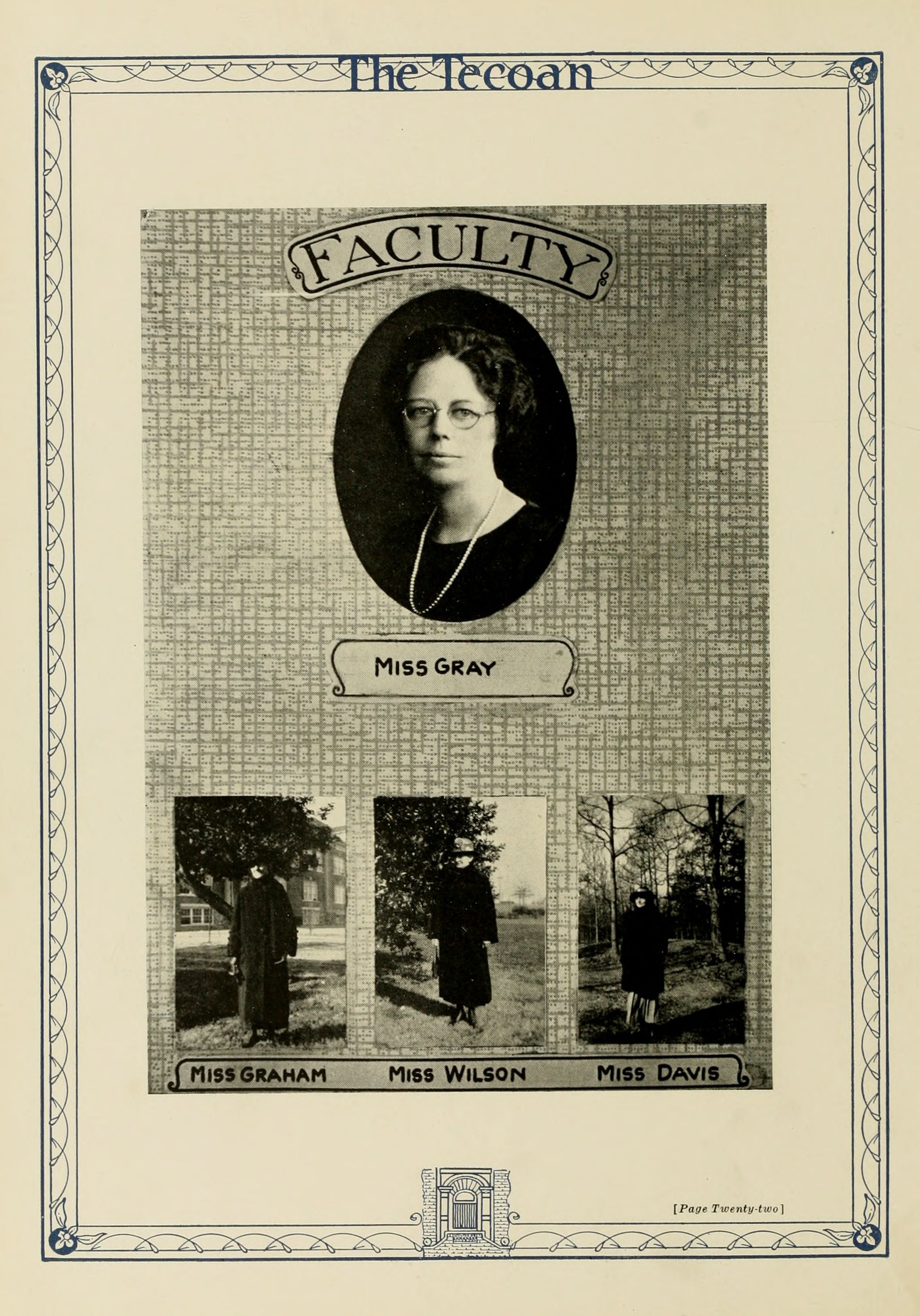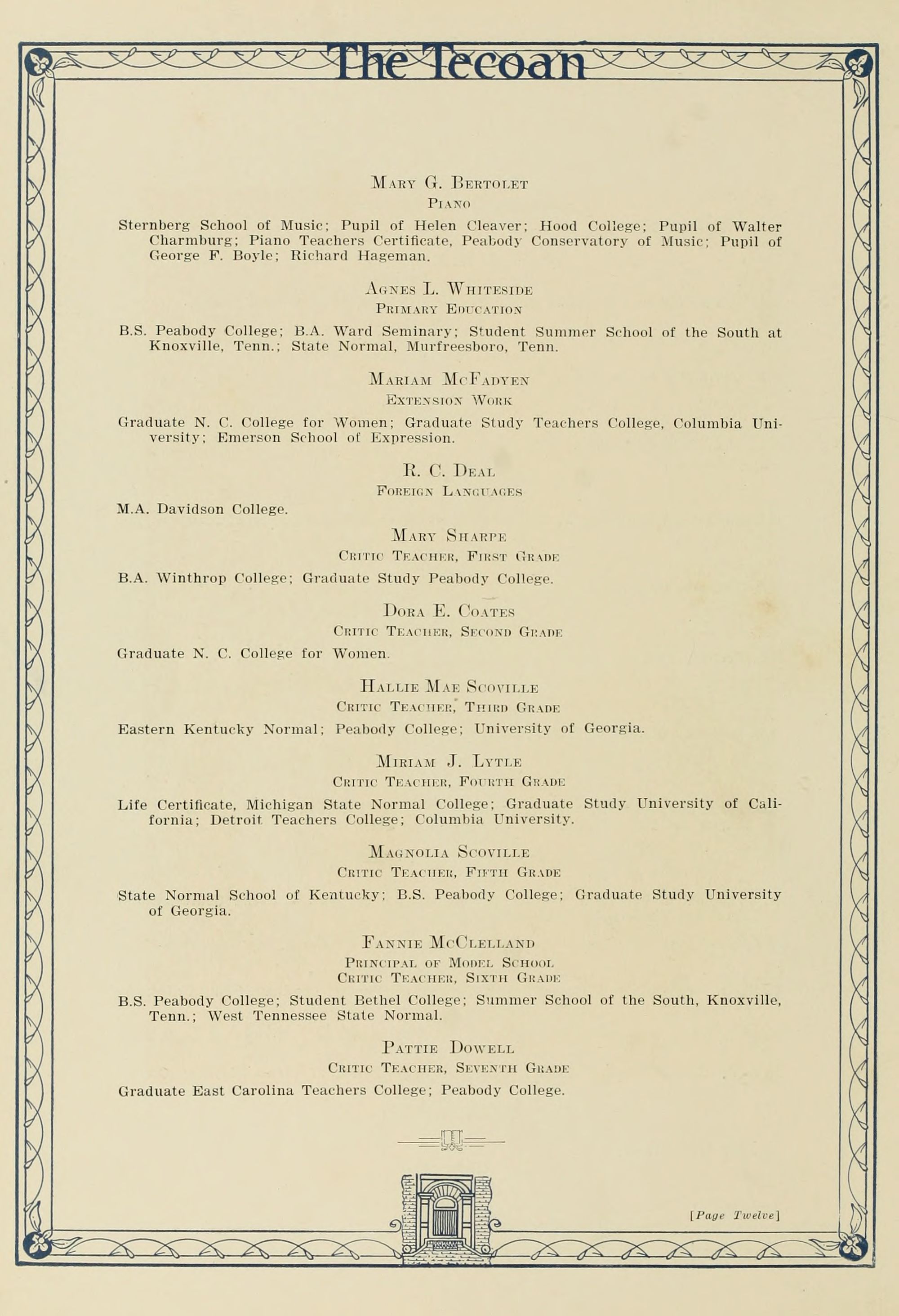 Maria Daniel Graham Mathematics L. I. Peabody College; B.S. Teachers College. Columbia University; Graduate Study University of Chicago and Columbia University.