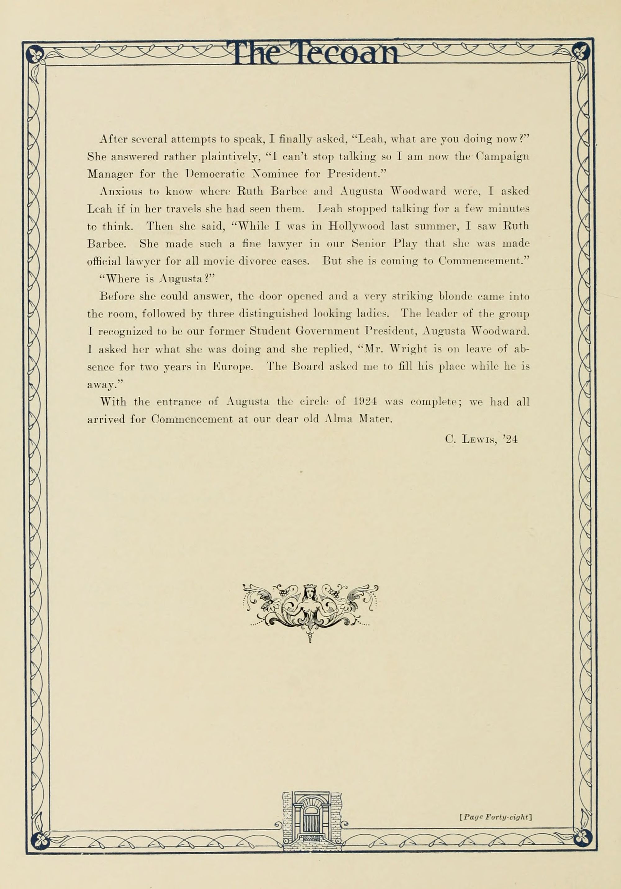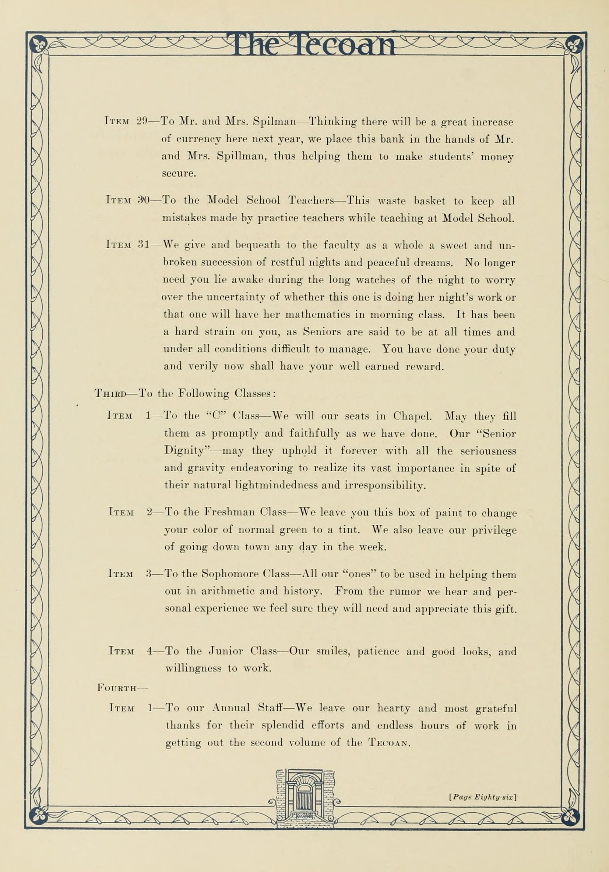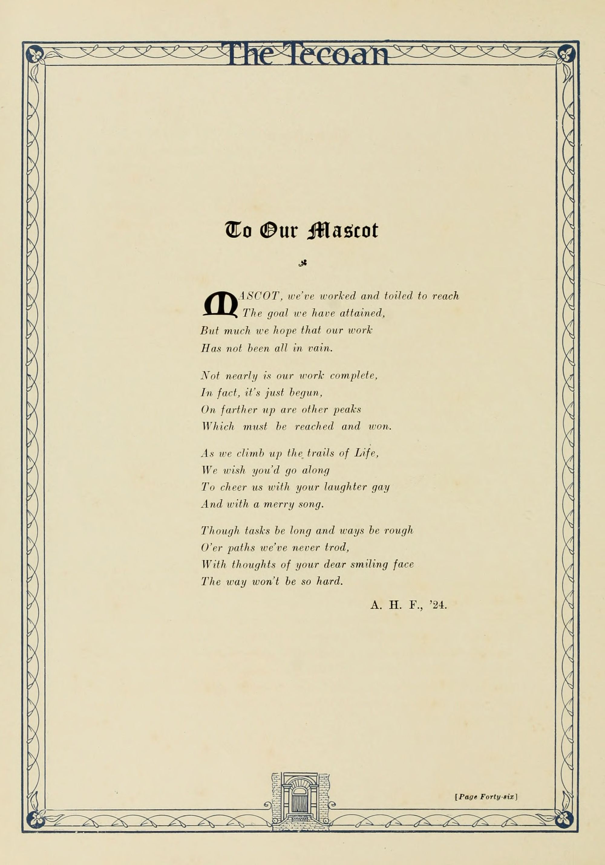 The editors wish to thank the students, the members of the faculty, and the officers for their help and friendly suggestions in the publication of The Tecoan; such a spirit of cooperation in our college is worth many times the cost of this volume.