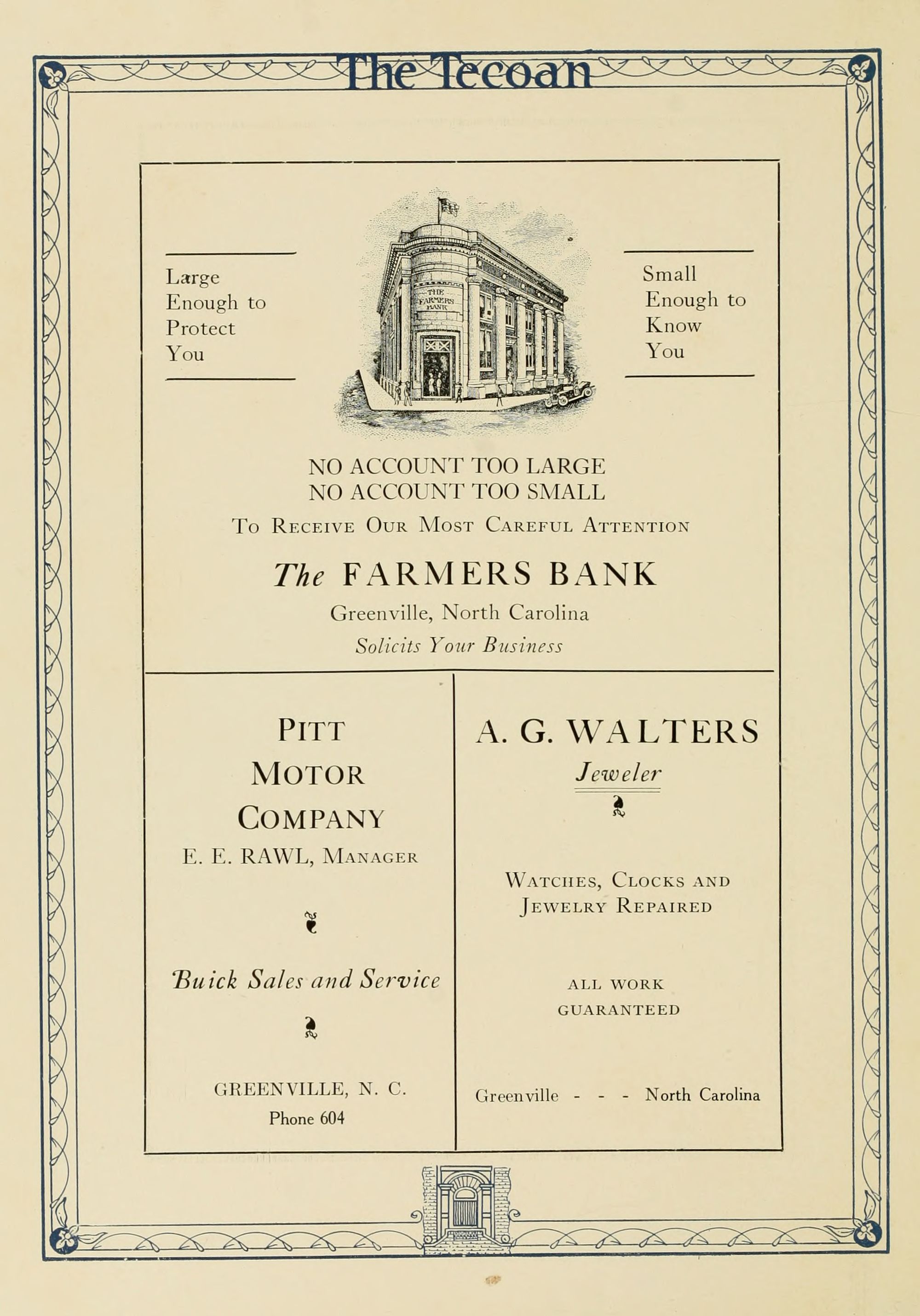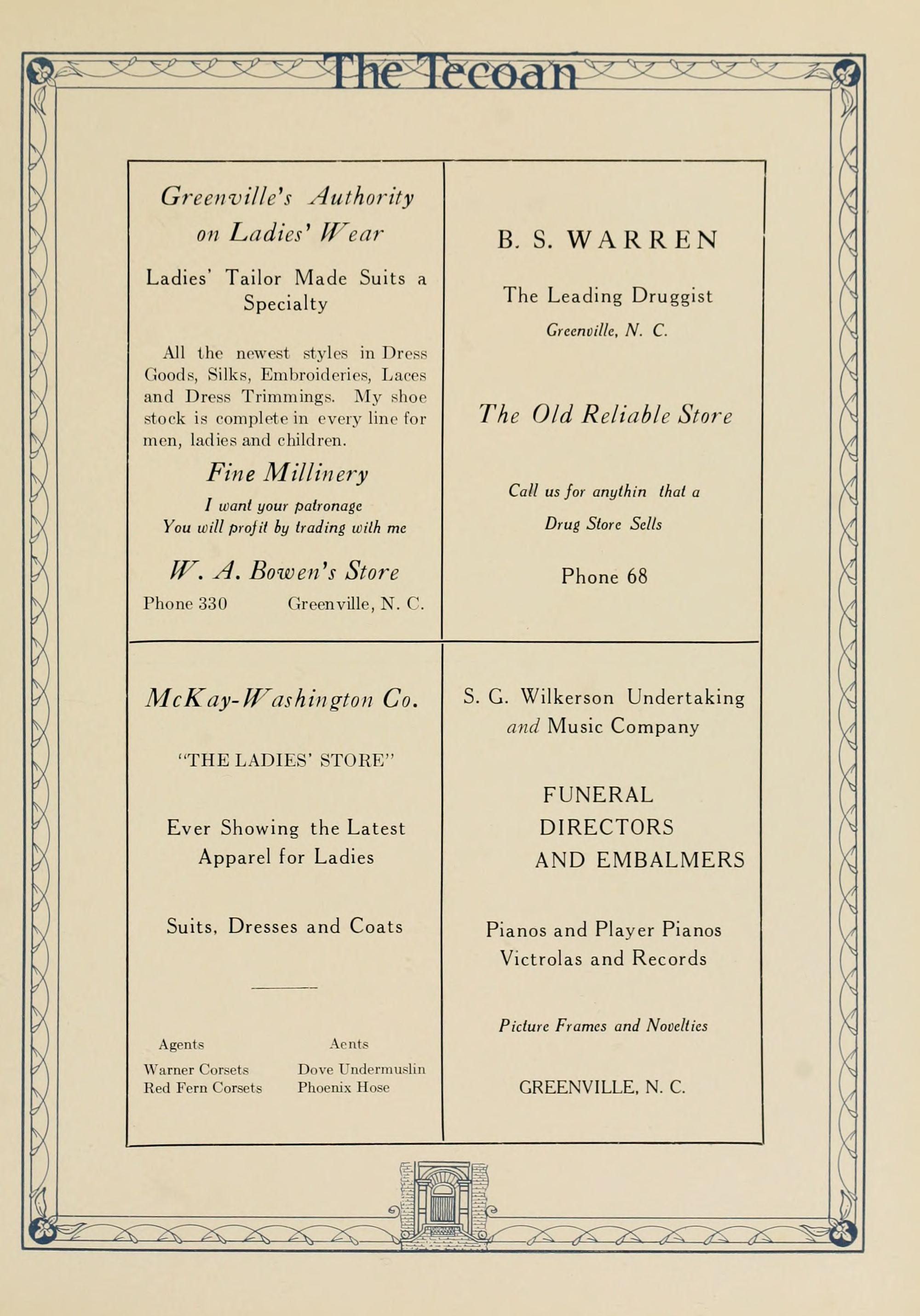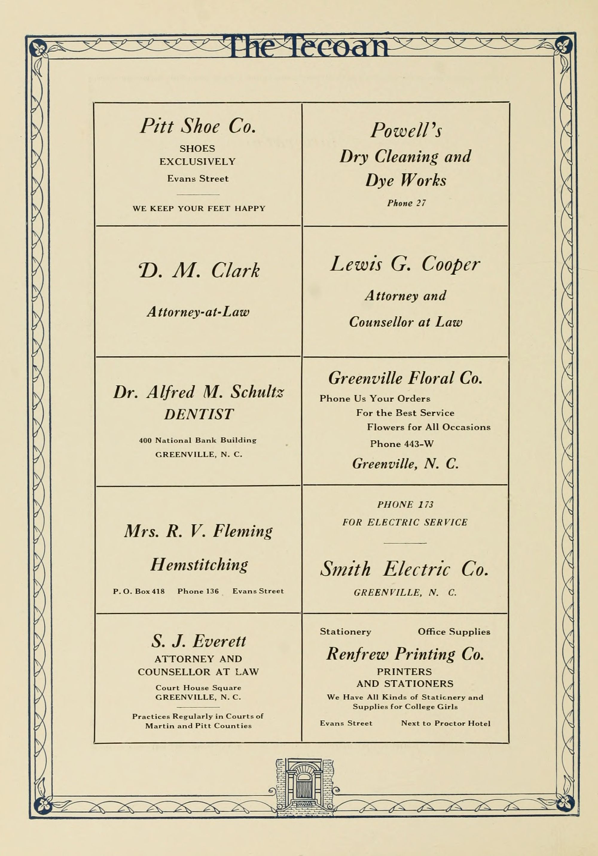 D. M. Clark, Attorney at law., Dr. Alfred M. Schultz, Dentist, 400 National Bank Building, Greenville NC, Mrs. R. V. Fleming, Hemstitching, PO Box 418, Phone 136, Evans St., S.J. Everett, Attorney and counsellor at law., Court House Square, Greenville NC, Practices regularly in the courts of Martin and Pitt Counties.