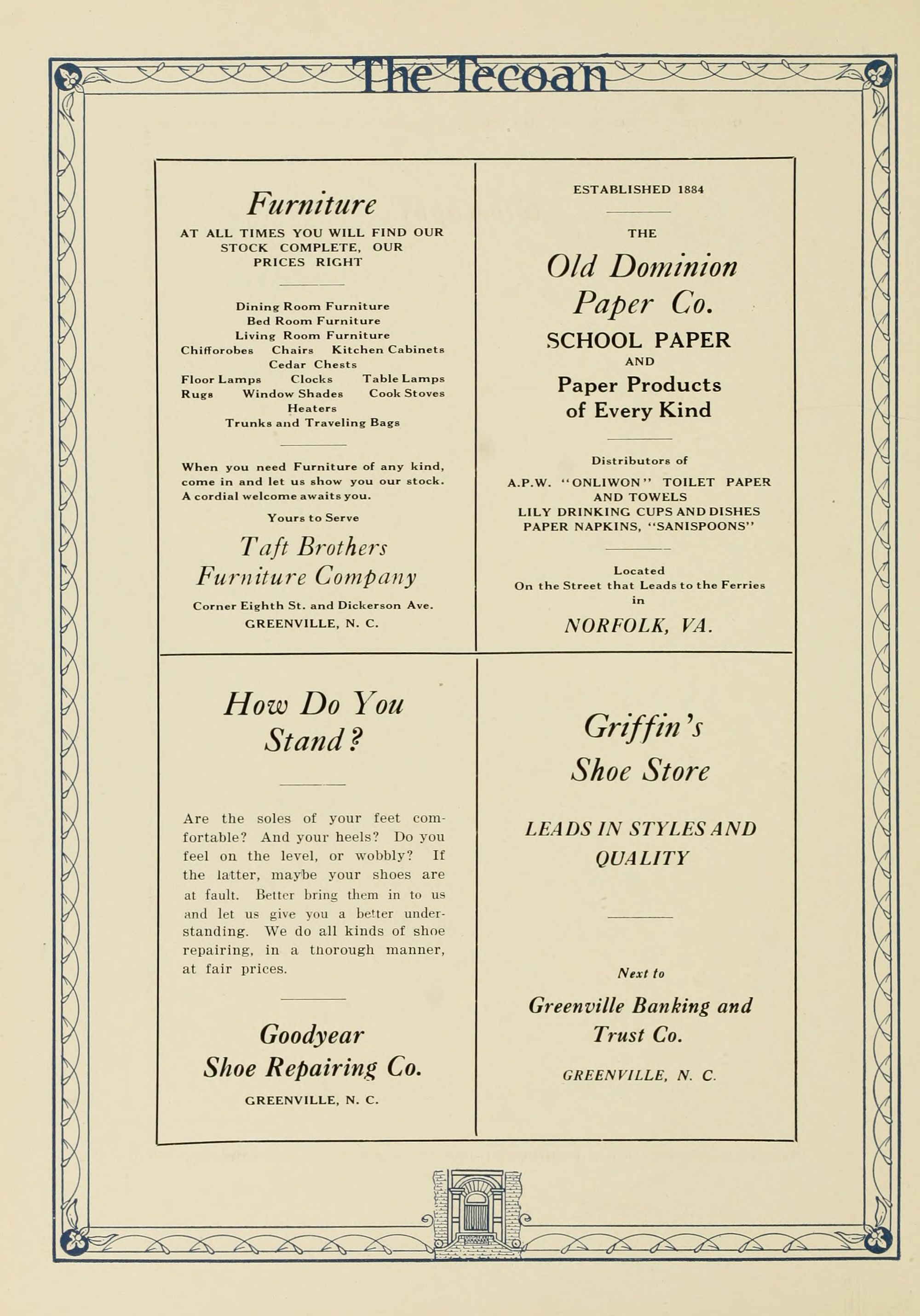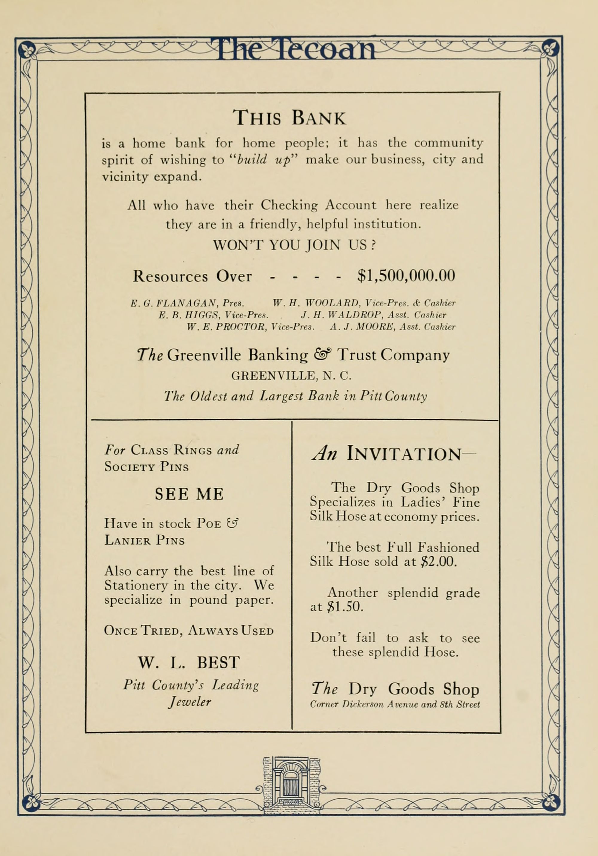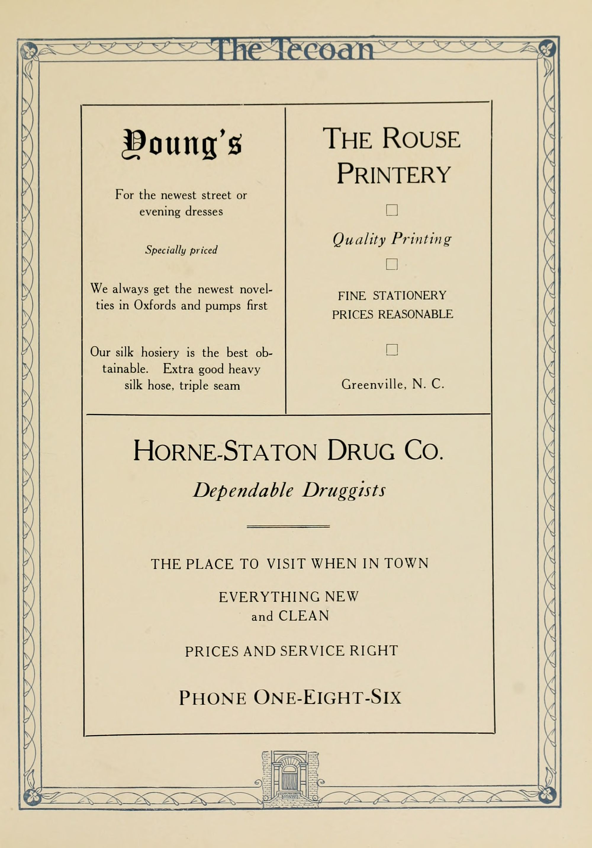 D. M. Clark, Attorney at law., Dr. Alfred M. Schultz, Dentist, 400 National Bank Building, Greenville NC, Mrs. R. V. Fleming, Hemstitching, PO Box 418, Phone 136, Evans St., S.J. Everett, Attorney and counsellor at law., Court House Square, Greenville NC, Practices regularly in the courts of Martin and Pitt Counties.