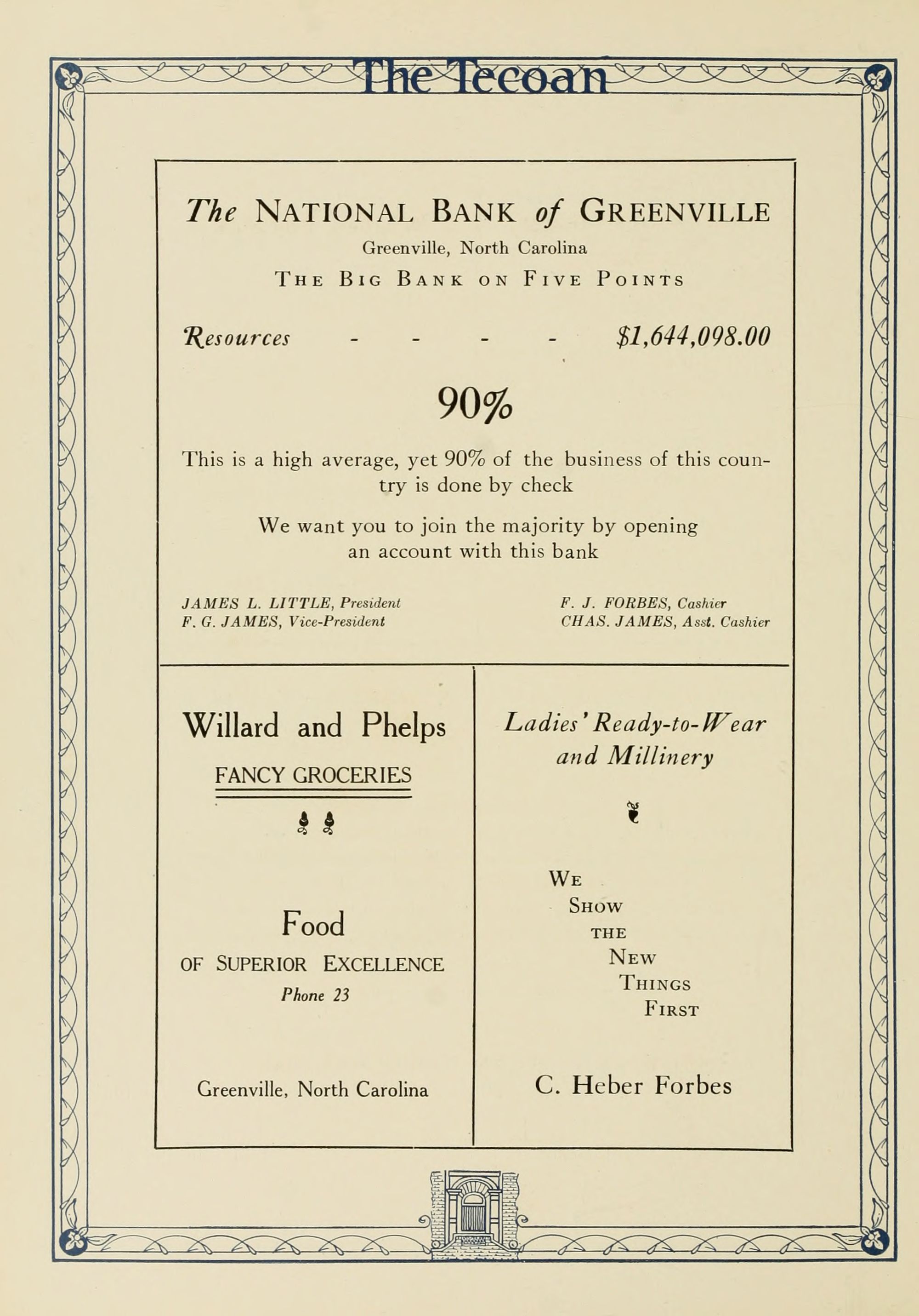 James Little-President, F. G. James-Vice President, F. J. Forbes-Cashier, Chas. James-Asst. Cashier