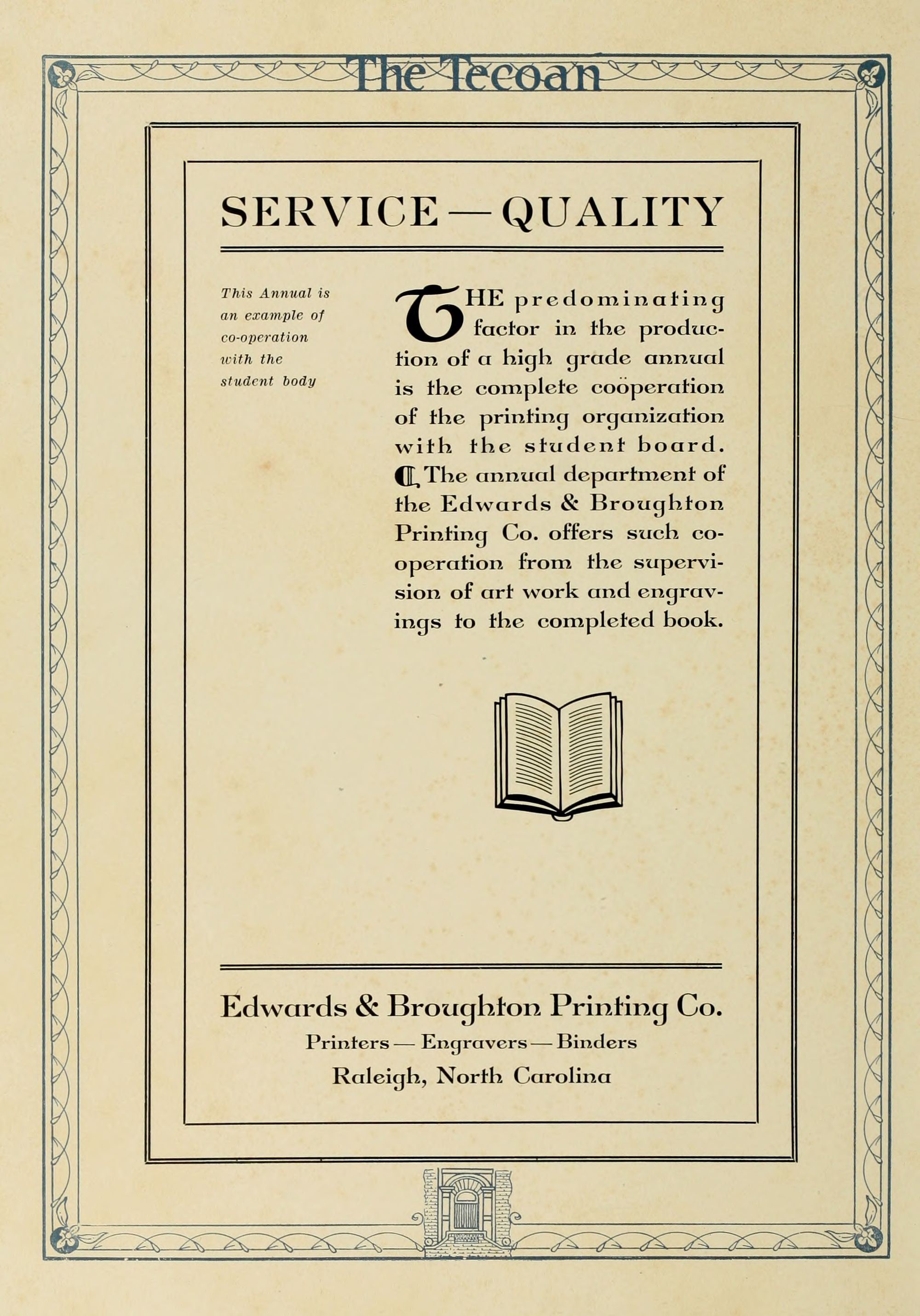 The predominating factor in the production of a high grade annual is the complete cooperation of the printing organization with the student board. The annual department of the Edwards & Broughton Printing Co. offers such co- operation from the supervision of art work and engravings to the completed book.