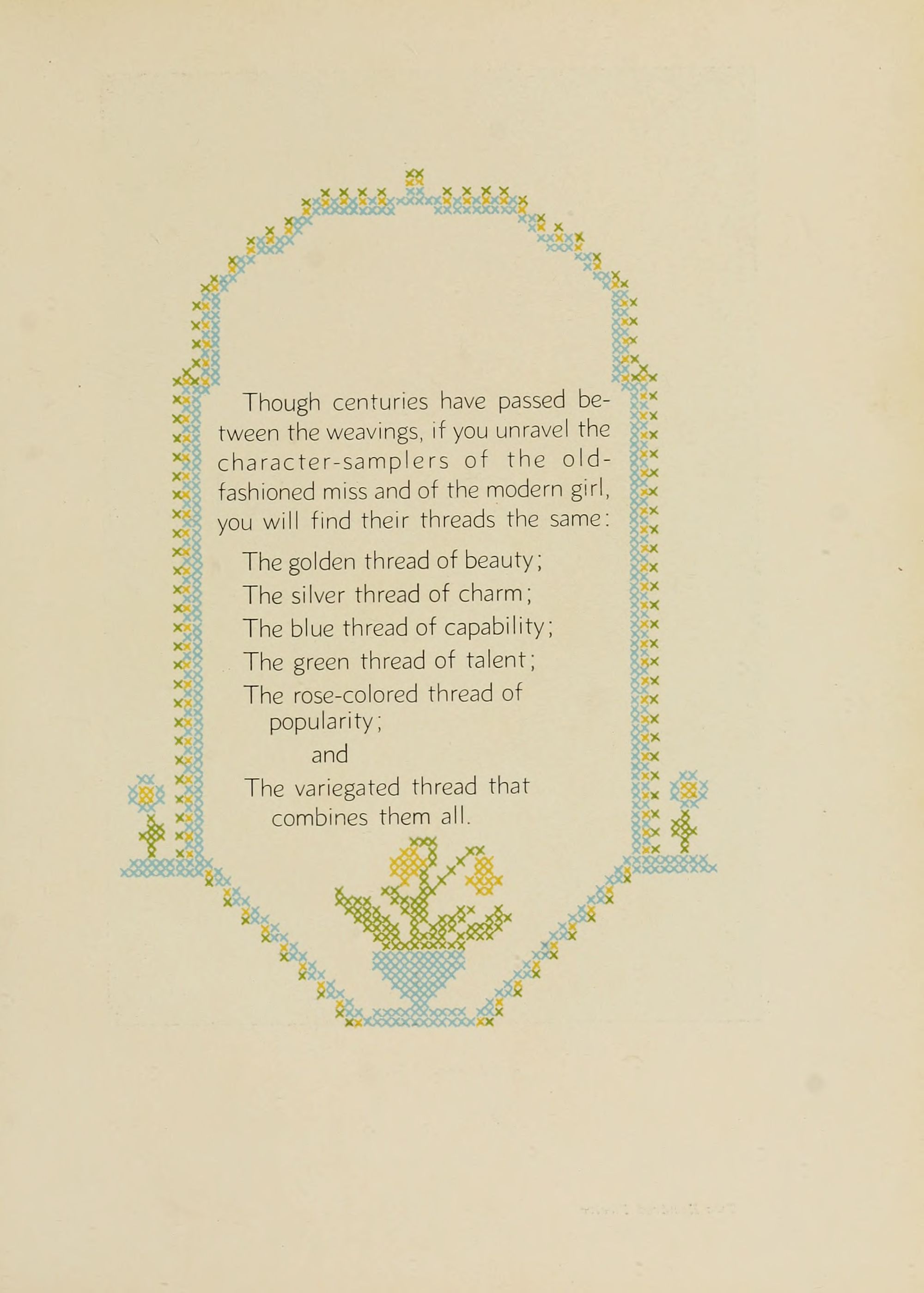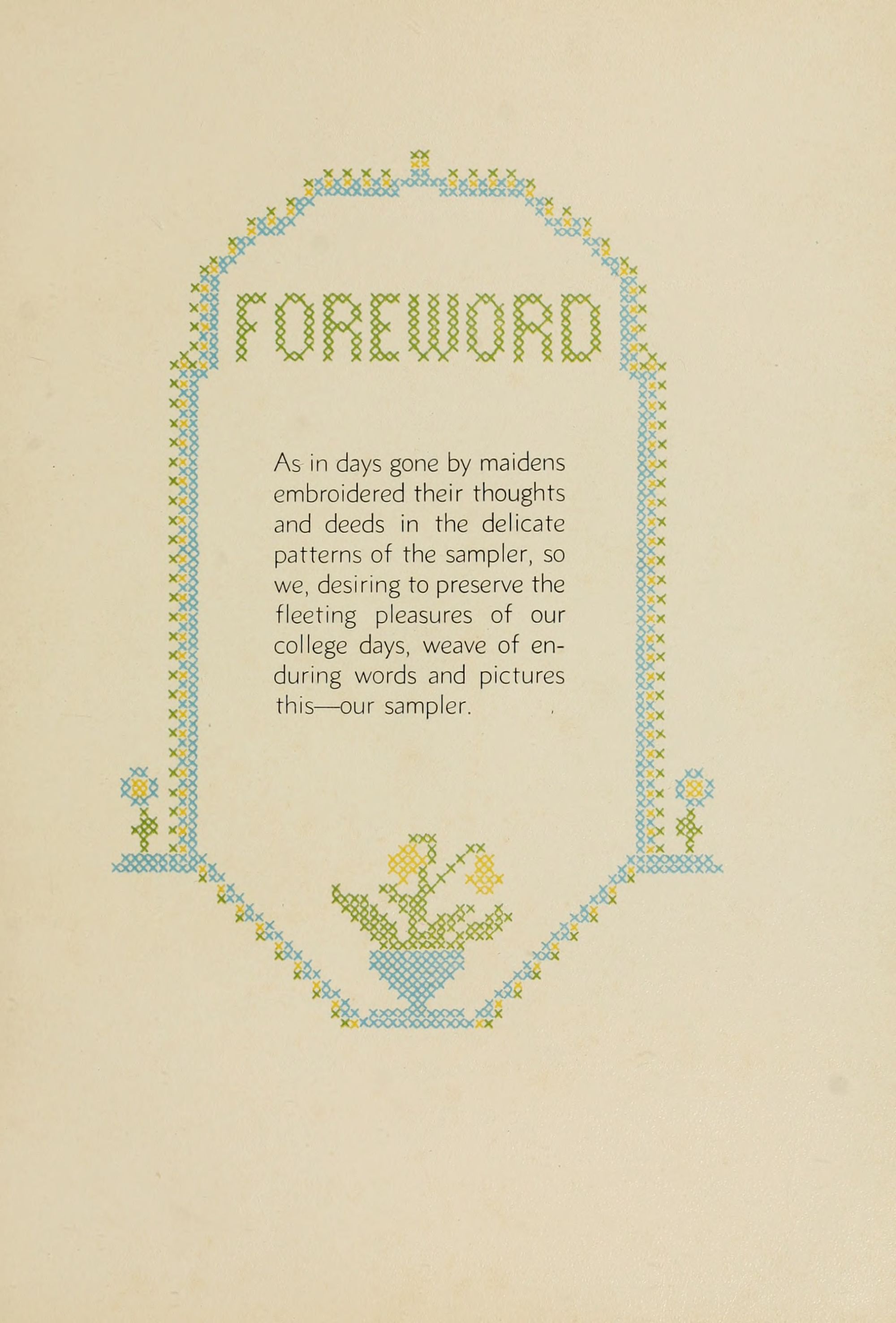As in days gone by maidens embroidered their thoughts and deeds in the delicate patterns of the sampler, so we, desiring to preserve the fleeting pleasures of our college days, weave of enduring words and pictures this - our sampler.