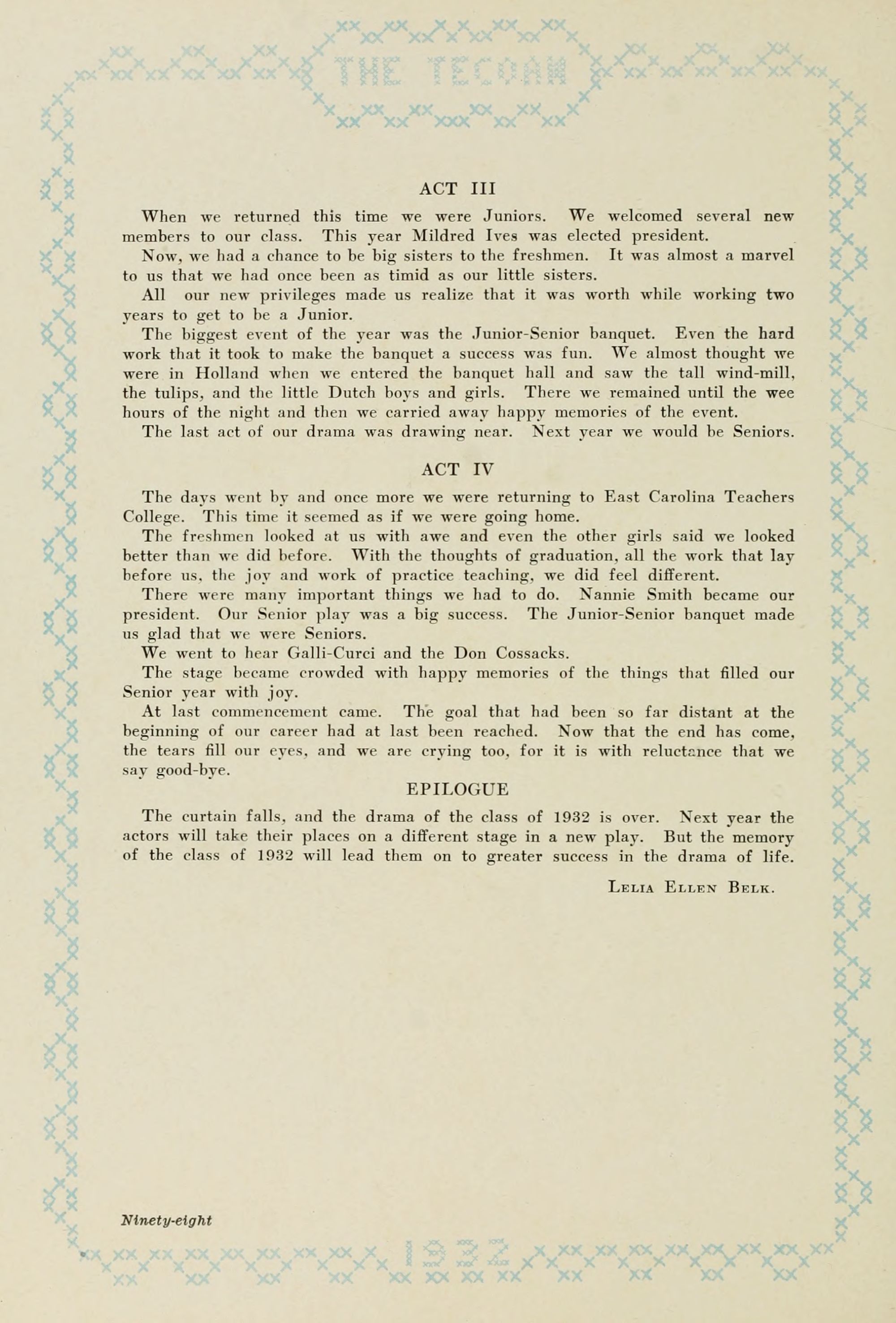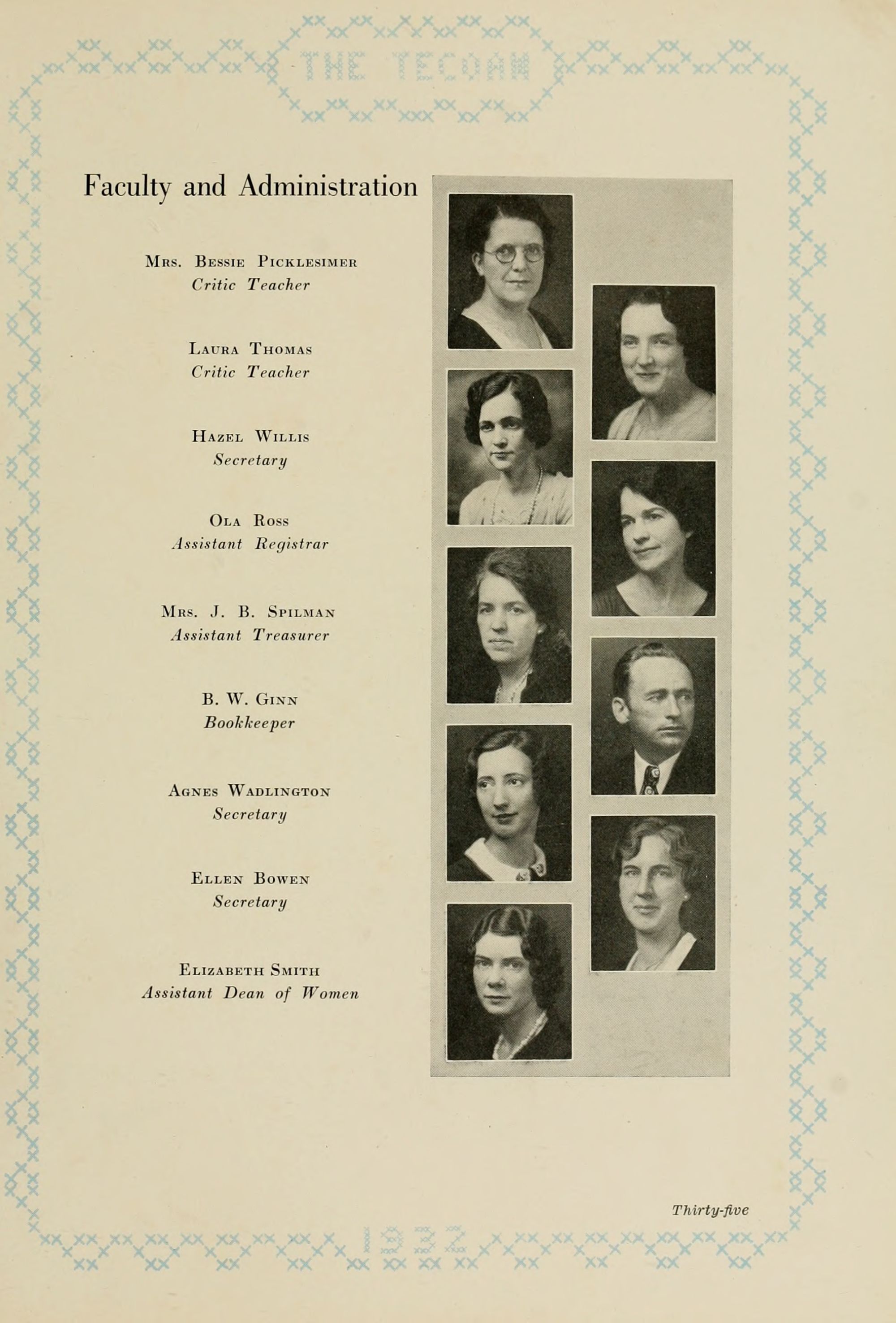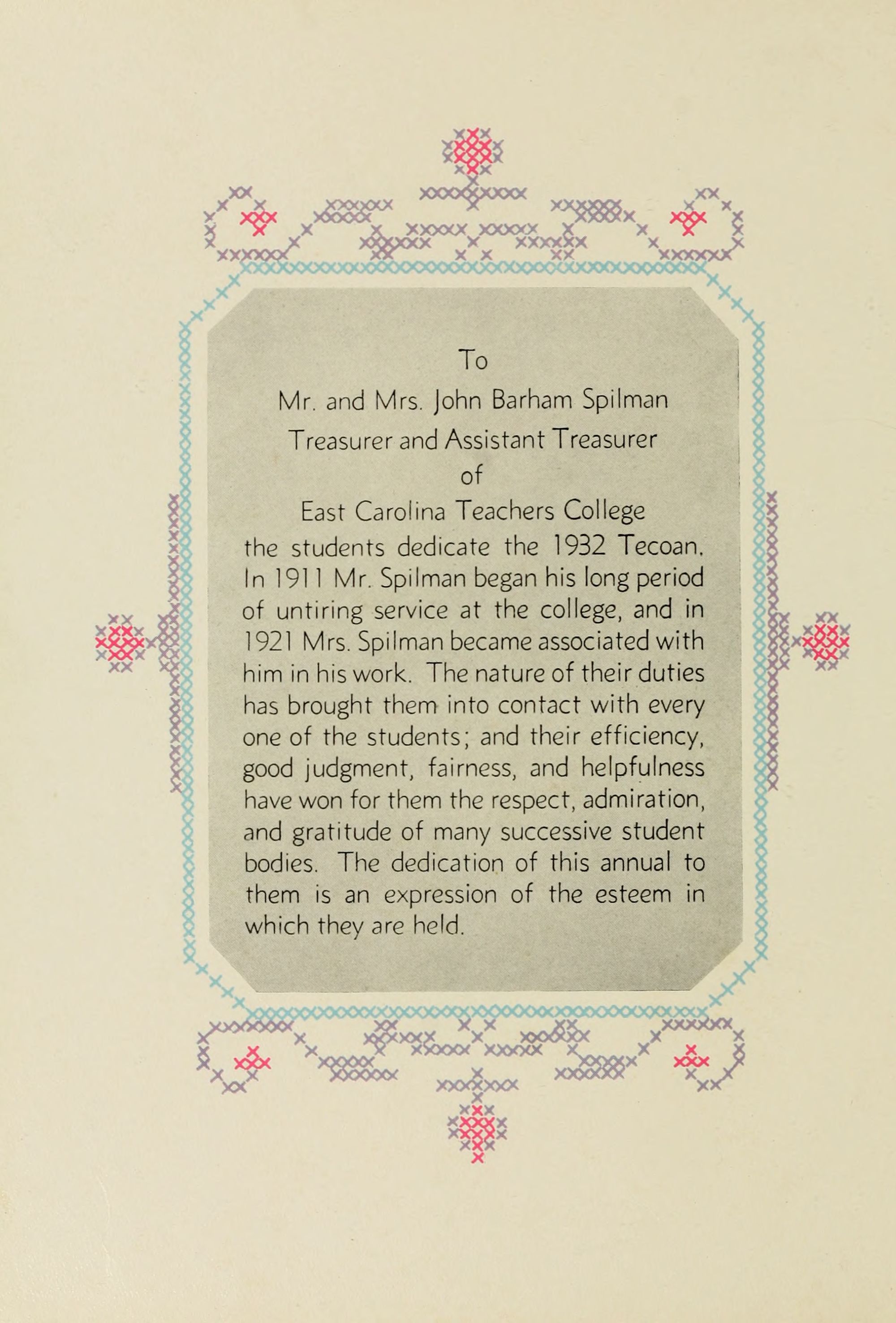 East Carolina Teachers College the students dedicate the 1932 Tecoan. In 191 1 Mr. Spilman began his long period ot untiring service at the college, and in 1921 Mrs. Spilman became associated with him in his work. The nature of their duties has brought them into contact with every one of the students; and their efficiency, good judgment, fairness, and helpfulness have won for them the respect, admiration, and gratitude of many successive student bodies. The dedication of this annual to them is an expression of the esteem in which they are held.