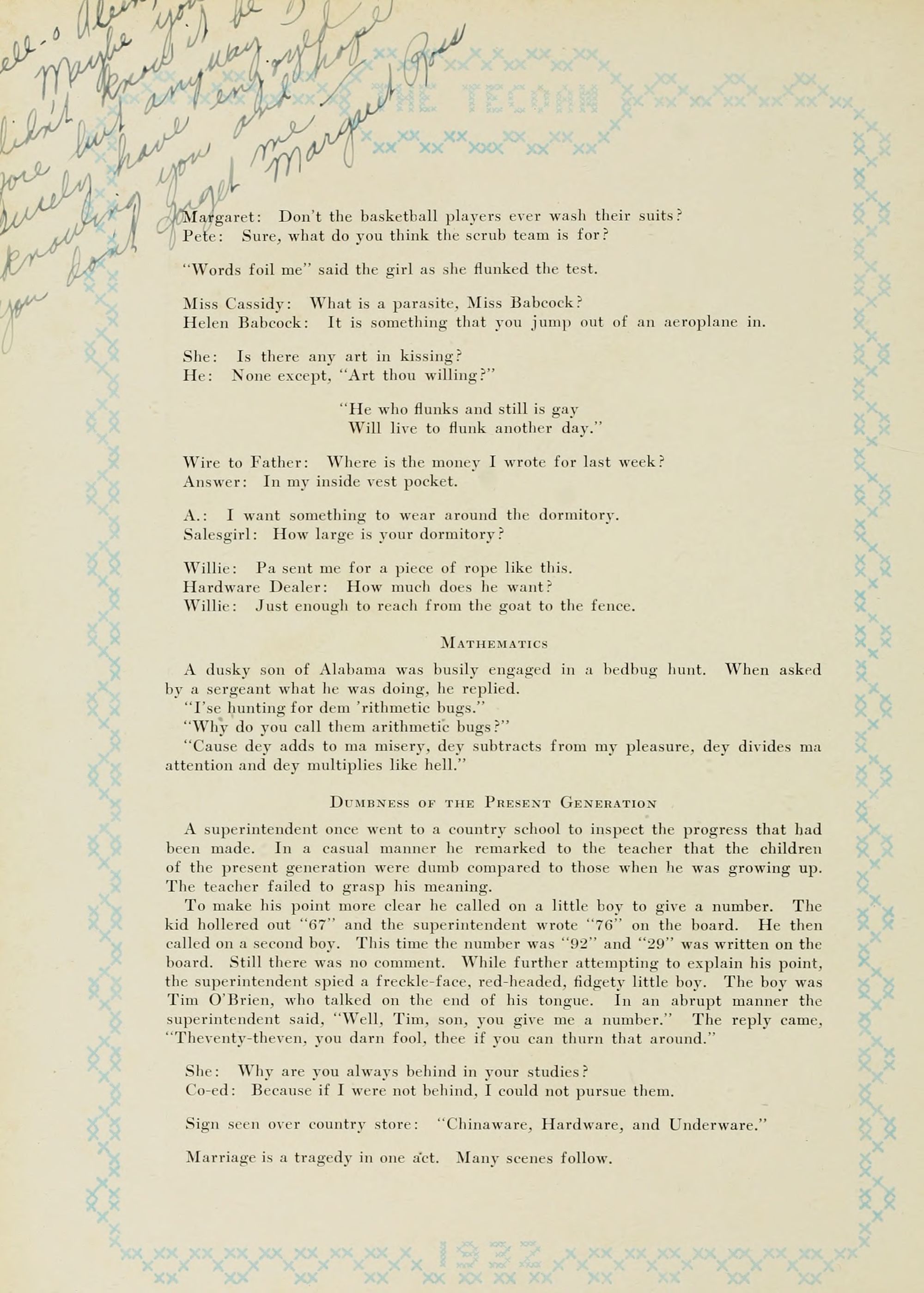 A superintendent once went to a country school to inspect the progress that had been made. In a casual manner he remarked to the teacher that the children of the present generation were dumb compared to those when he was growing up. The teacher failed to grasp his meaning.