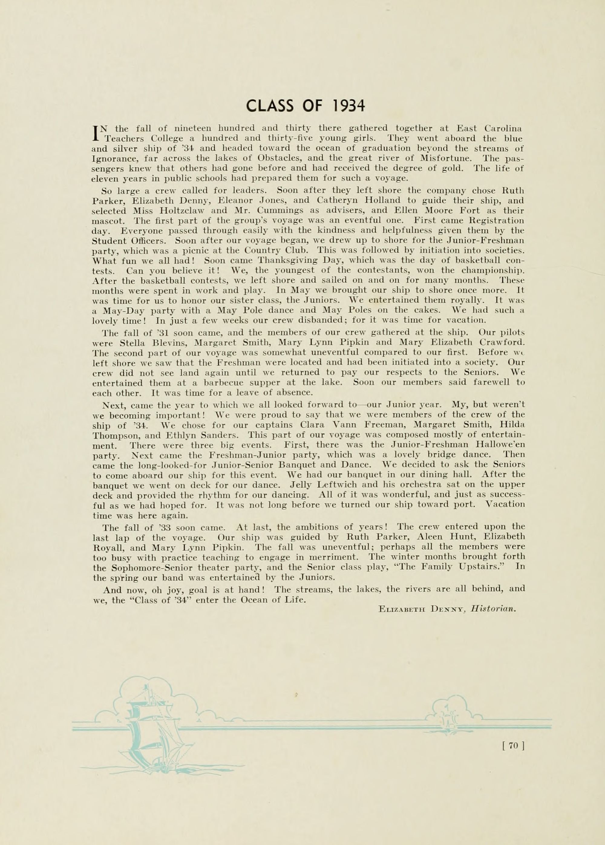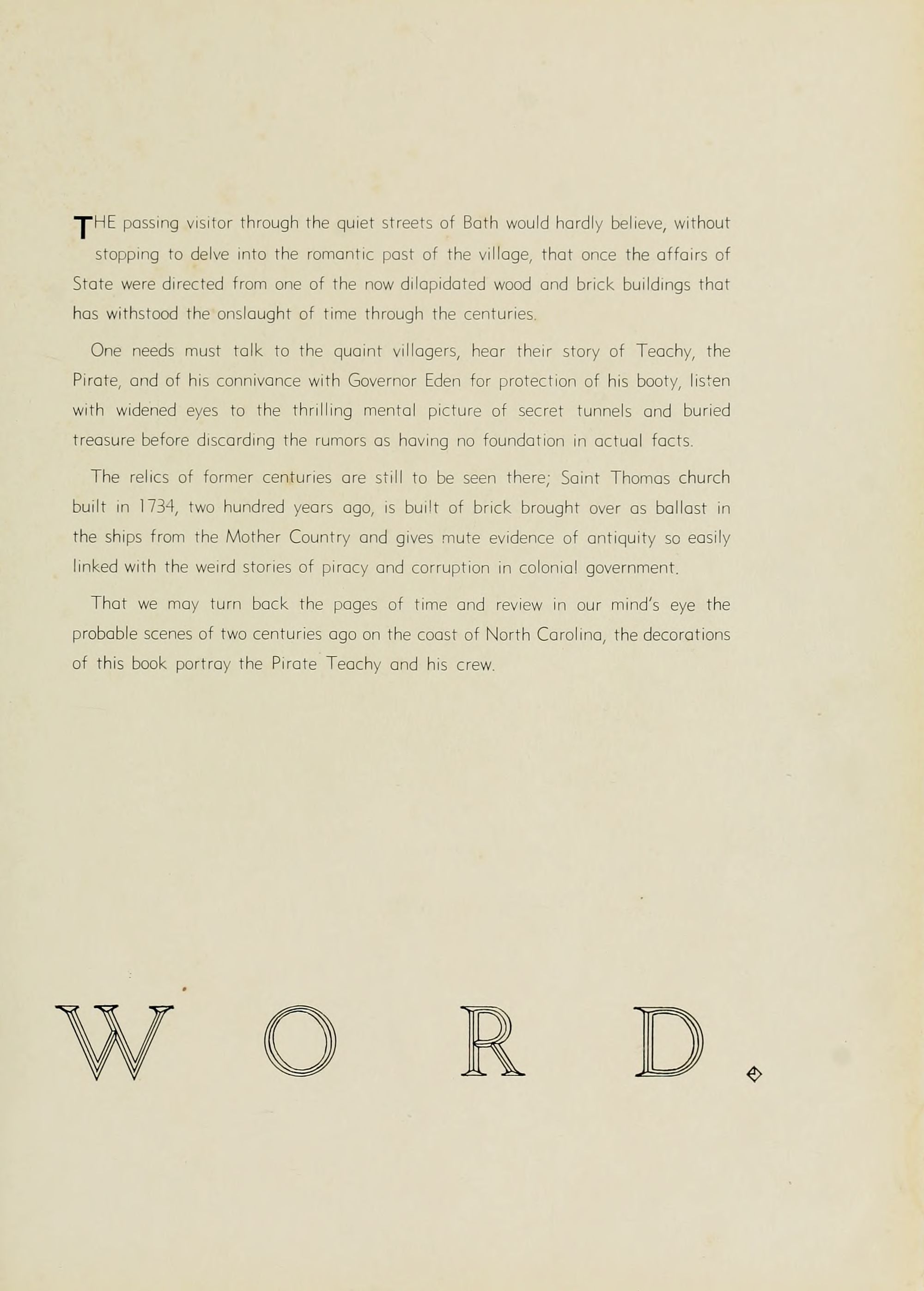 That we may turn back the pages of time and review in our mind's eye the probable scenes of two centuries ago on the coast of North Carolina, the decorations of this book portray the Pirate Teachy and his crew.