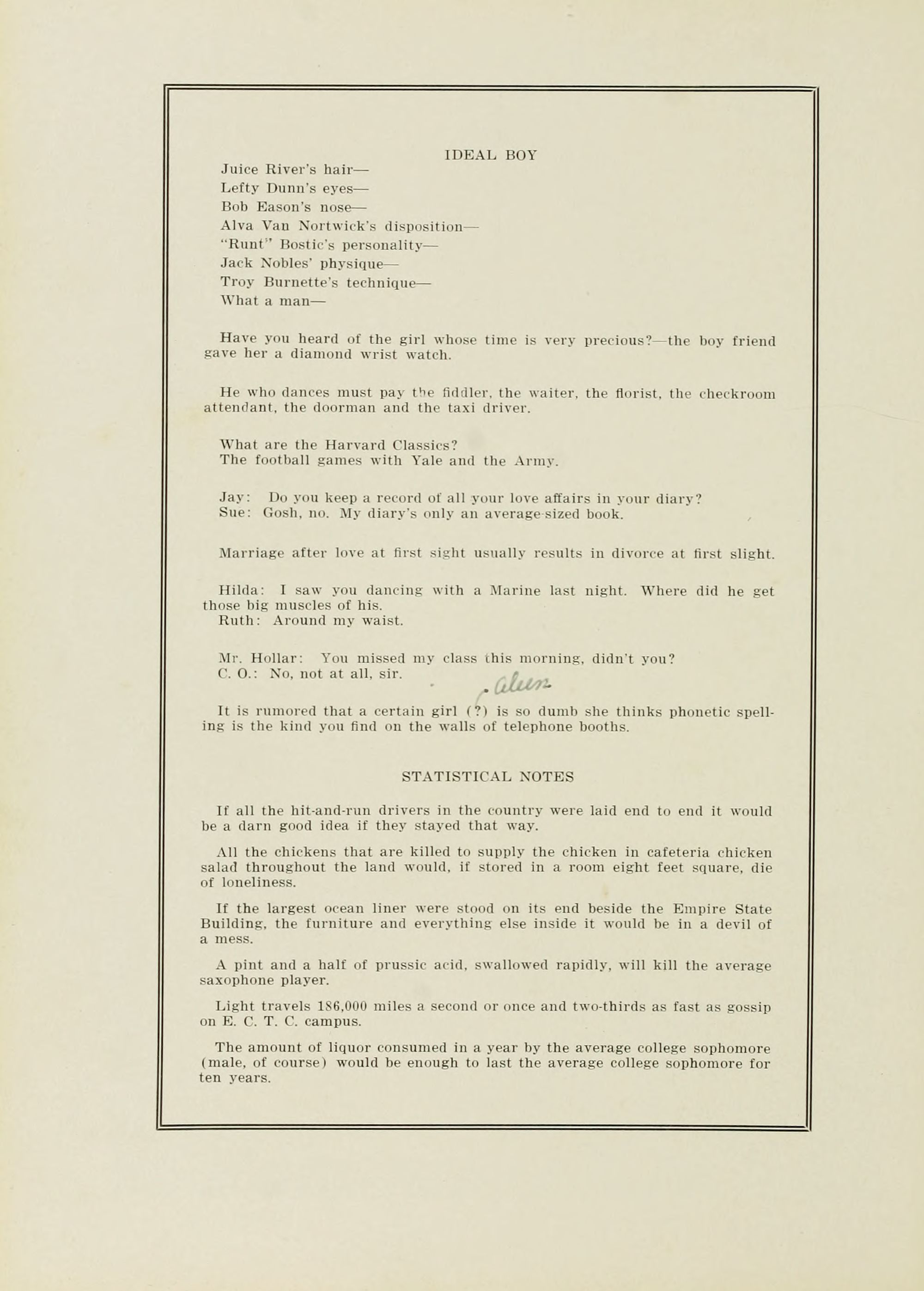 Light travels 186,000 miles a second or once and two-thirds as fast as gossip on E. C. T. C. campus.