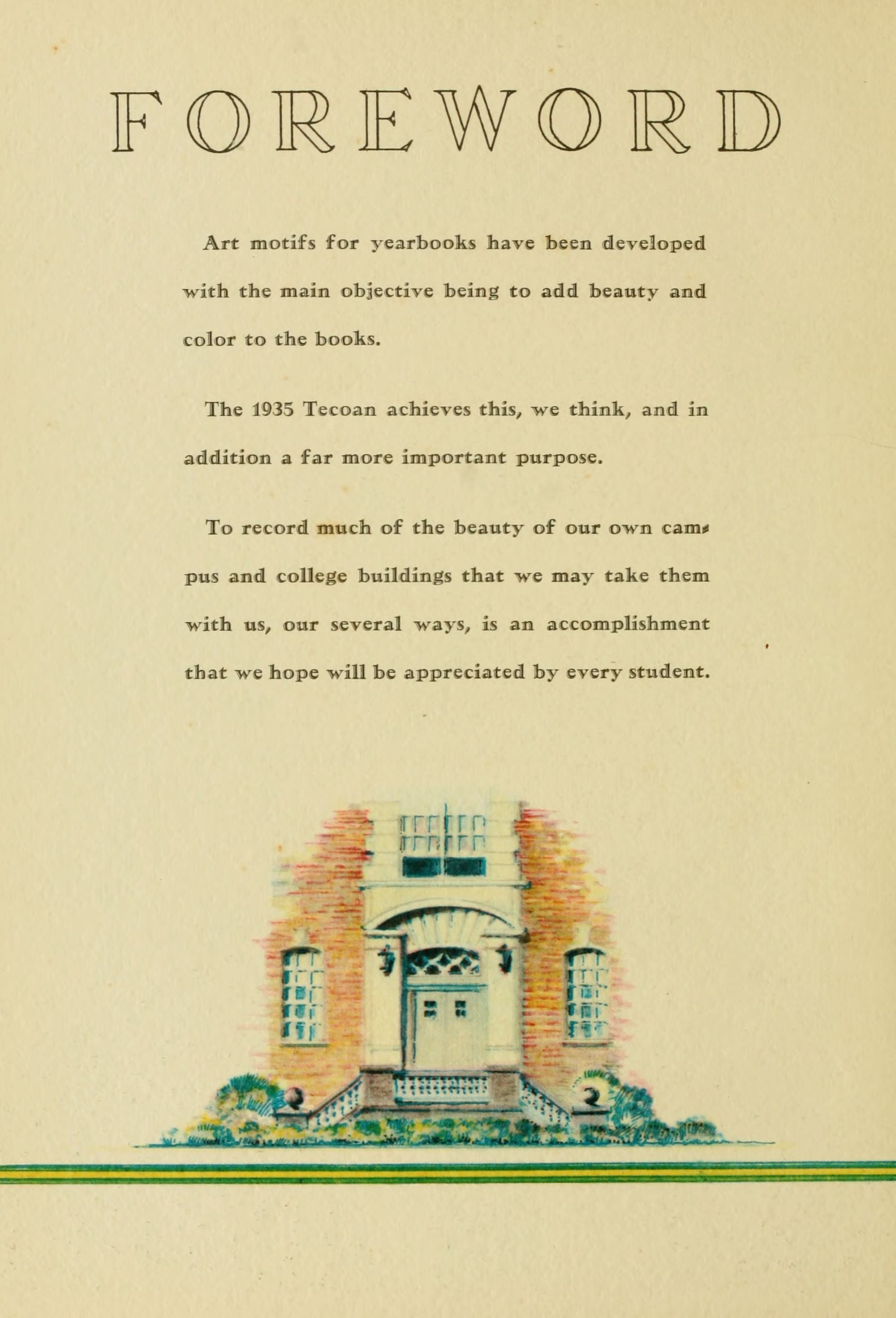To record much of the beauty of our own campus and college buildings that we may take them with us, our several ways, is an accomplishment that we hope will be appreciated by every student.