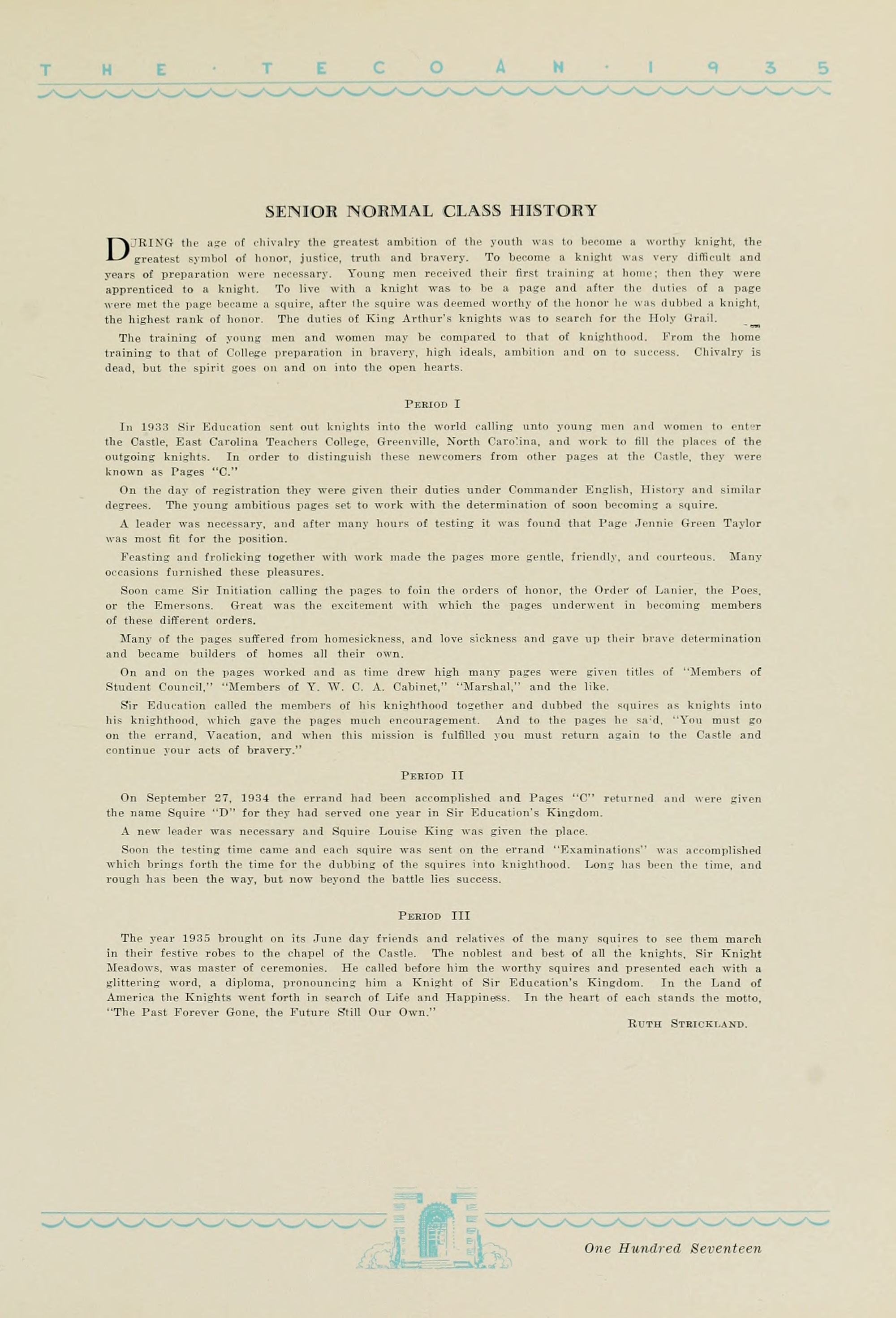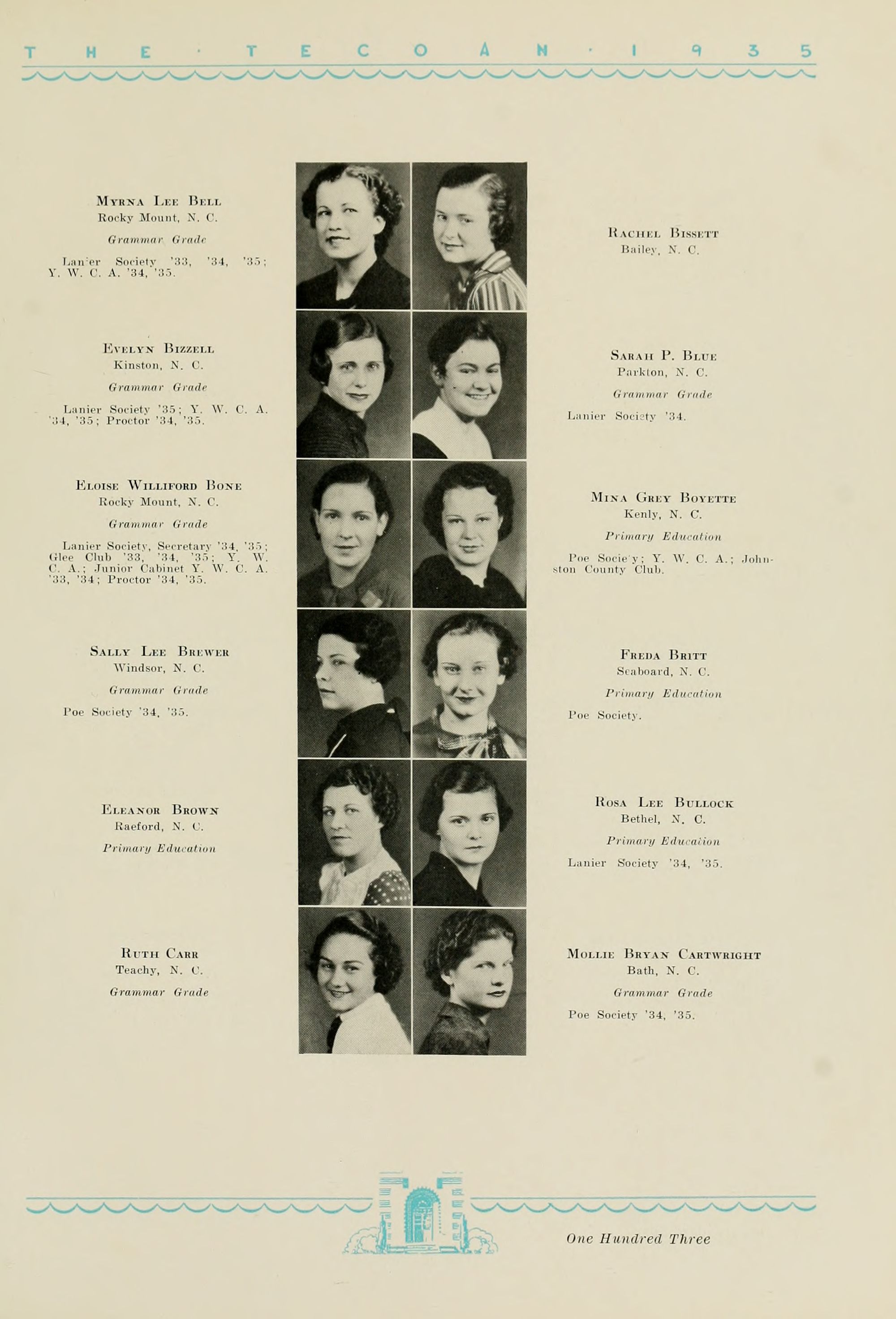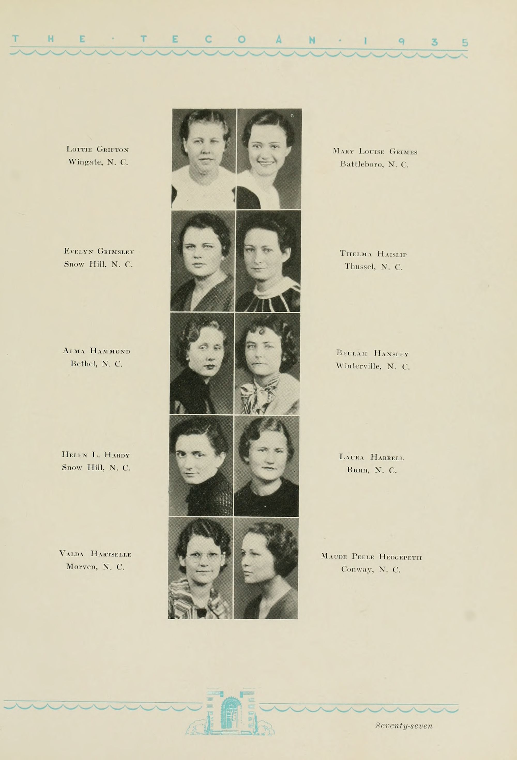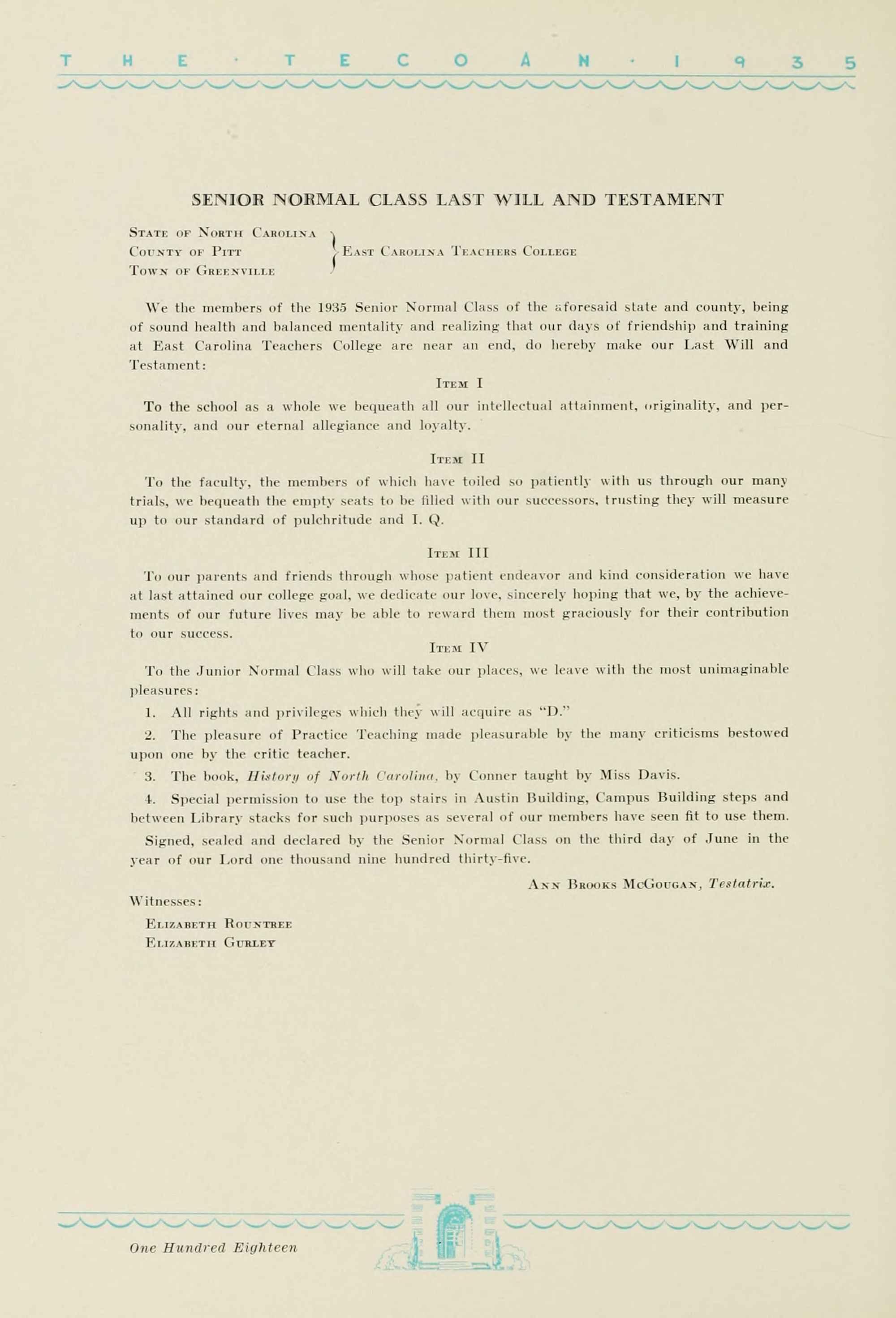 1935 Tecoan, yearbook of East Carolina Teachers College. The first yearbook published by the students of East Carolina Teachers College, The Tecoan, debuted in 1923. The name of the yearbook changed to the Buccaneer in 1953. The Buccaneer suspended publication from 1976-1978 and 1991-2005, finally ceasing in 2018. It was superseded by Anchors Away in 2019.
