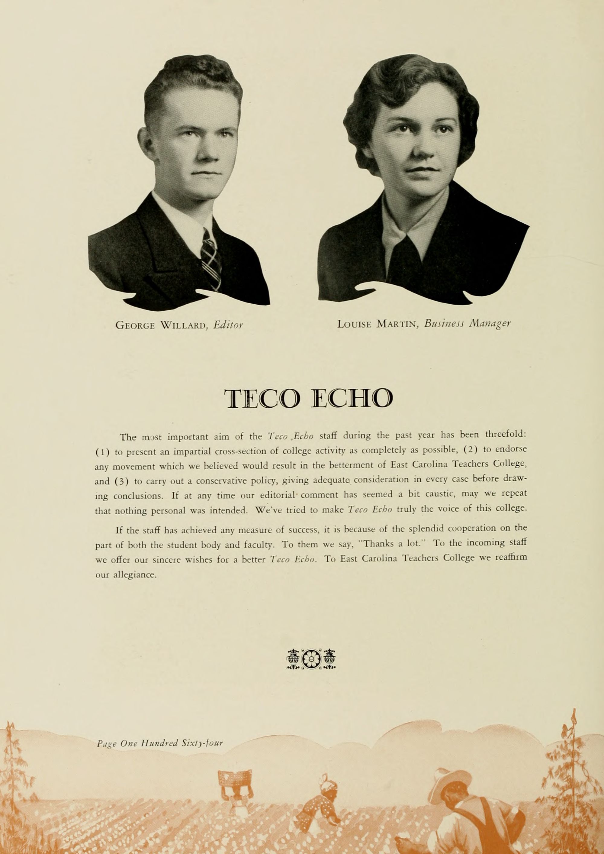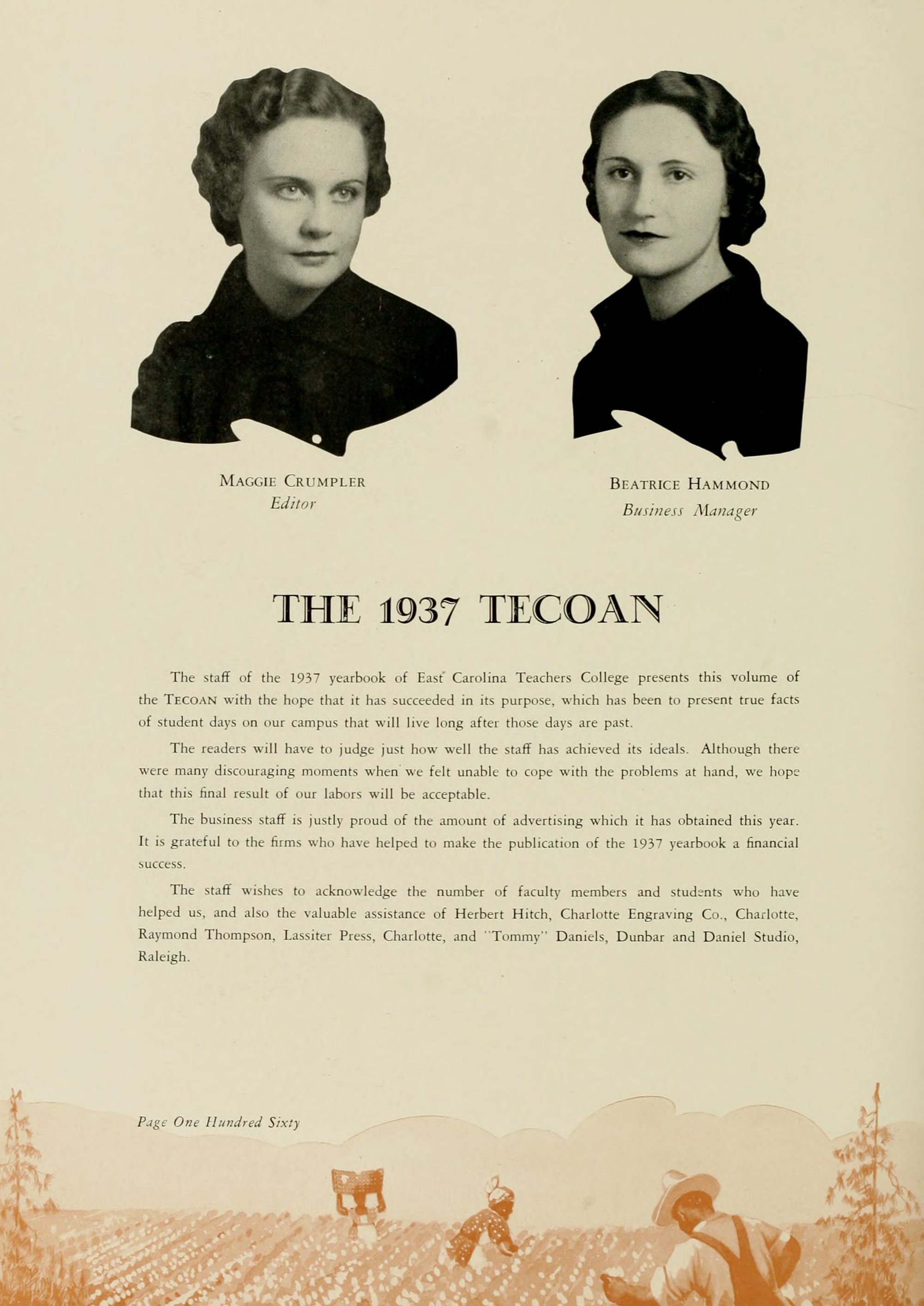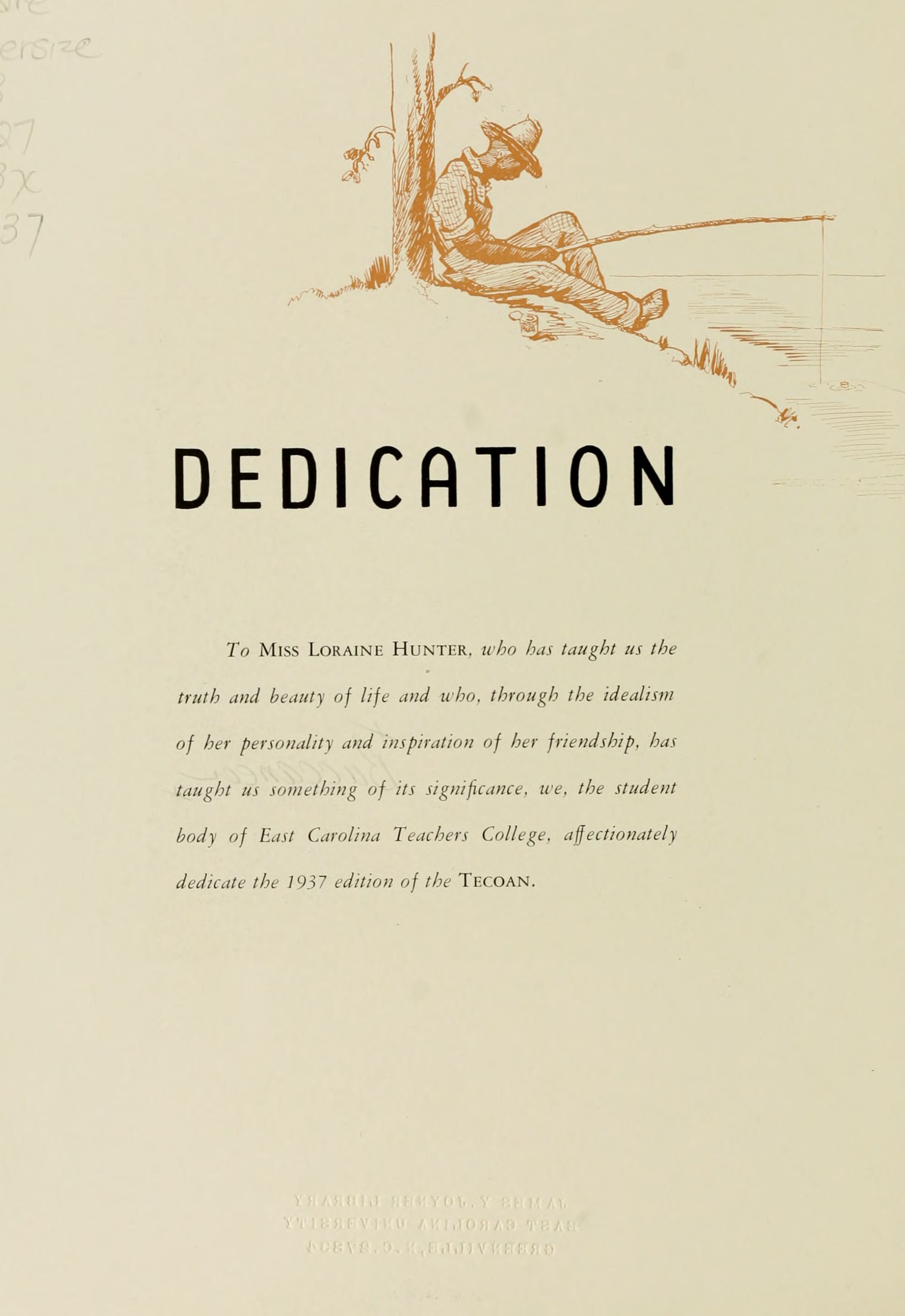 To Miss Loraine Hunter, who has taught us the truth and beauty of life and who. through the idealism of her personality and inspiration of her friendship, has taught us something of its significance, we, the student body of East Carolina Teachers College, affectionately dedicate the 1937 edition of the TECOAN.