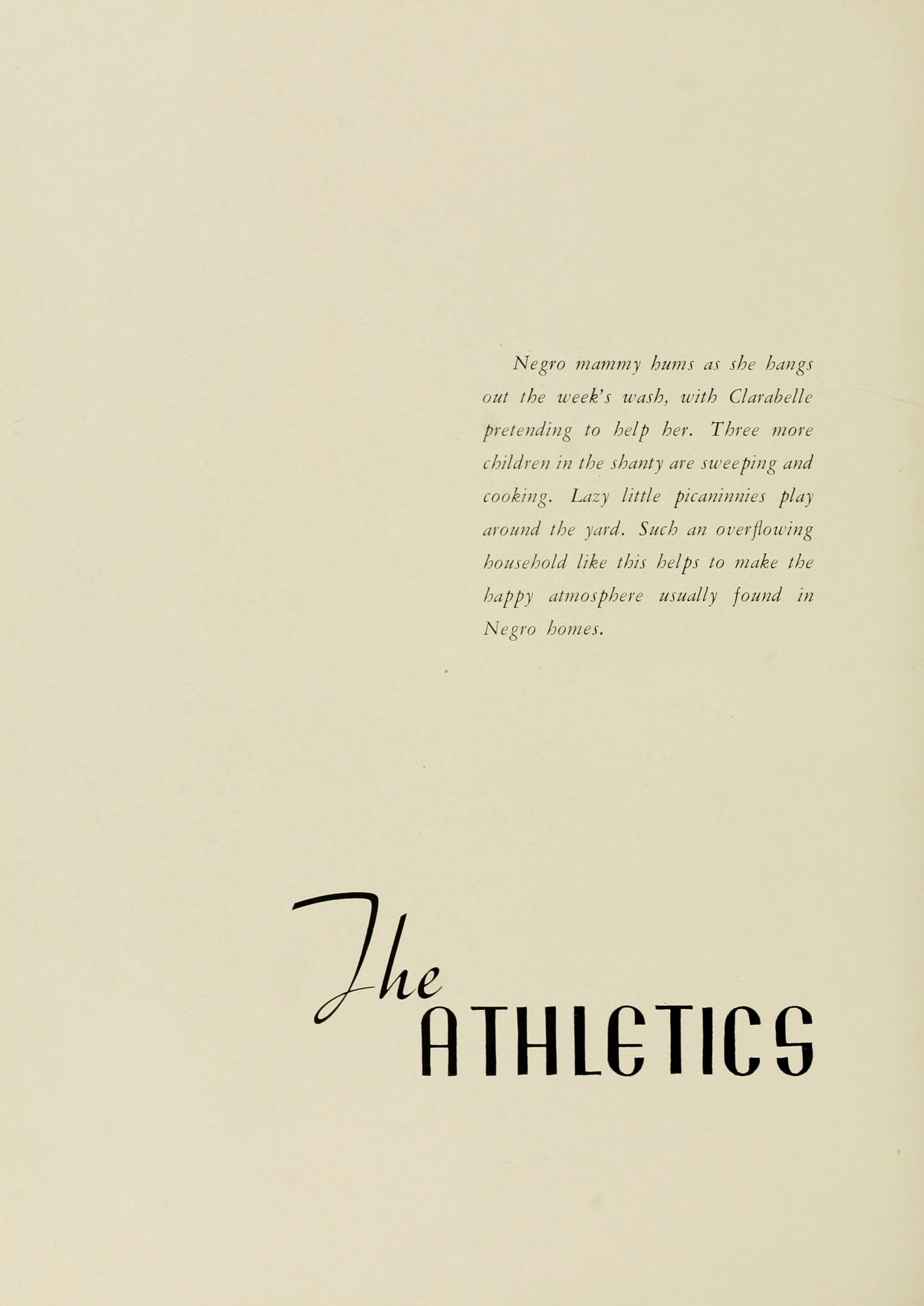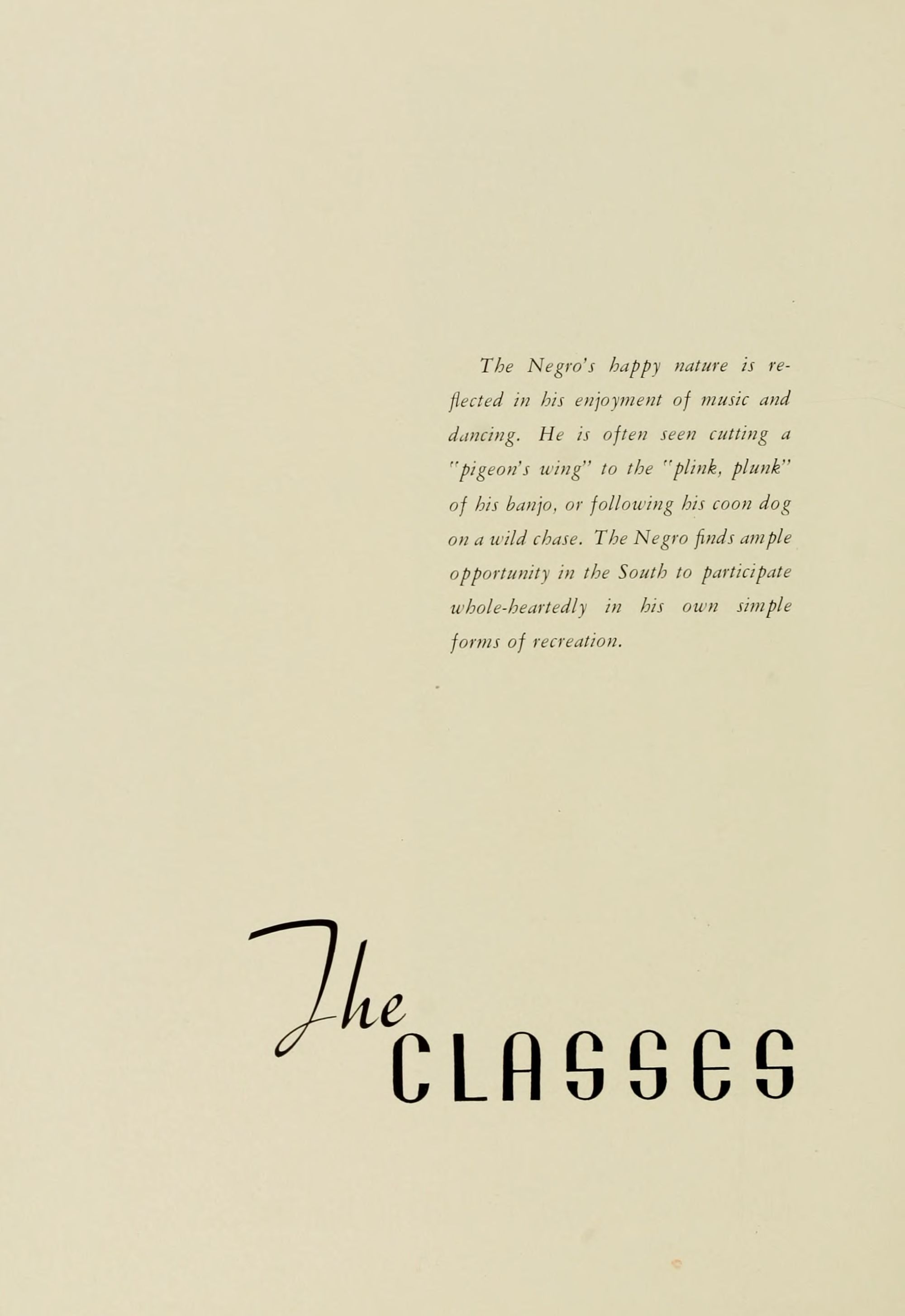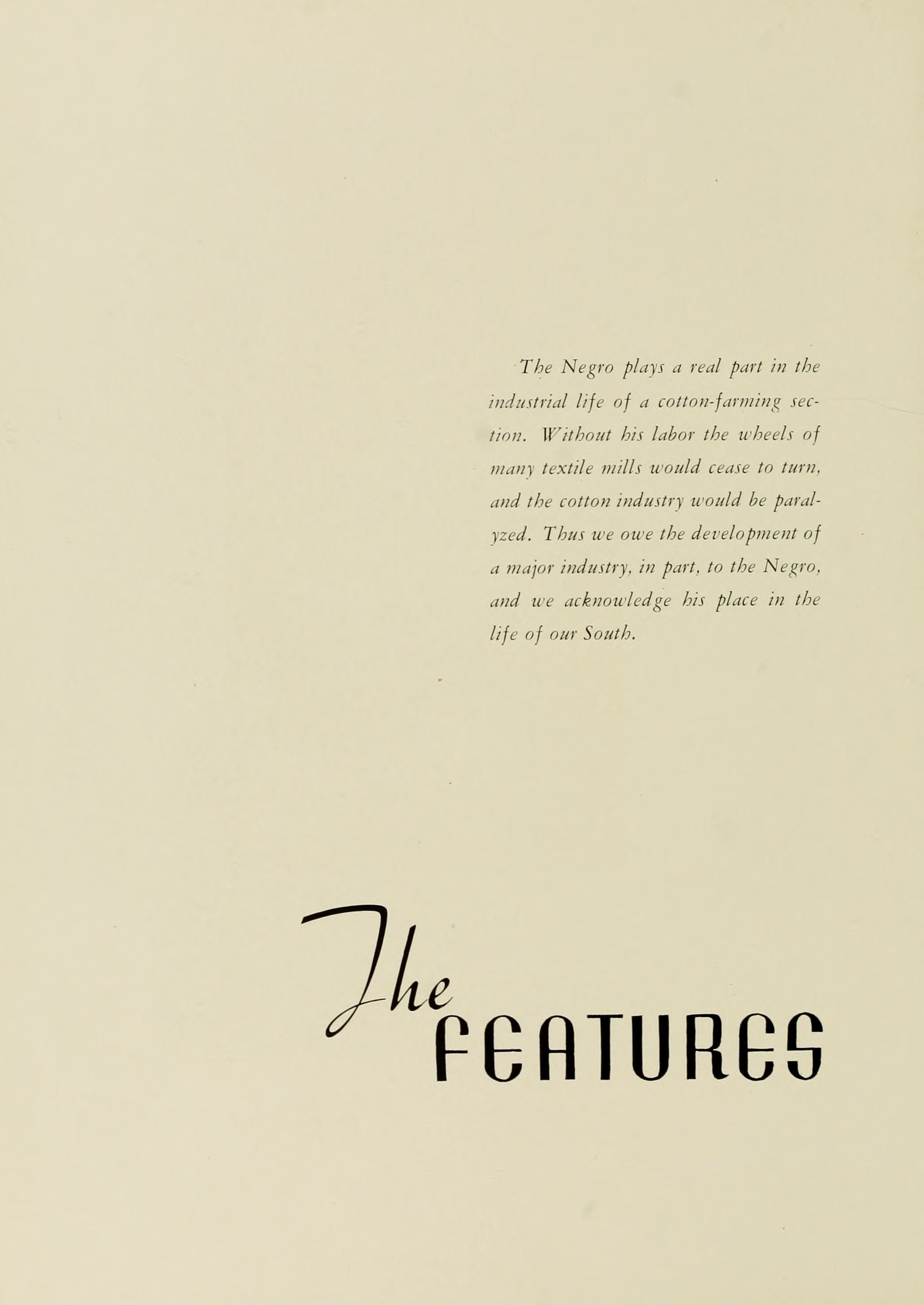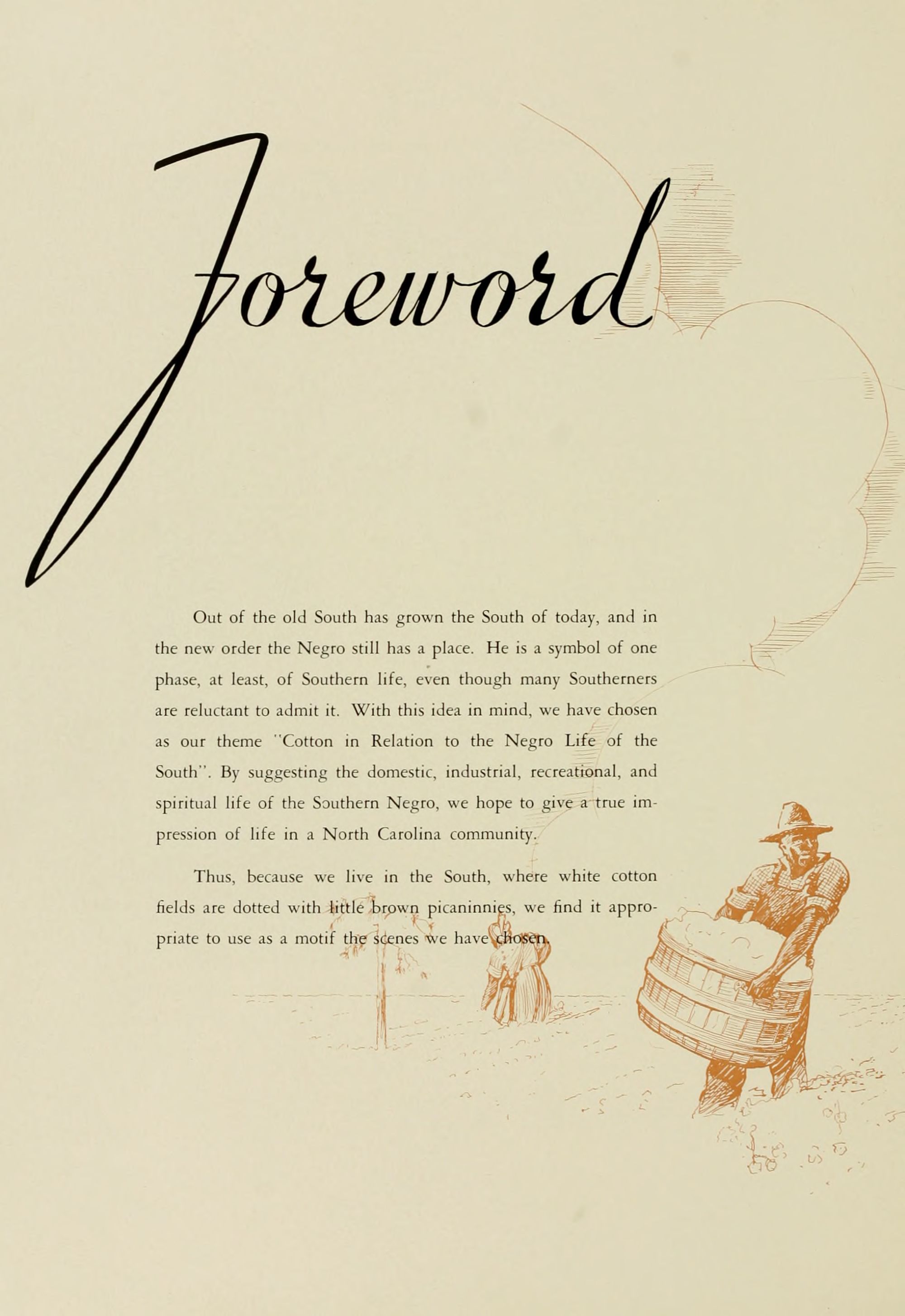 Out of the old South has grown the South of today, and in the new order the Negro still has a place. He is a symbol of one phase, at least, of Southern life, even though many Southerners are reluctant to admit it. With this idea in mind, we have chosen as our theme "Cotton in Relation to the Negro Life of the South". By suggesting the domestic, industrial, recreational, and spiritual life of the Southern Negro, we hope to give a true impression of life in a North Carolina community.