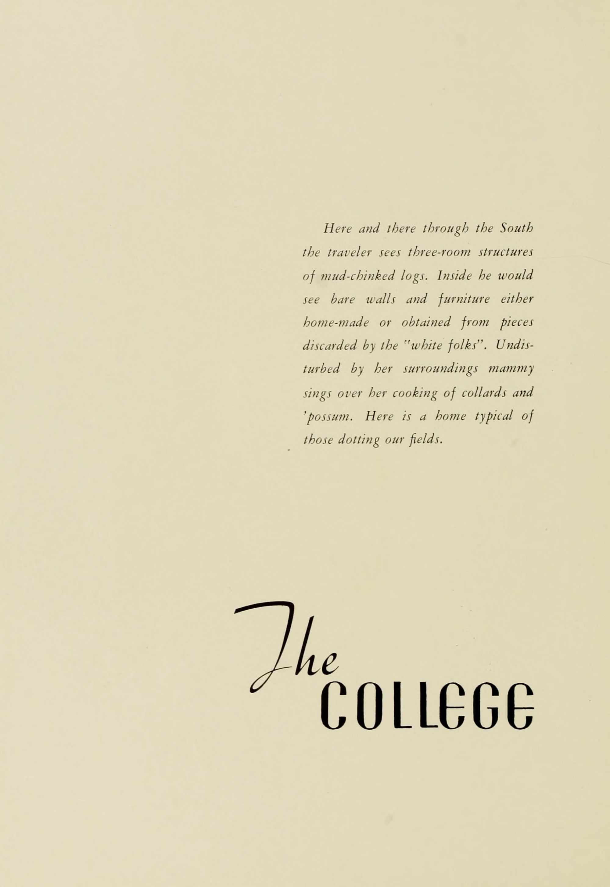Here and there through the South the traveler sees three-room structures of mud-chinked logs. Inside he would see bare walls and furniture either home-made or obtained from pieces discarded by the "white folks". Undisturbed by her surroundings mammy sings over her cooking of collards and 'possum. Here is a home typical of those dotting our fields.