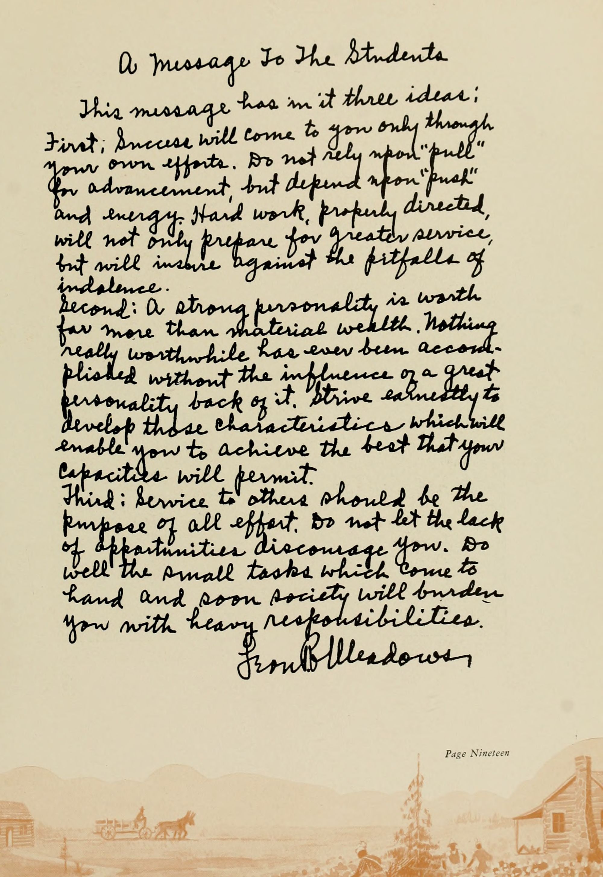 This message has in it three ideass: First, Success will come to you only through your own efforts. Do not rely upon "pull" for advancement, but depend upon "push" and energy. Hard work, propery directed, will not only prepare for greater service, but will insure against the pitfalls of indolence.