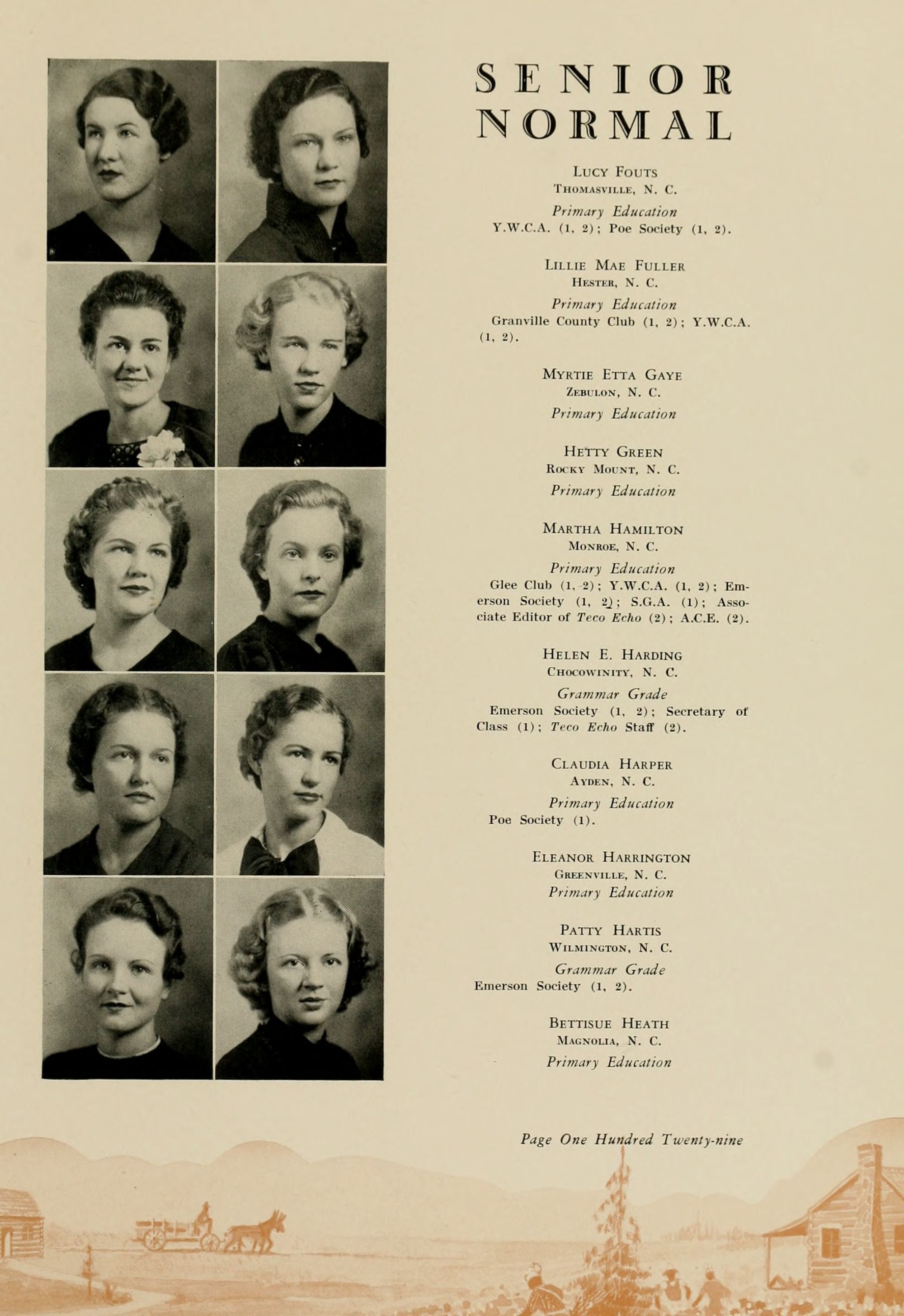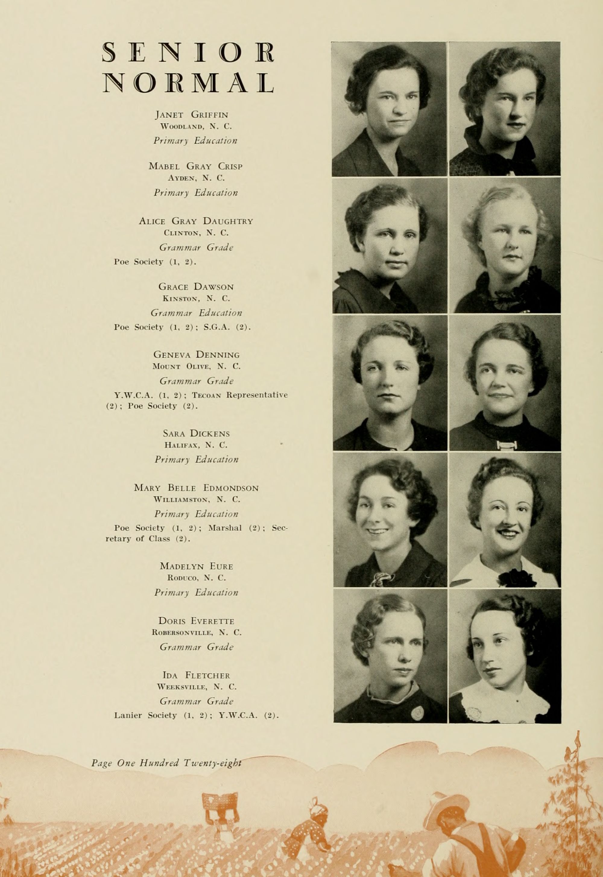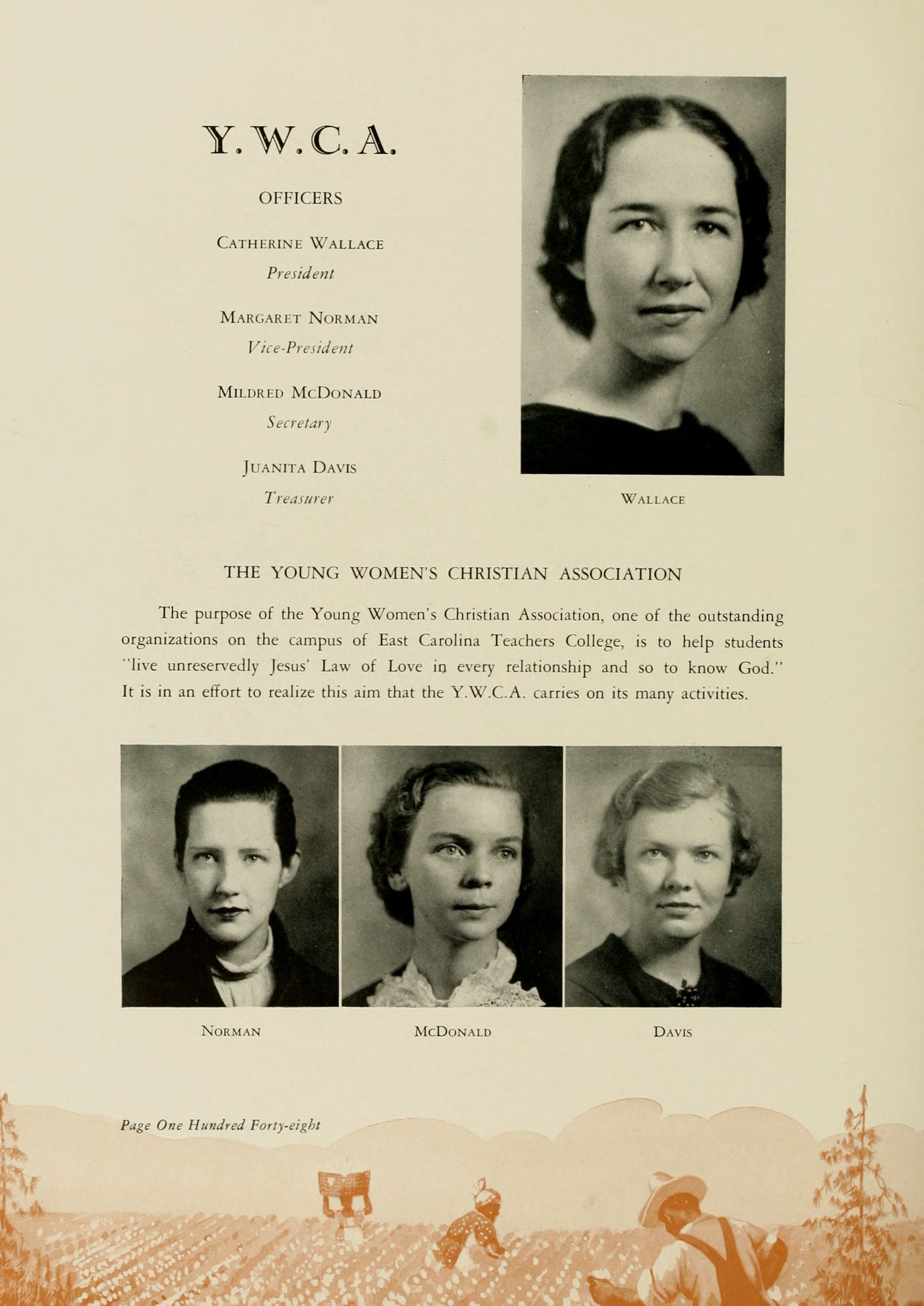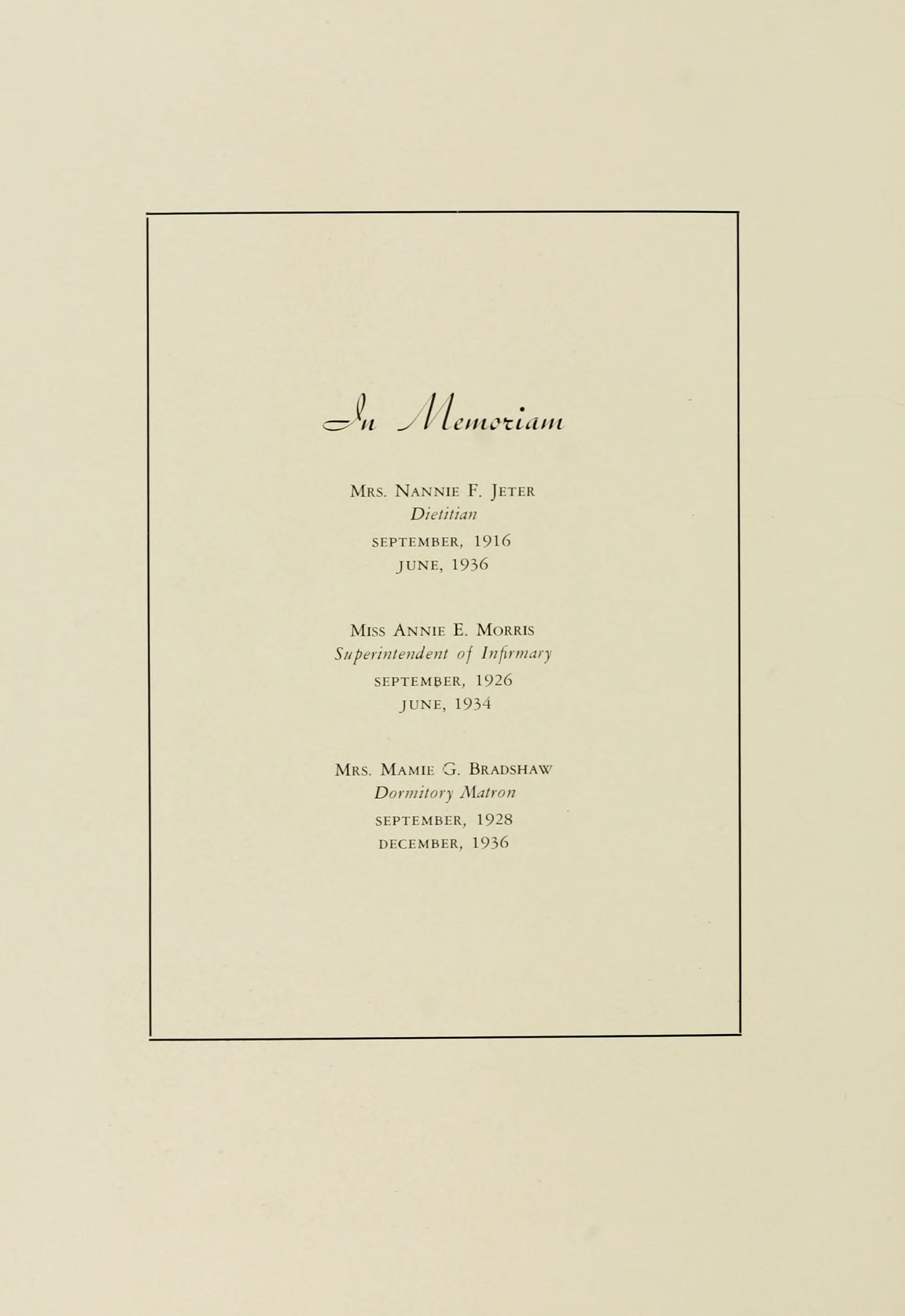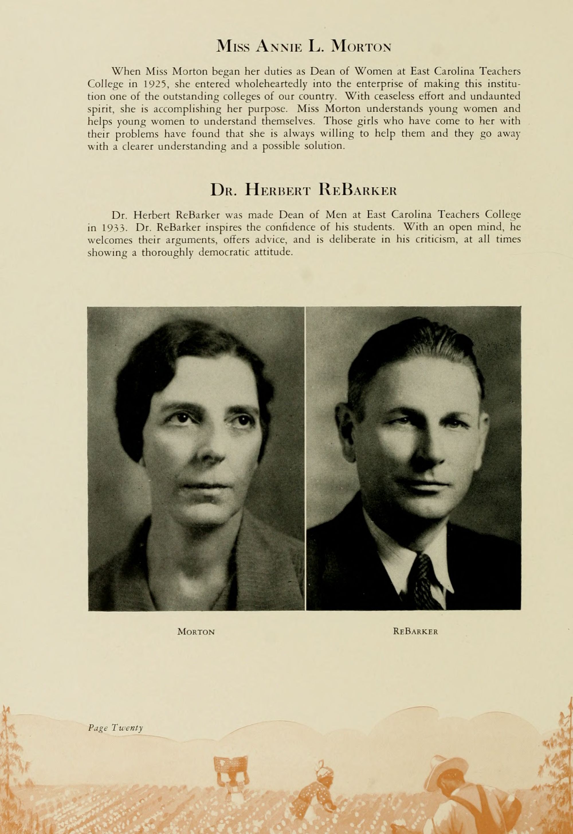 When Miss Morton began her duties as Dean of Women at East Carolina Teachers College in 1925, she entered wholeheartedly into the enterprise of making this institution one of the outstanding colleges of our country. With ceaseless effort and undaunted spirit, she is accomplishing her purpose. Miss Morton understands young women and helps young women to understand themselves. Those girls who have come to her with their problems have found that she is always willing to help them and they go away with a clearer understanding and a possible solution.