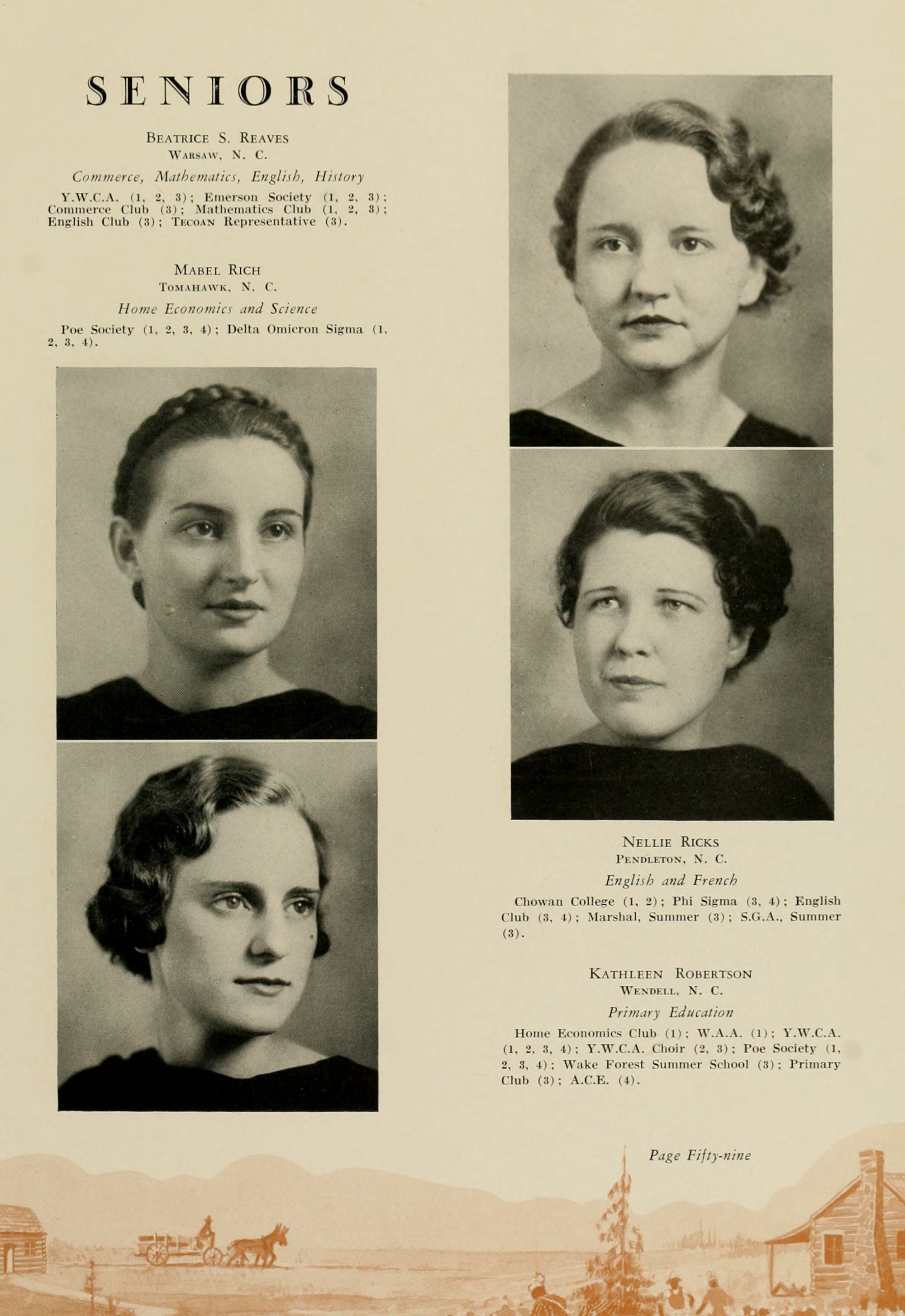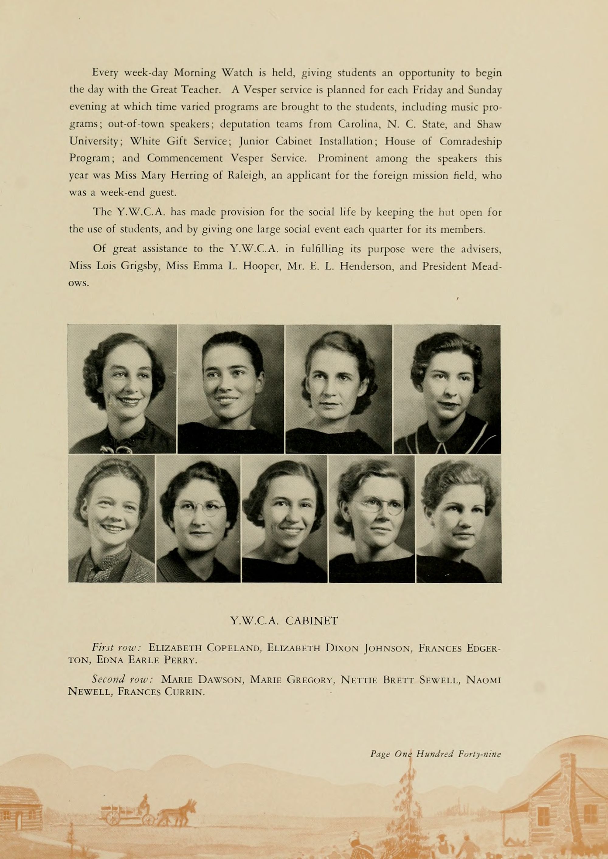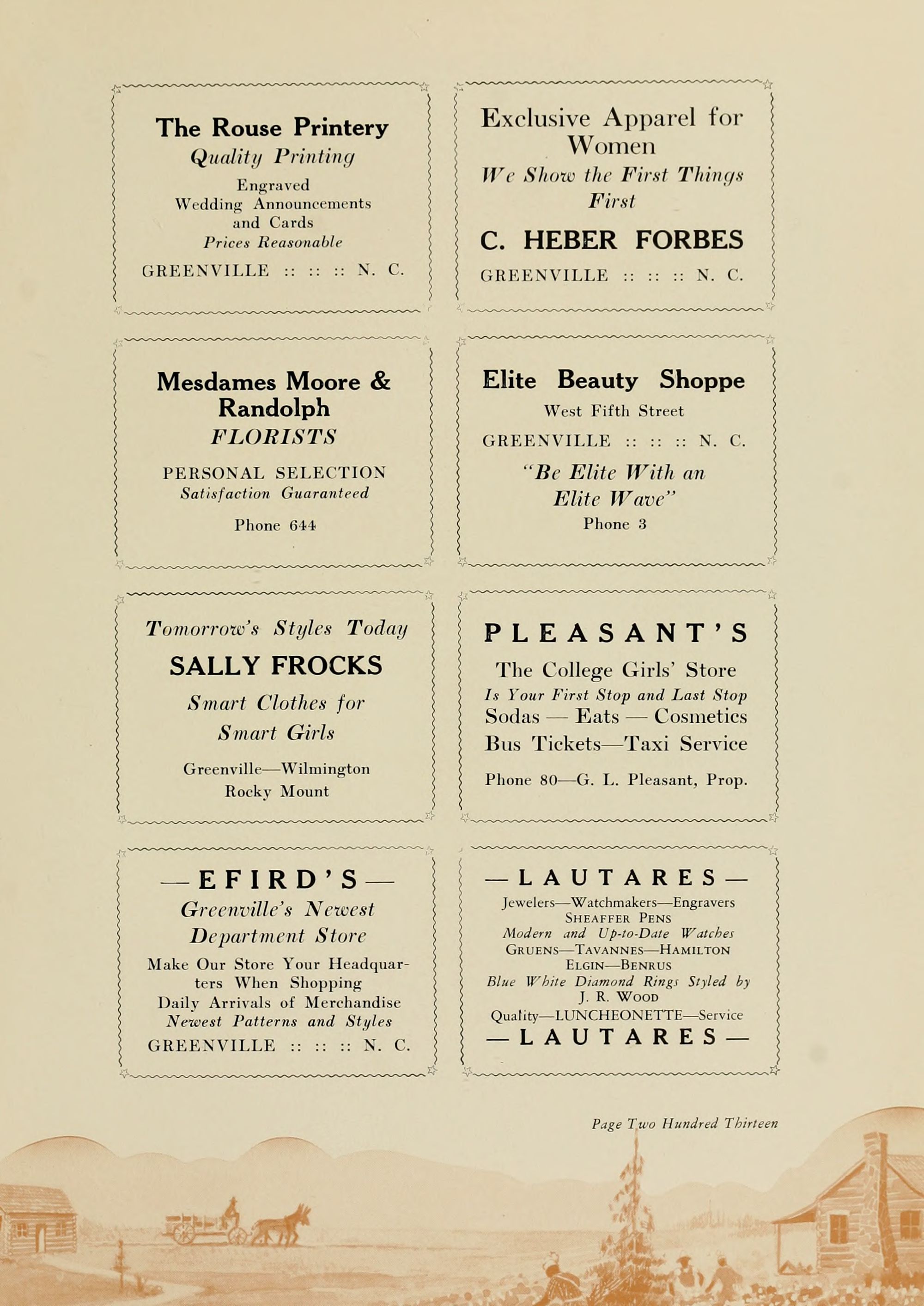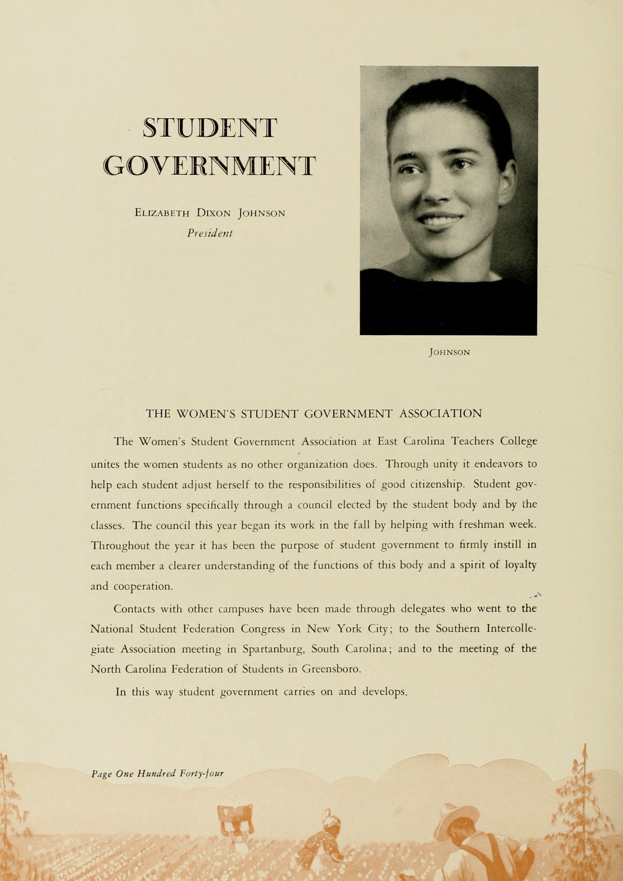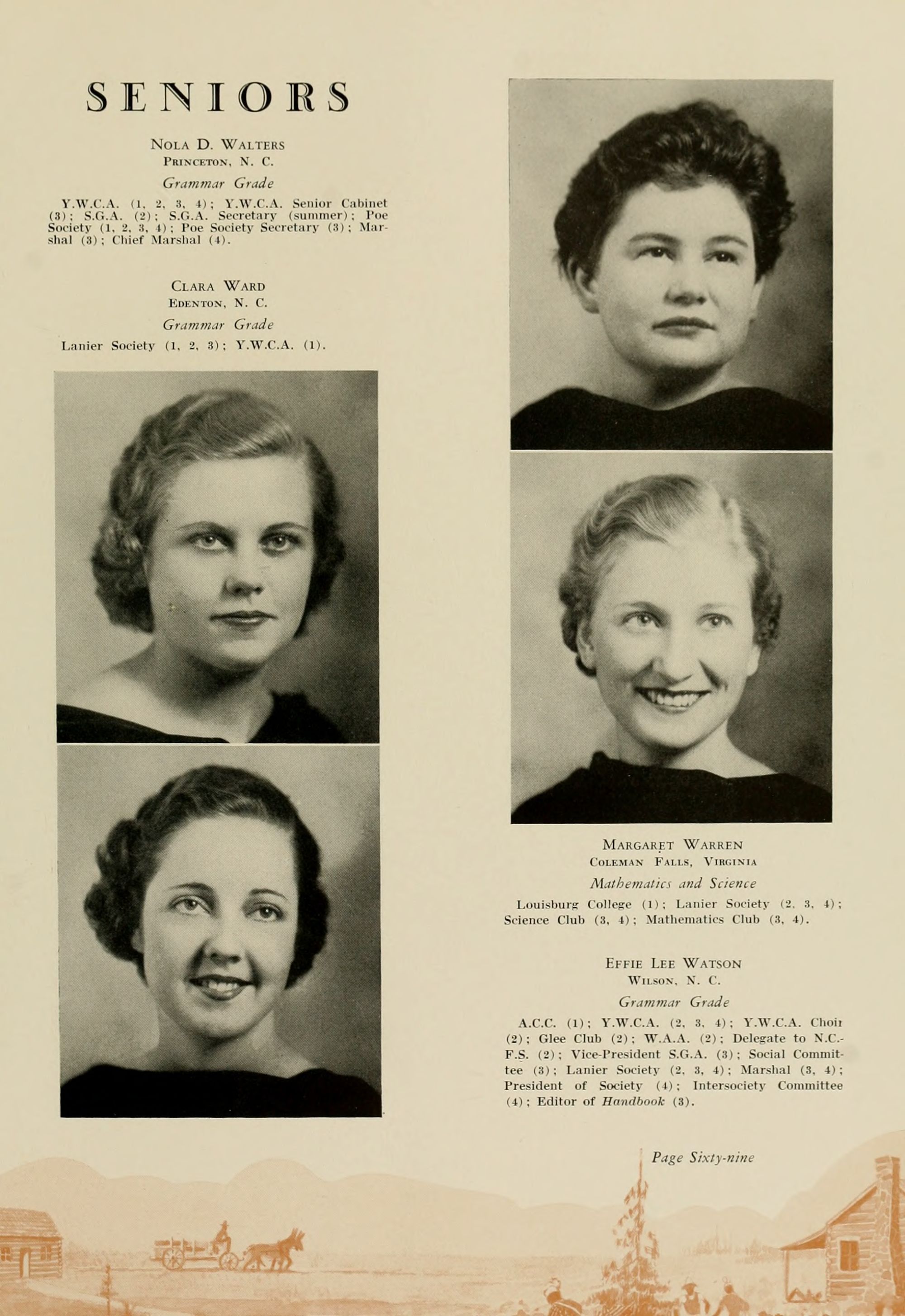 When Miss Morton began her duties as Dean of Women at East Carolina Teachers College in 1925, she entered wholeheartedly into the enterprise of making this institution one of the outstanding colleges of our country. With ceaseless effort and undaunted spirit, she is accomplishing her purpose. Miss Morton understands young women and helps young women to understand themselves. Those girls who have come to her with their problems have found that she is always willing to help them and they go away with a clearer understanding and a possible solution.