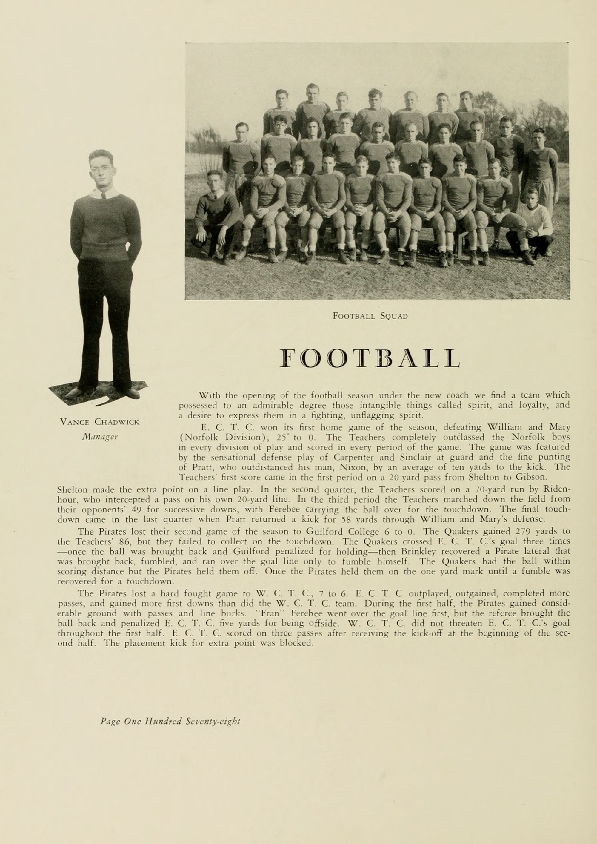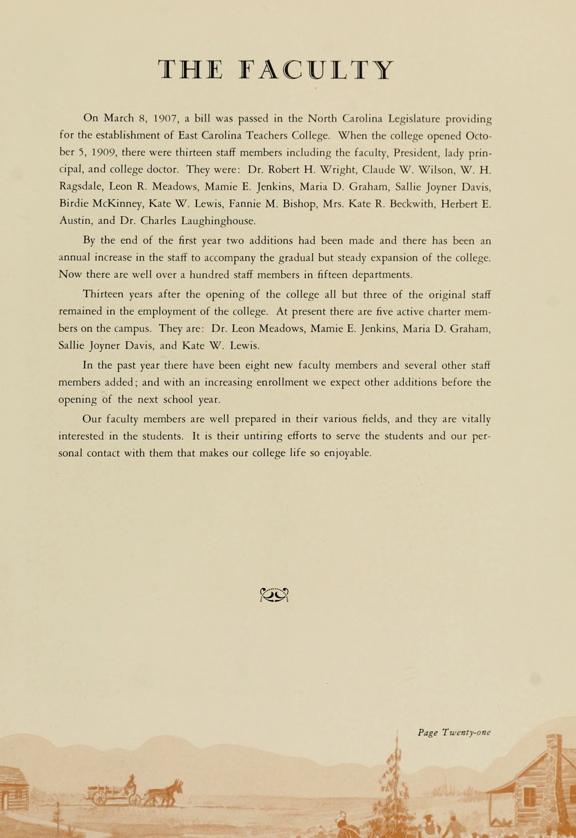 On March 8, 1907, a bill was passed in the North Carolina Legislature providing for the establishment of East Carolina Teachers College. When the college opened October 5, 1909, there were thirteen staff members including the faculty, President, lady principal, and college doctor. They were: Dr. Robert H. Wright, Claude W. Wilson, W. H. Ragsdale, Leon R. Meadows, Mamie E. Jenkins, Maria D. Graham, Sallie Joyner Davis, Birdie McKinney, Kate W. Lewis, Fannie M. Bishop, Mrs. Kate R. Beckwith, Herbert E. Austin, and Dr. Charles Laughinghouse.