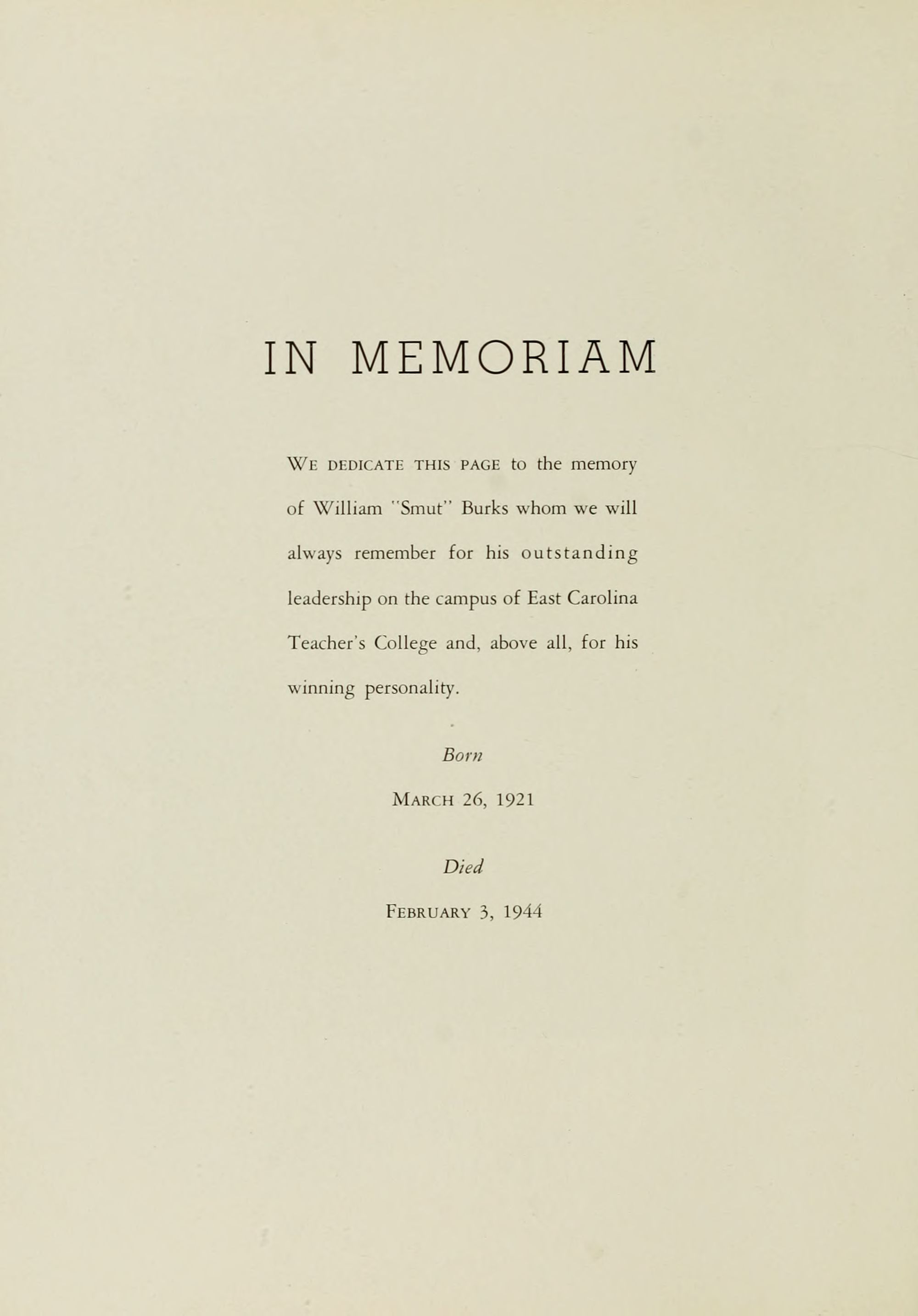 We dedicate this page to the memory of William "Smut" Burks whom we will always remember for his outstanding leadership on the campus of East Carolina Teacher's College and, above all, for his winning personality.