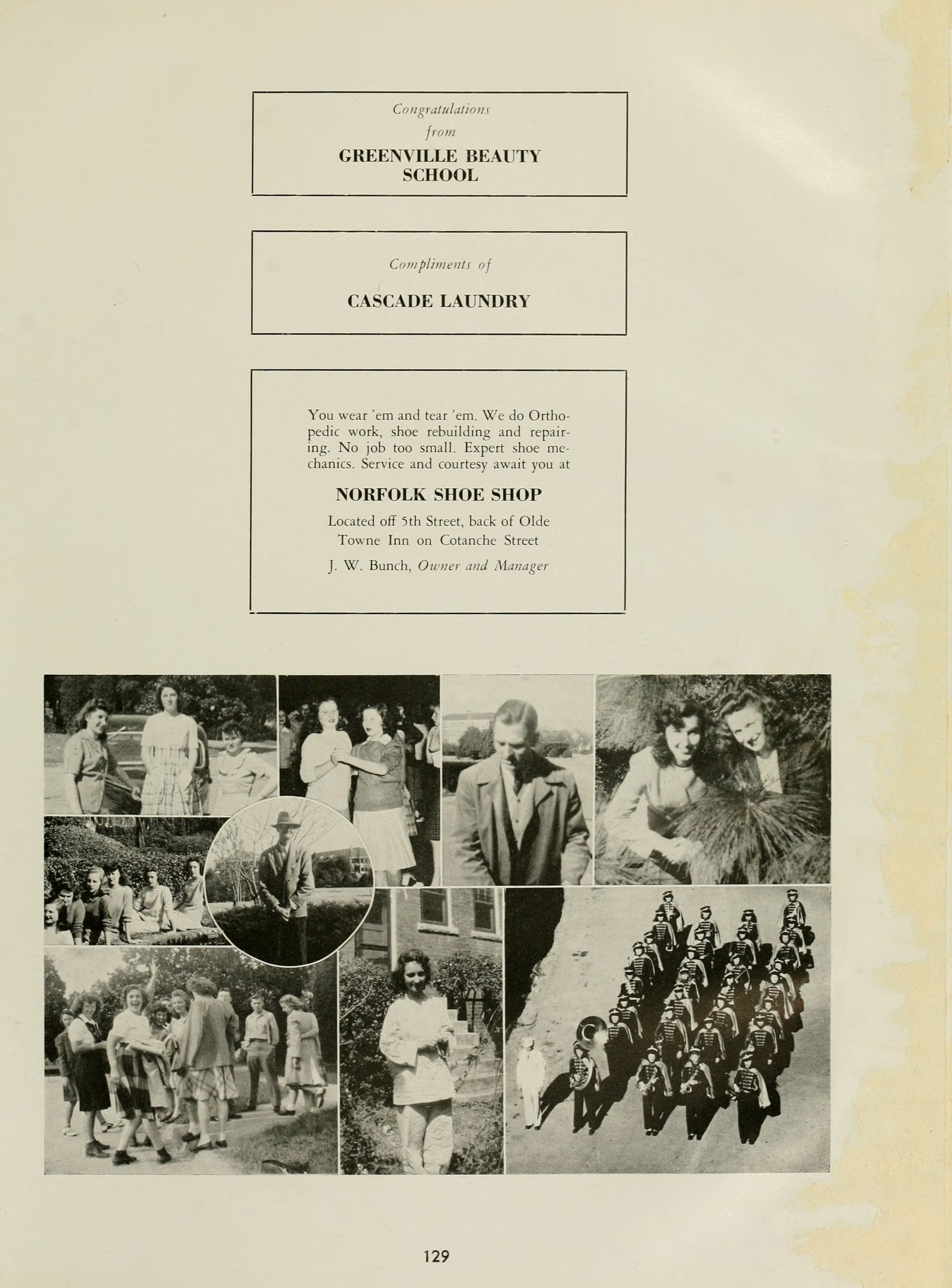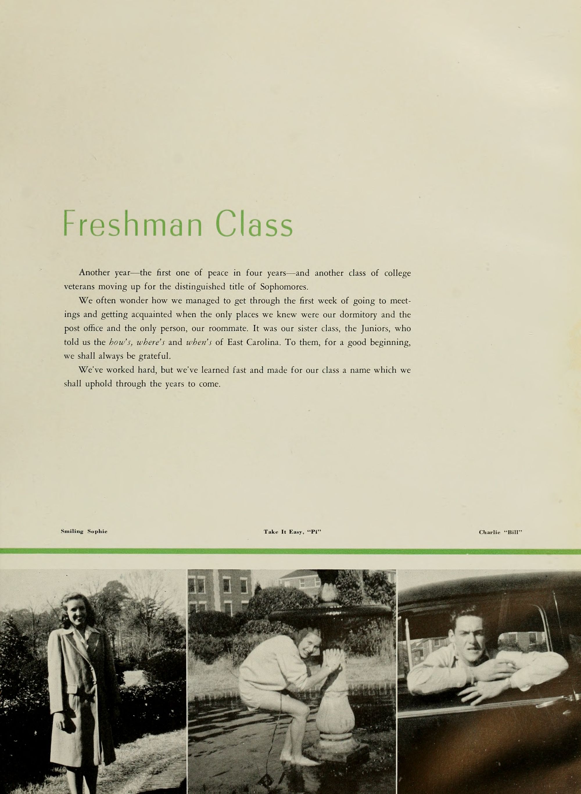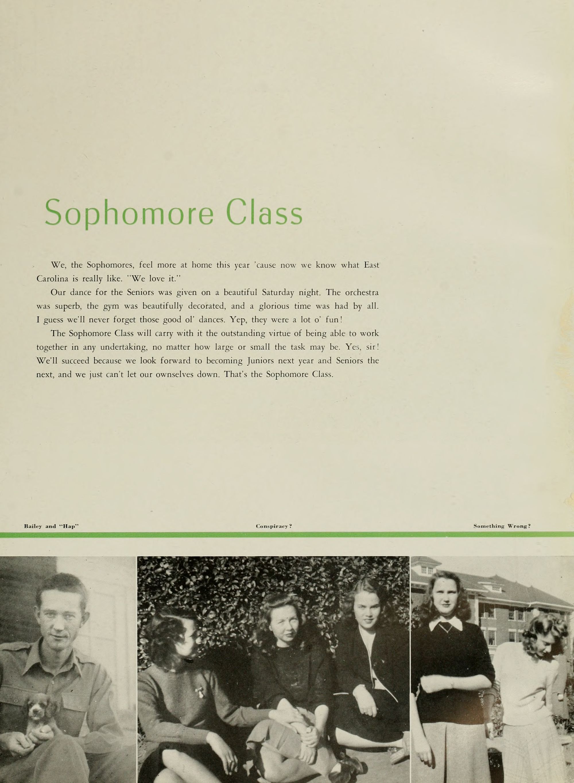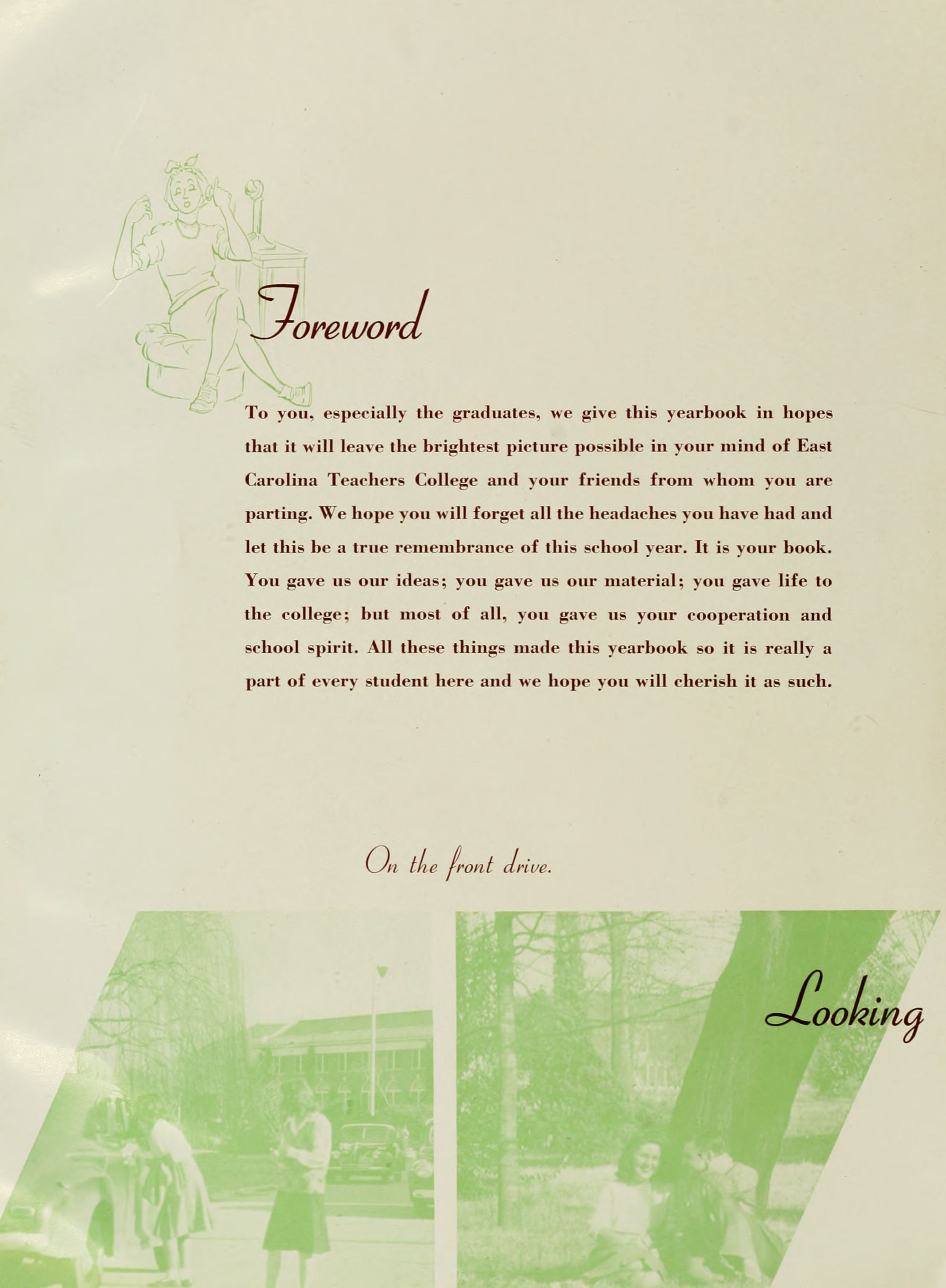 To you, especially the graduates, we give this yearbook in hopes that it will leave the brightest picture possible in your mind of East Carolina Teachers College and your friends from whom you are parting. We hope you will forget all the headaches you have had and let this be a true remembrance of this school year. It is your book. You gave us our ideas; you gave us our material; yon gave life to the college; but most of all, you gave us your cooperation and school spirit. All these things made this yearbook so it is really a part of every student here and we hope you will cherish it as such.