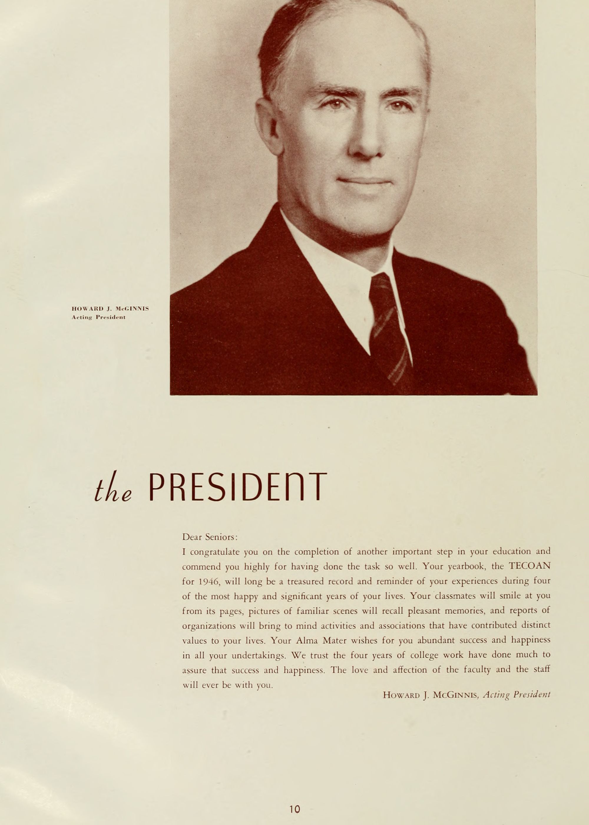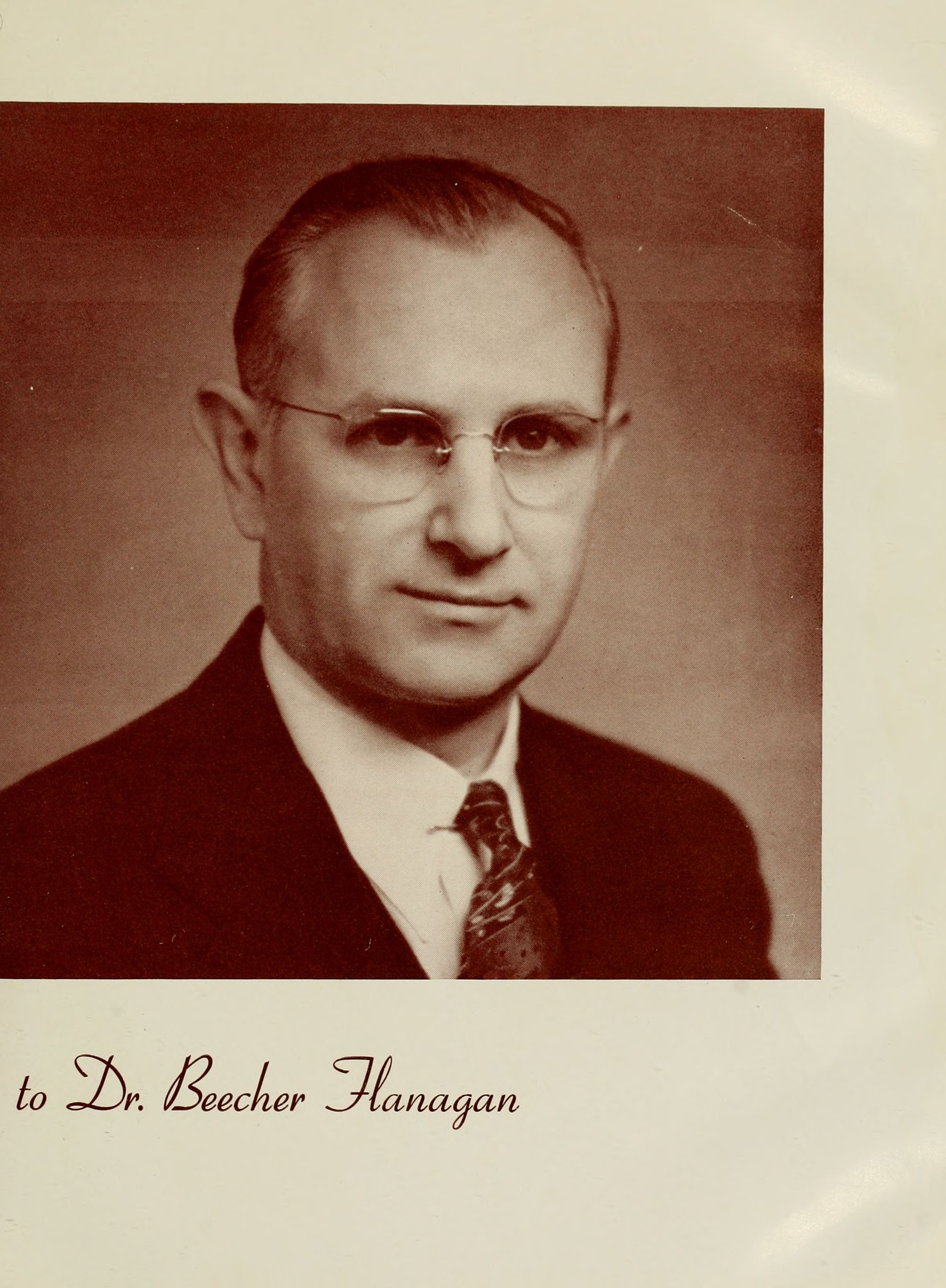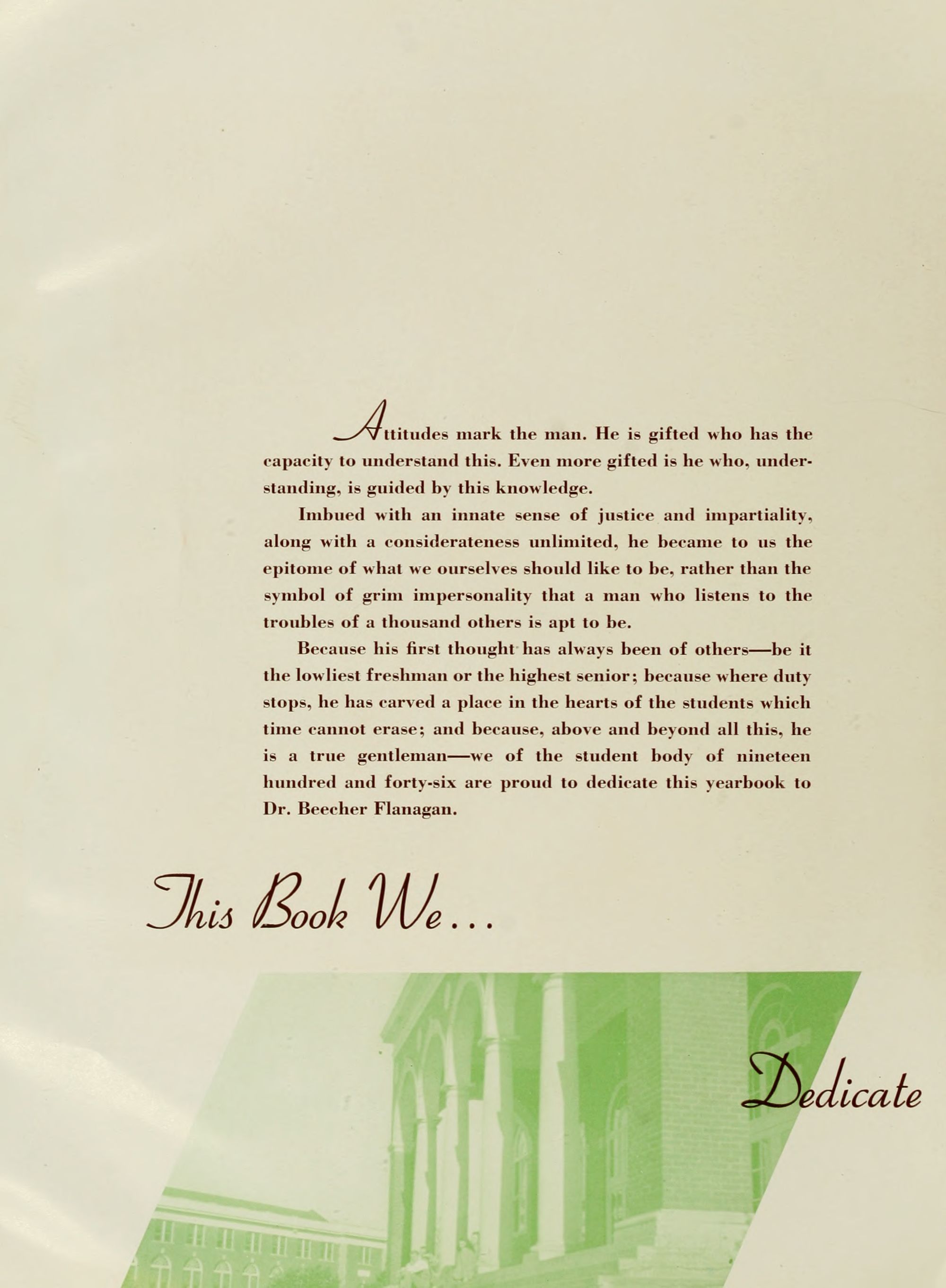 Because his first thought has always been of others - be it the lowliest freshman or the highest senior; because where duty stops, he has carved a place in the hearts of the students which time cannot erase; and because, above and beyond all this, he is a true gentleman - we of the student body of nineteen hundred and forty-six are proud to dedicate this yearbook to Dr. Beecher Flanagan.