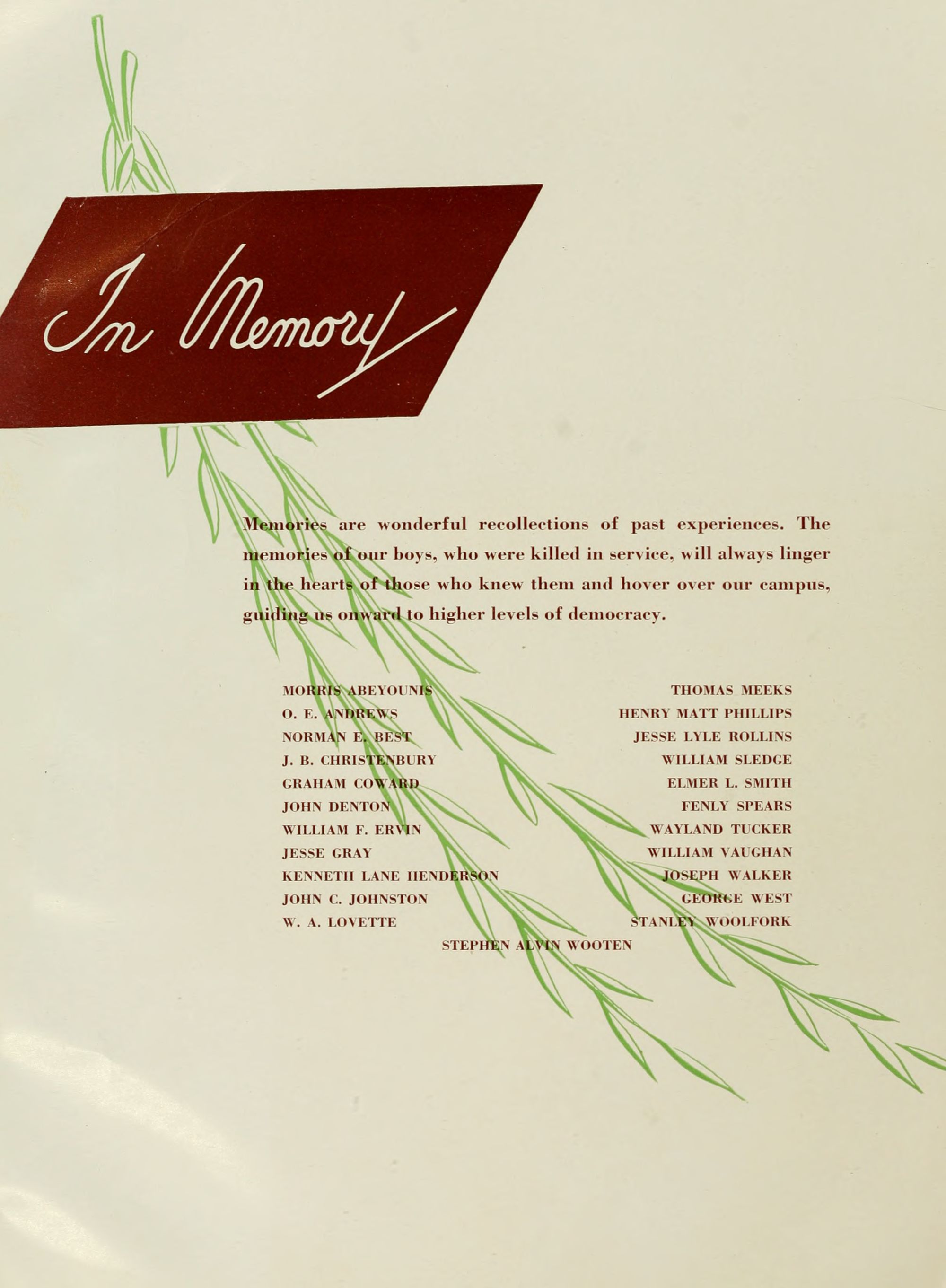 are wonderful recollections of past experiences. The memories of our hoys, who were killed in service, w ill always linger in the hearts of tliose who knew them and hover over our campus, to higher levels of democracy.