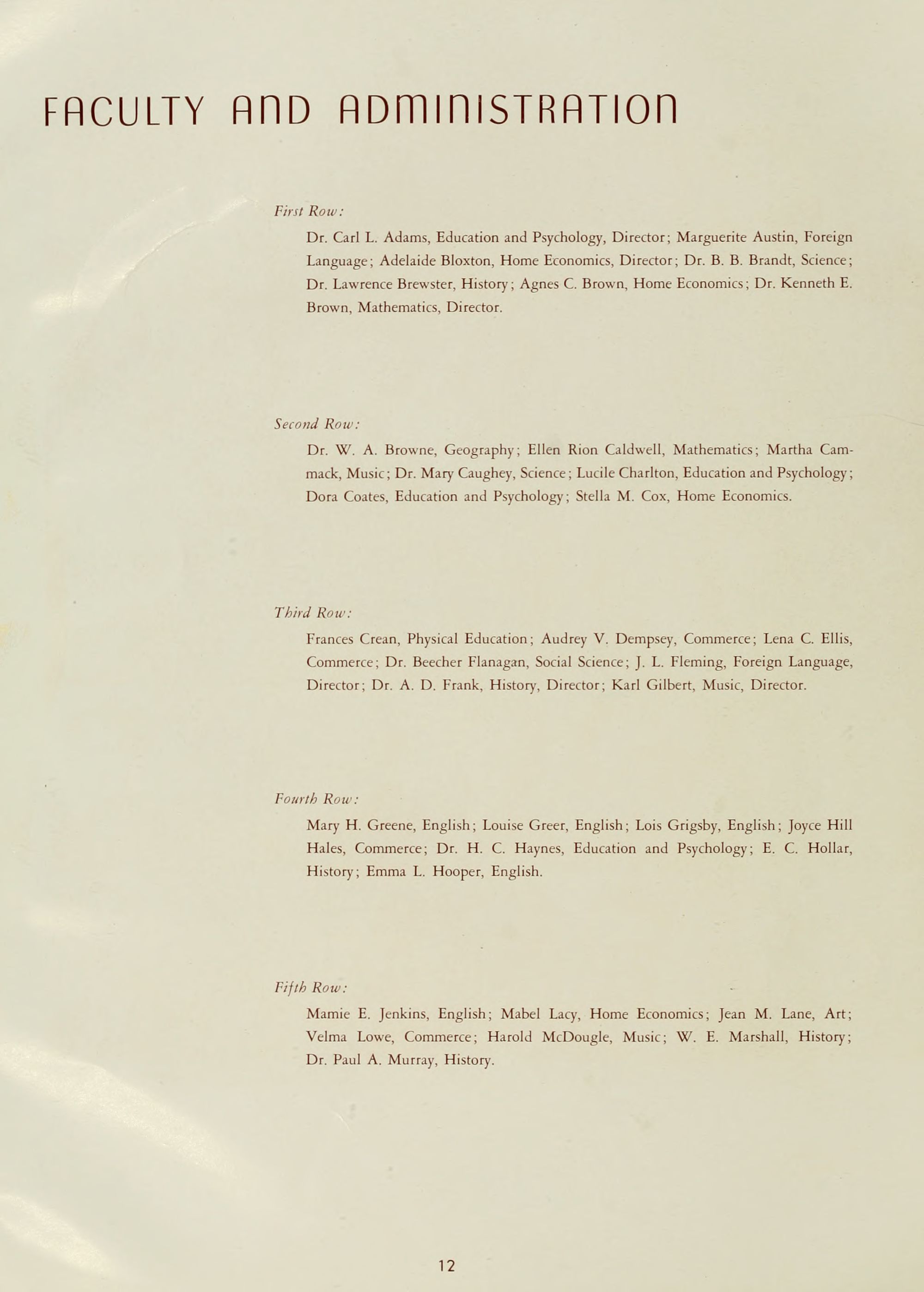 Dr. Carl L. Adams, Education and Psychology, Director; Marguerite Austin, Foreign Language; Adelaide Bloxton, Home Economics, Director; Dr. B. B. Brandt, Science; Dr. Lawrence Brewster, History ; Agnes C. Brown, Home Economics ; Dr. Kenneth E. Brown, Mathematics, Director.