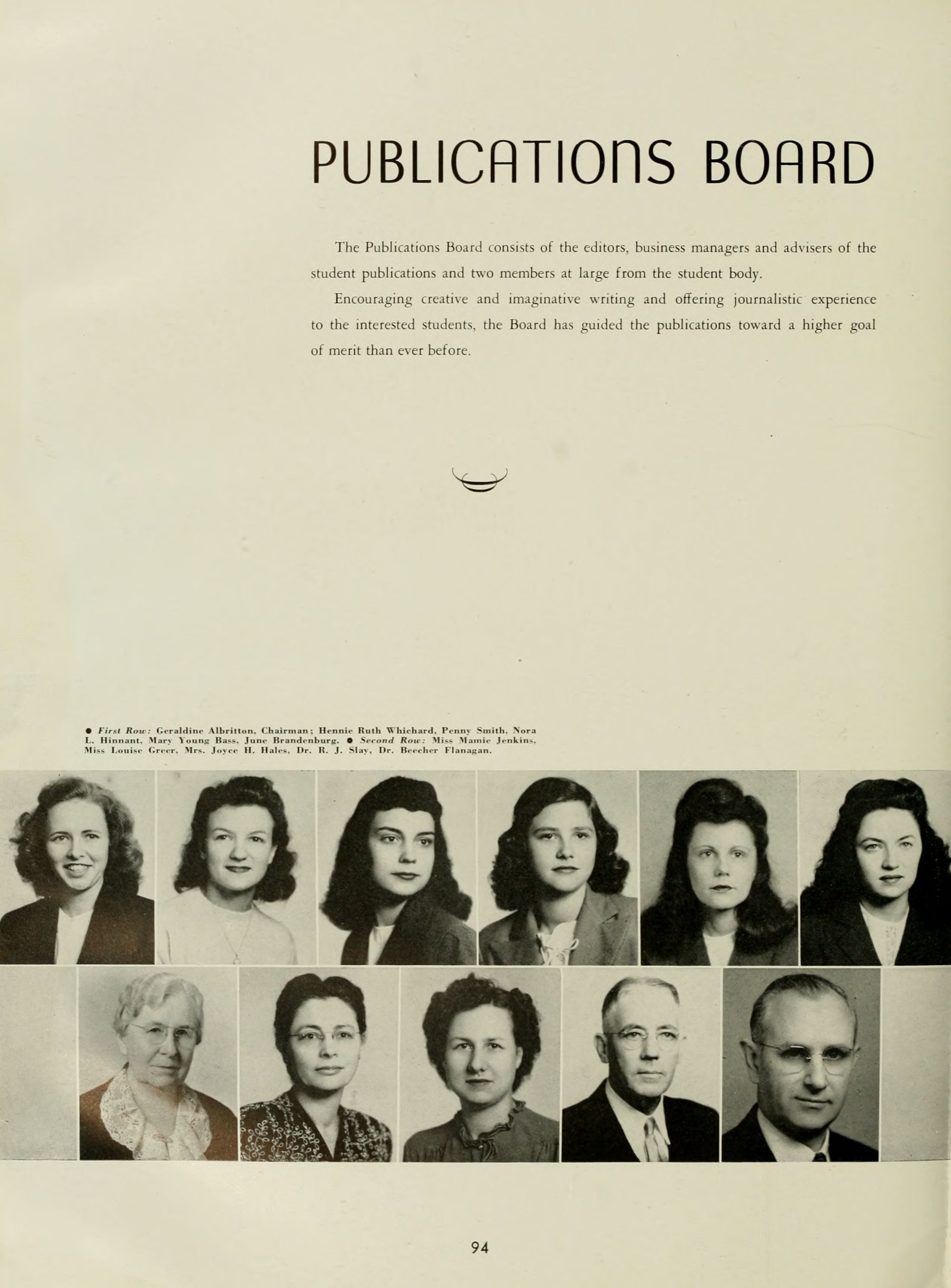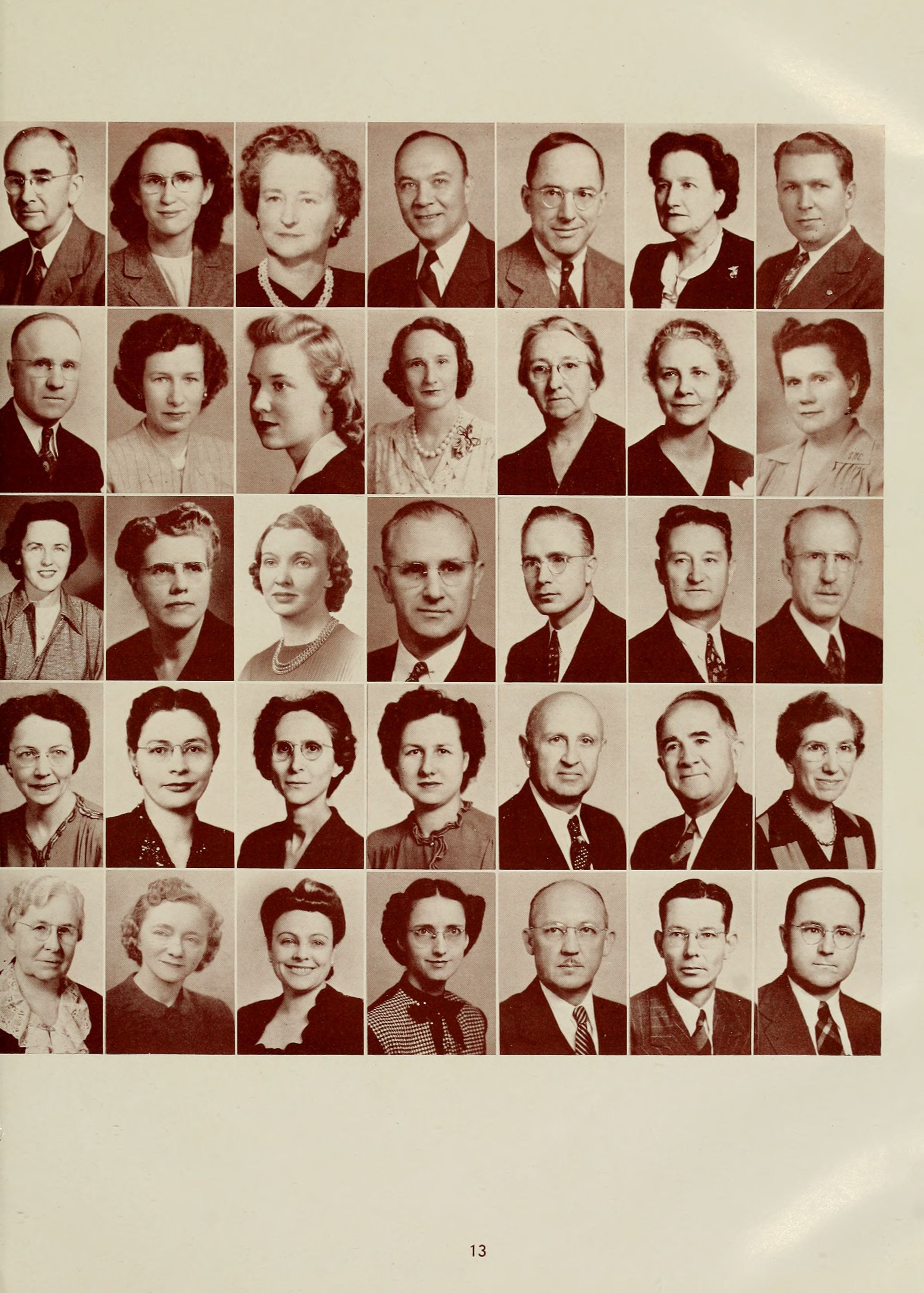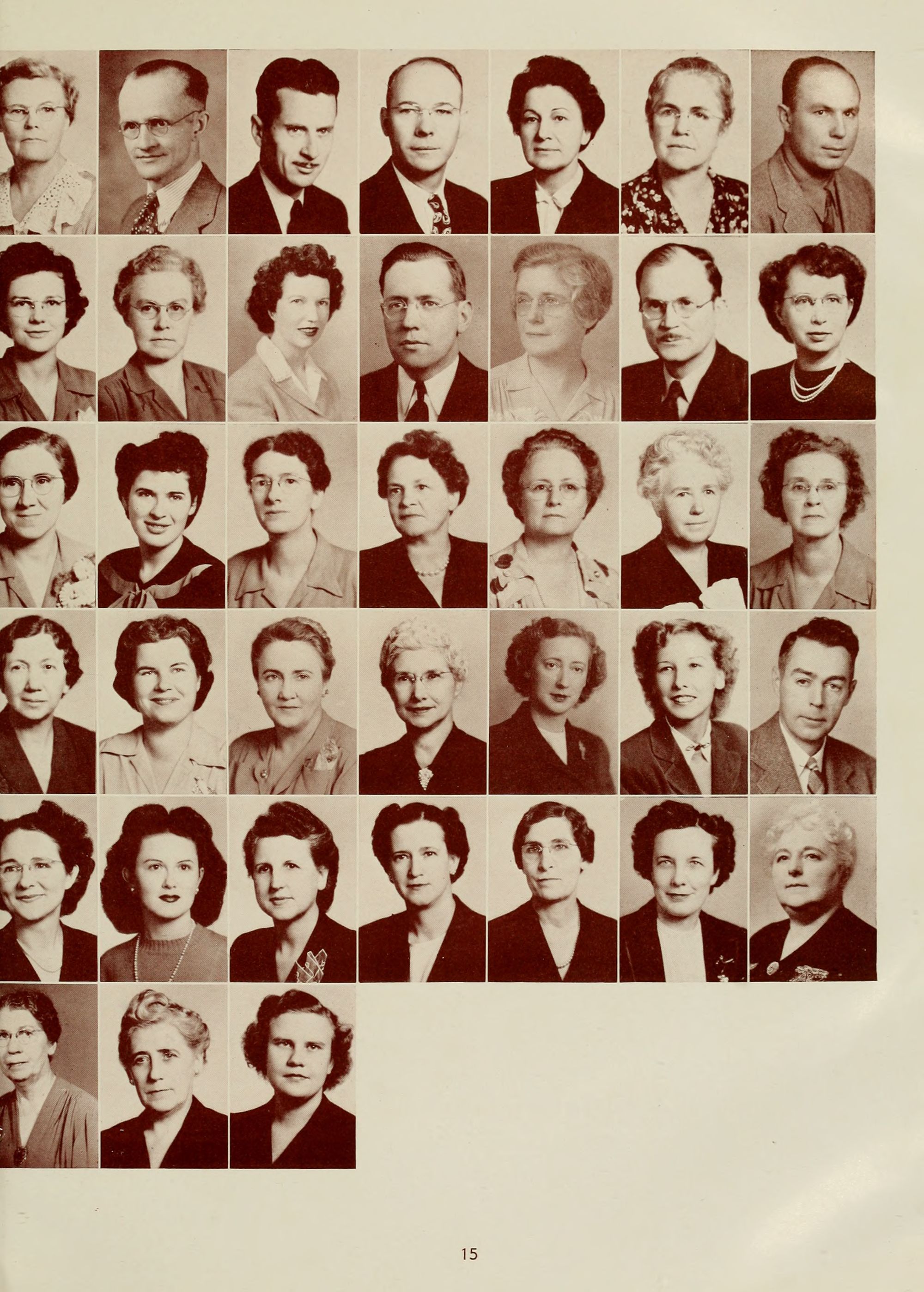 Nell Stallings, Physical Education; Dr. Ethel Sutherland, Mathematics; Eleanor E. Toll, Music; Dr. Paul A. Toll, Social Science; Dr. Lucile Turner, English, Director; Dan Vornholt, Music; Elizabeth Walker, Library Science.