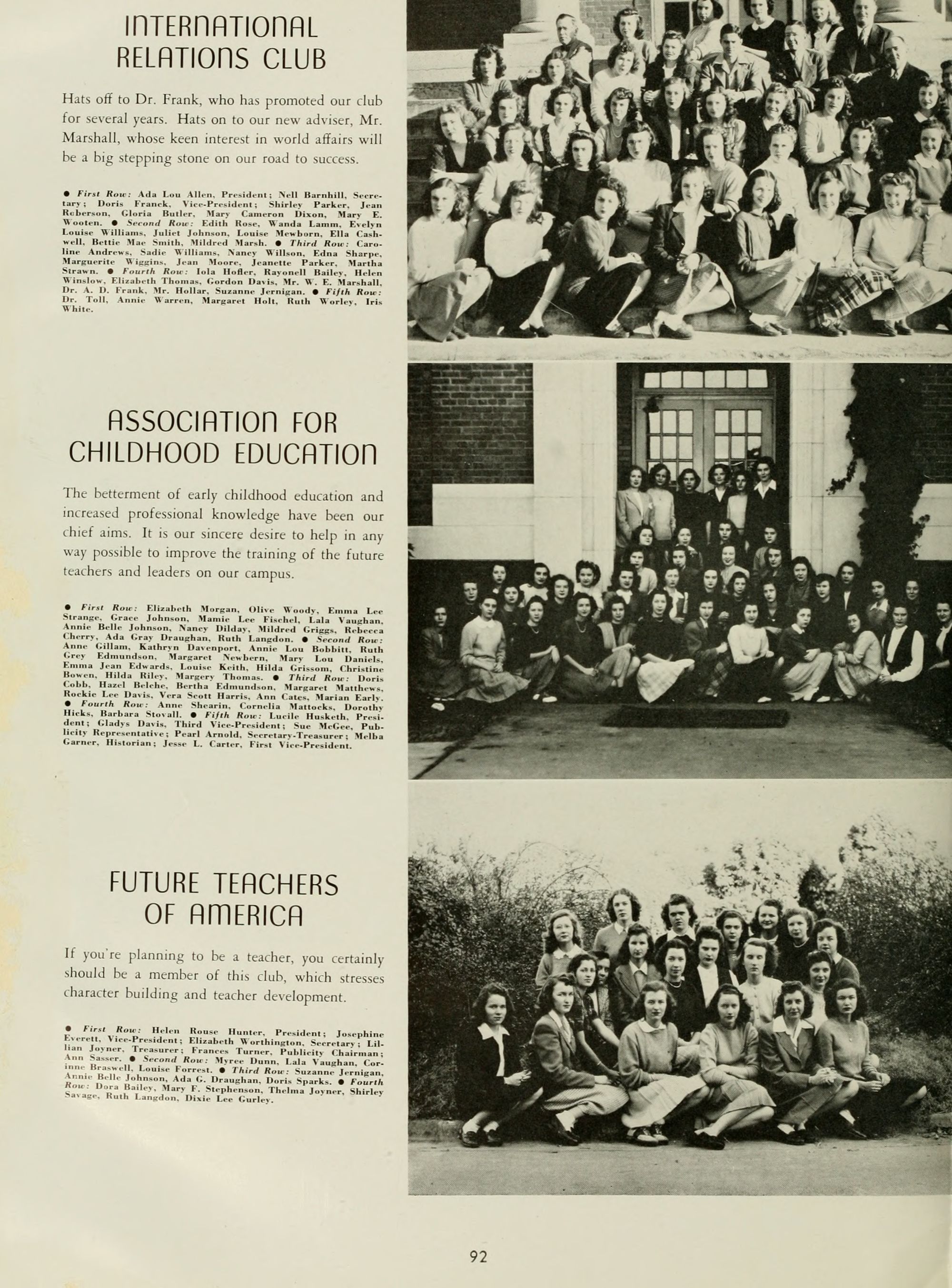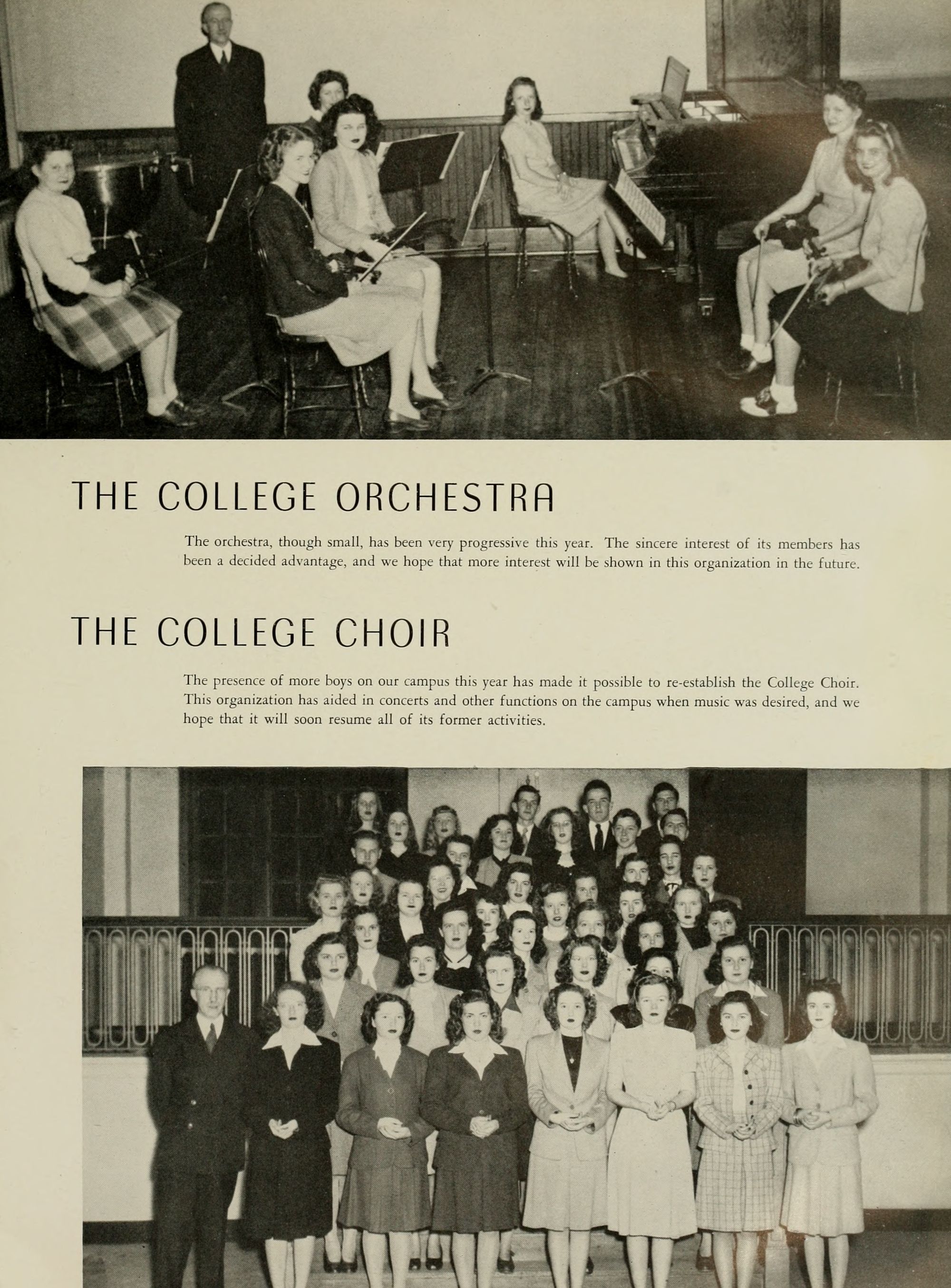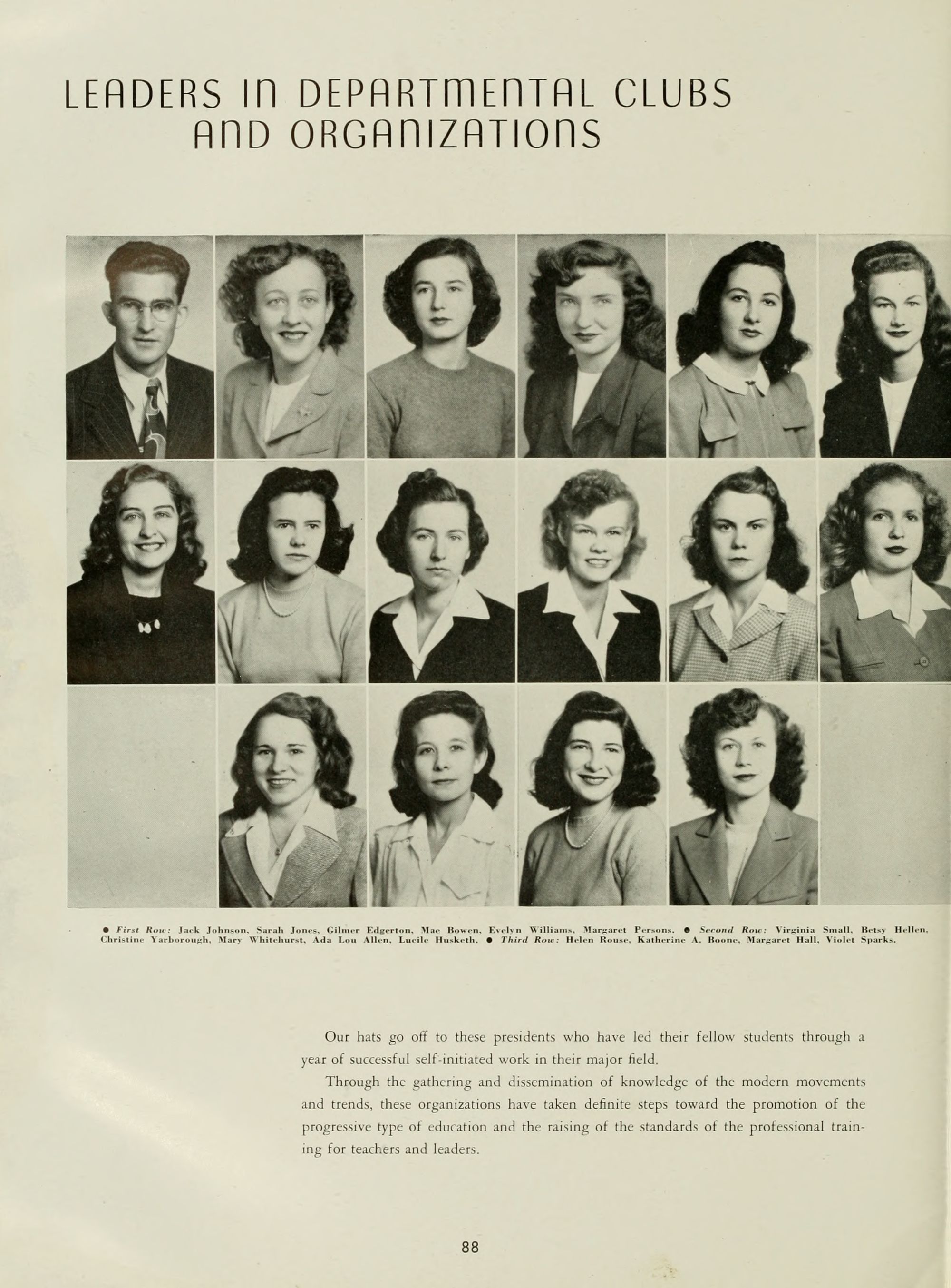 Nell Stallings, Physical Education; Dr. Ethel Sutherland, Mathematics; Eleanor E. Toll, Music; Dr. Paul A. Toll, Social Science; Dr. Lucile Turner, English, Director; Dan Vornholt, Music; Elizabeth Walker, Library Science.