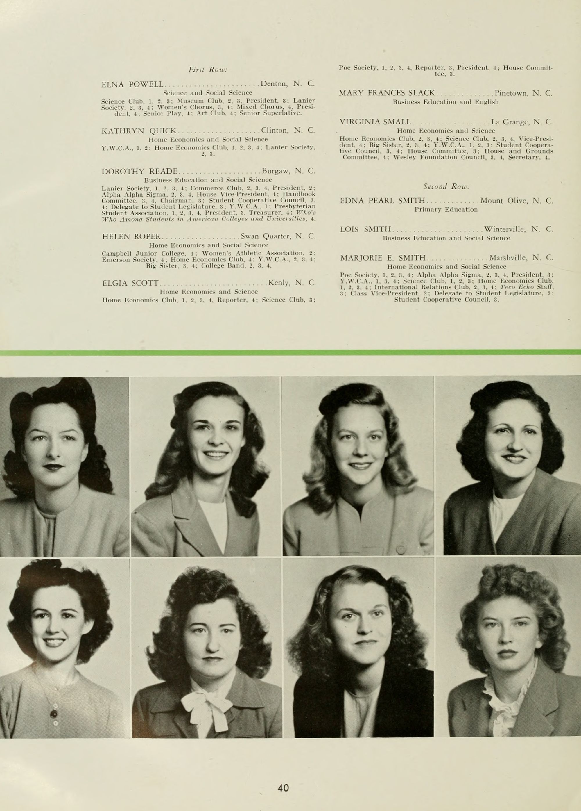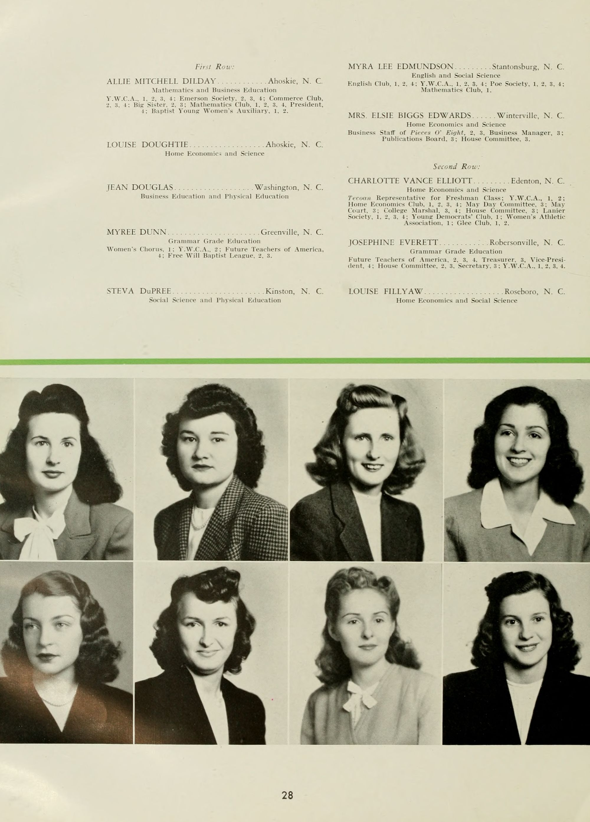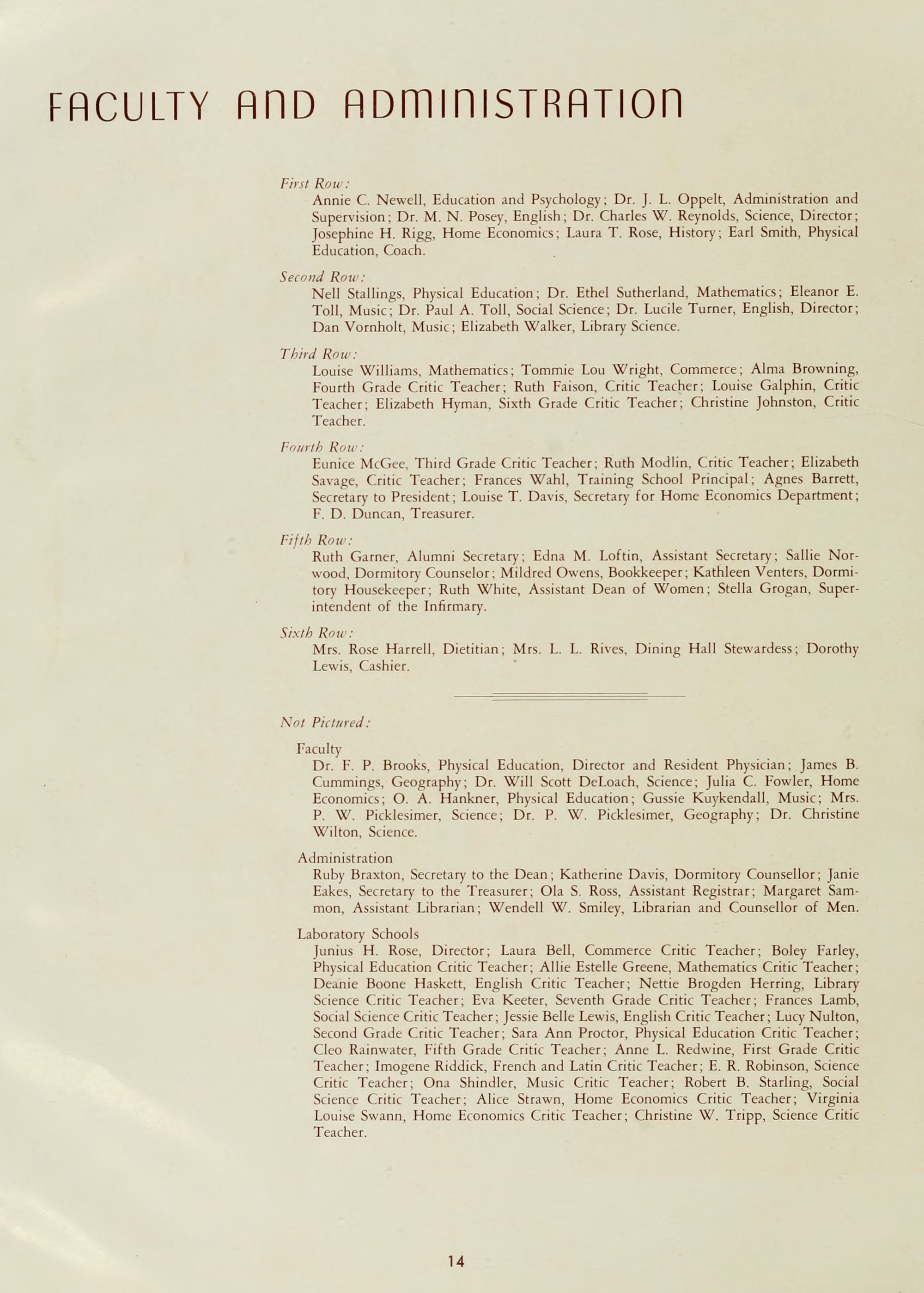 Junius H. Rose, Director; Laura Bell, Commerce Critic Teacher; Boley Farley, Physical Education Critic Teacher; Allie Estelle Greene, Mathematics Critic Teacher; Deanie Boone Haskett, English Critic Teacher; Nettie Brogden Herring, Library Science Critic Teacher; Eva Keeter, Seventh Grade Critic Teacher; Frances Lamb, Social Science Critic Teacher; Jessie Belle Lewis, English Critic Teacher; Lucy Nulton, Second Grade Critic Teacher; Sara Ann Proctor, Physical Education Critic Teacher; Cleo Rainwater, Fifth Grade Critic Teacher; Anne L. Redwine, First Grade Critic Teacher; Imogene Riddick, French and Latin Critic Teacher; E. R. Robinson, Science Critic Teacher; Ona Shindler, Music Critic Teacher; Robert B. Starling, Social Science Critic Teacher; Alice Strawn, Home Economics Critic Teacher; Virginia Louise Swann, Home Economics Critic Teacher; Christine W. Tripp, Science Critic Teacher.