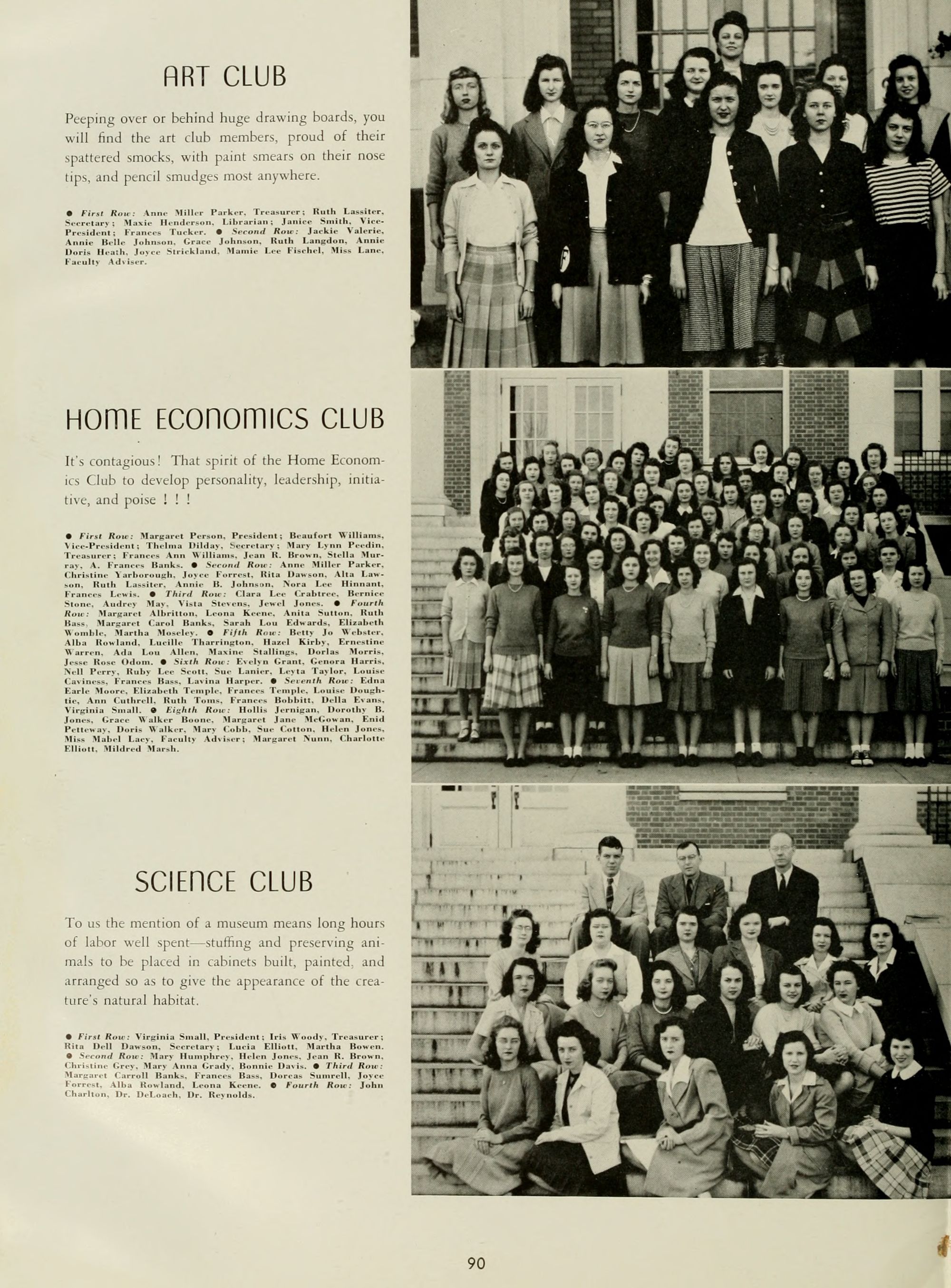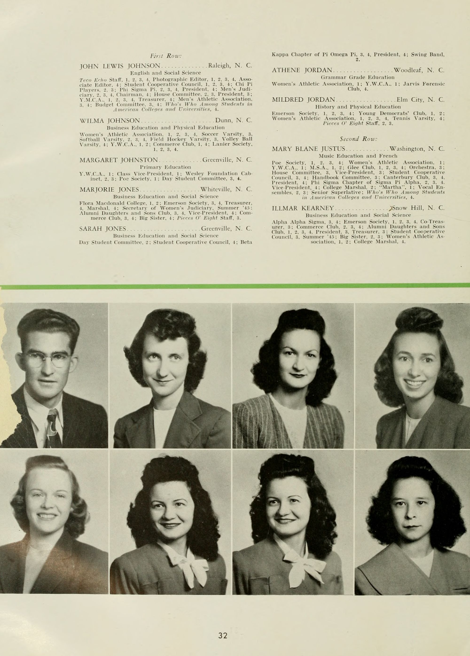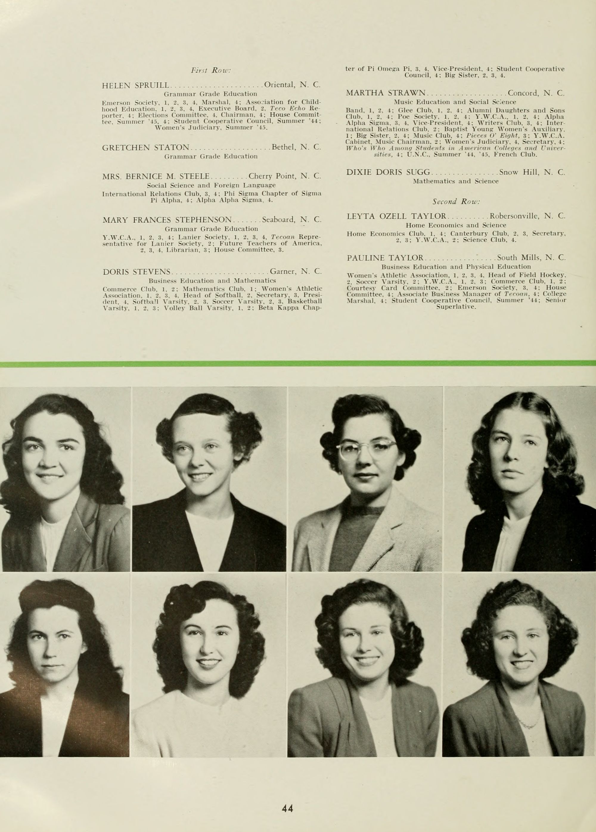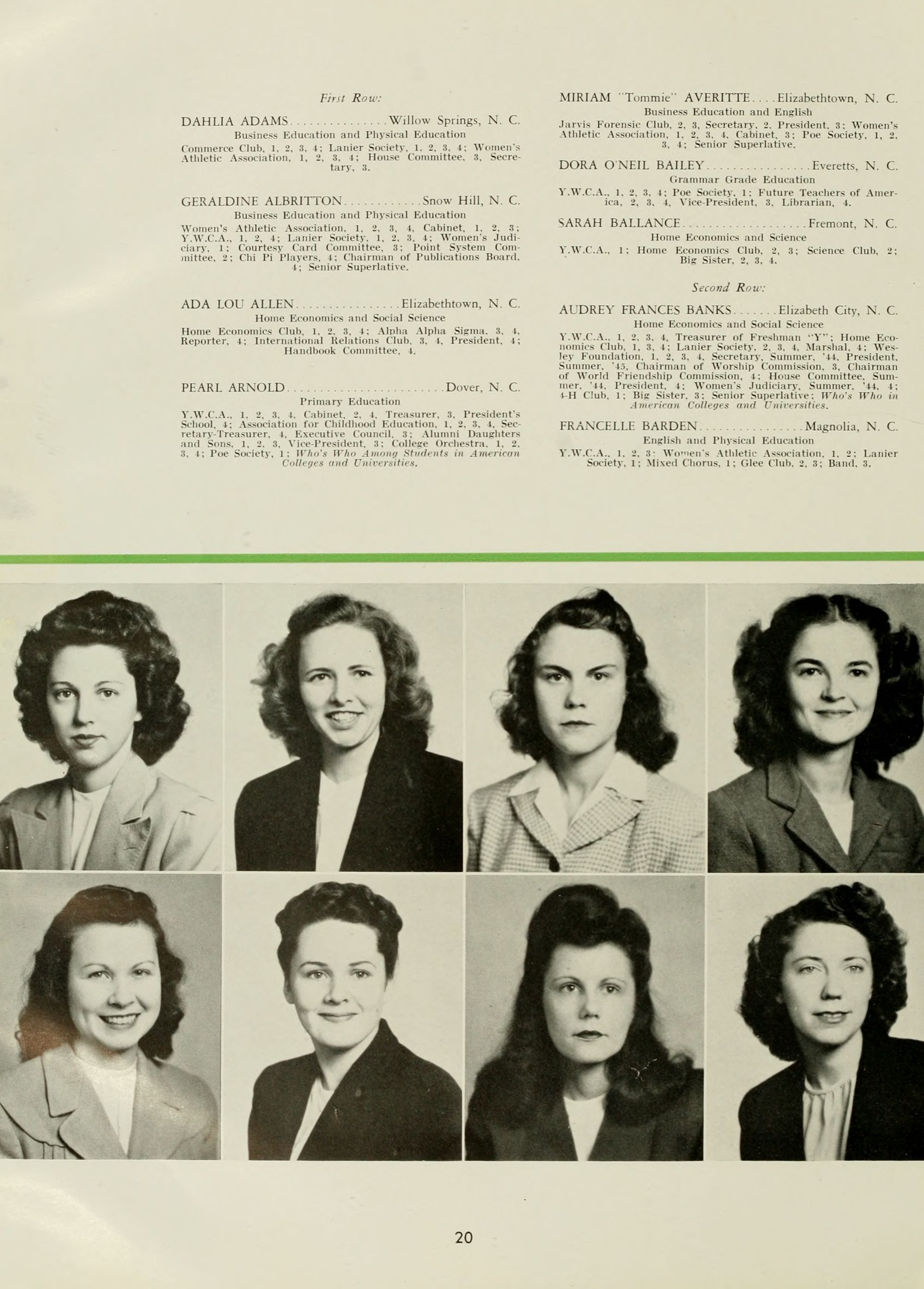 Junius H. Rose, Director; Laura Bell, Commerce Critic Teacher; Boley Farley, Physical Education Critic Teacher; Allie Estelle Greene, Mathematics Critic Teacher; Deanie Boone Haskett, English Critic Teacher; Nettie Brogden Herring, Library Science Critic Teacher; Eva Keeter, Seventh Grade Critic Teacher; Frances Lamb, Social Science Critic Teacher; Jessie Belle Lewis, English Critic Teacher; Lucy Nulton, Second Grade Critic Teacher; Sara Ann Proctor, Physical Education Critic Teacher; Cleo Rainwater, Fifth Grade Critic Teacher; Anne L. Redwine, First Grade Critic Teacher; Imogene Riddick, French and Latin Critic Teacher; E. R. Robinson, Science Critic Teacher; Ona Shindler, Music Critic Teacher; Robert B. Starling, Social Science Critic Teacher; Alice Strawn, Home Economics Critic Teacher; Virginia Louise Swann, Home Economics Critic Teacher; Christine W. Tripp, Science Critic Teacher.