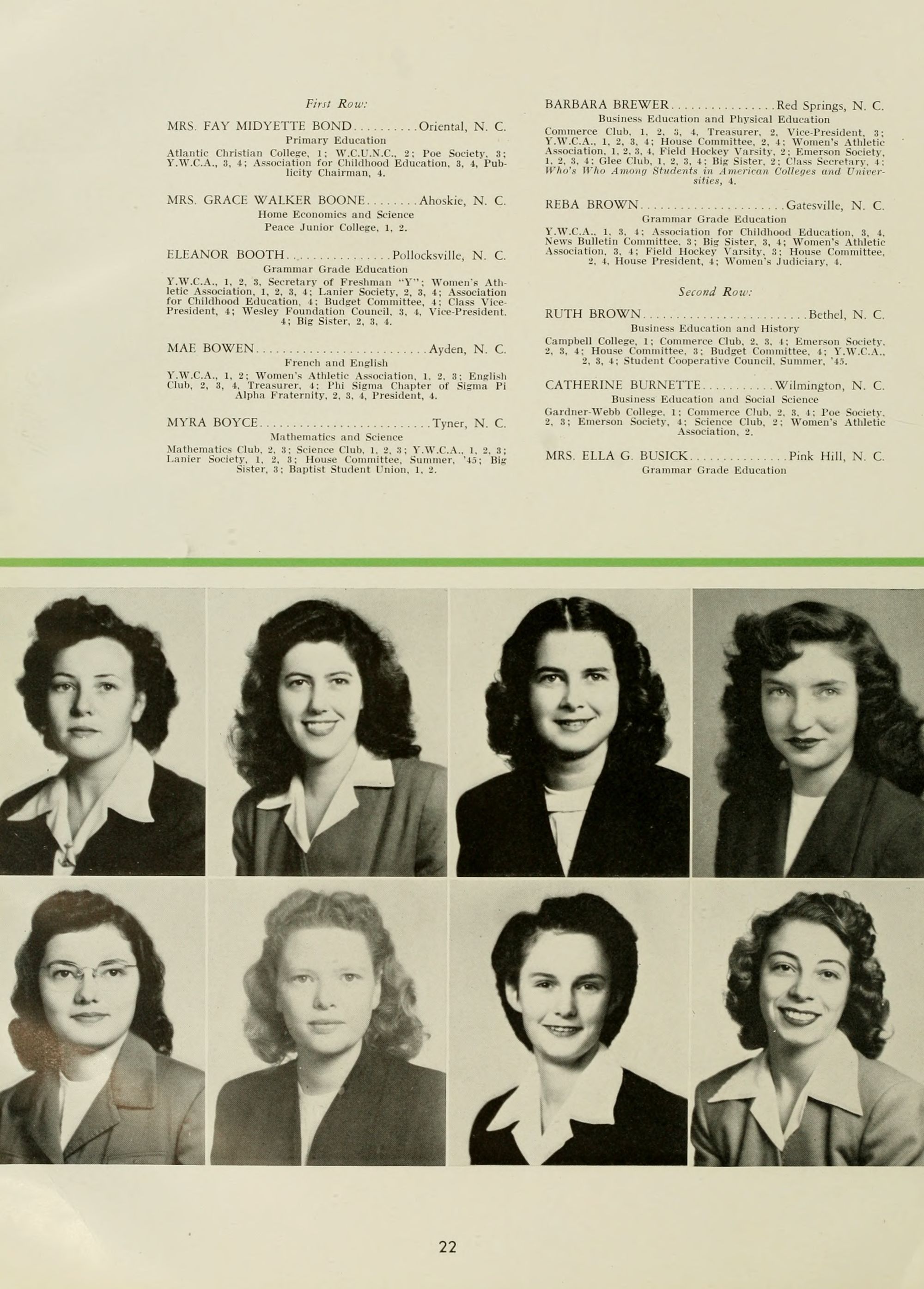 Ruby Braxton, Secretary to the Dean; Katherine Davis, Dormitory Counsellor; Janie Eakes, Secretary to the Treasurer; Ola S. Ross, Assistant Registrar; Margaret Sam- mon, Assistant Librarian; Wendell W. Smiley, Librarian and Counsellor of Men.