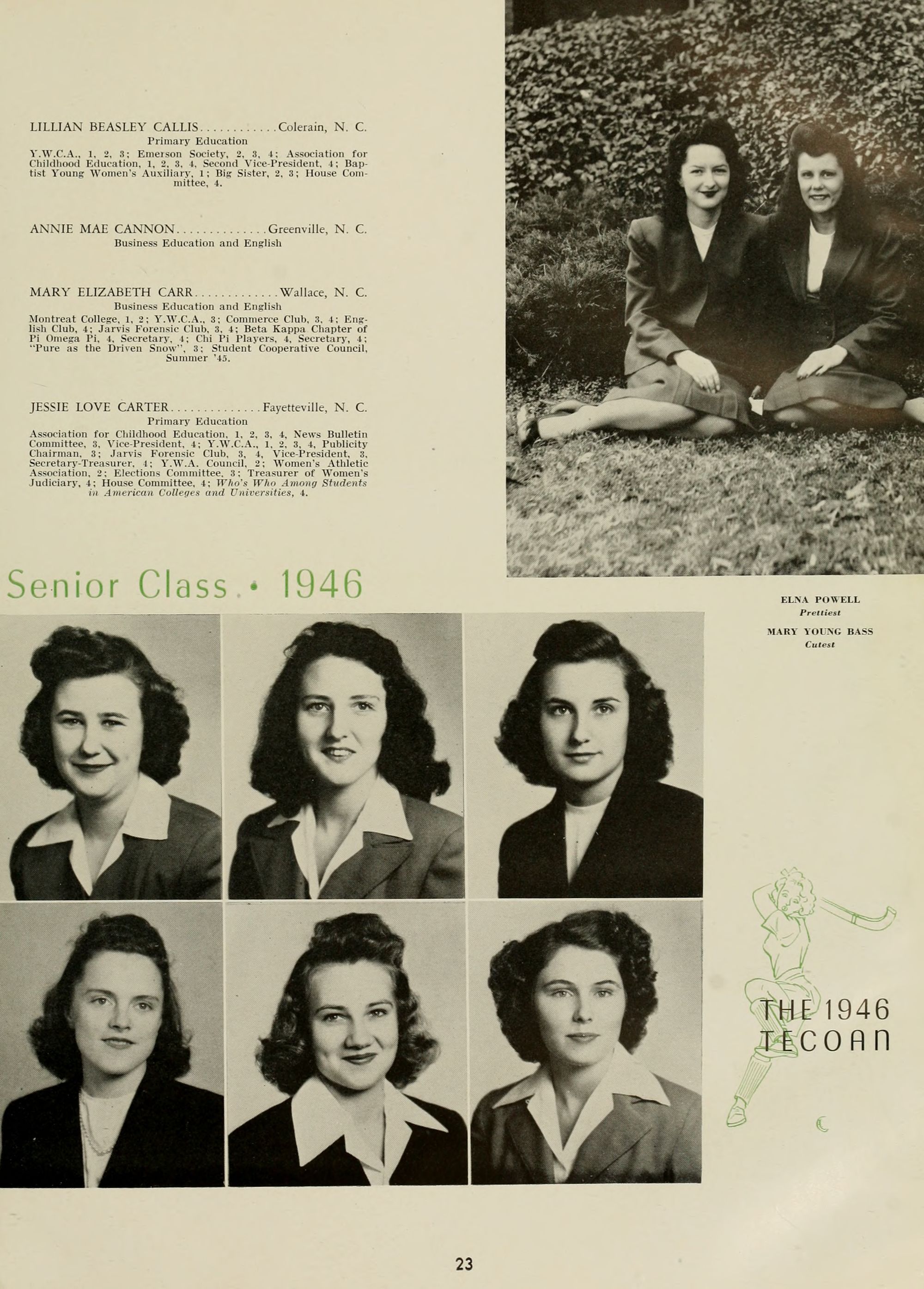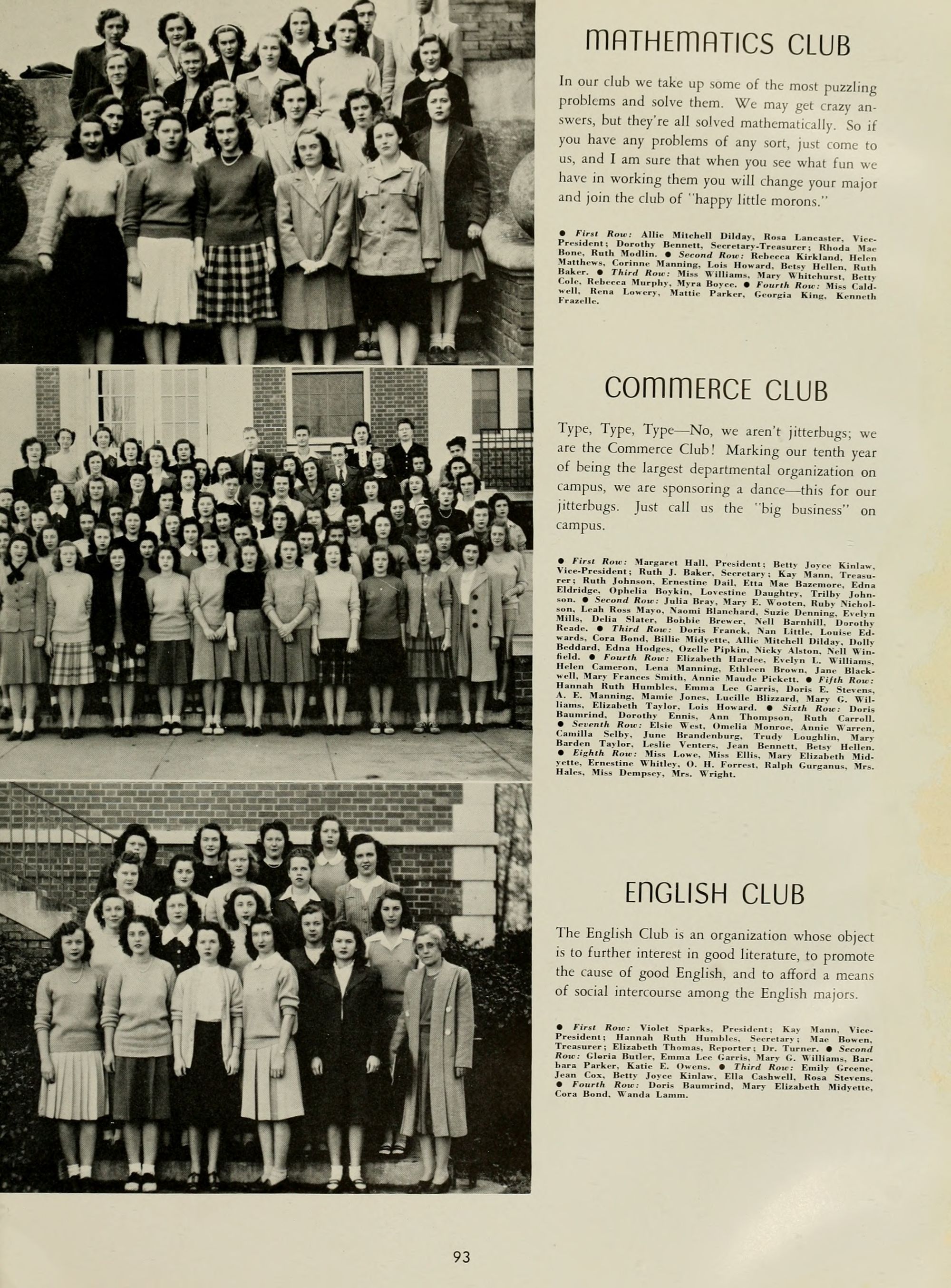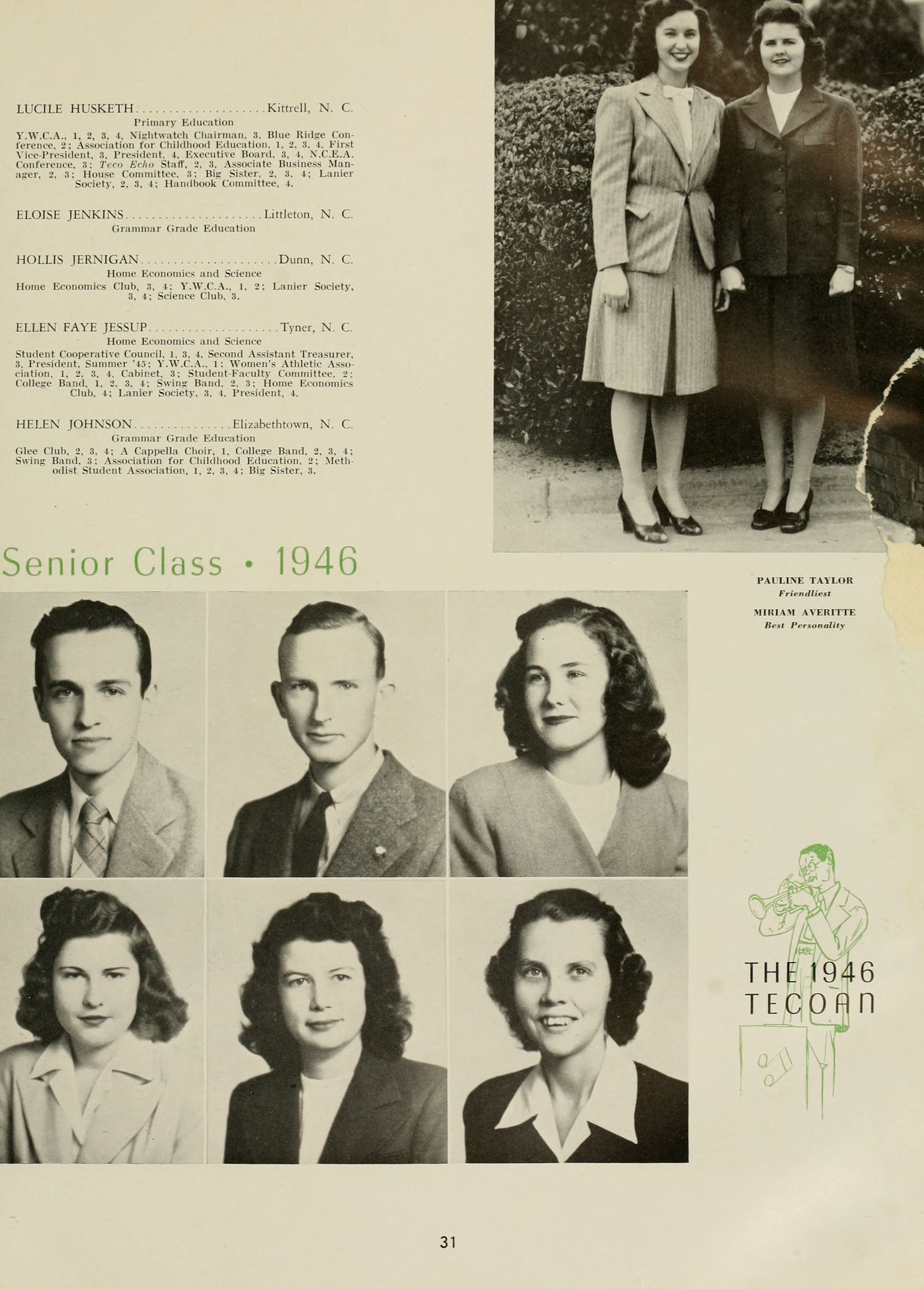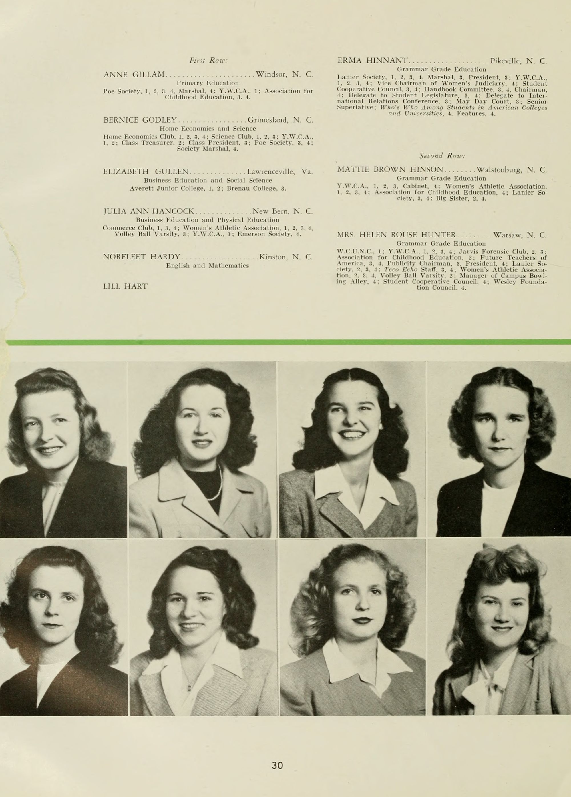 Louise Williams, Mathematics; Tommie Lou Wright, Commerce; Alma Browning, Fourth Grade Critic Teacher; Ruth Faison, Critic Teacher; Louise Galphin, Critic Teacher; Elizabeth Hyman, Sixth Grade Critic Teacher; Christine Johnston, Critic Teacher.