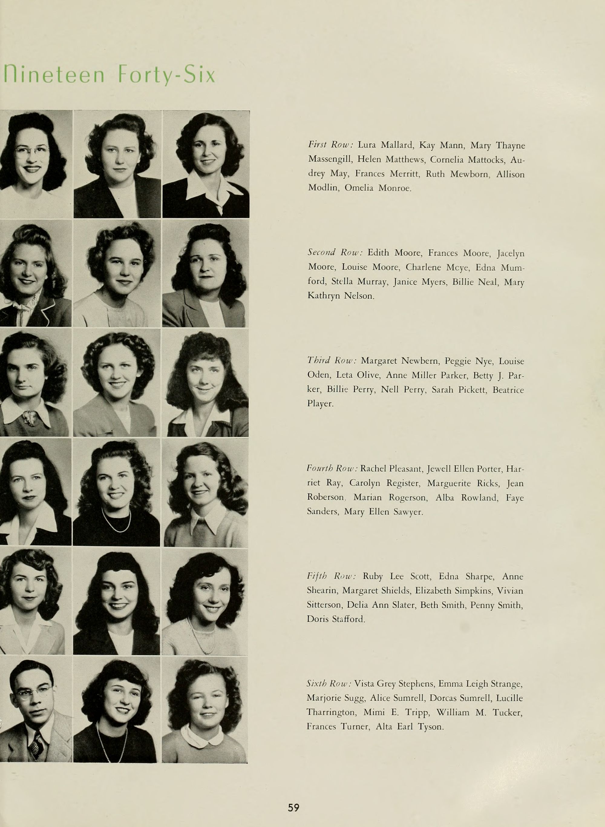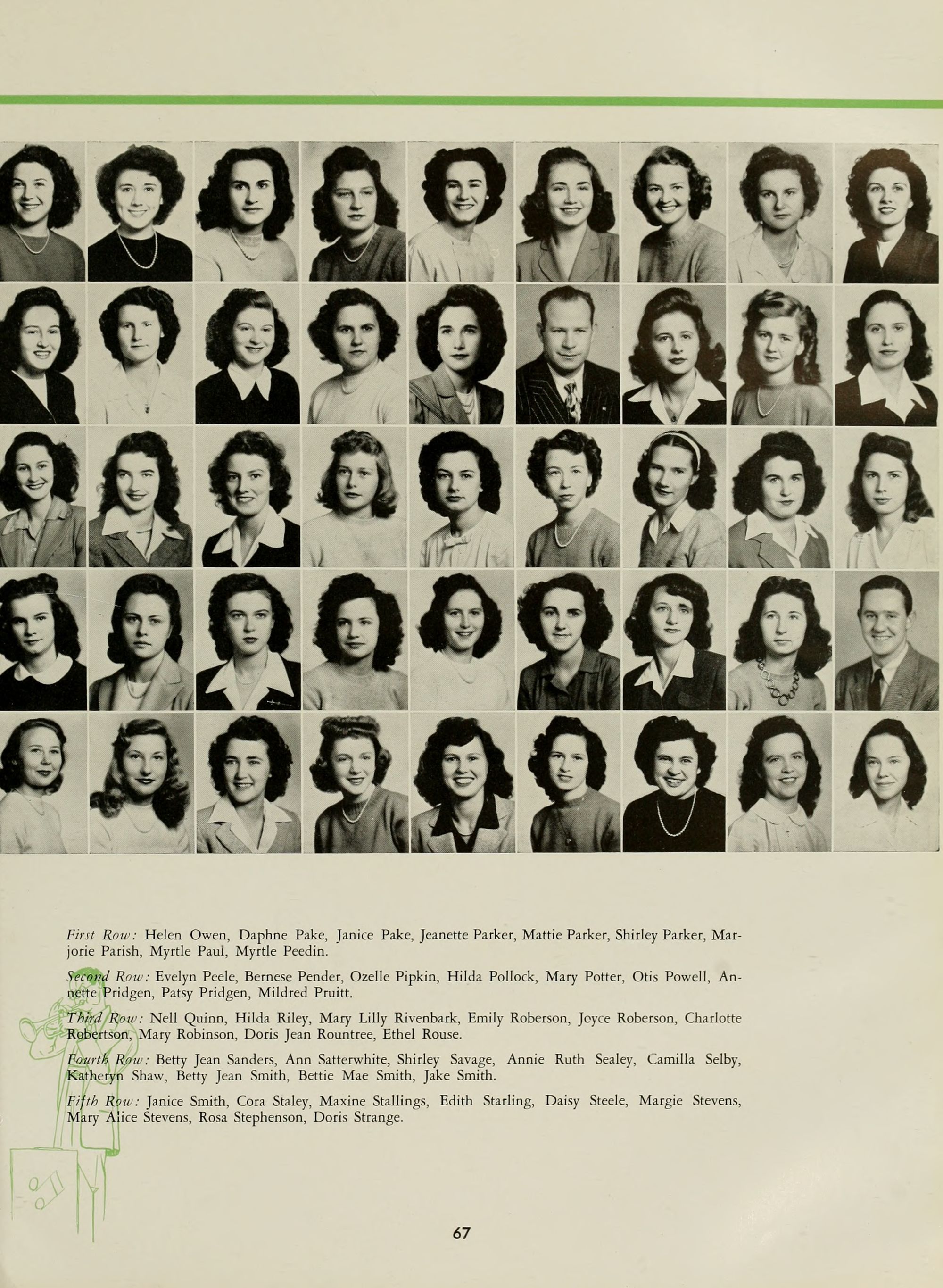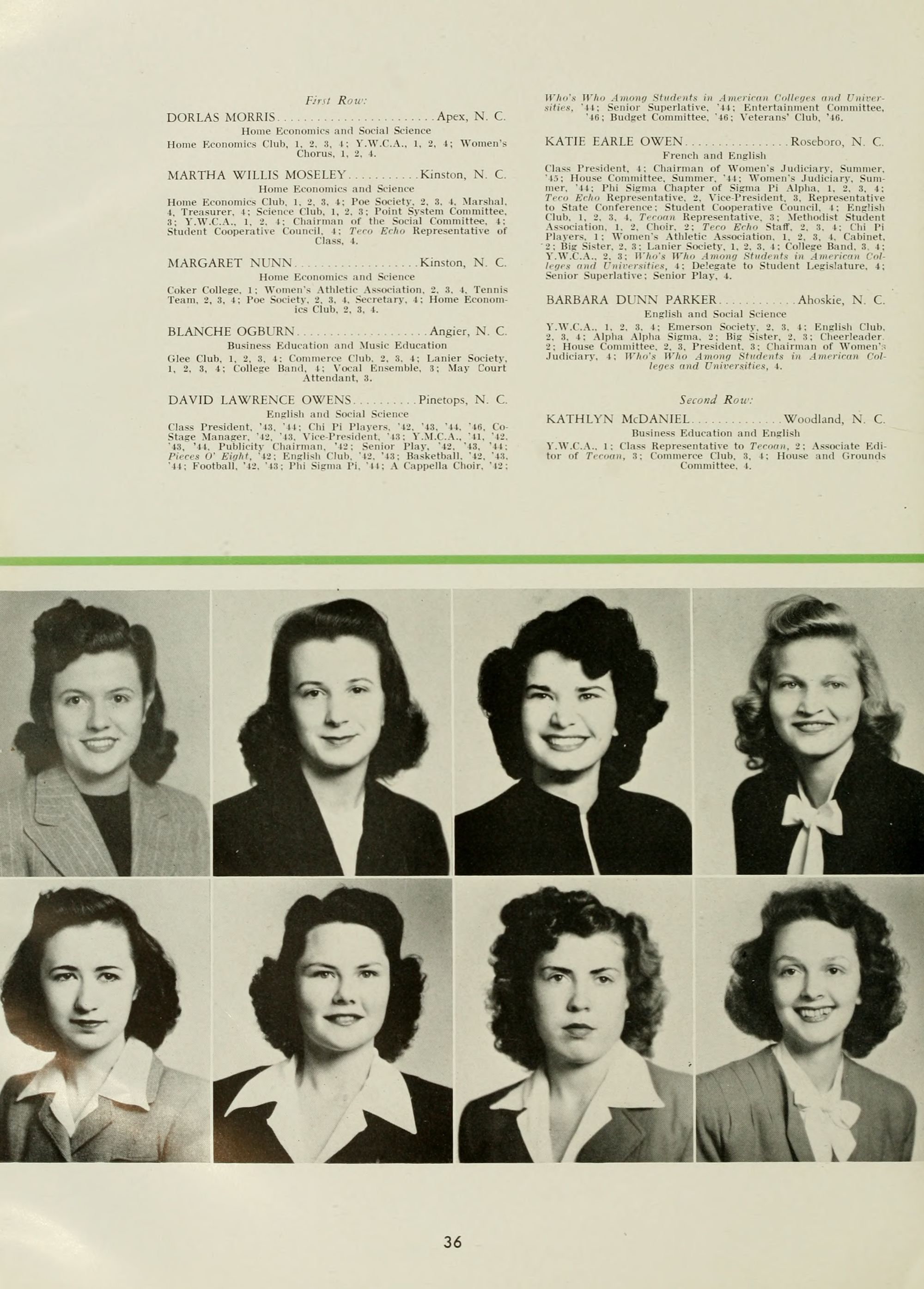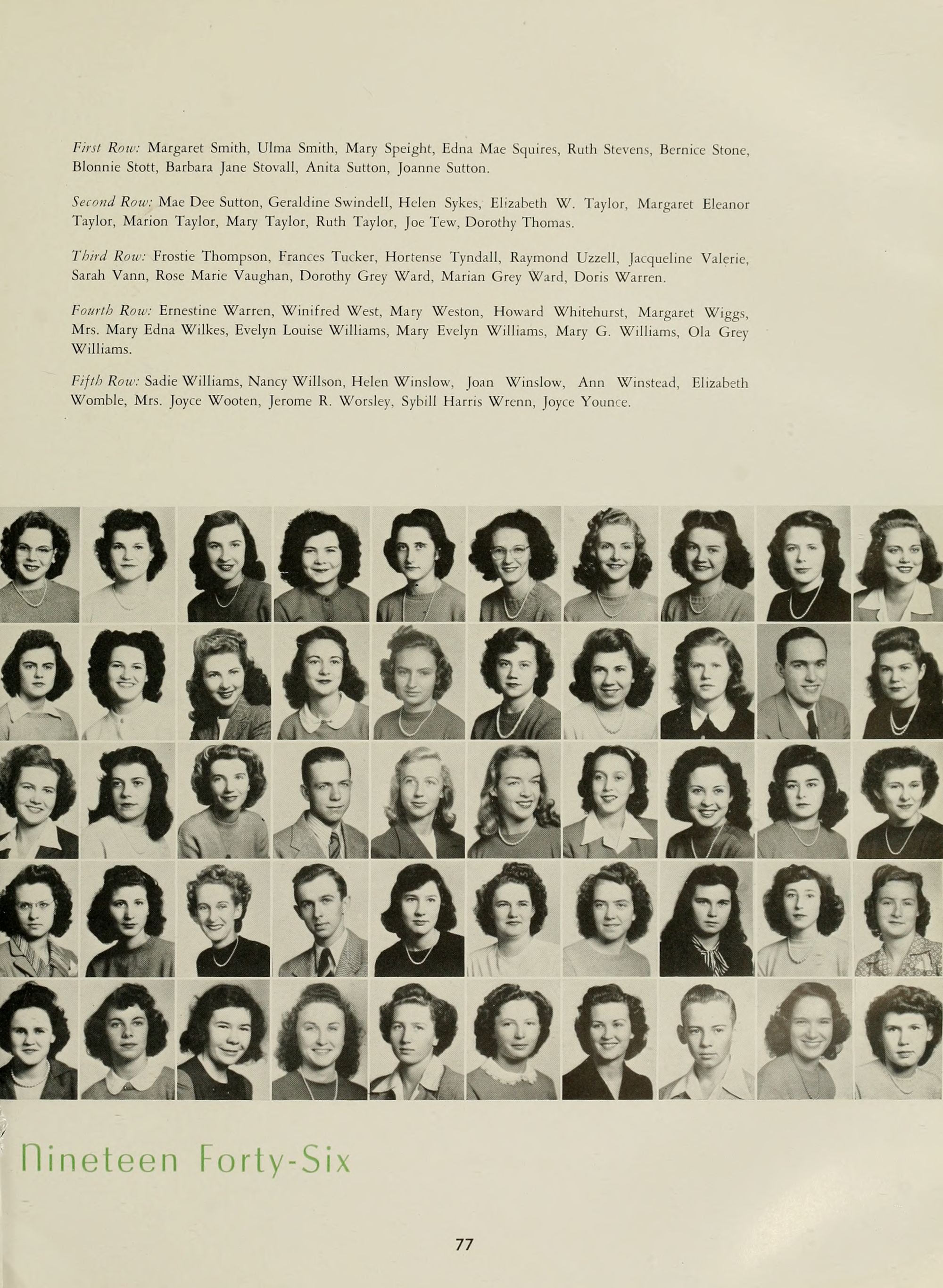 Mamie E. Jenkins, English; Mabel Lacy, Home Economics; Jean M. Lane, Art; Velma Lowe, Commerce; Harold McDougle, Music; W. E. Marshall, History; Dr. Paul A. Murray, History.