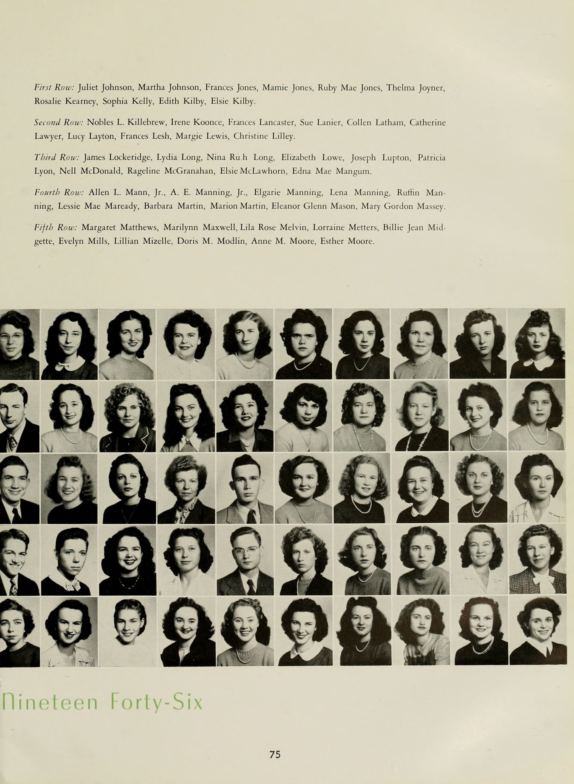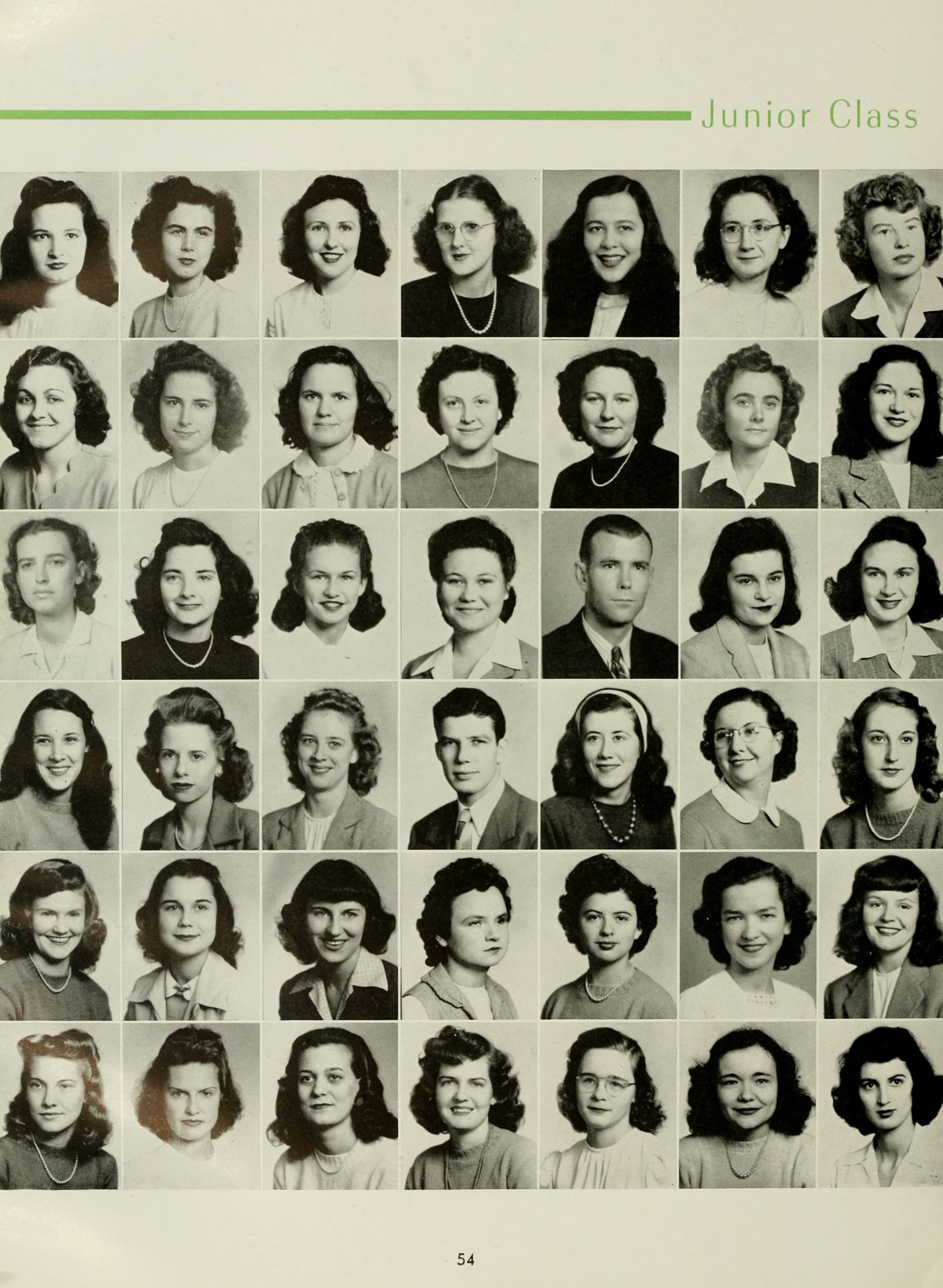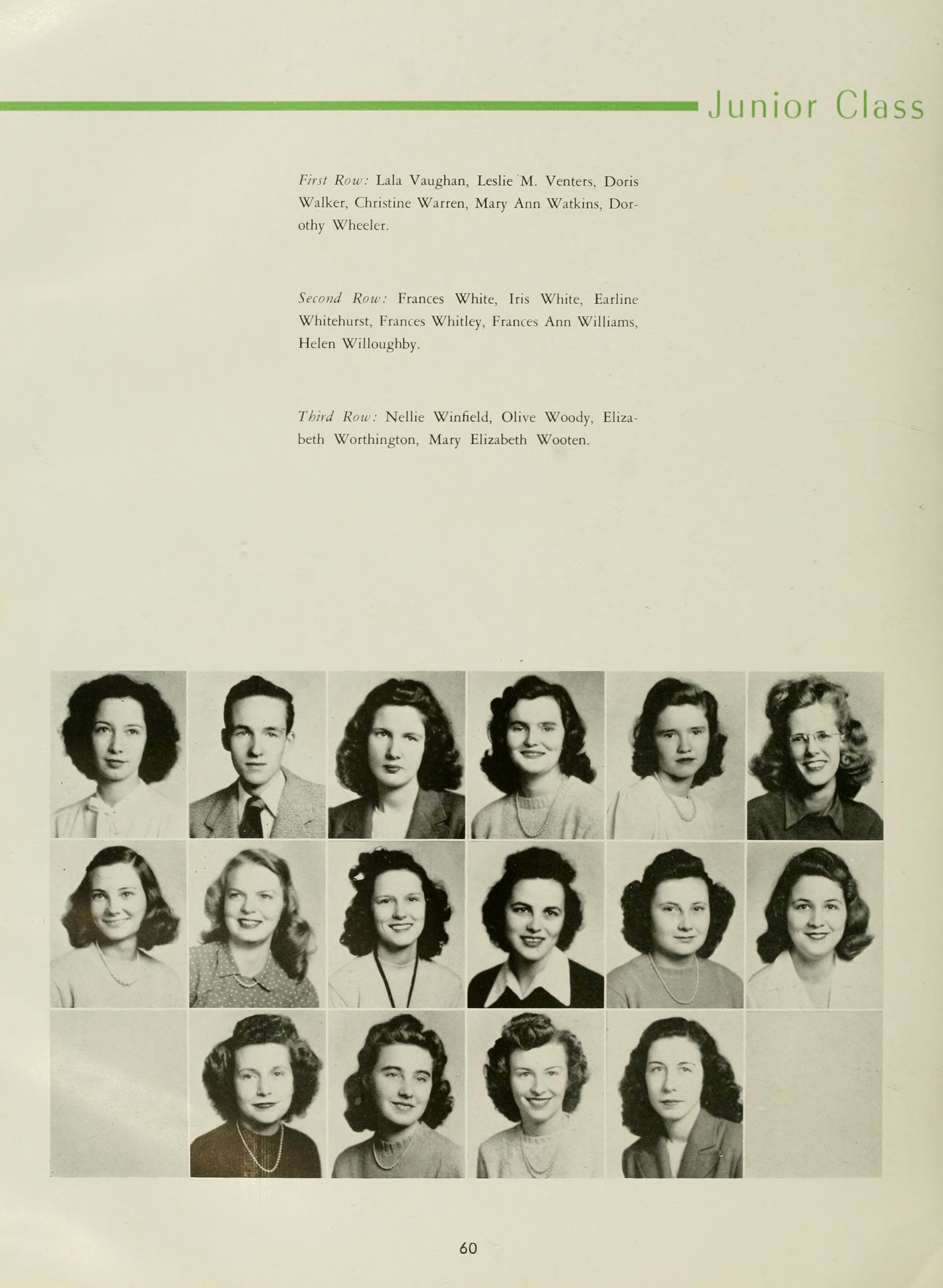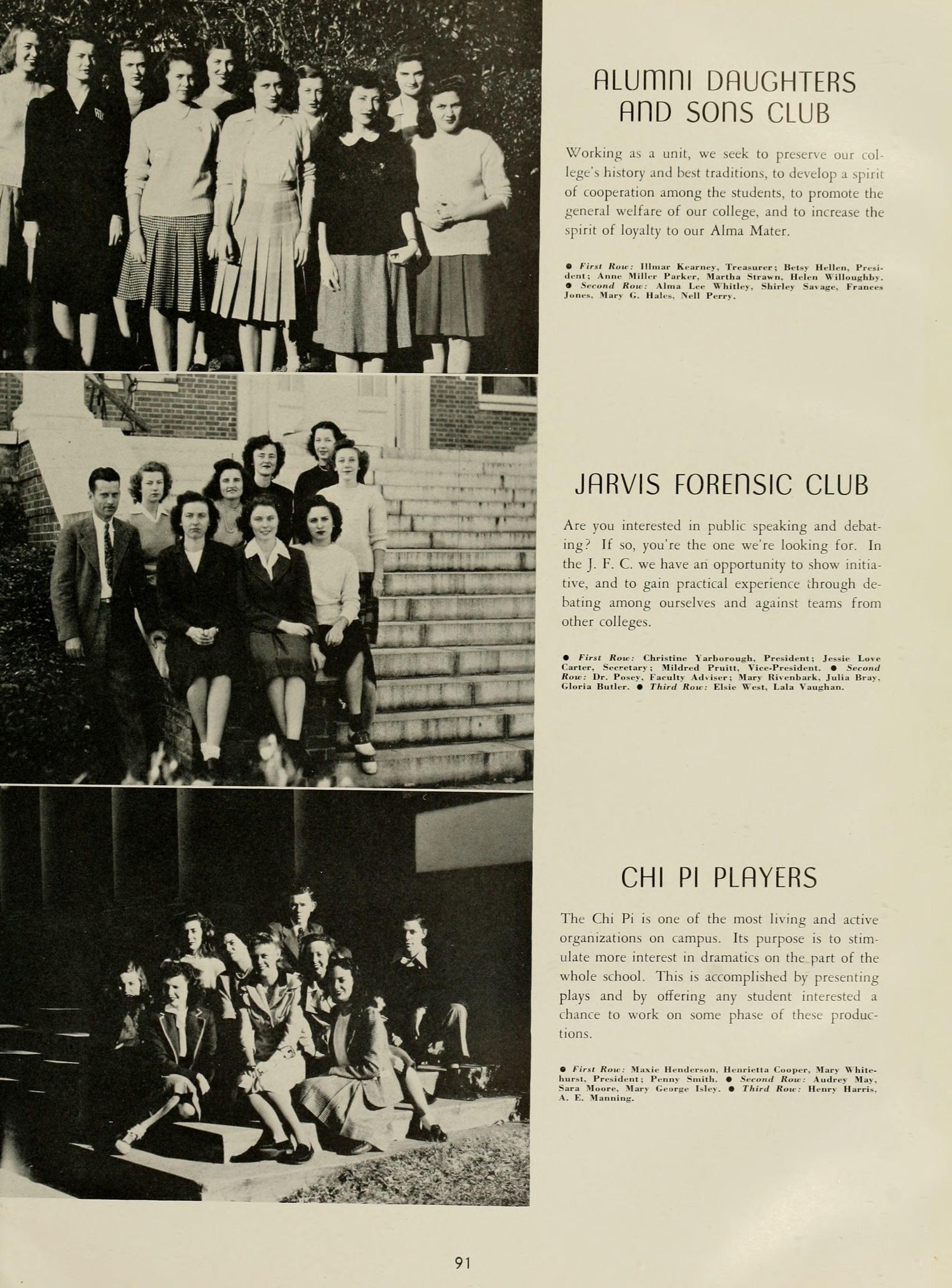 Mamie E. Jenkins, English; Mabel Lacy, Home Economics; Jean M. Lane, Art; Velma Lowe, Commerce; Harold McDougle, Music; W. E. Marshall, History; Dr. Paul A. Murray, History.