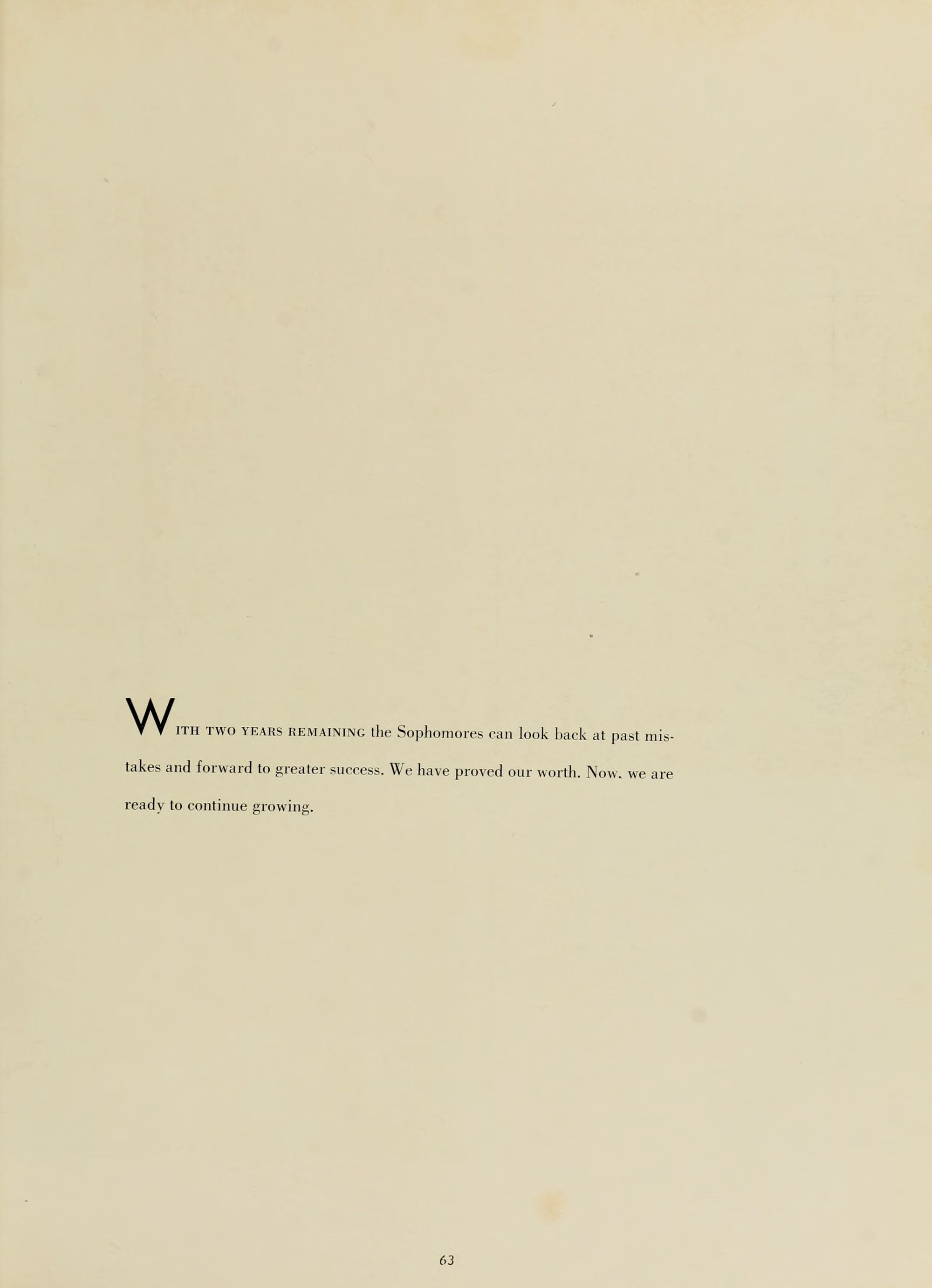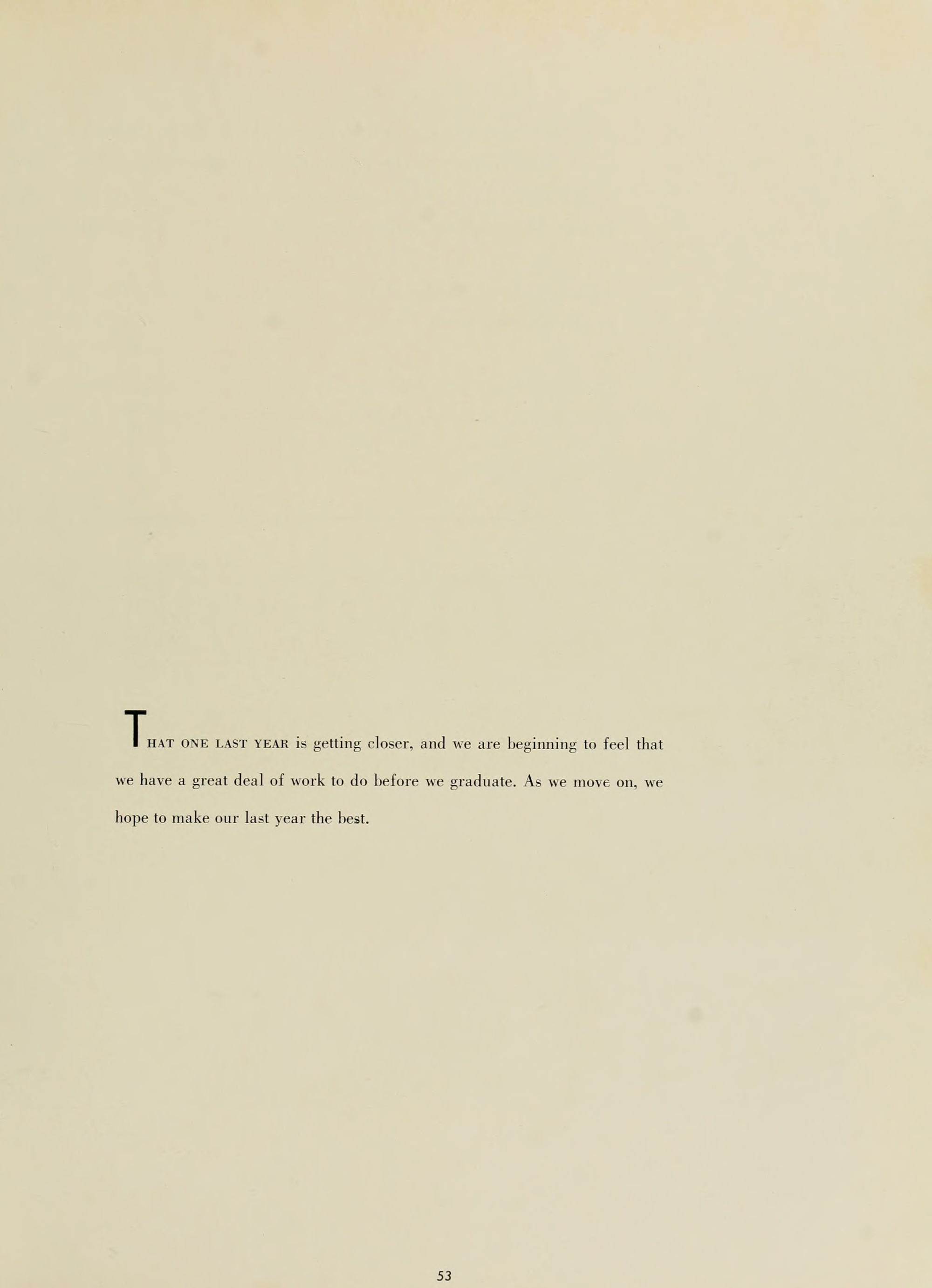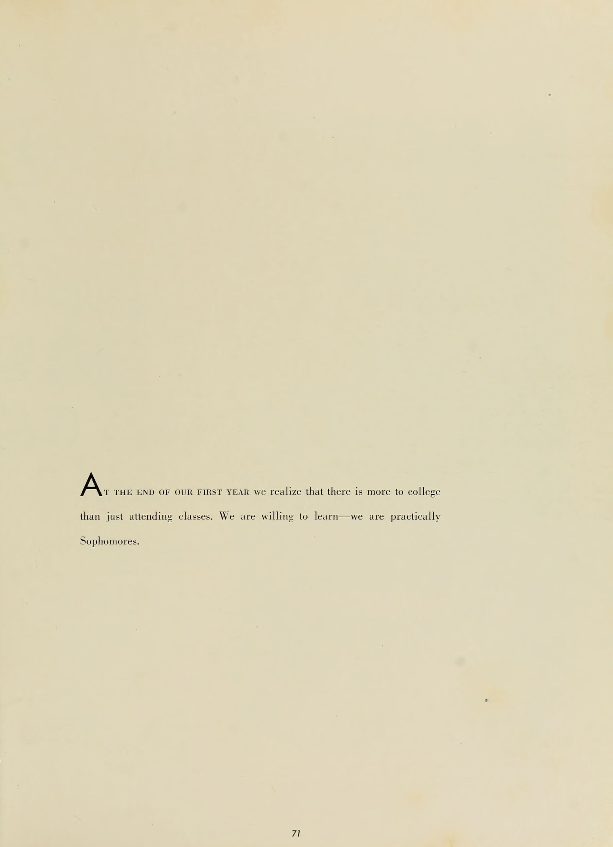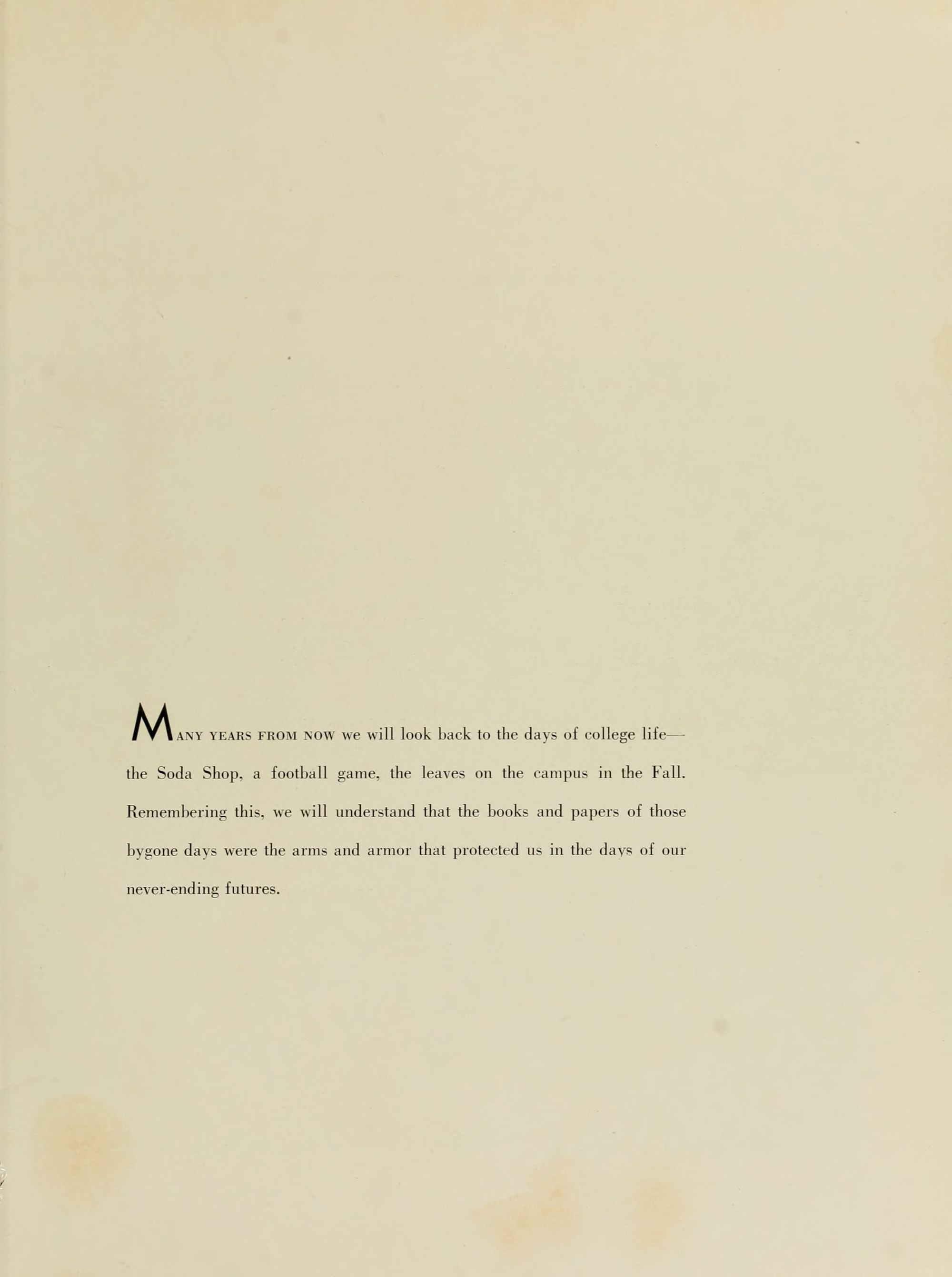 MANY YEARS FROM NOW we will look back to the days of college life - the Soda Shop, a football game, the leaves on the campus in the Fall. Remembering this, we will understand that the books and papers of those bygone days were the arms and armor that protected us in the days of our never-ending futures.