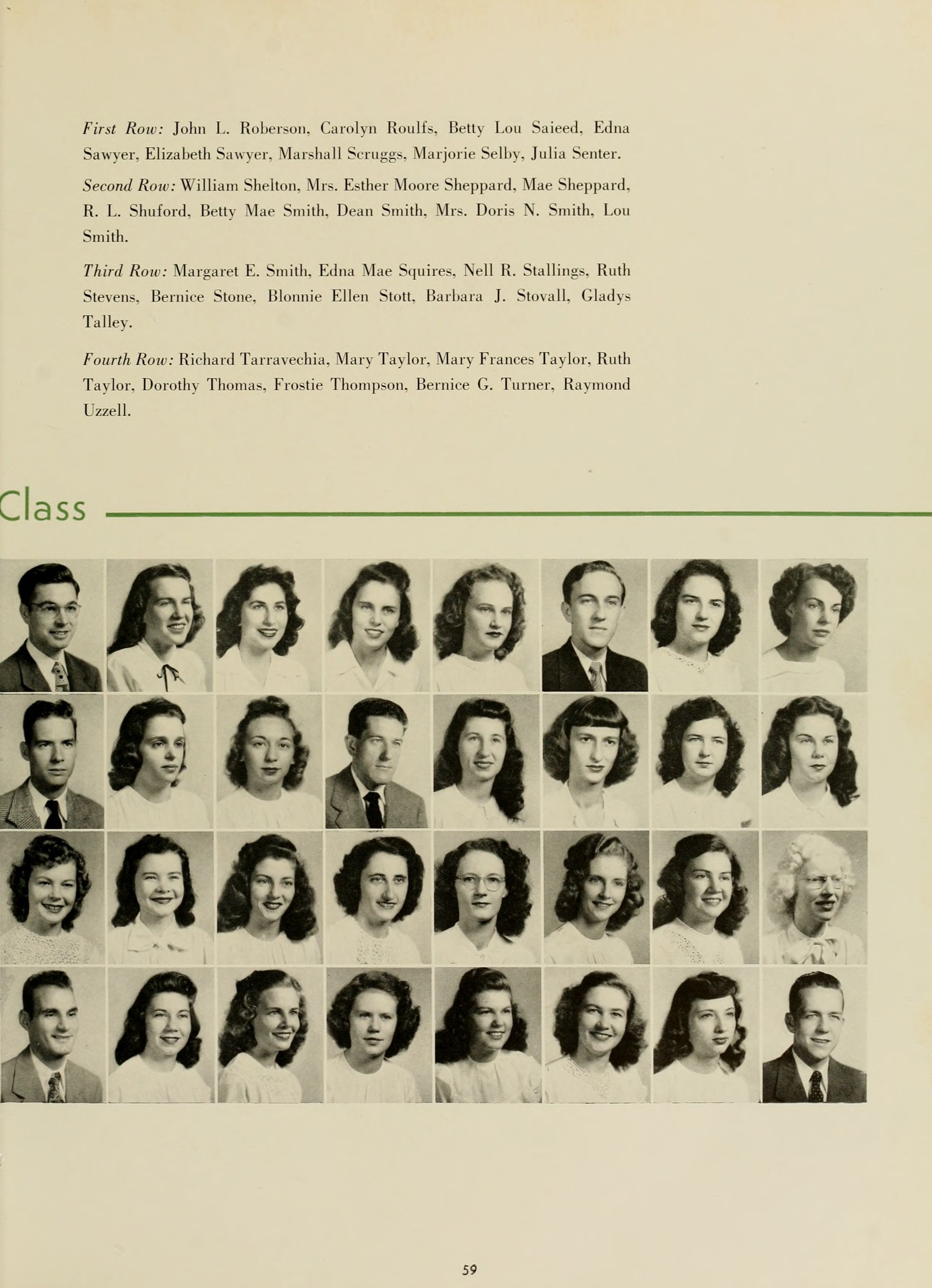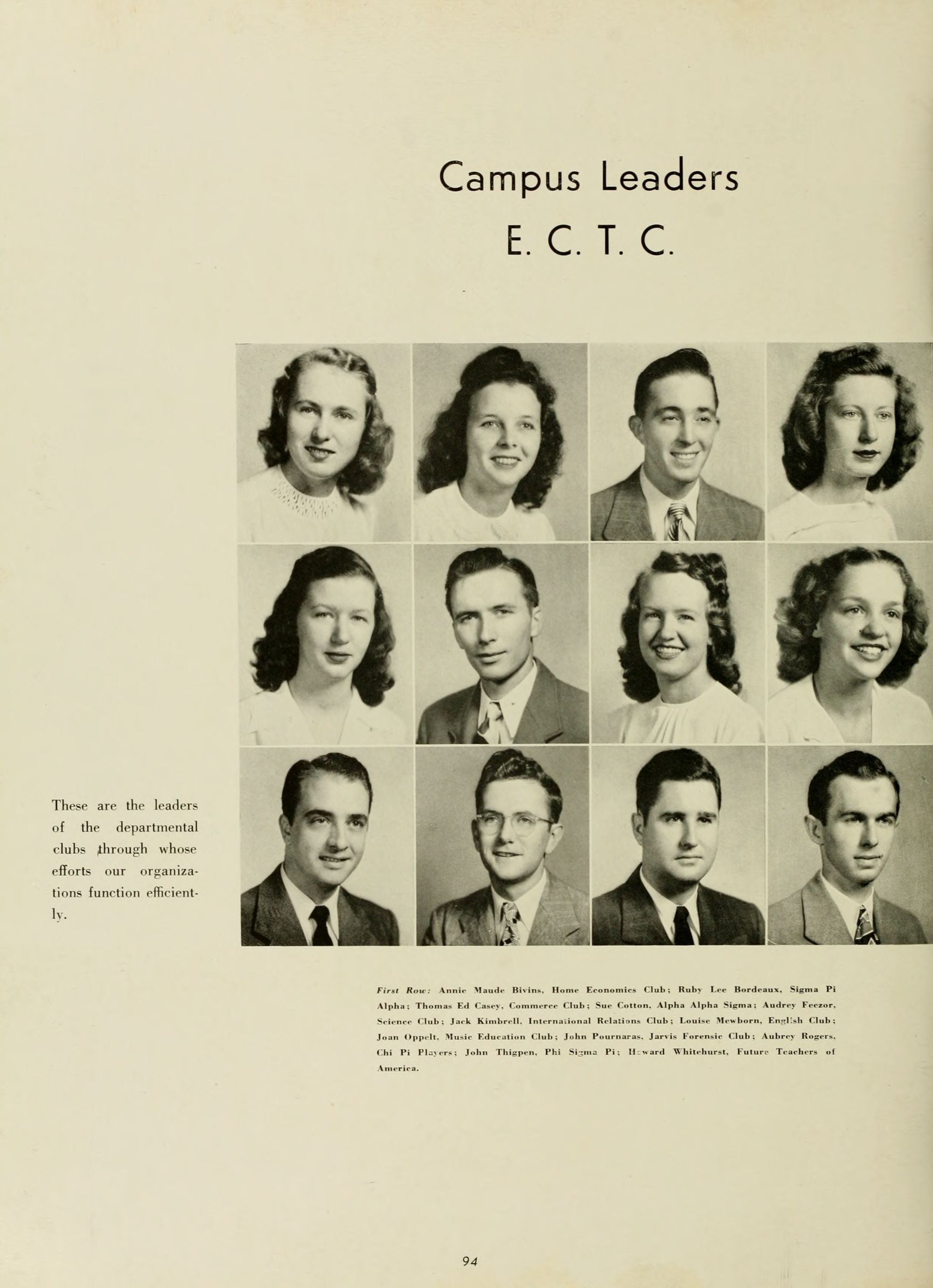 Second Row: Audrey Dempsey, Business Education; Lena C. Ellis, Business Education; Dr. Carl Adams, Education and Psychology; Lucile Charlton, Education and Psychology; Dora E. Coates, Education and Psychology; Annie C. Newell, Education and Psychology.