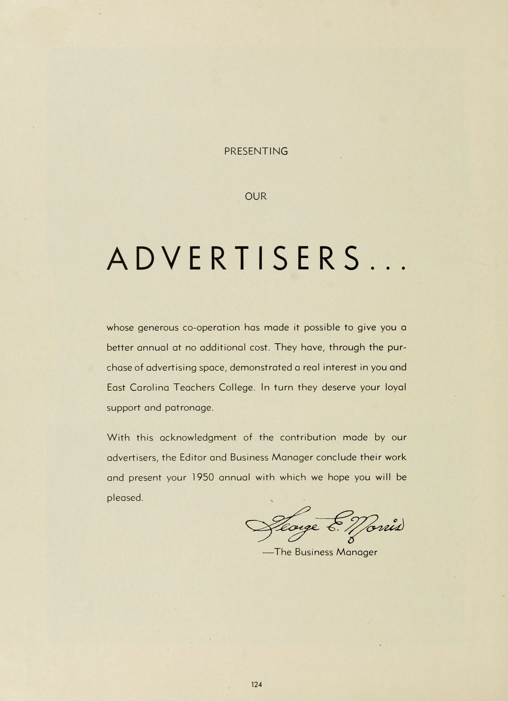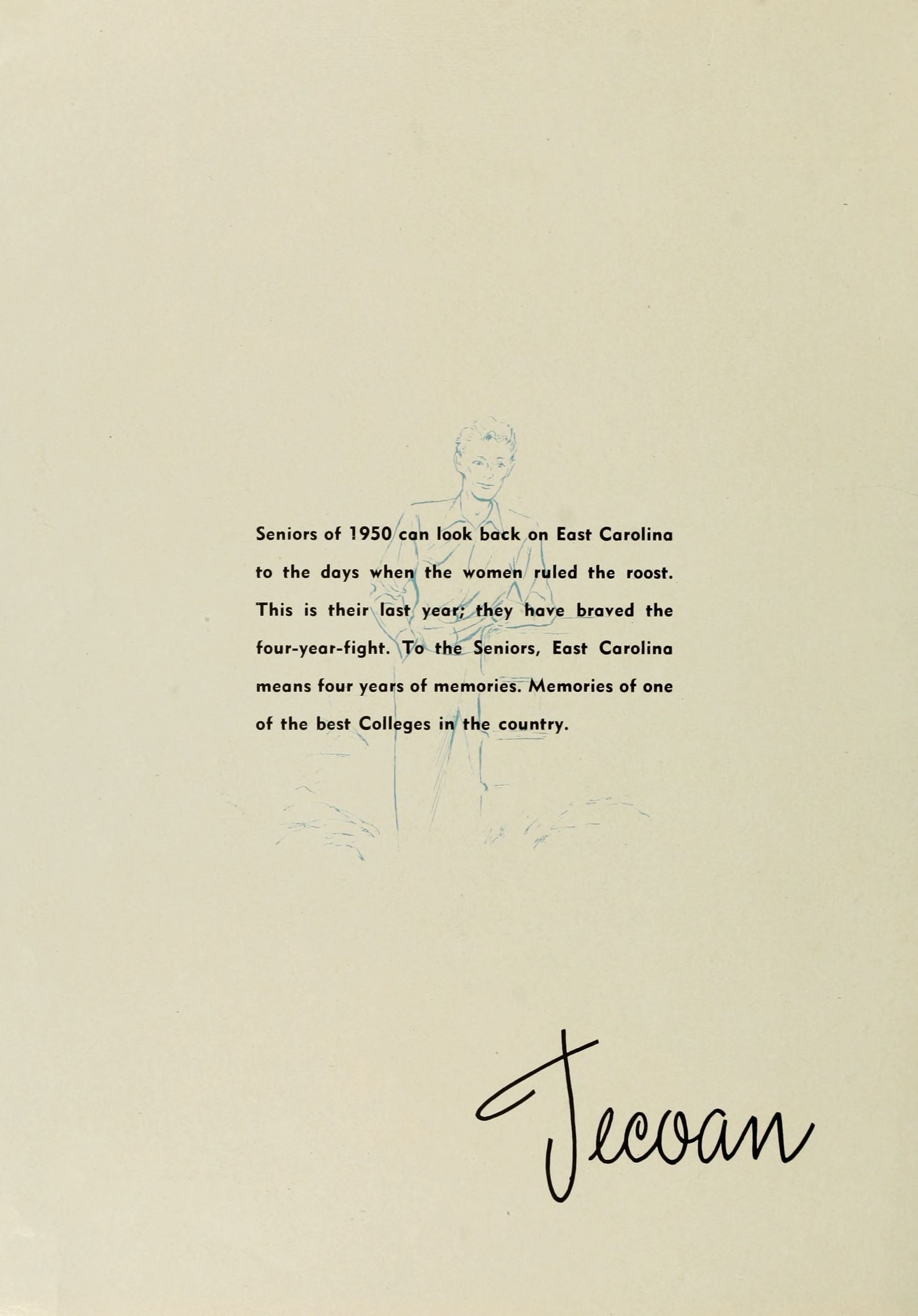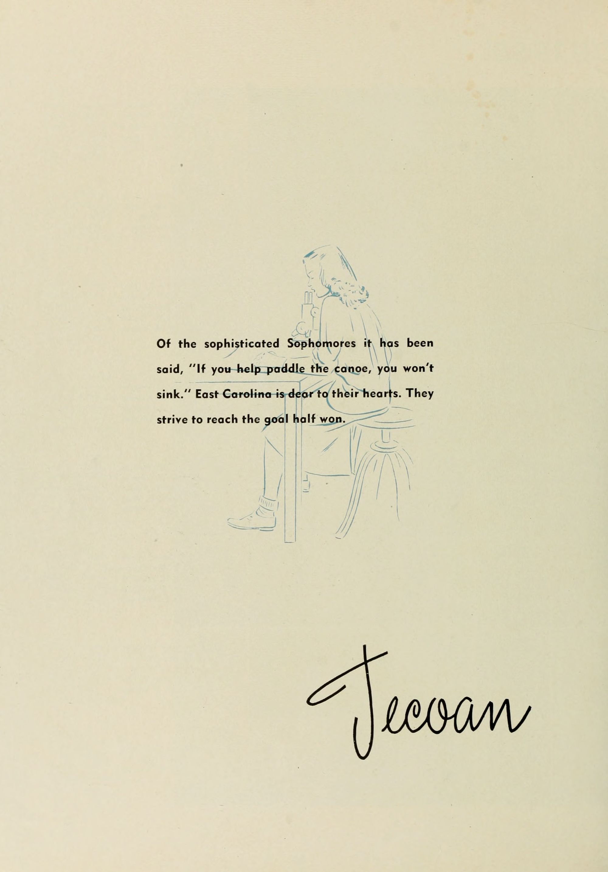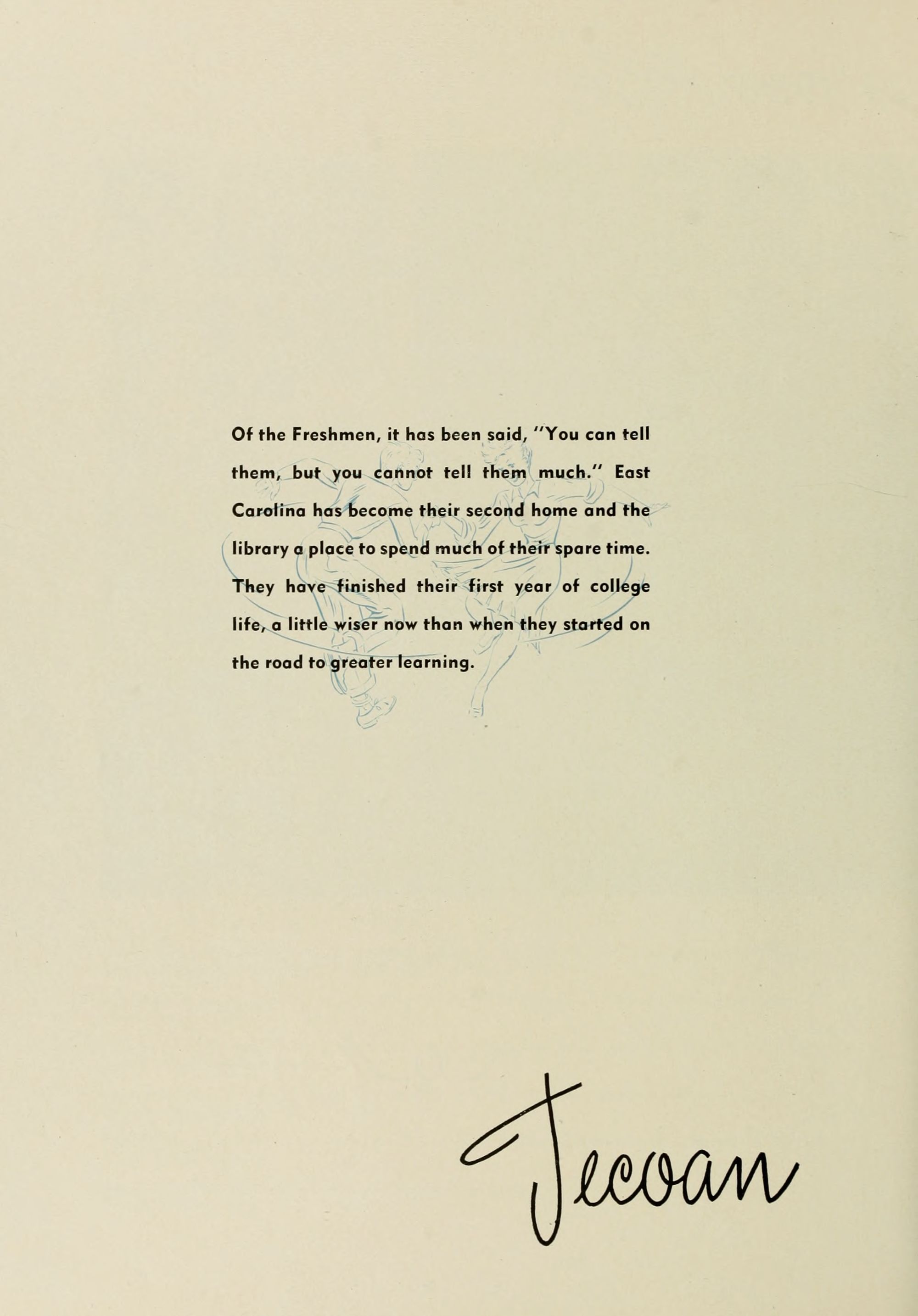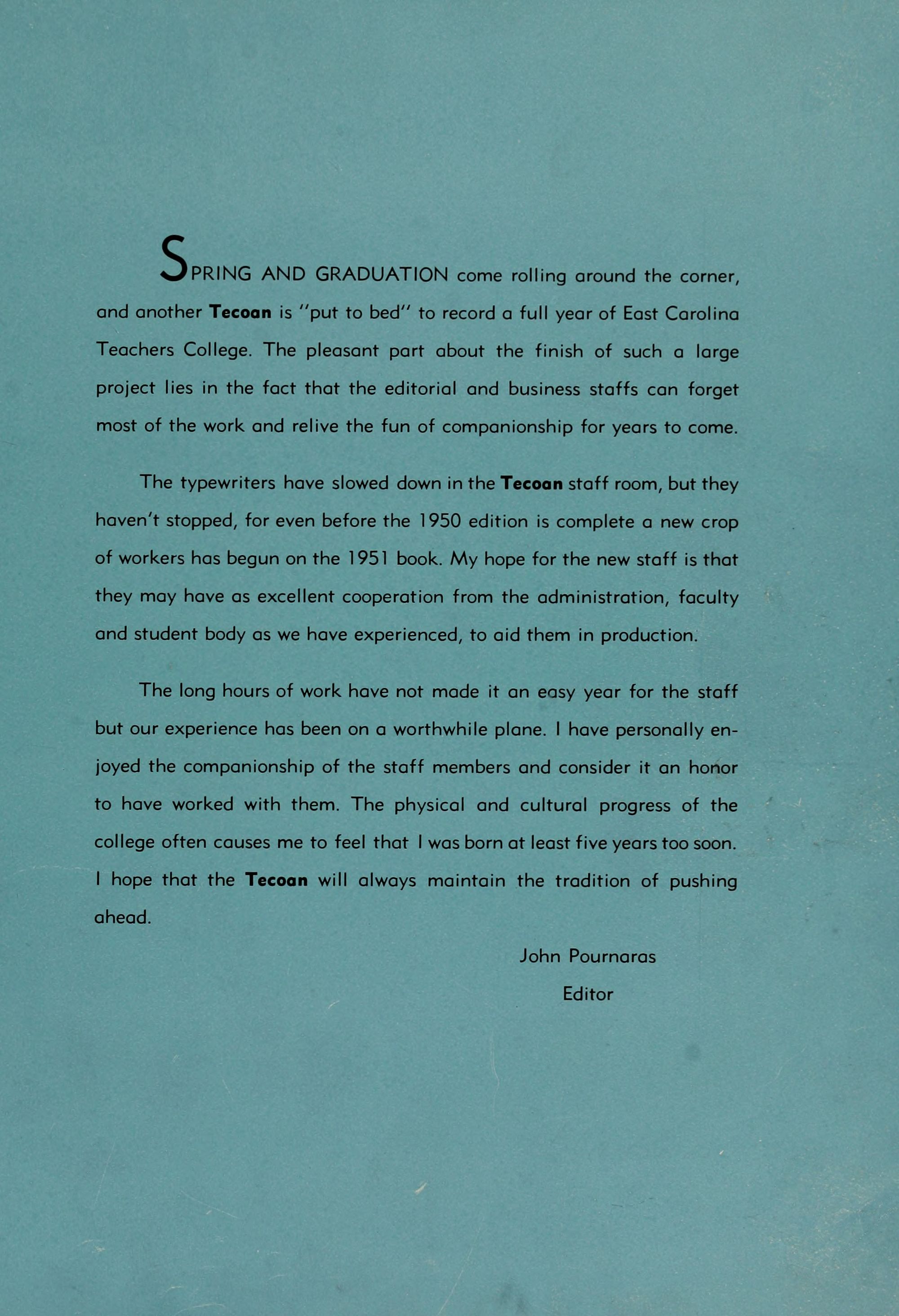 SPRING AND GRADUATION come rolling around the corner, and another Tecoan is "put to bed" to record a full year of East Carolina Teachers College. The pleasant part about the finish of such a large project lies in the fact that the editorial and business staffs can forget most of the work and relive the fun of companionship for years to come.