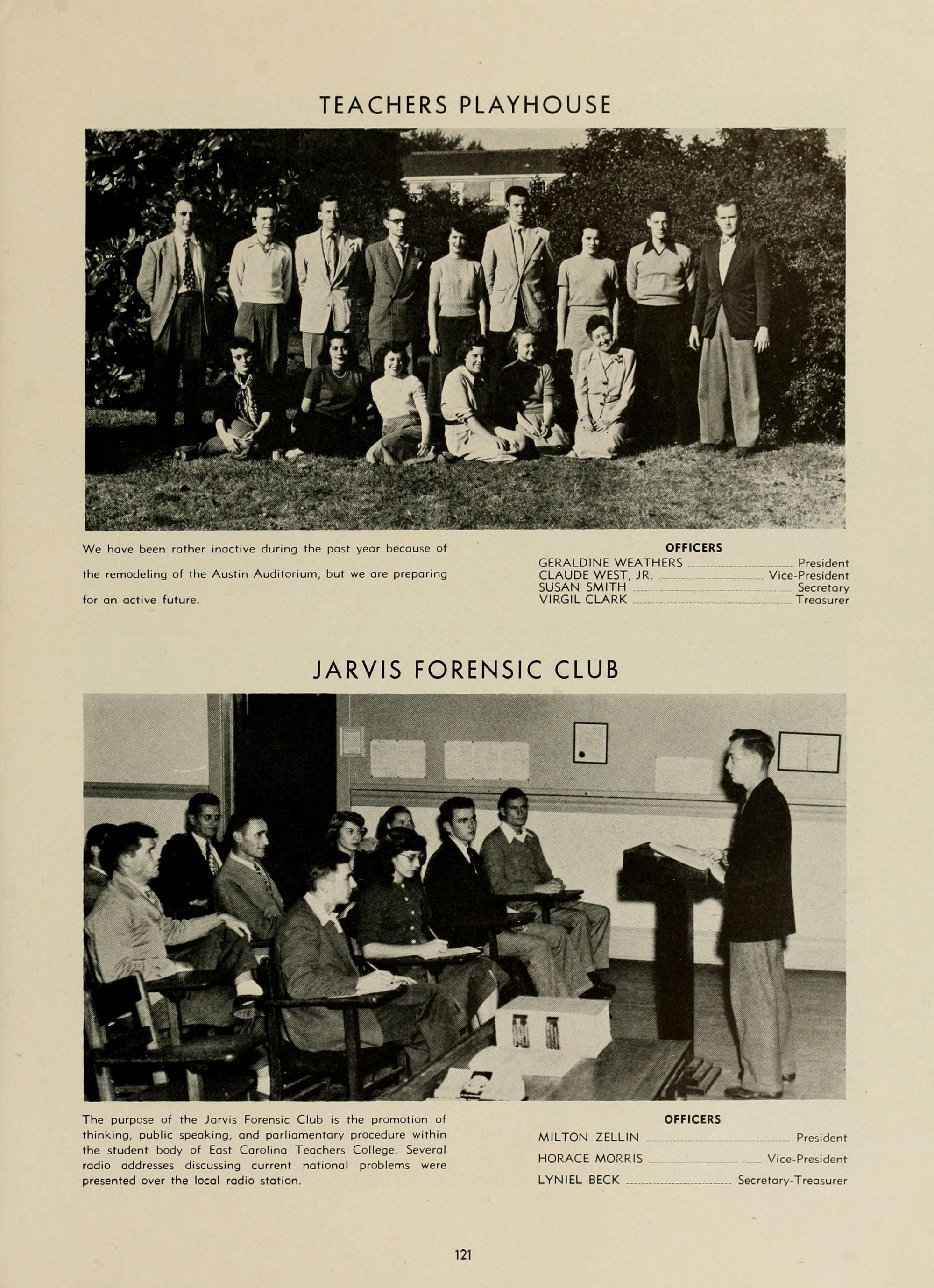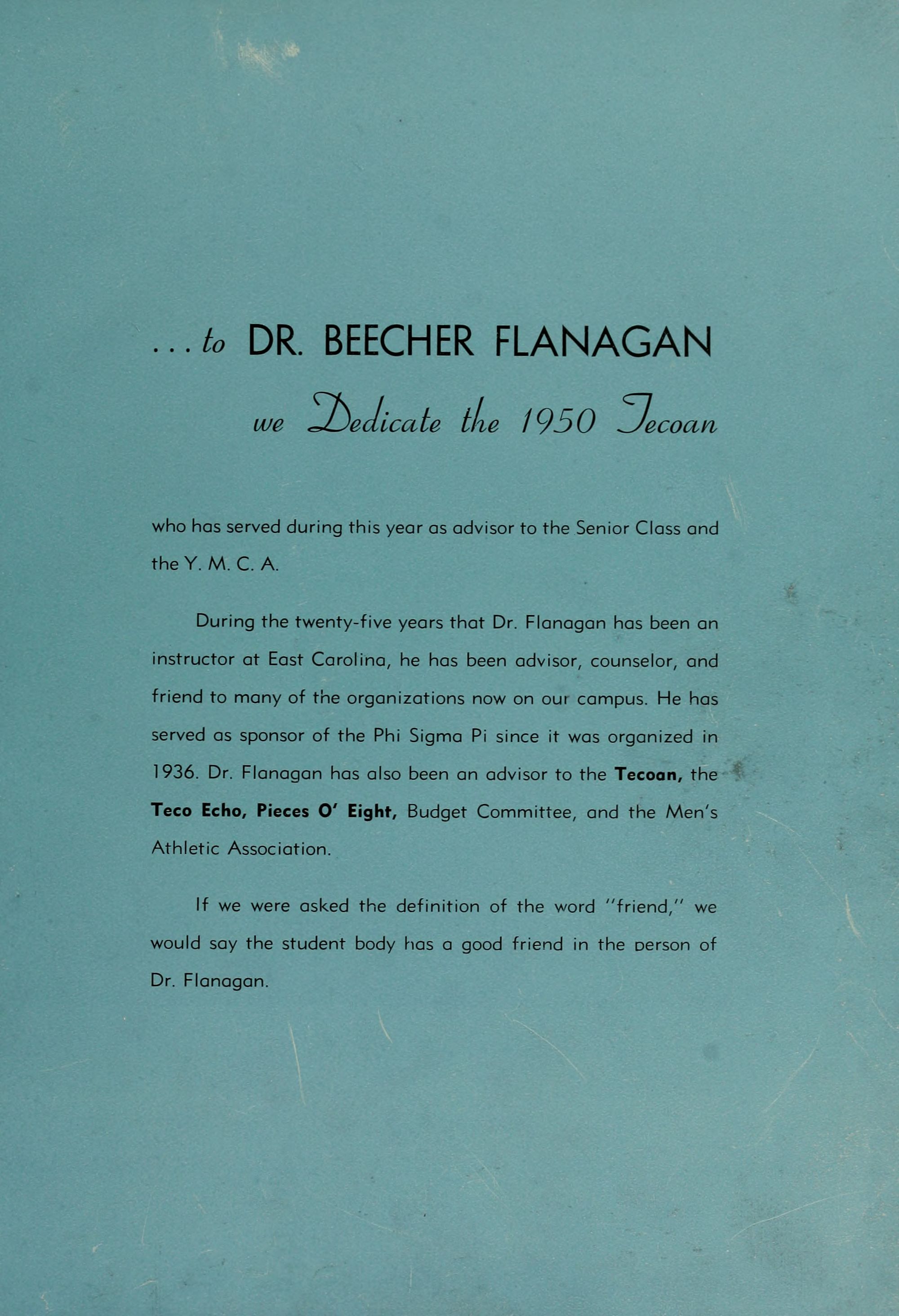 During the twenty-five years that Dr. Flanagan has been an instructor at East Carolina, he has been advisor, counselor, and friend to many of the organizations now on out campus. He has served as sponsor of the Phi Sigma Pi since it was organized in 1936. Dr. Flanagan has also been an advisor to the Tecoan, the Teco Echo, Pieces O' Eight, Budget Committee, and the Men's Athletic Association.
