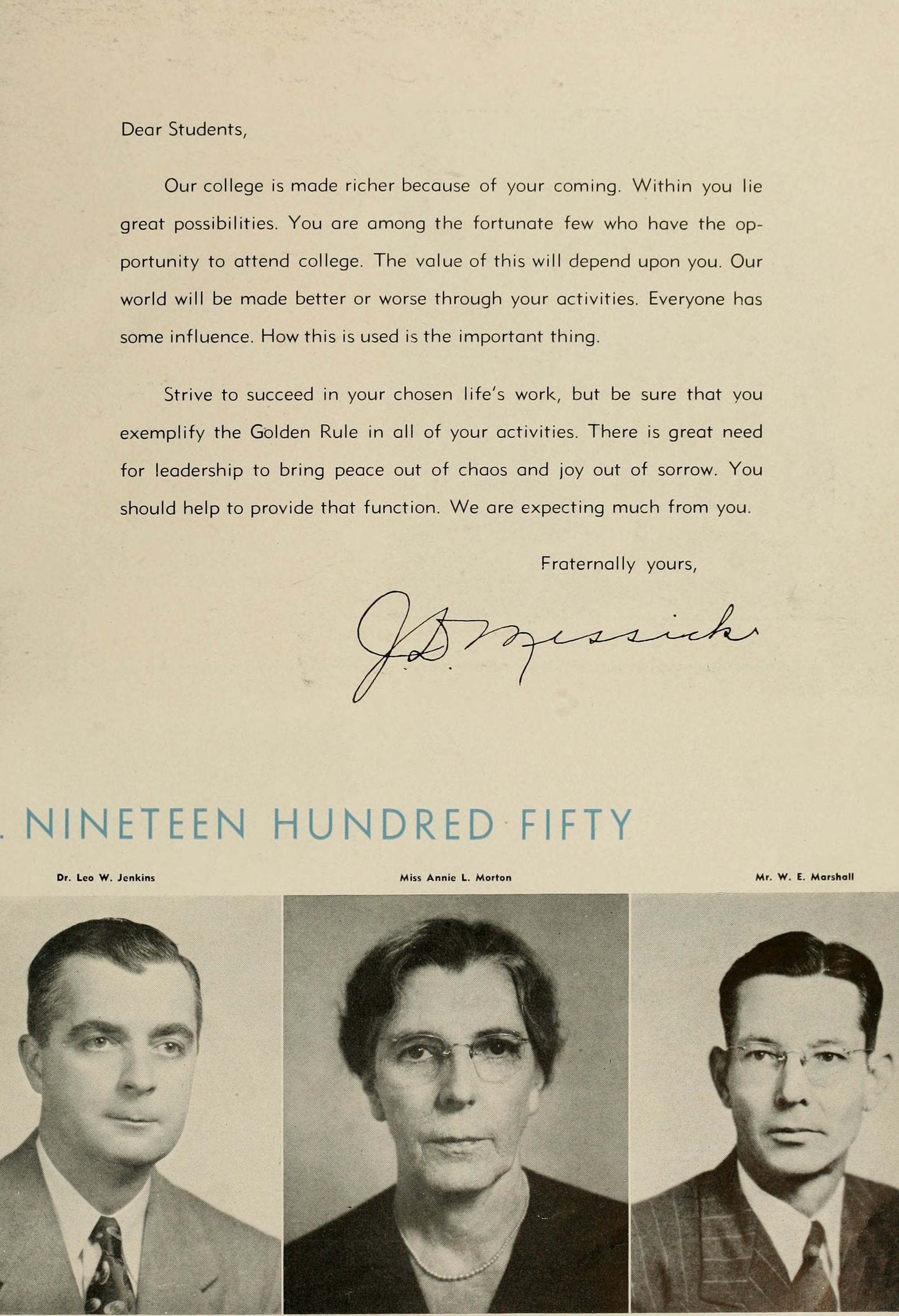 Our college is made richer because of your coming. Within you lie great possibilities. You are among the fortunate few who have the opportunity to attend college. The value of this will depend upon you. Our world will be made better or worse through your activities. Everyone has some influence. How this is used is the important thing.