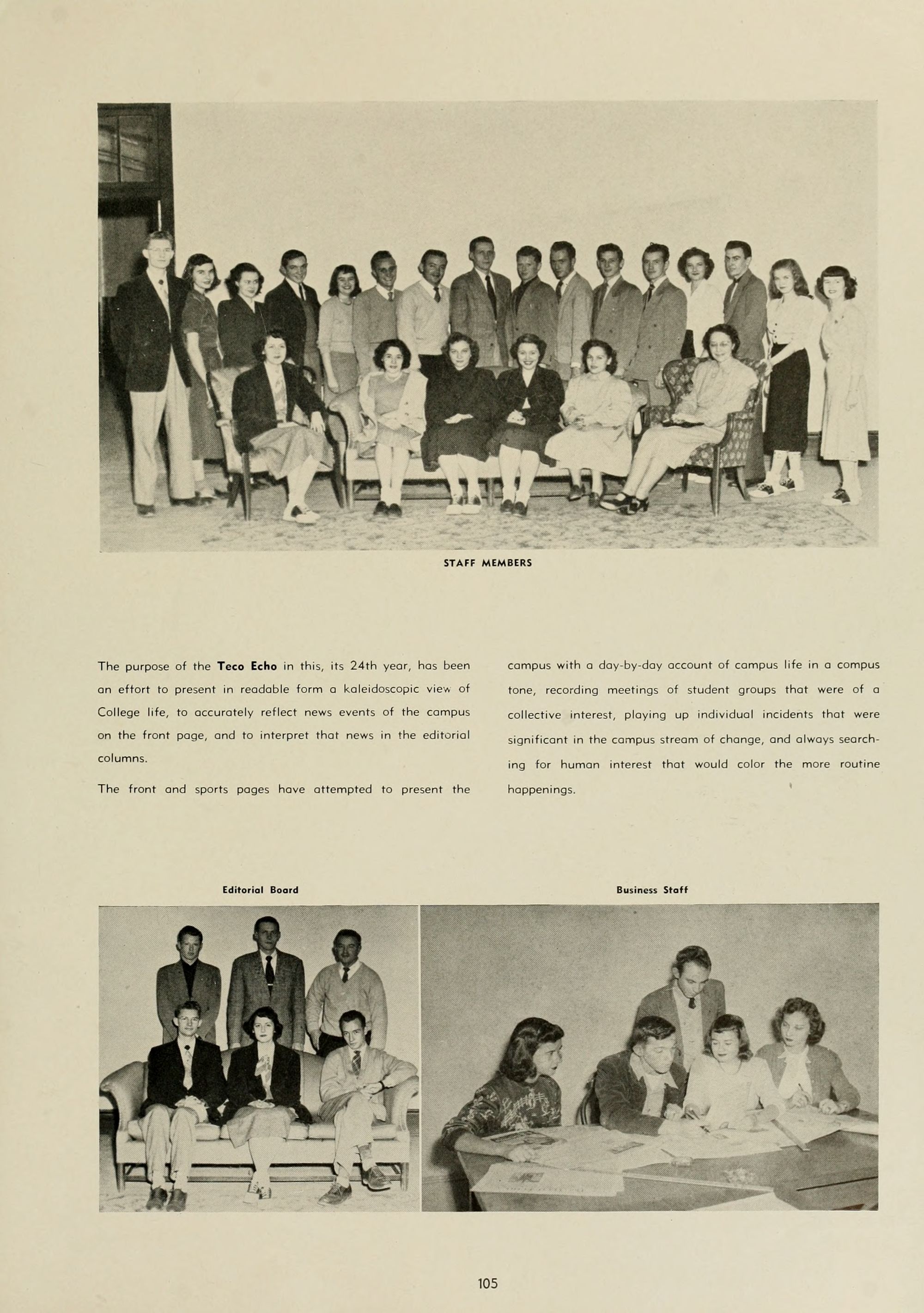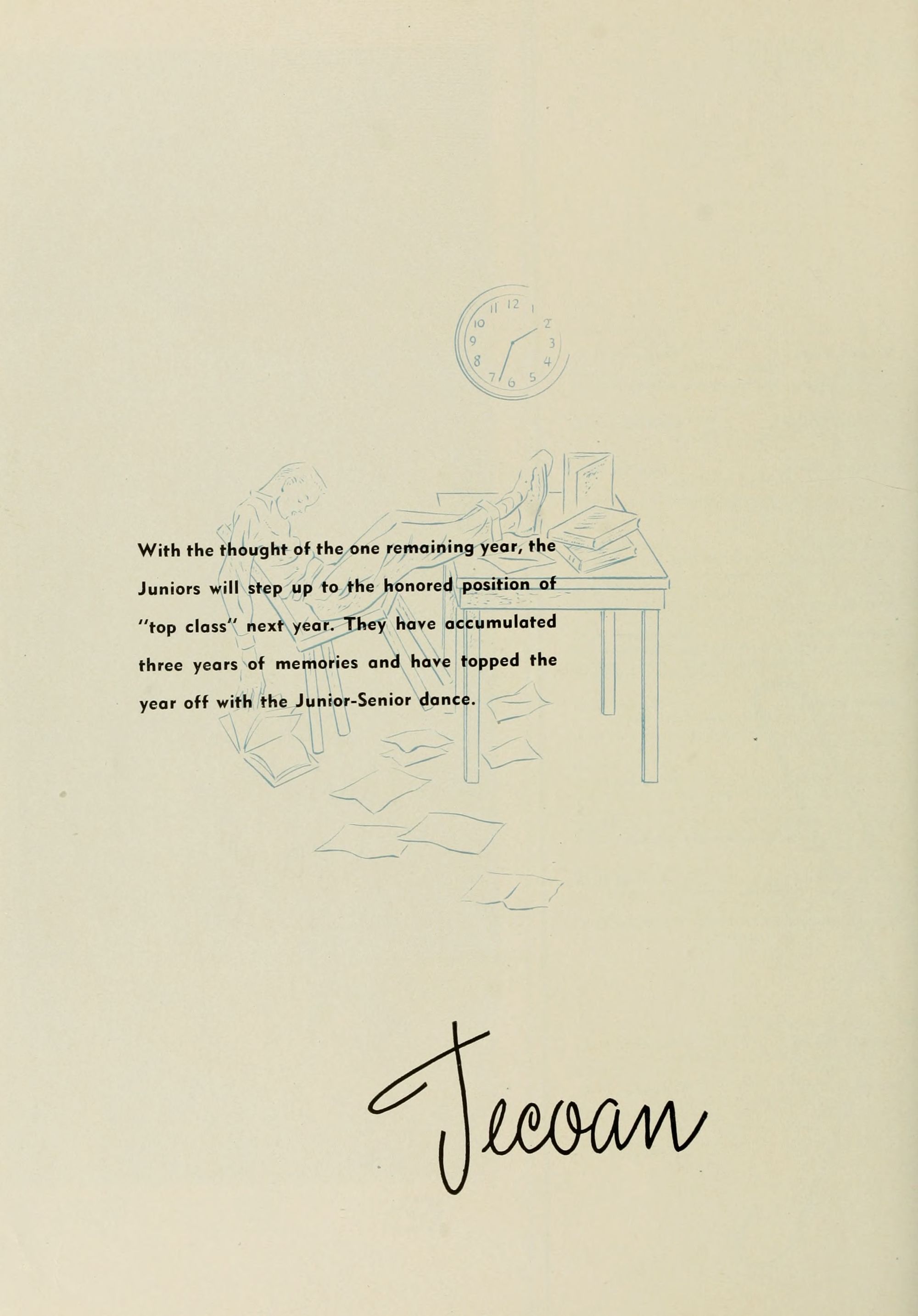 The long hours of work have not made it an easy year for the staff but our experience has been on a worthwhile plane. I have personally enjoyed the companionship of the staff members and consider it an honor to have worked with them. The physical and cultural progress of the college often causes me to feel that I was born at least five years too soon. I hope that the Tecoan will always maintain the tradition of pushing ahead.