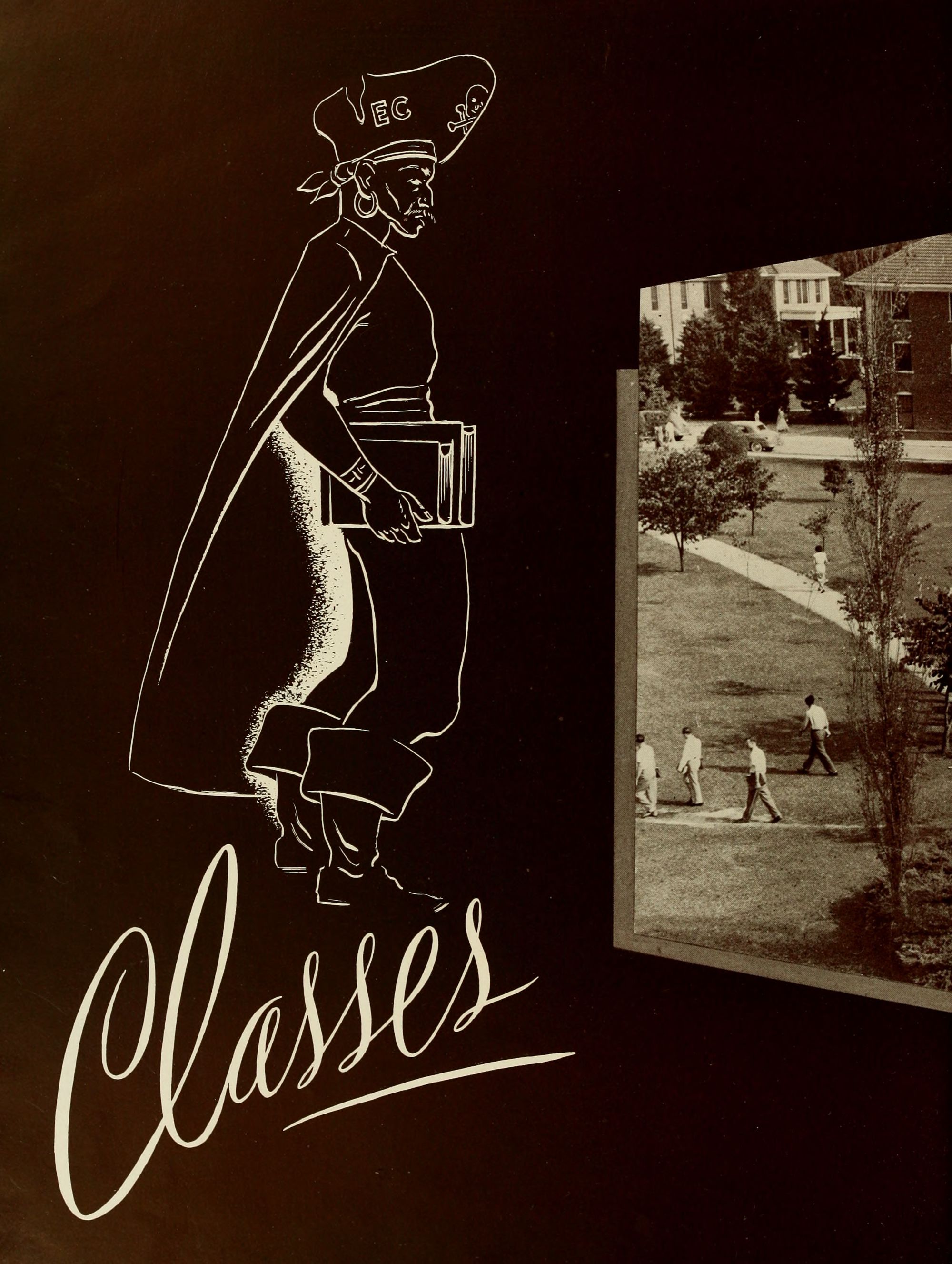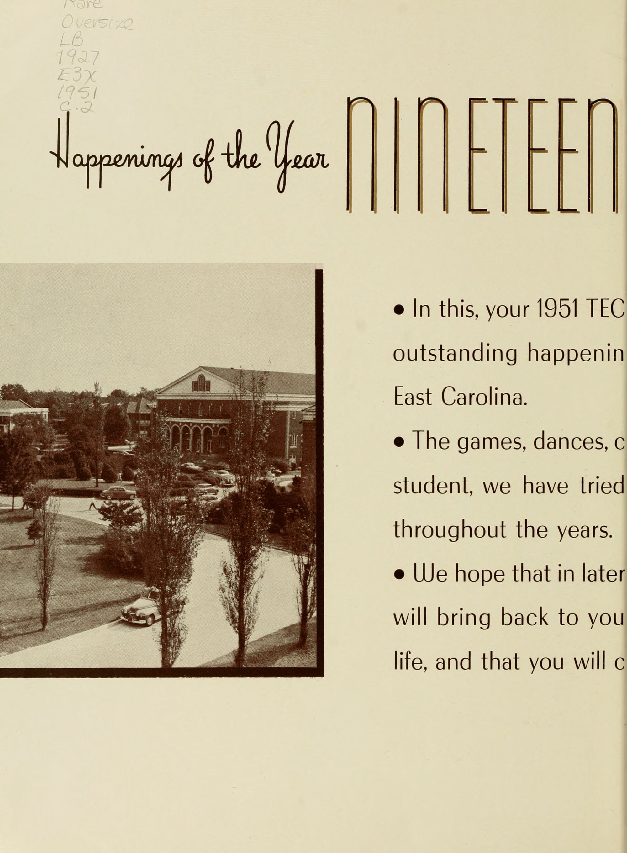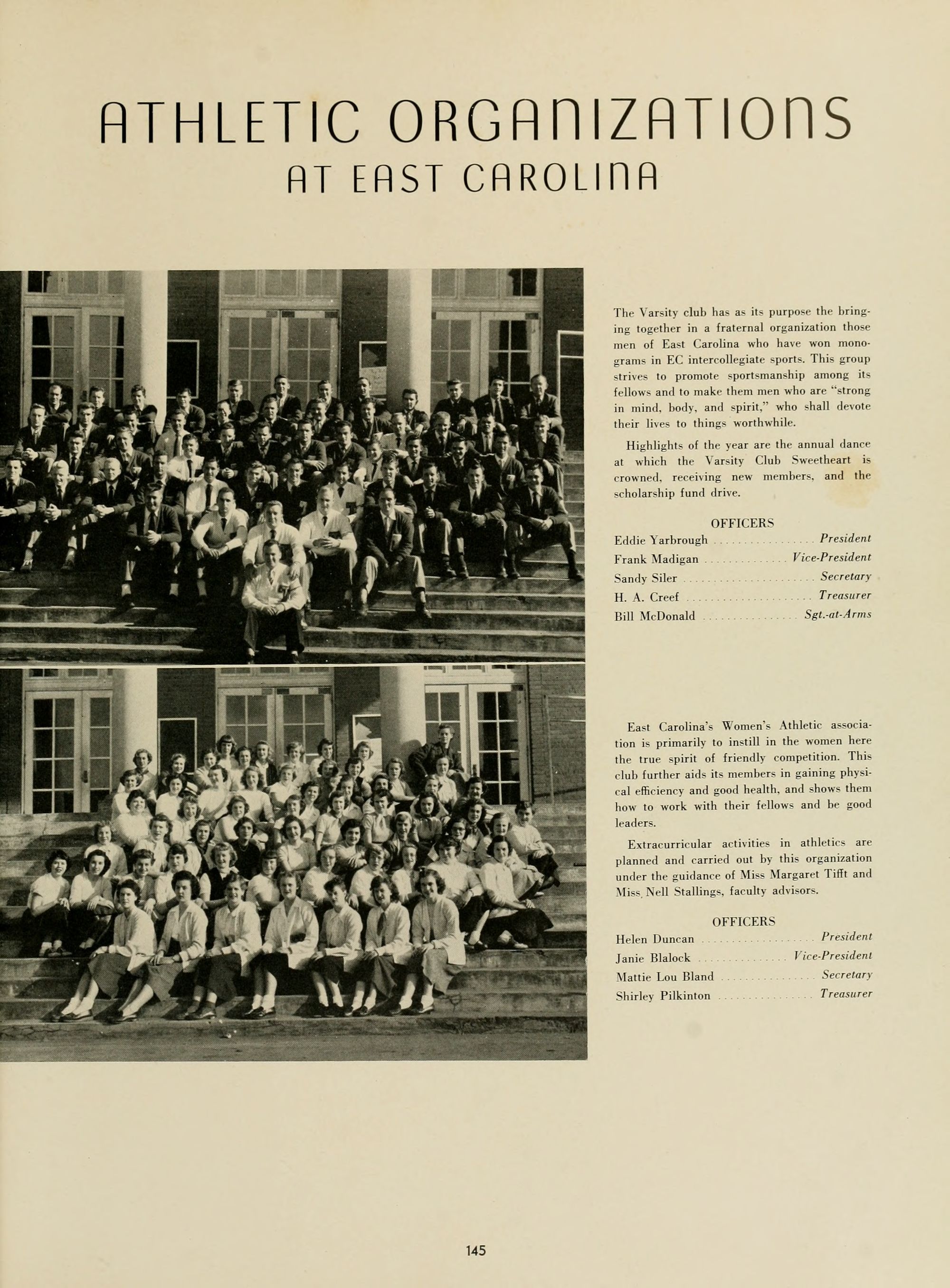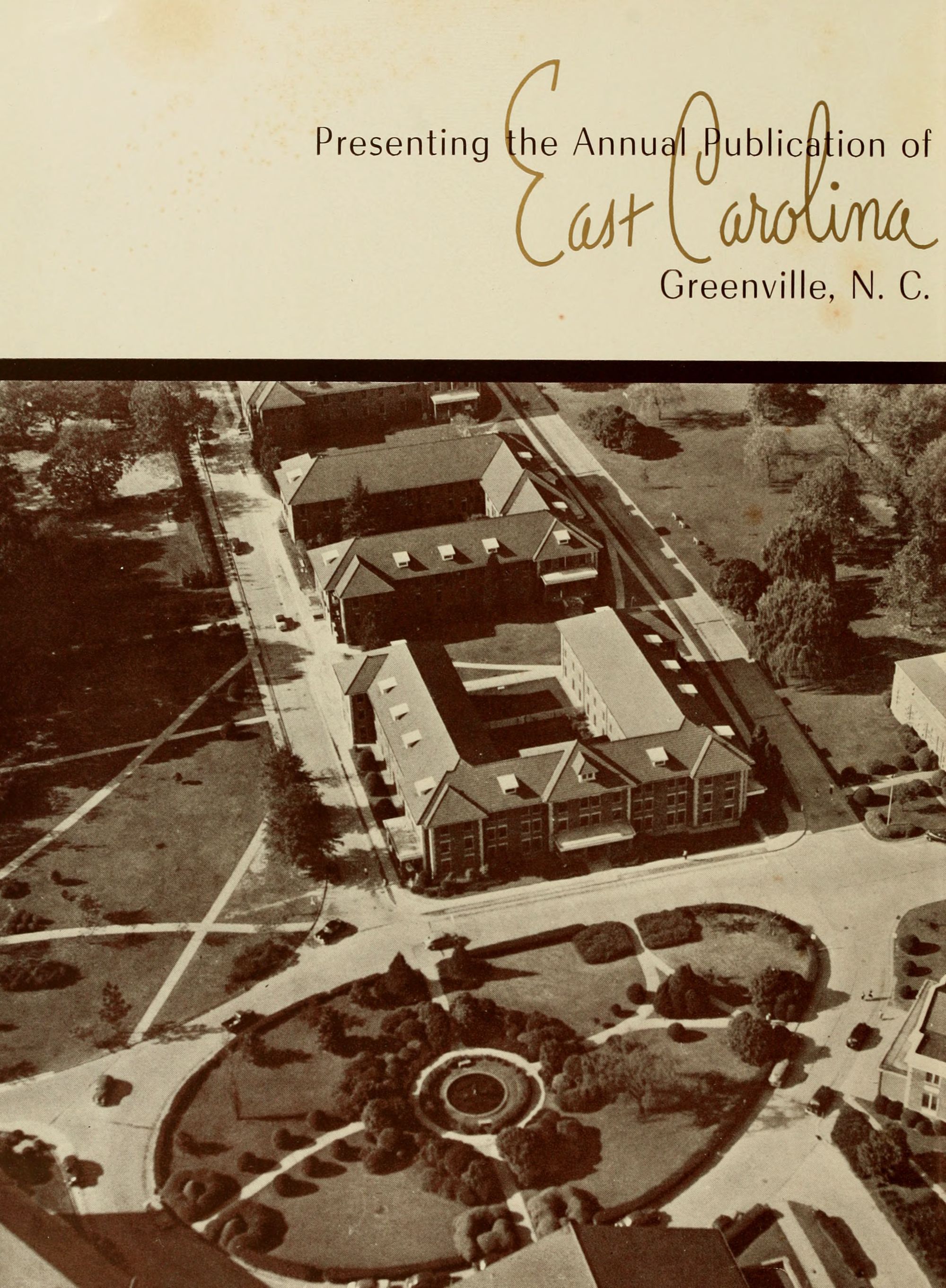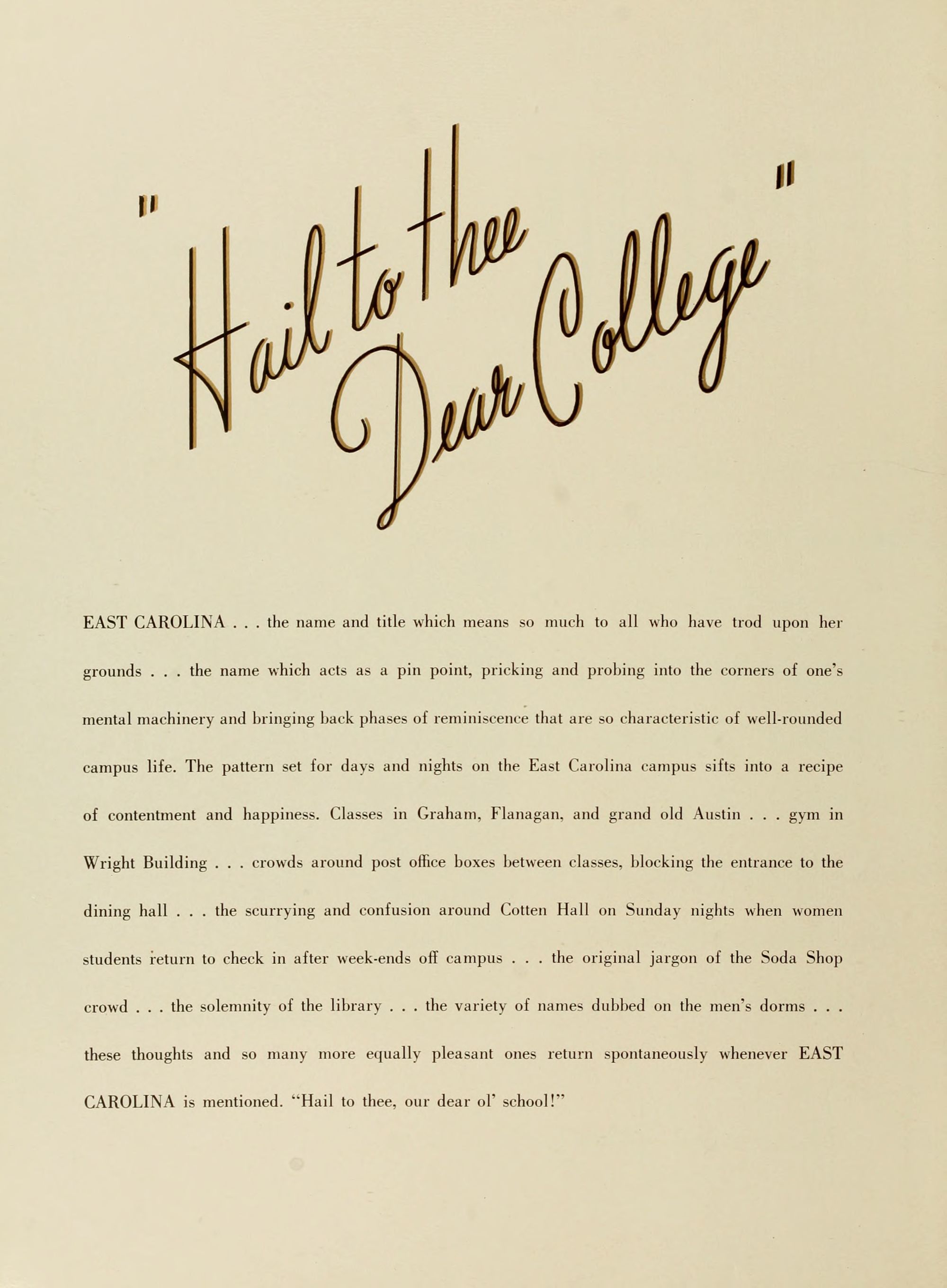 EAST CAROLINA ... the name and title which means so much to all who have trod upon her grounds ... the name which acts as a pin point, pricking and probing into the corners of one's mental machinery and bringing back phases of reminiscence that are so characteristic of well-rounded campus life. The pattern set for days and nights on the East Carolina campus sifts into a recipe of contentment and happiness. Classes in Graham, Flanagan, and grand old Austin . . . gym in Wright Building . . . crowds around post office boxes between classes, blocking the entrance to the dining hall ... the scurrying and confusion around Cotten Hall on Sunday nights when women students return to check in after week-ends off campus . . . the original jargon of the Soda Shop ciowd . . . the solemnity of the library . . . the variety of names dubbed on the men's dorms . . . these thoughts and so many more equally pleasant ones return spontaneously whenever EAST CAROLINA is mentioned. "Hail to thee, our dear ol' school!"
