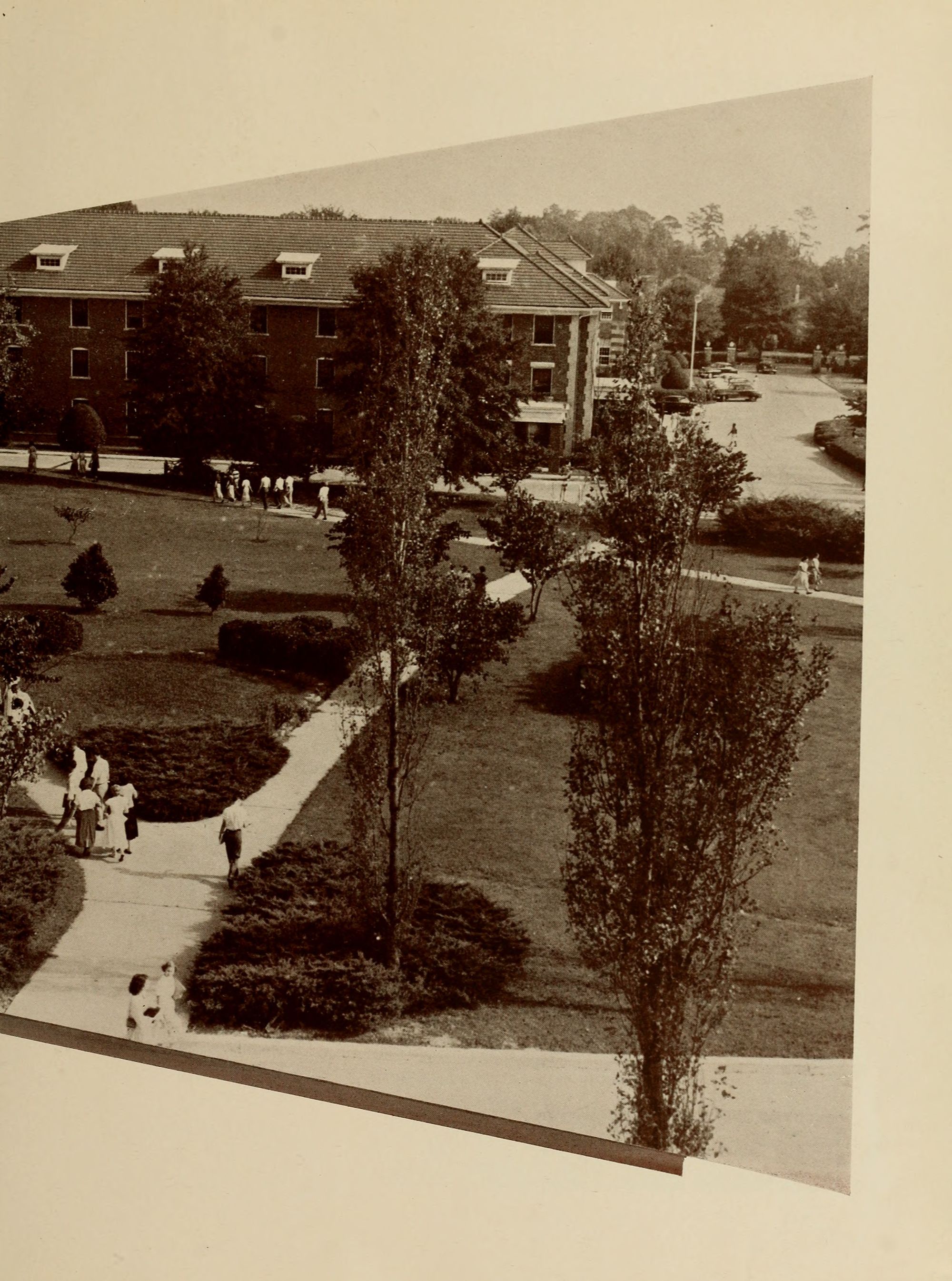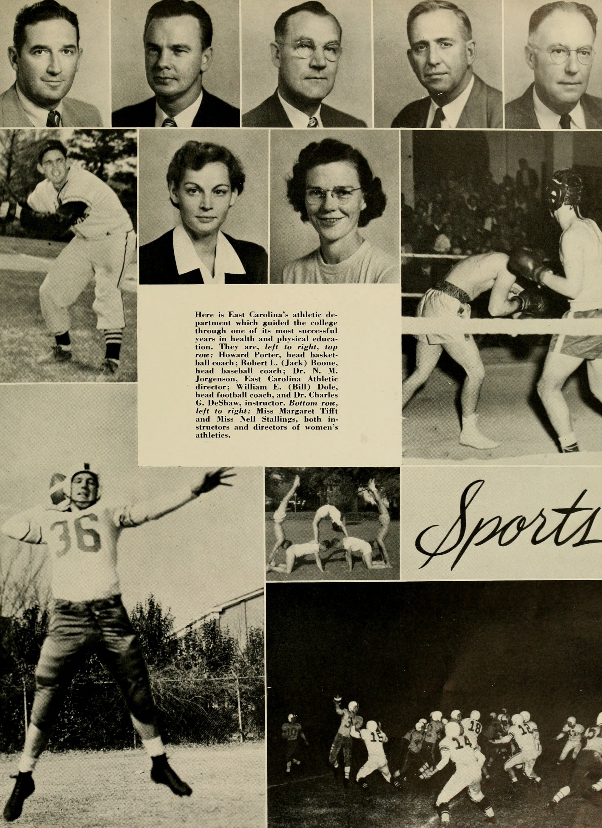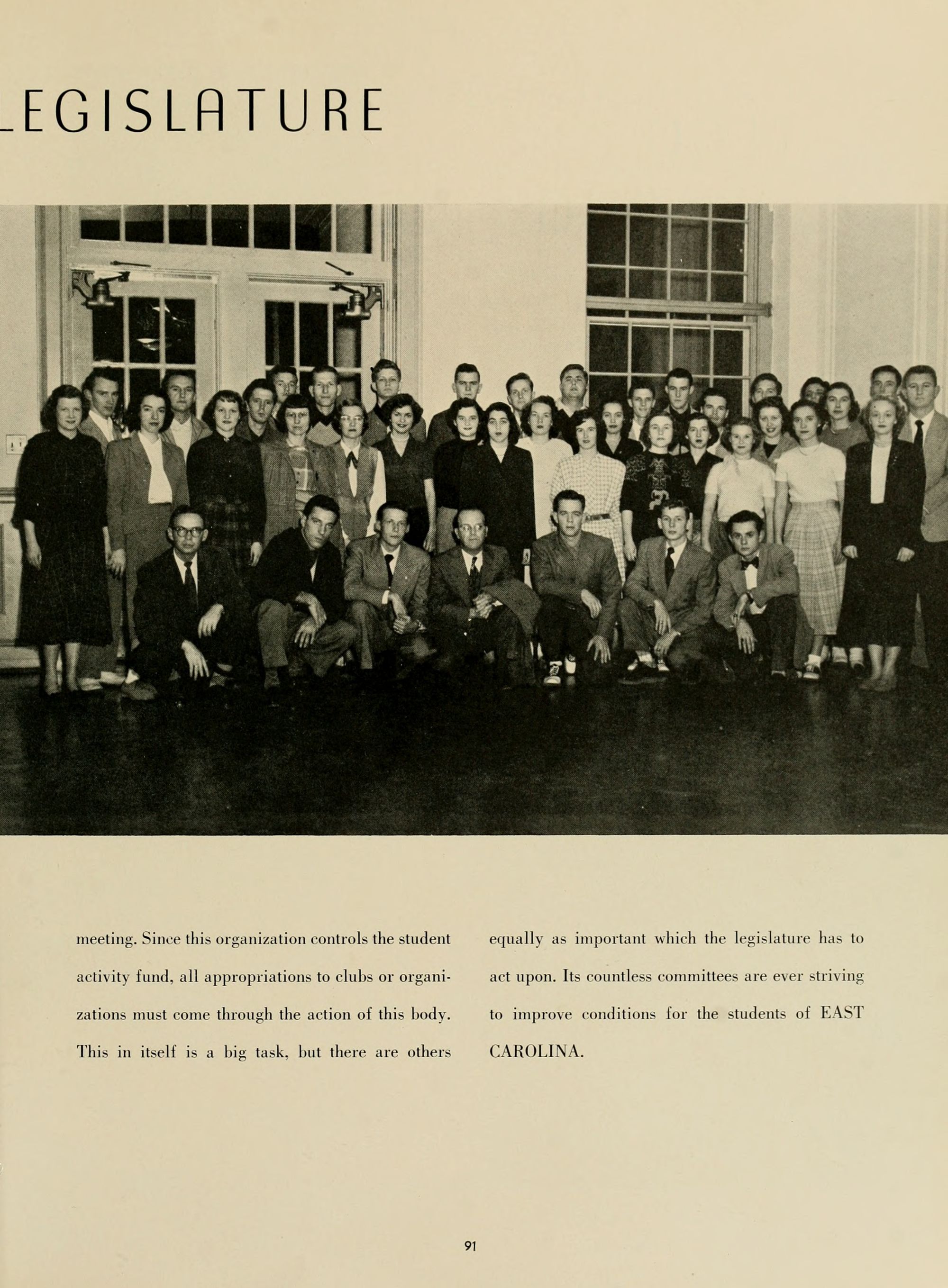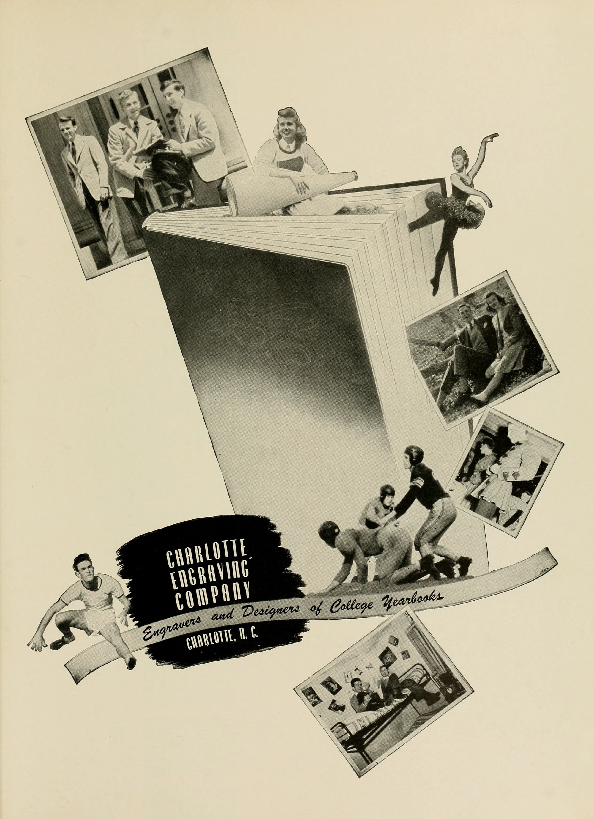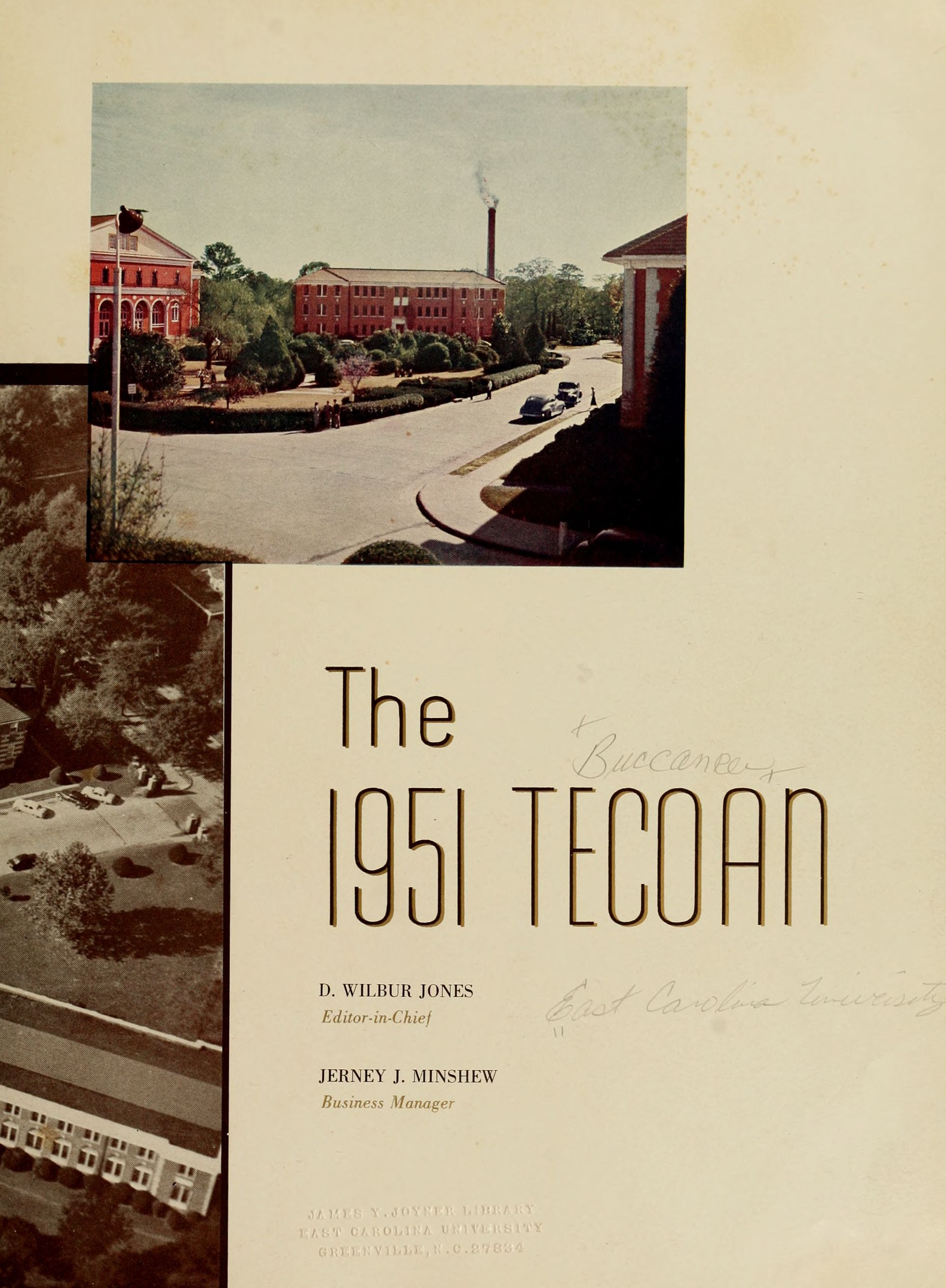 EAST CAROLINA ... the name and title which means so much to all who have trod upon her grounds ... the name which acts as a pin point, pricking and probing into the corners of one's mental machinery and bringing back phases of reminiscence that are so characteristic of well-rounded campus life. The pattern set for days and nights on the East Carolina campus sifts into a recipe of contentment and happiness. Classes in Graham, Flanagan, and grand old Austin . . . gym in Wright Building . . . crowds around post office boxes between classes, blocking the entrance to the dining hall ... the scurrying and confusion around Cotten Hall on Sunday nights when women students return to check in after week-ends off campus . . . the original jargon of the Soda Shop ciowd . . . the solemnity of the library . . . the variety of names dubbed on the men's dorms . . . these thoughts and so many more equally pleasant ones return spontaneously whenever EAST CAROLINA is mentioned. "Hail to thee, our dear ol' school!"