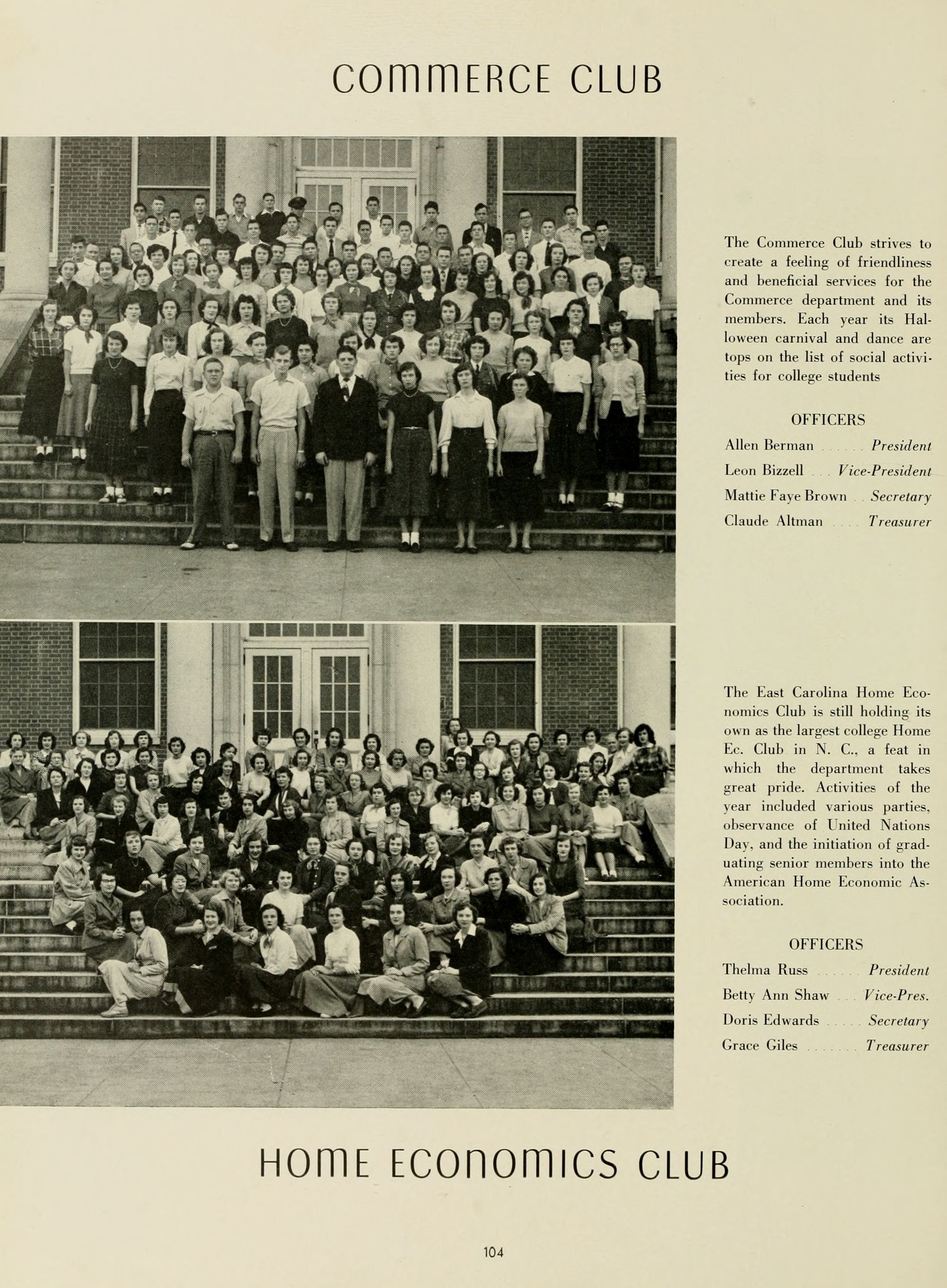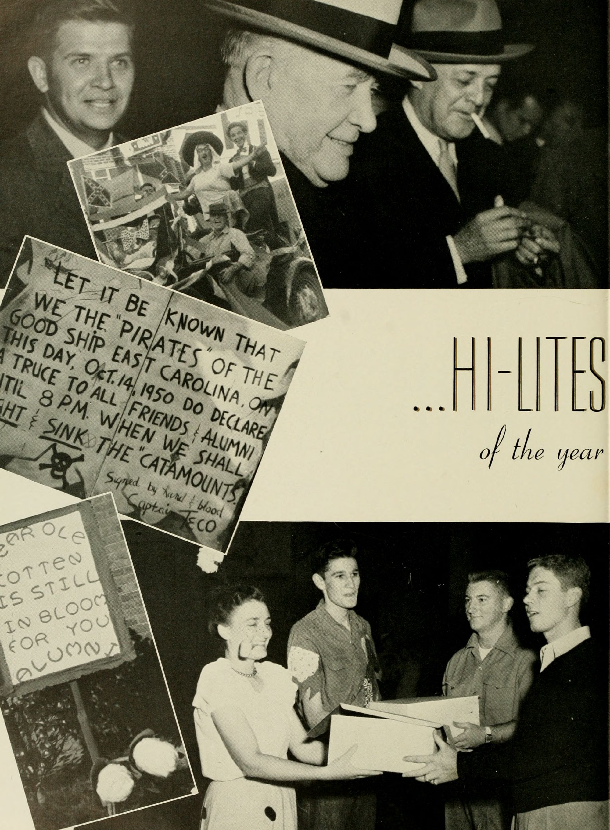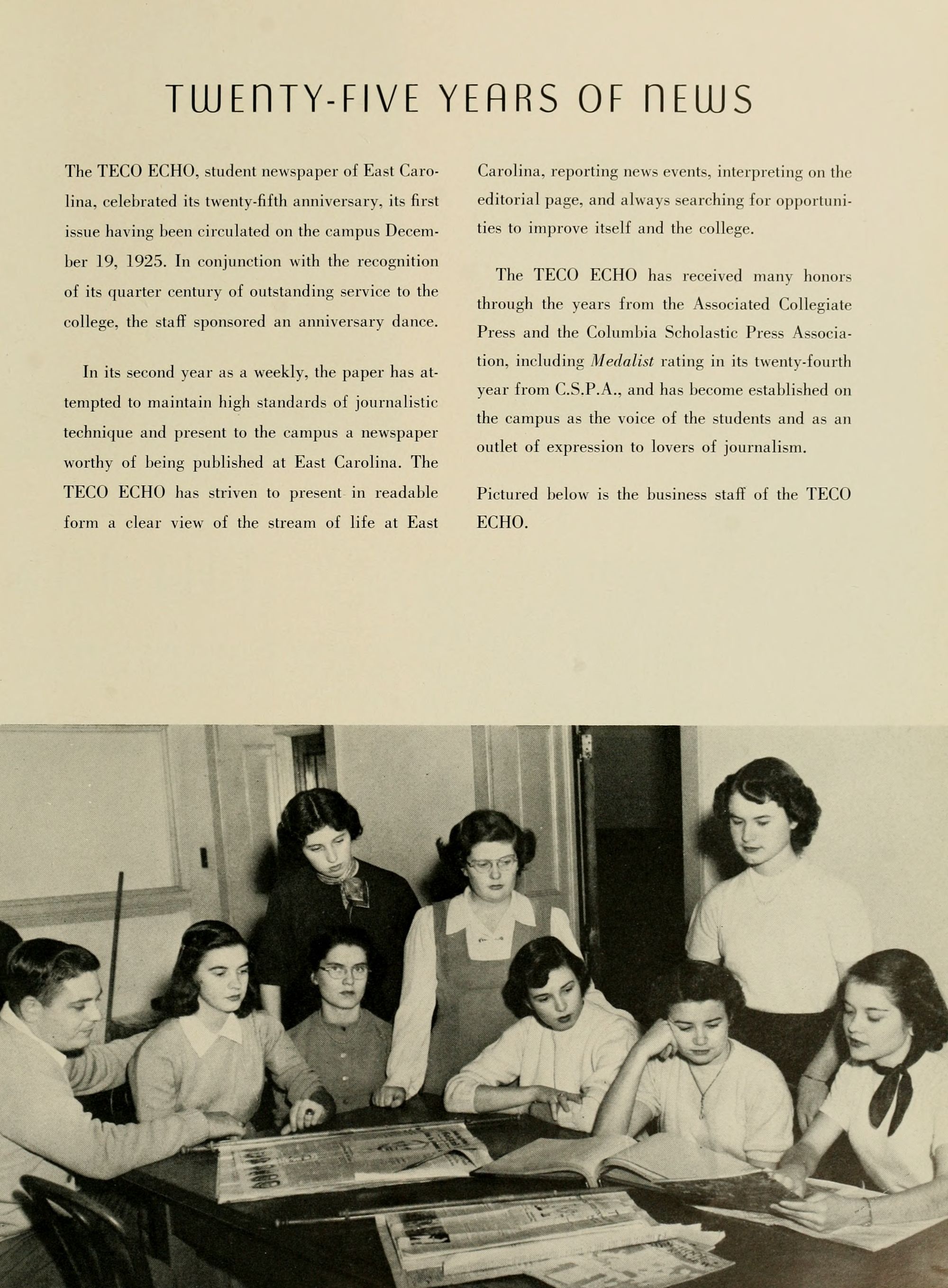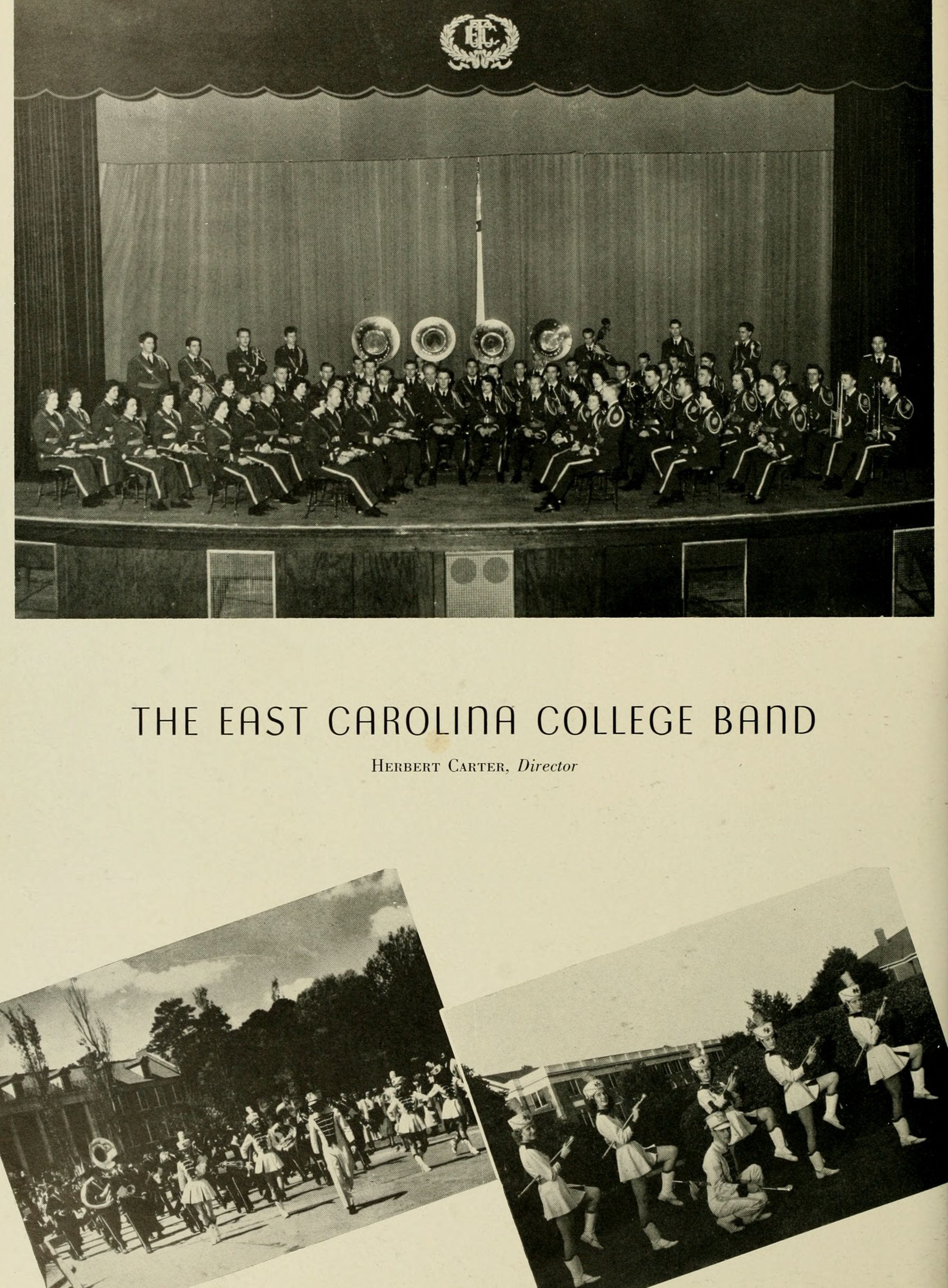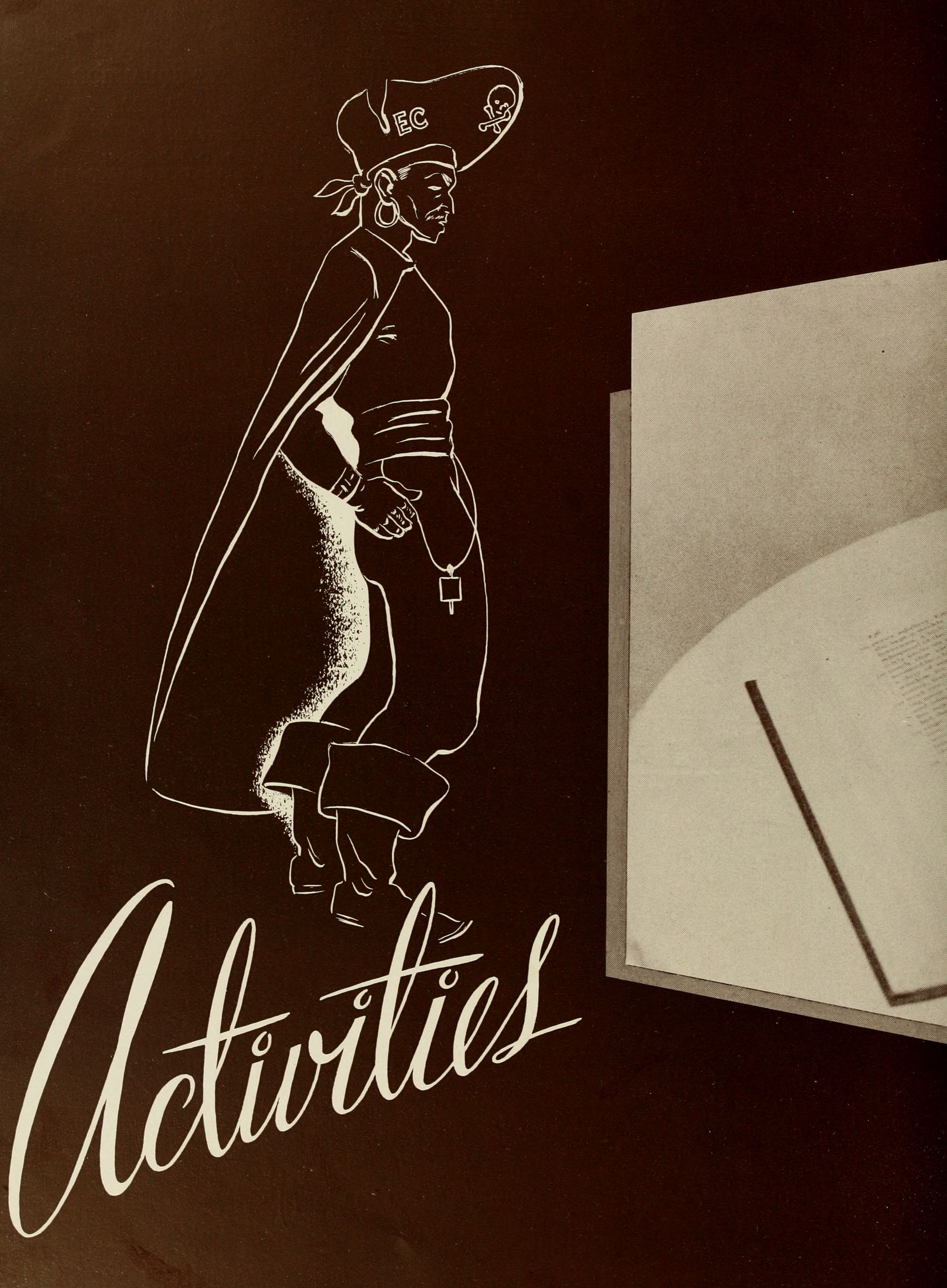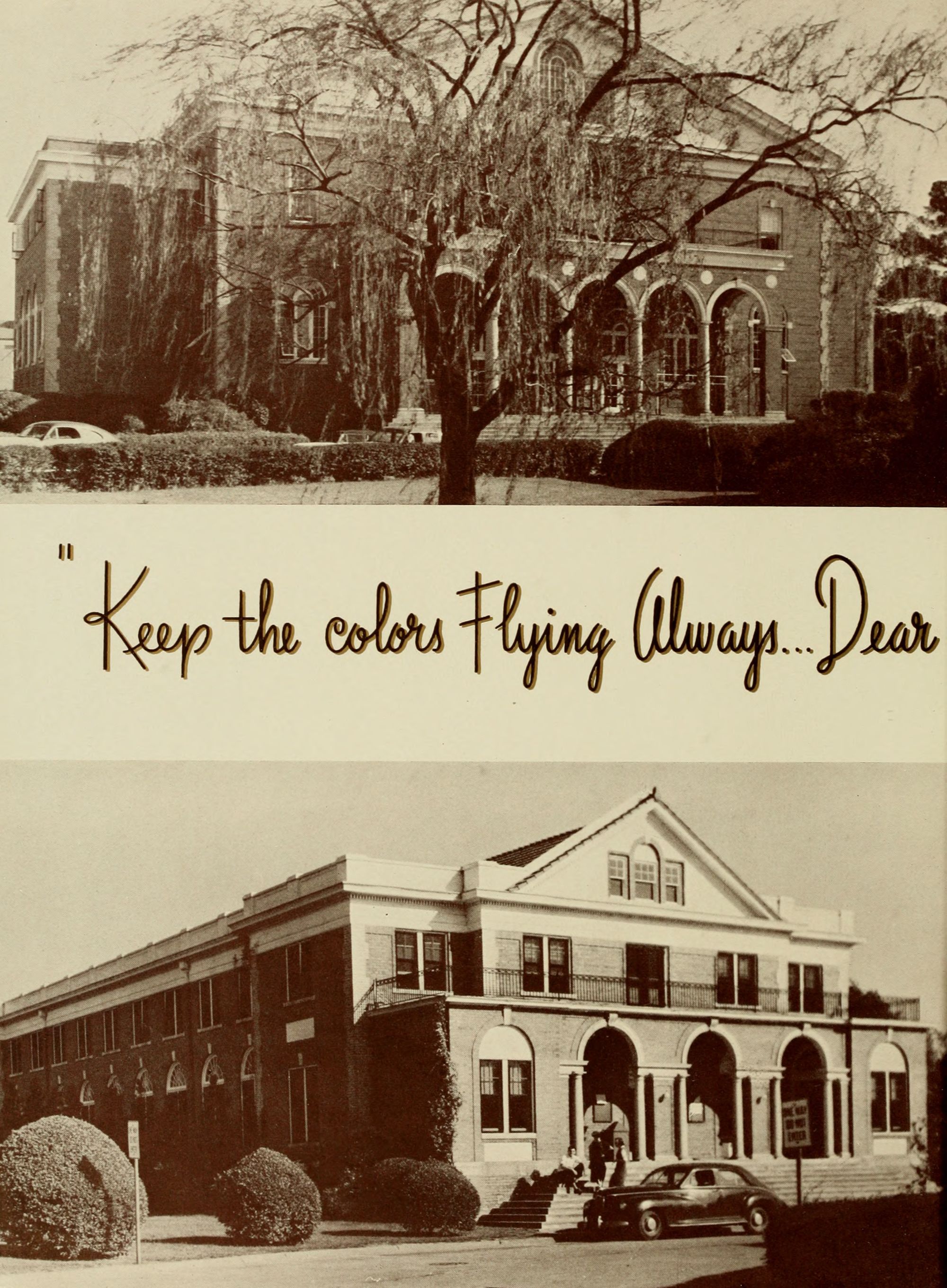 EAST CAROLINA ... the name and title which means so much to all who have trod upon her grounds ... the name which acts as a pin point, pricking and probing into the corners of one's mental machinery and bringing back phases of reminiscence that are so characteristic of well-rounded campus life. The pattern set for days and nights on the East Carolina campus sifts into a recipe of contentment and happiness. Classes in Graham, Flanagan, and grand old Austin . . . gym in Wright Building . . . crowds around post office boxes between classes, blocking the entrance to the dining hall ... the scurrying and confusion around Cotten Hall on Sunday nights when women students return to check in after week-ends off campus . . . the original jargon of the Soda Shop ciowd . . . the solemnity of the library . . . the variety of names dubbed on the men's dorms . . . these thoughts and so many more equally pleasant ones return spontaneously whenever EAST CAROLINA is mentioned. "Hail to thee, our dear ol' school!"
