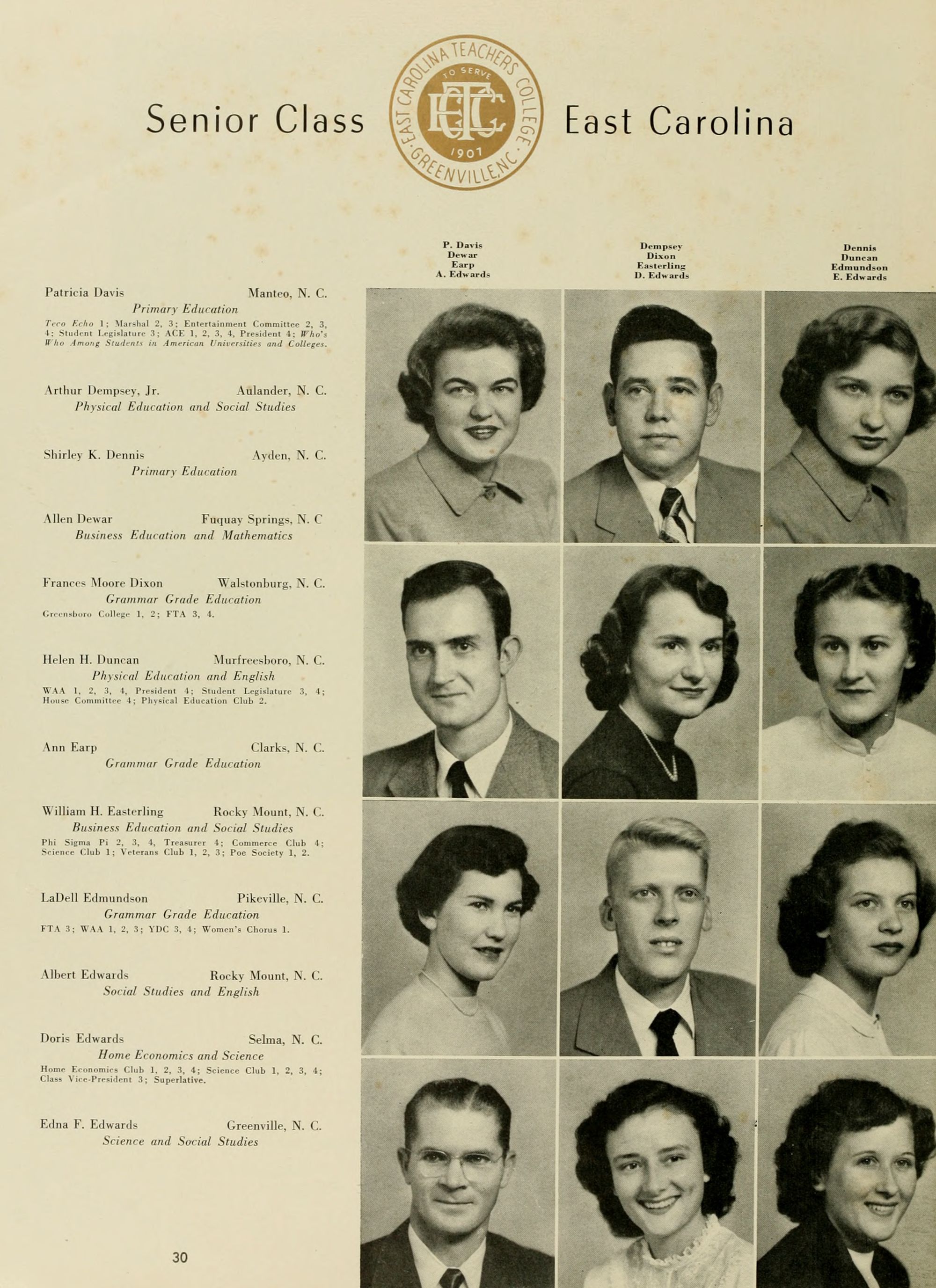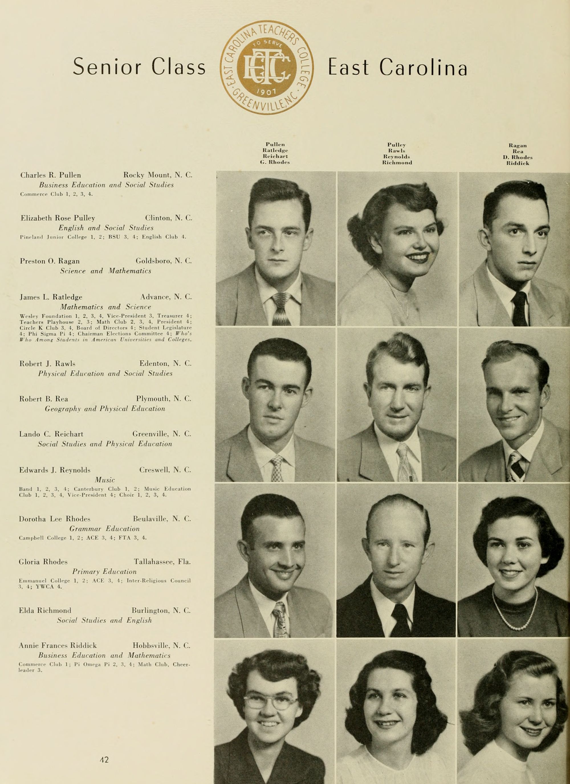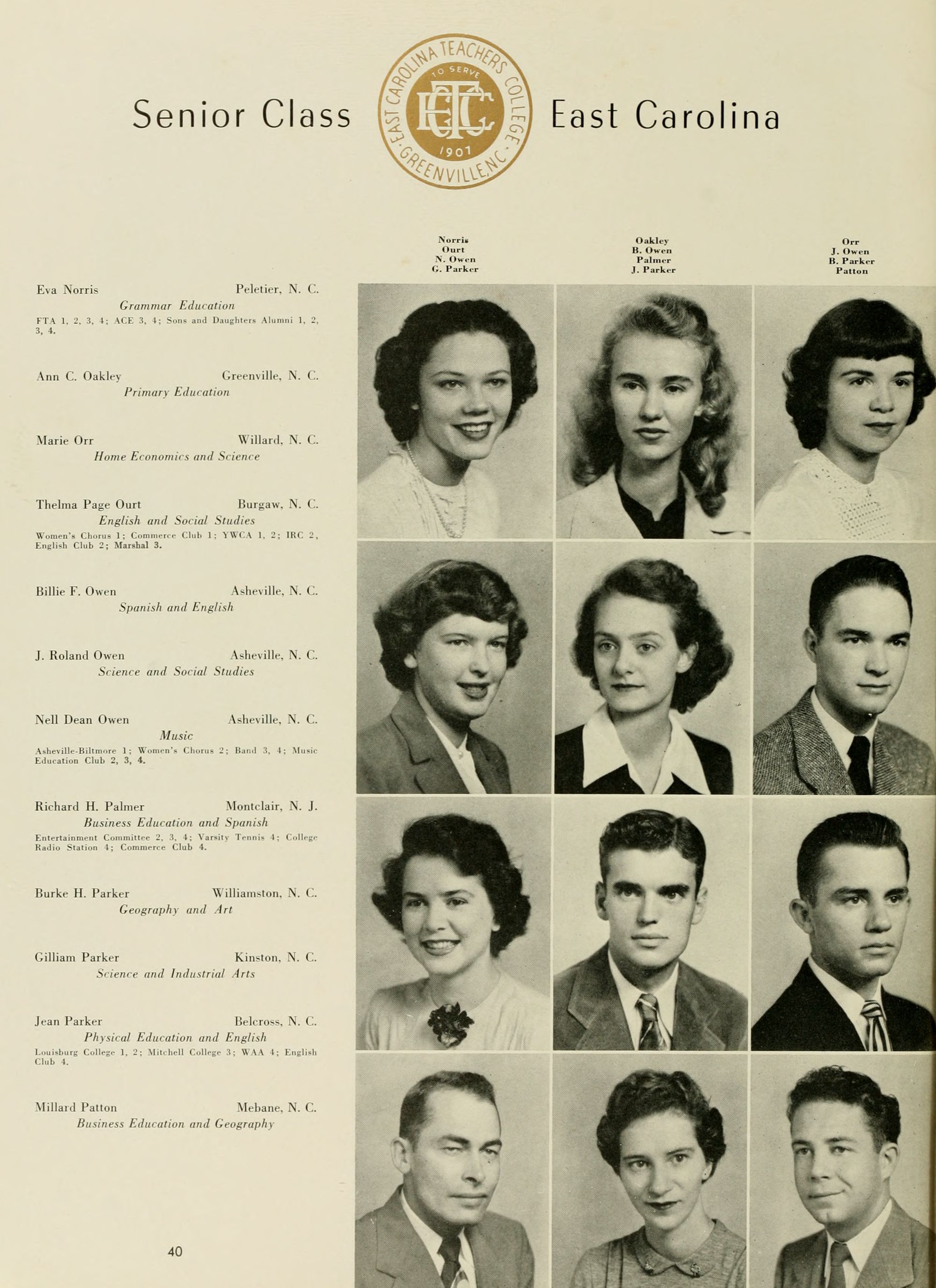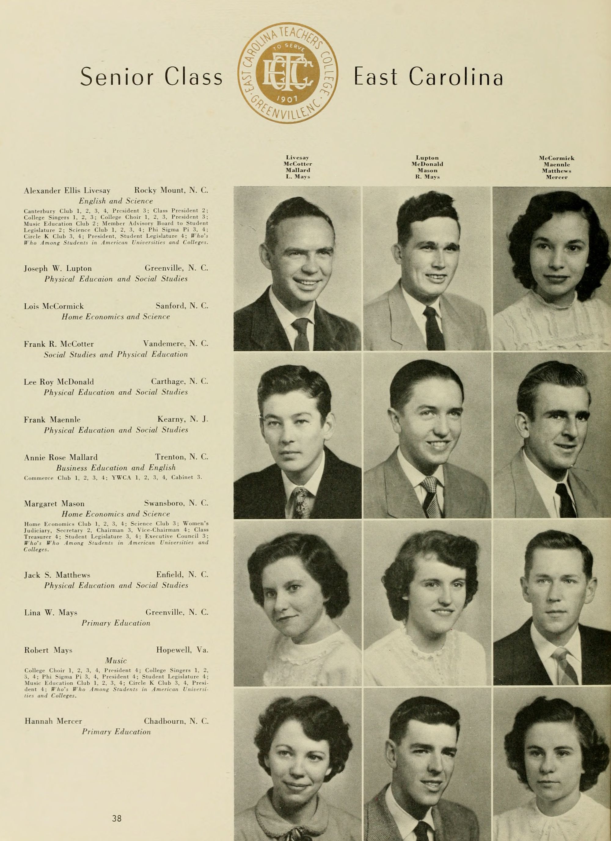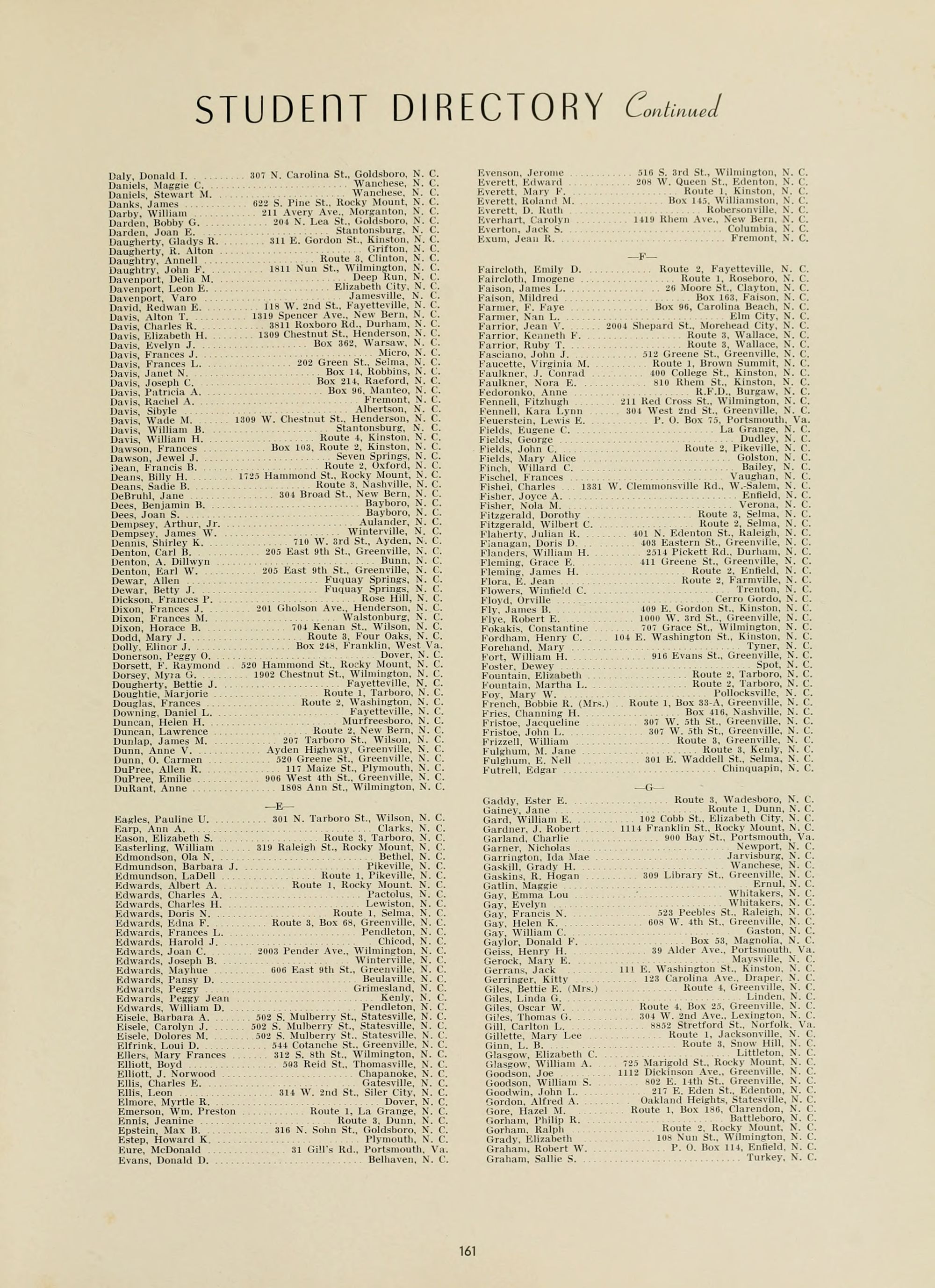 EAST CAROLINA ... the name and title which means so much to all who have trod upon her grounds ... the name which acts as a pin point, pricking and probing into the corners of one's mental machinery and bringing back phases of reminiscence that are so characteristic of well-rounded campus life. The pattern set for days and nights on the East Carolina campus sifts into a recipe of contentment and happiness. Classes in Graham, Flanagan, and grand old Austin . . . gym in Wright Building . . . crowds around post office boxes between classes, blocking the entrance to the dining hall ... the scurrying and confusion around Cotten Hall on Sunday nights when women students return to check in after week-ends off campus . . . the original jargon of the Soda Shop ciowd . . . the solemnity of the library . . . the variety of names dubbed on the men's dorms . . . these thoughts and so many more equally pleasant ones return spontaneously whenever EAST CAROLINA is mentioned. "Hail to thee, our dear ol' school!"