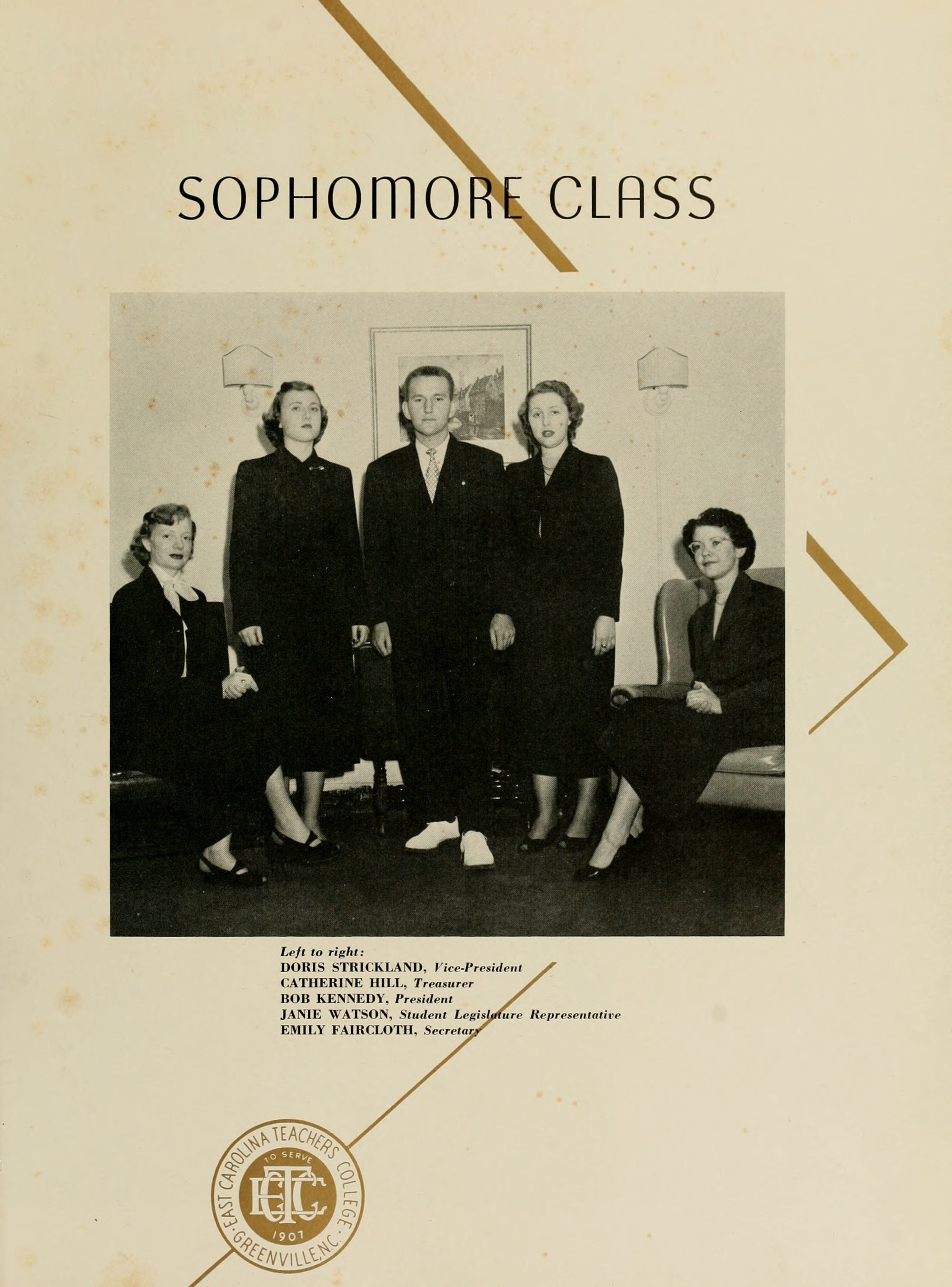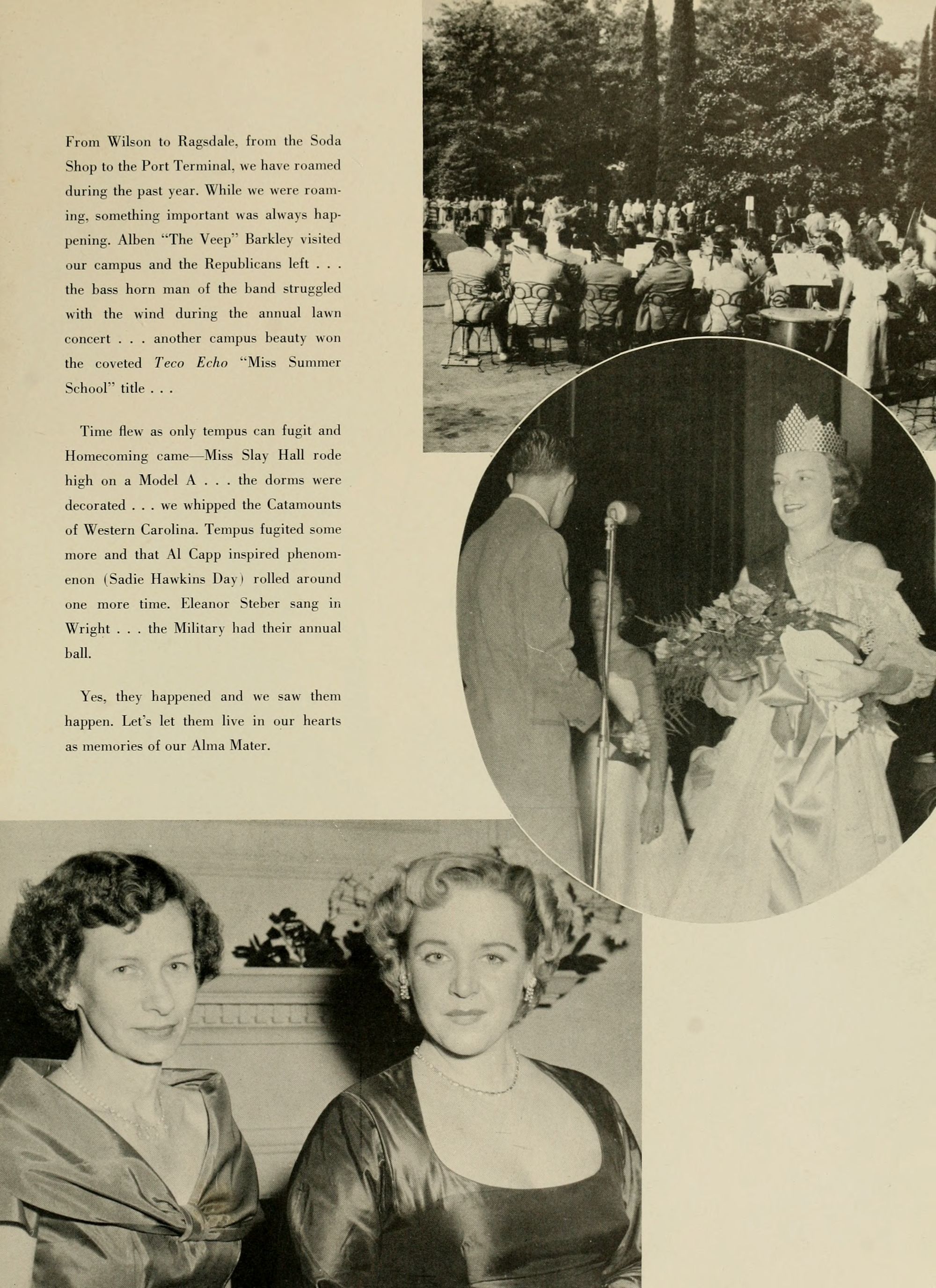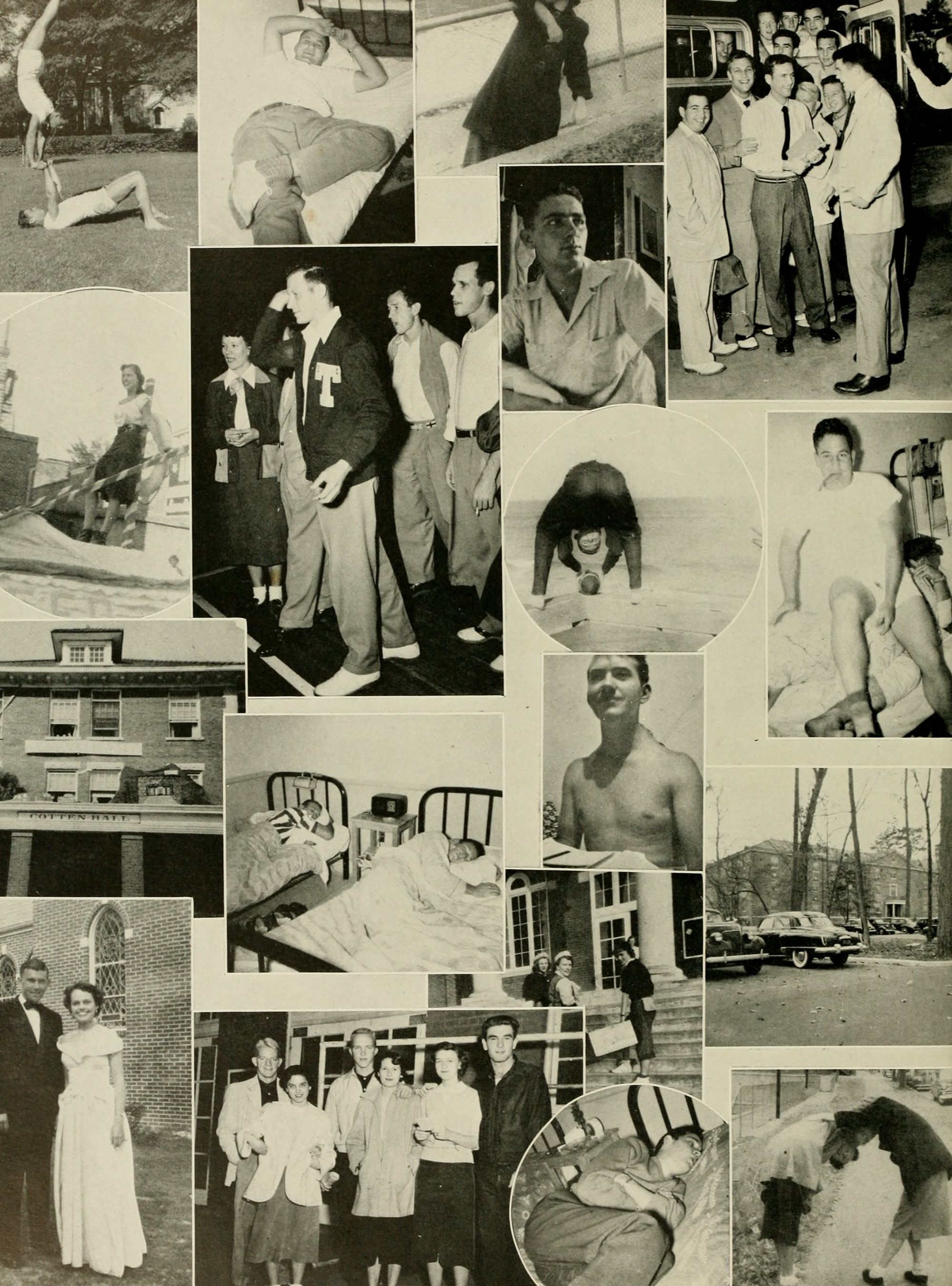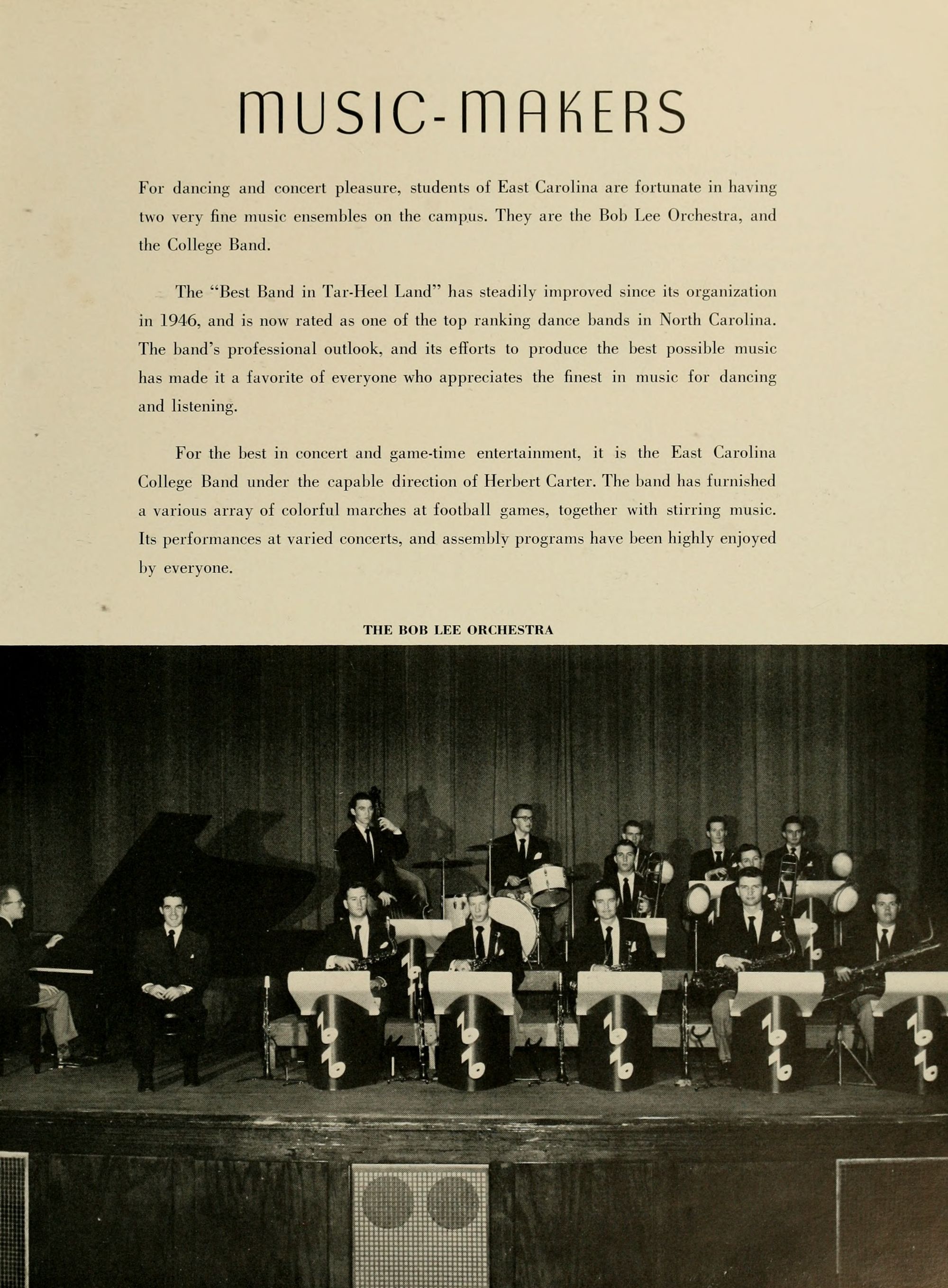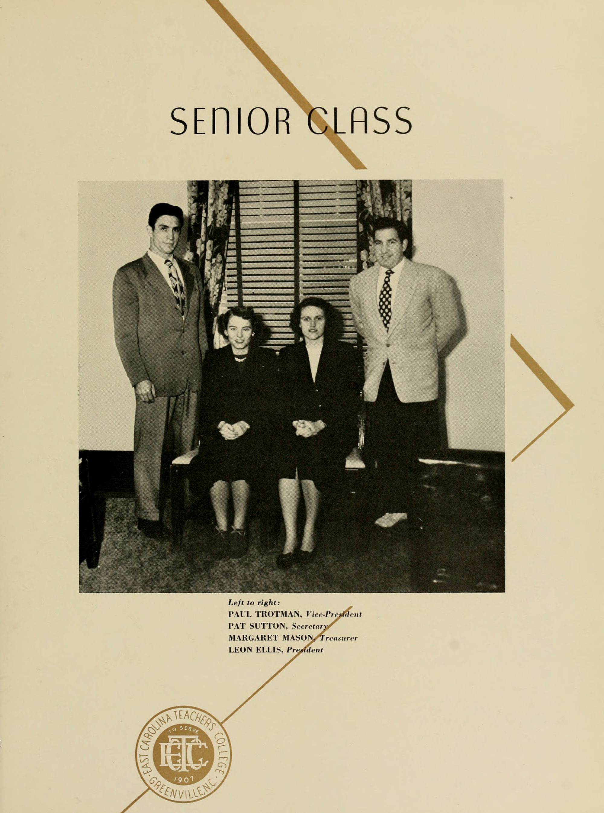 EAST CAROLINA ... the name and title which means so much to all who have trod upon her grounds ... the name which acts as a pin point, pricking and probing into the corners of one's mental machinery and bringing back phases of reminiscence that are so characteristic of well-rounded campus life. The pattern set for days and nights on the East Carolina campus sifts into a recipe of contentment and happiness. Classes in Graham, Flanagan, and grand old Austin . . . gym in Wright Building . . . crowds around post office boxes between classes, blocking the entrance to the dining hall ... the scurrying and confusion around Cotten Hall on Sunday nights when women students return to check in after week-ends off campus . . . the original jargon of the Soda Shop ciowd . . . the solemnity of the library . . . the variety of names dubbed on the men's dorms . . . these thoughts and so many more equally pleasant ones return spontaneously whenever EAST CAROLINA is mentioned. "Hail to thee, our dear ol' school!"