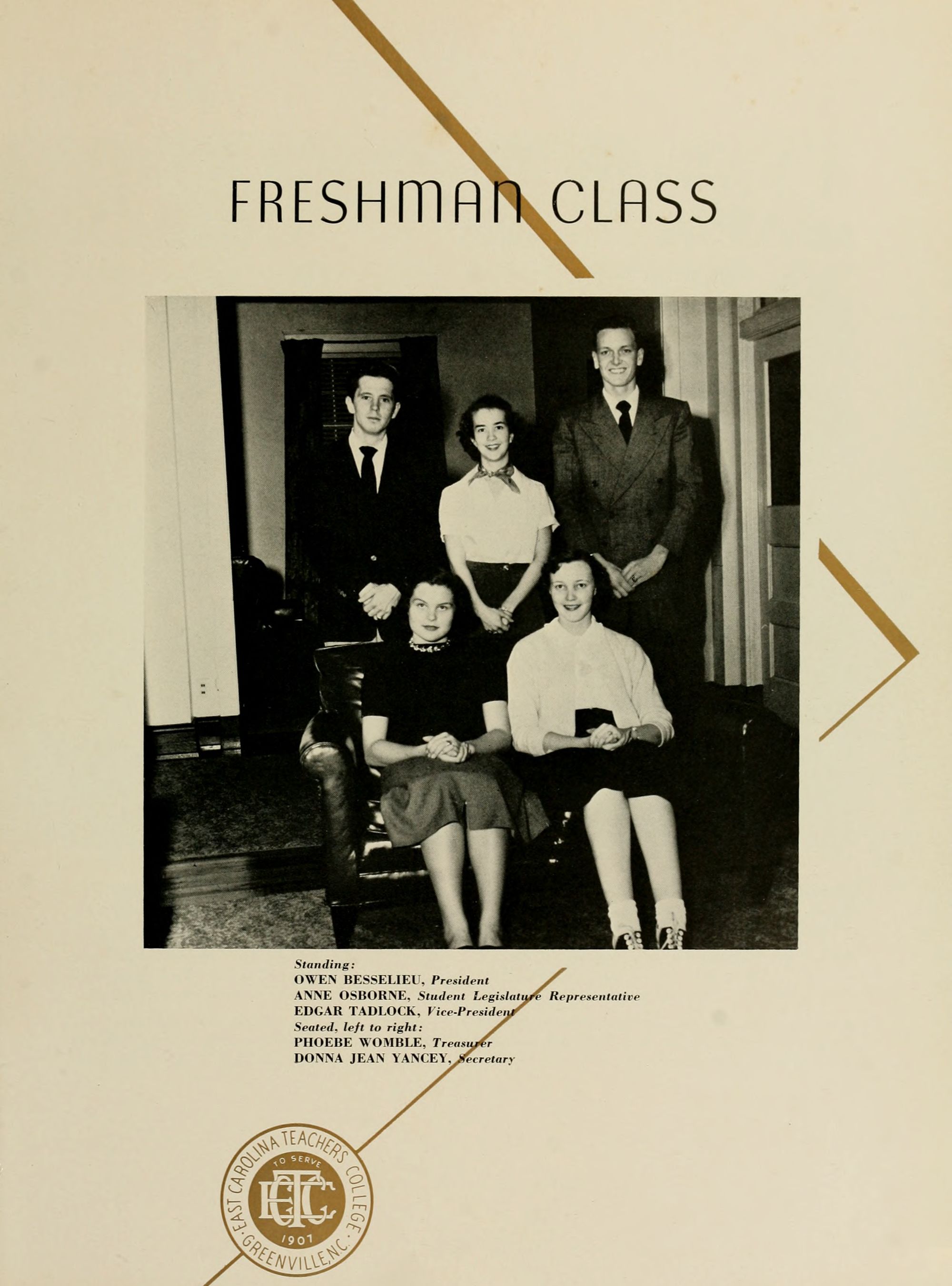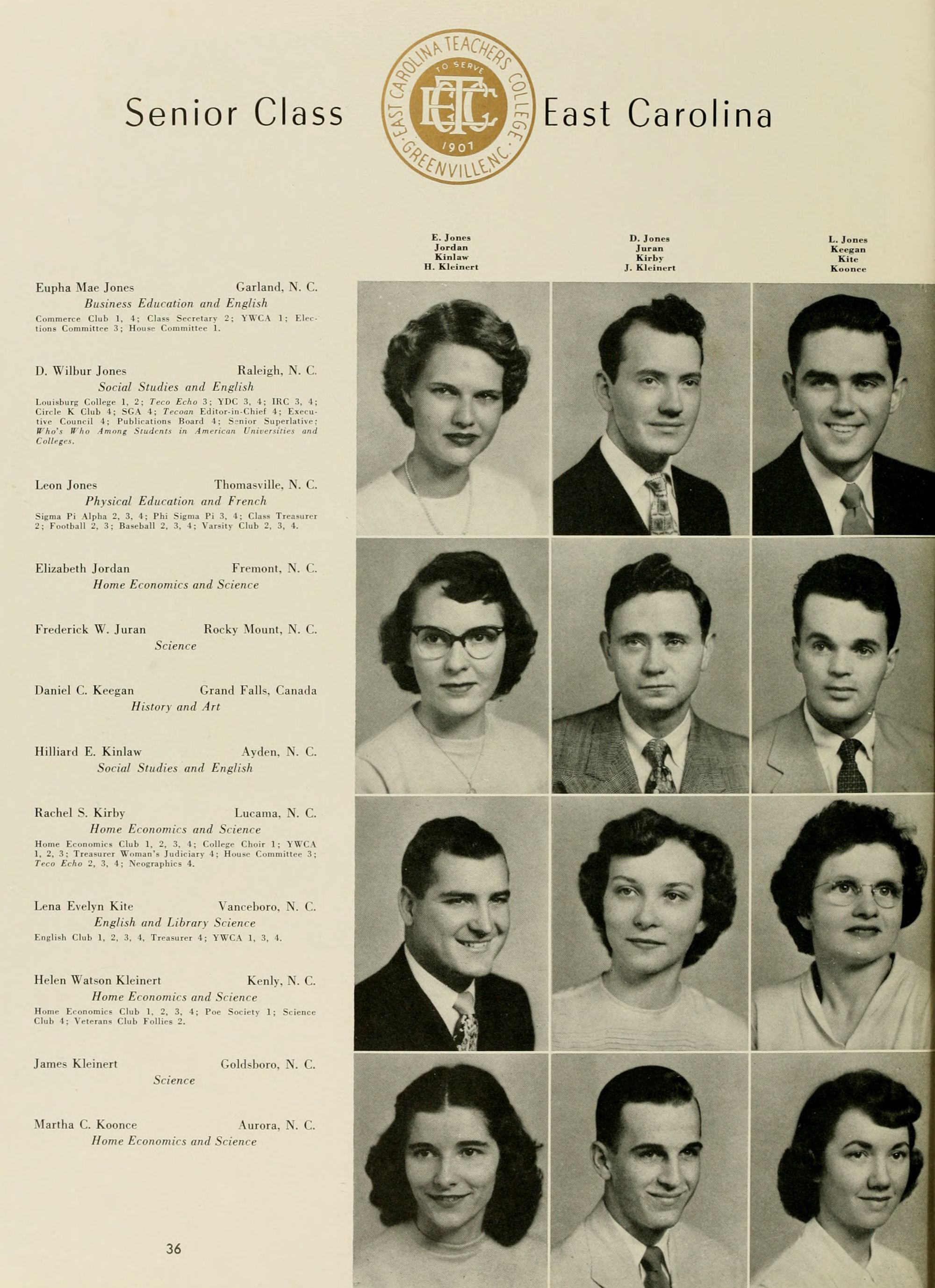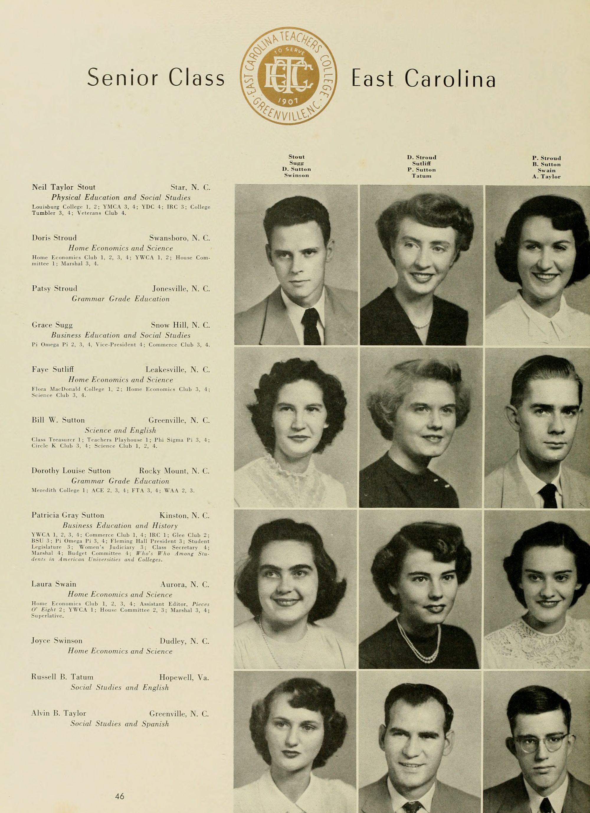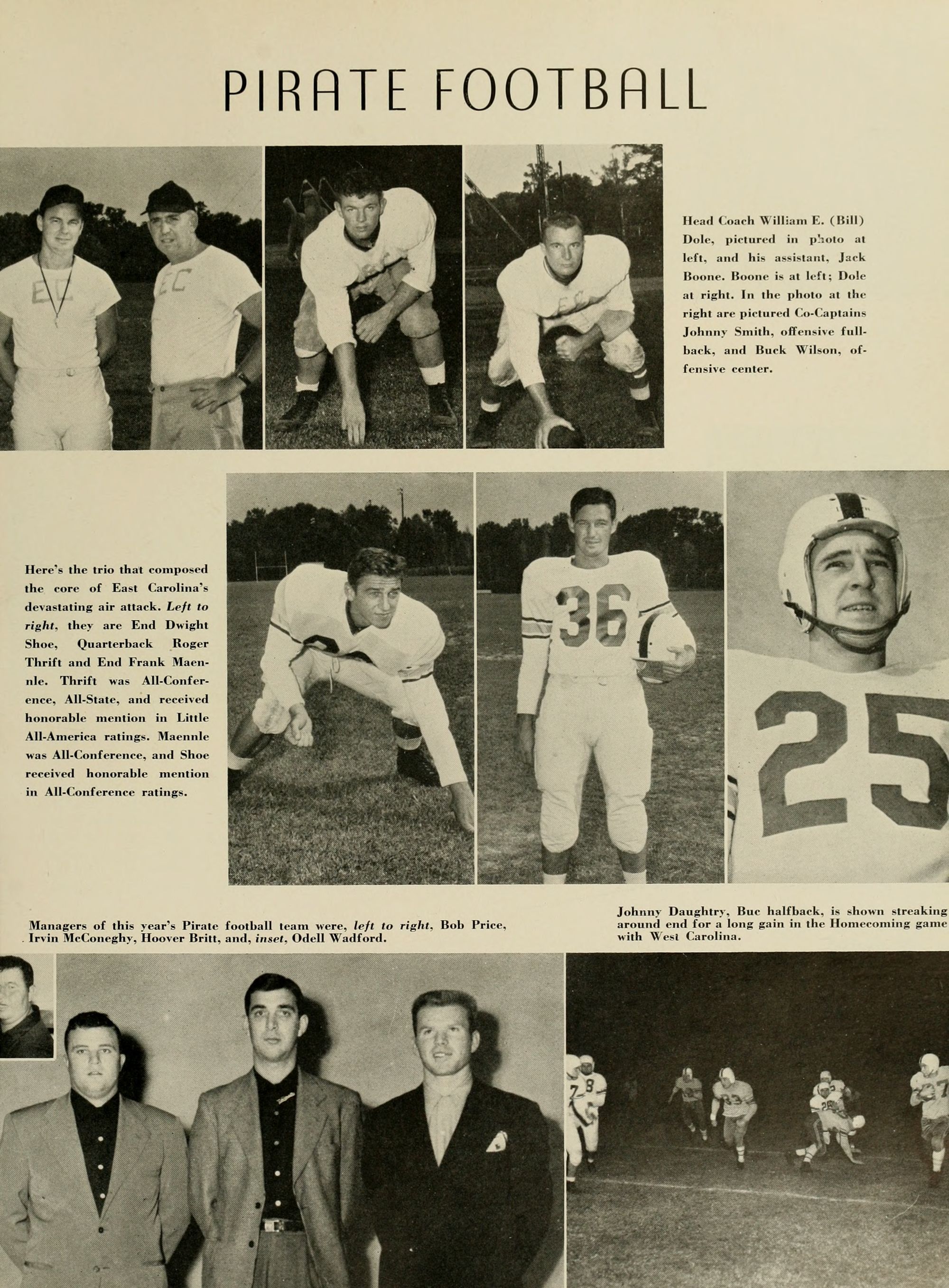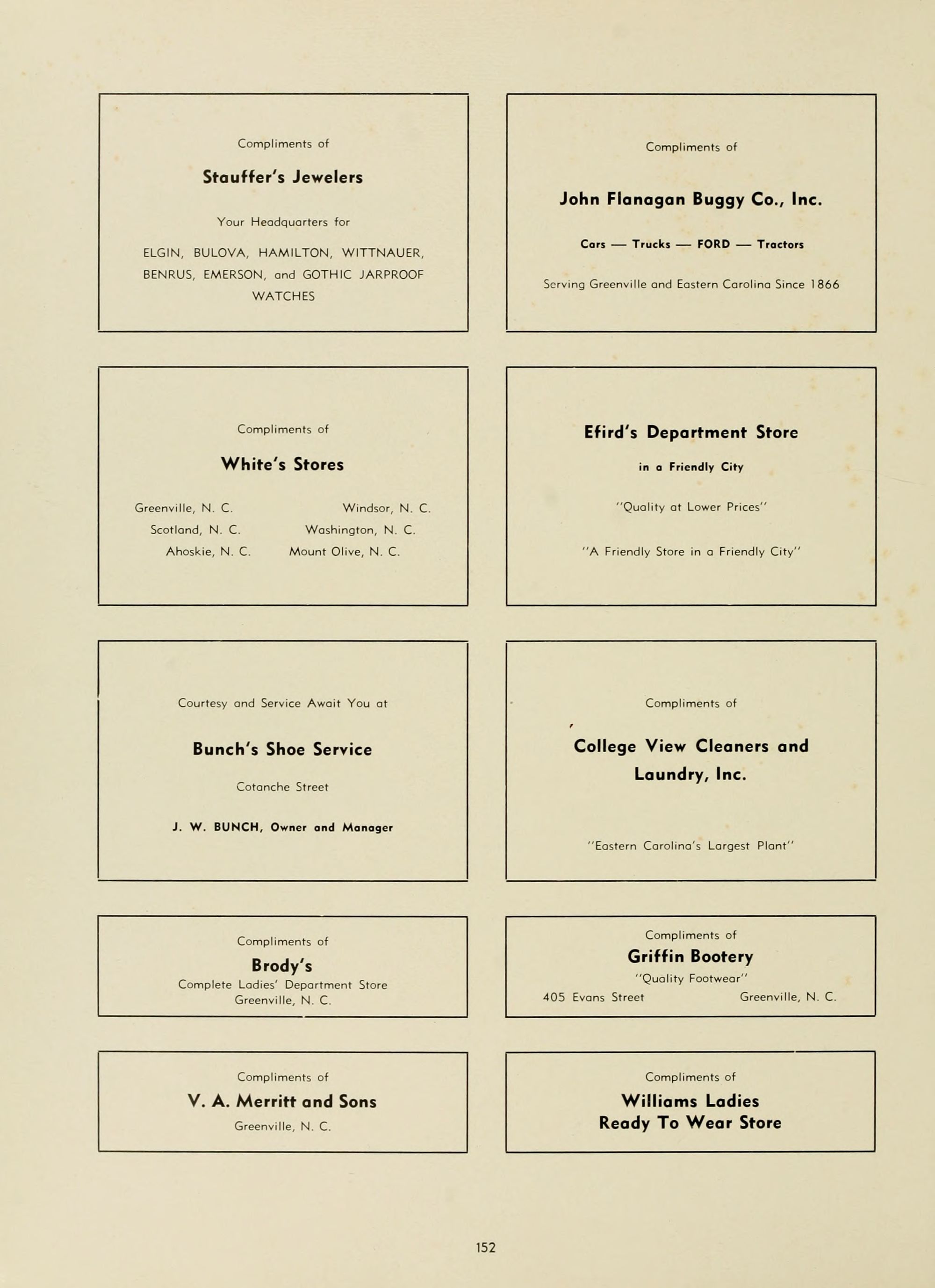EAST CAROLINA ... the name and title which means so much to all who have trod upon her grounds ... the name which acts as a pin point, pricking and probing into the corners of one's mental machinery and bringing back phases of reminiscence that are so characteristic of well-rounded campus life. The pattern set for days and nights on the East Carolina campus sifts into a recipe of contentment and happiness. Classes in Graham, Flanagan, and grand old Austin . . . gym in Wright Building . . . crowds around post office boxes between classes, blocking the entrance to the dining hall ... the scurrying and confusion around Cotten Hall on Sunday nights when women students return to check in after week-ends off campus . . . the original jargon of the Soda Shop ciowd . . . the solemnity of the library . . . the variety of names dubbed on the men's dorms . . . these thoughts and so many more equally pleasant ones return spontaneously whenever EAST CAROLINA is mentioned. "Hail to thee, our dear ol' school!"