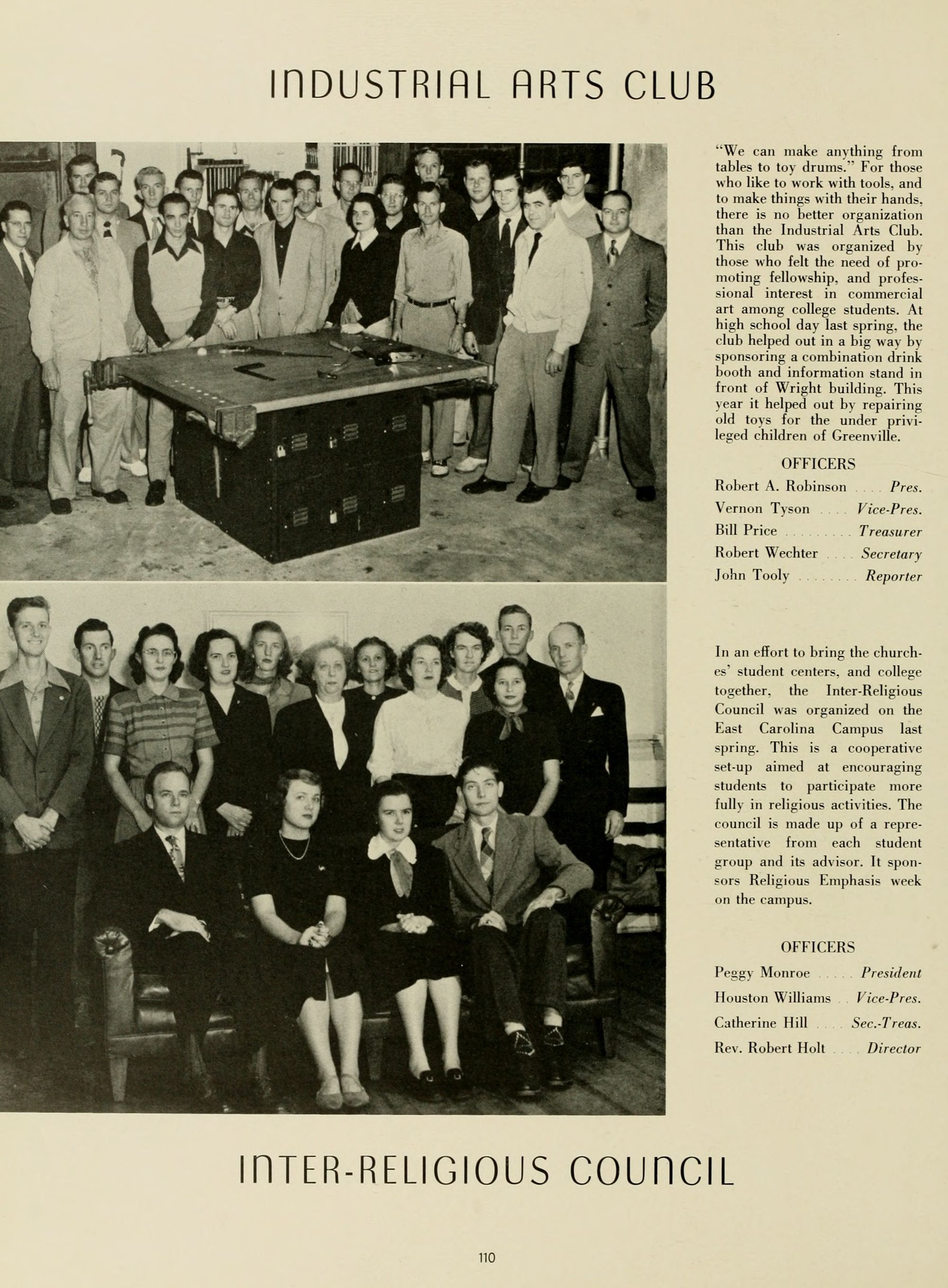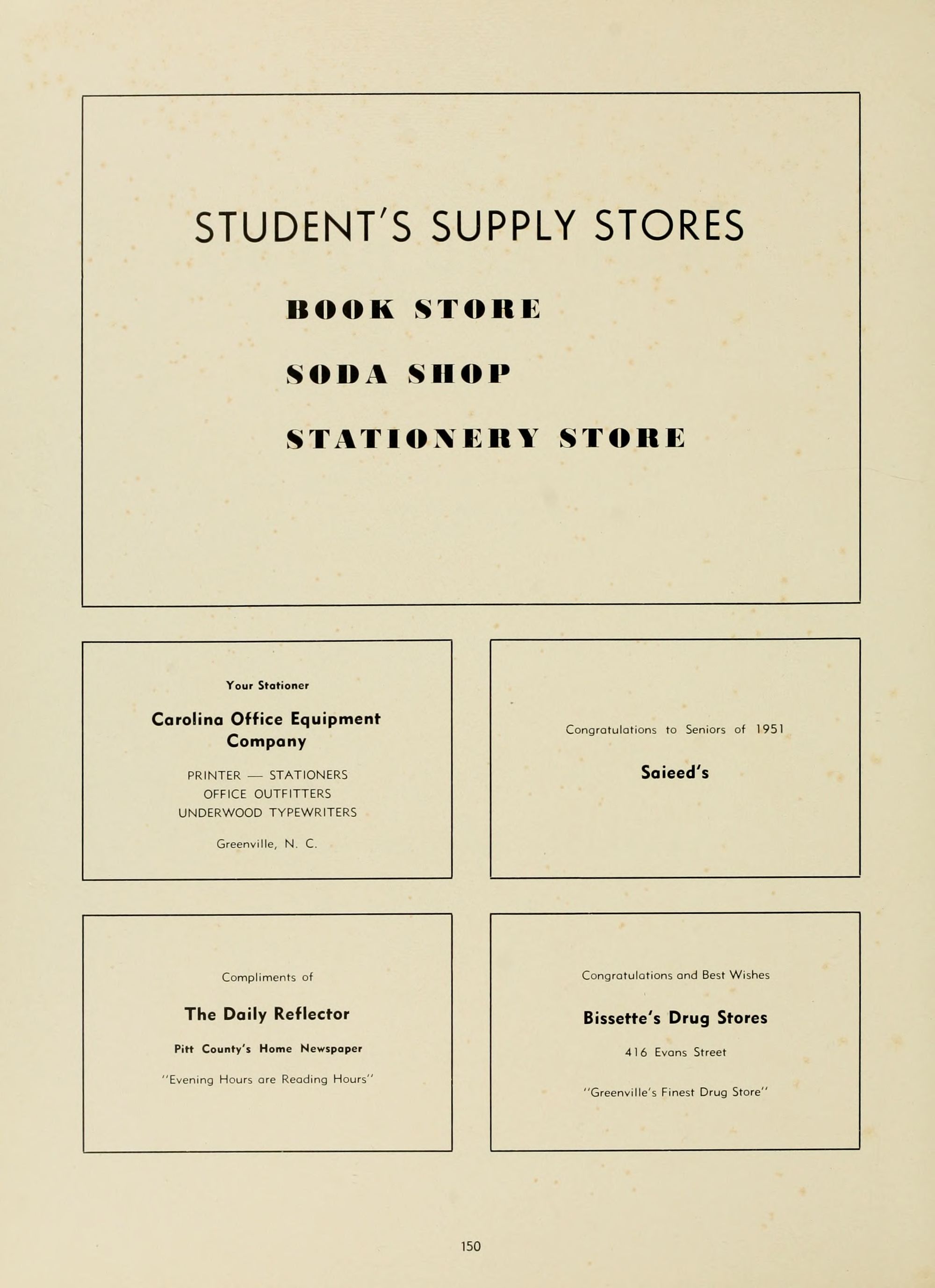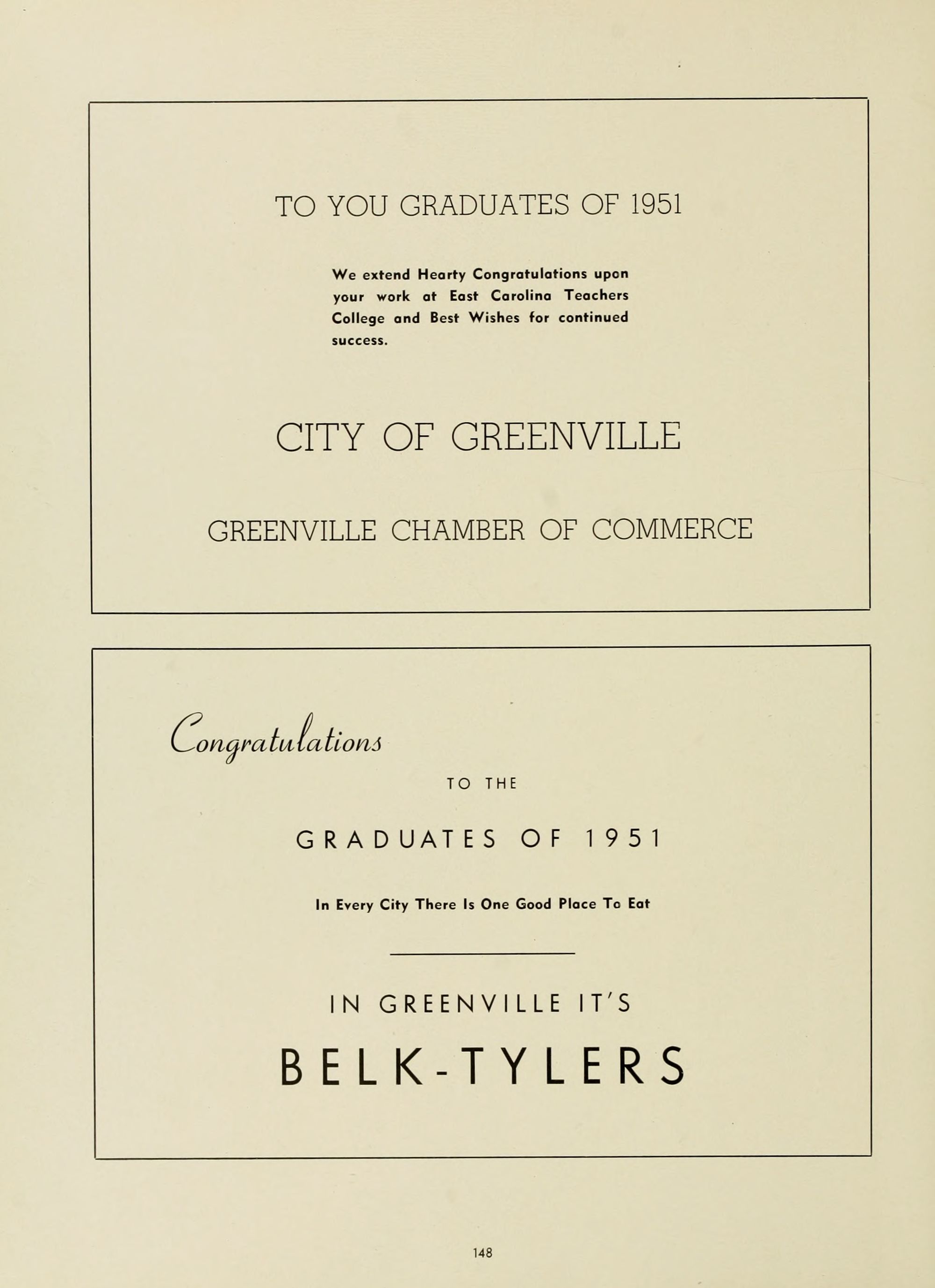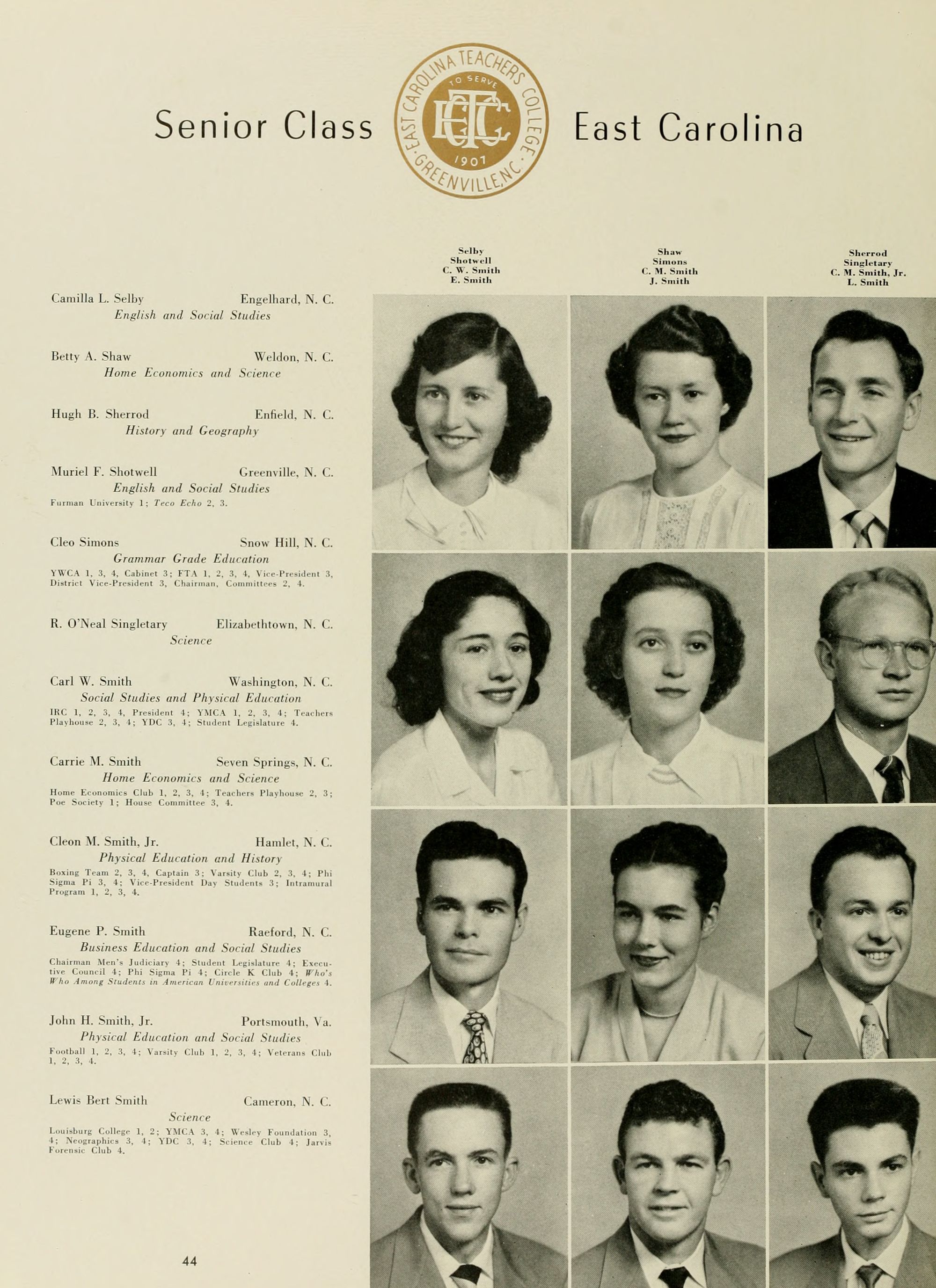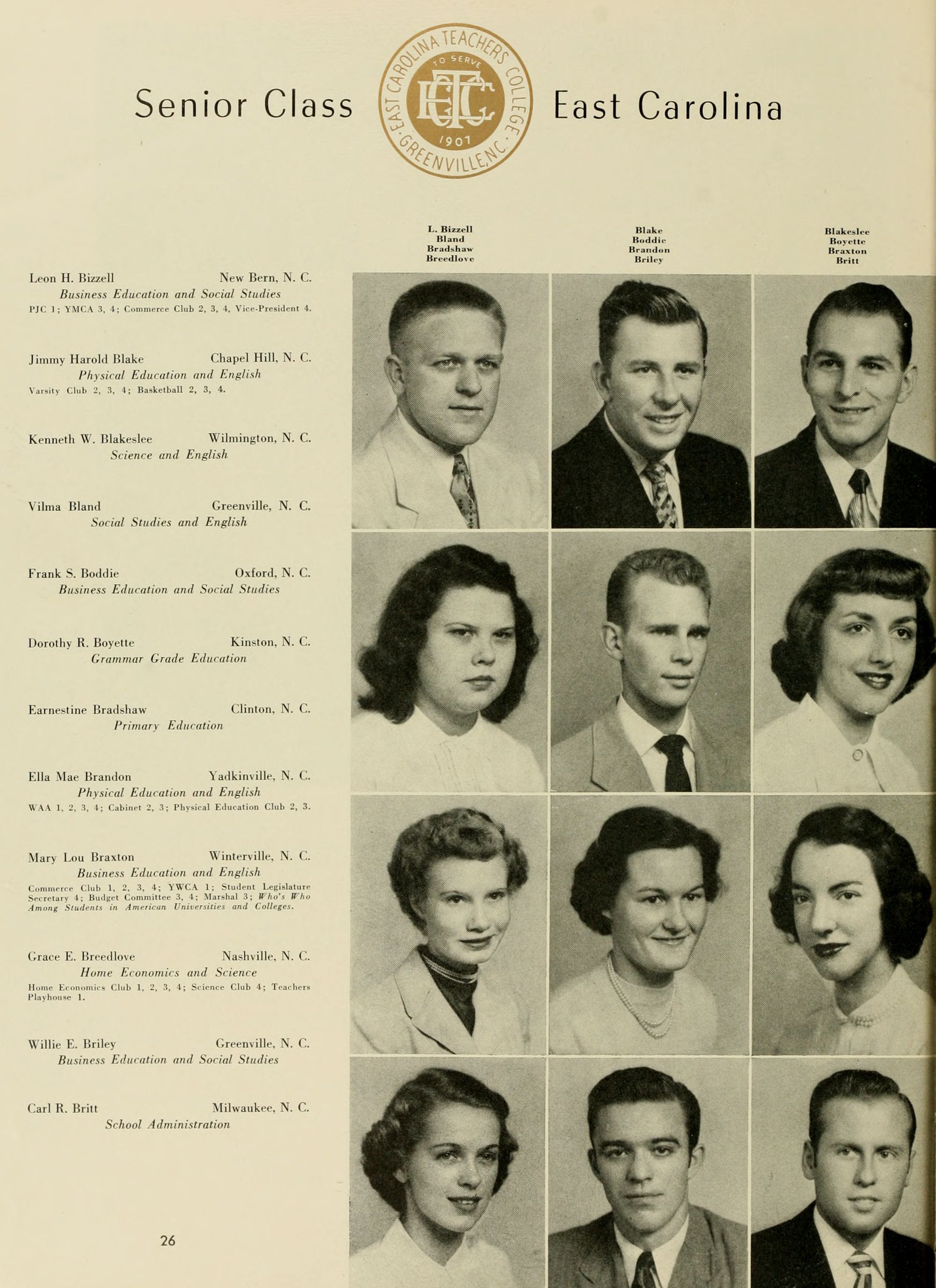 EAST CAROLINA ... the name and title which means so much to all who have trod upon her grounds ... the name which acts as a pin point, pricking and probing into the corners of one's mental machinery and bringing back phases of reminiscence that are so characteristic of well-rounded campus life. The pattern set for days and nights on the East Carolina campus sifts into a recipe of contentment and happiness. Classes in Graham, Flanagan, and grand old Austin . . . gym in Wright Building . . . crowds around post office boxes between classes, blocking the entrance to the dining hall ... the scurrying and confusion around Cotten Hall on Sunday nights when women students return to check in after week-ends off campus . . . the original jargon of the Soda Shop ciowd . . . the solemnity of the library . . . the variety of names dubbed on the men's dorms . . . these thoughts and so many more equally pleasant ones return spontaneously whenever EAST CAROLINA is mentioned. "Hail to thee, our dear ol' school!"