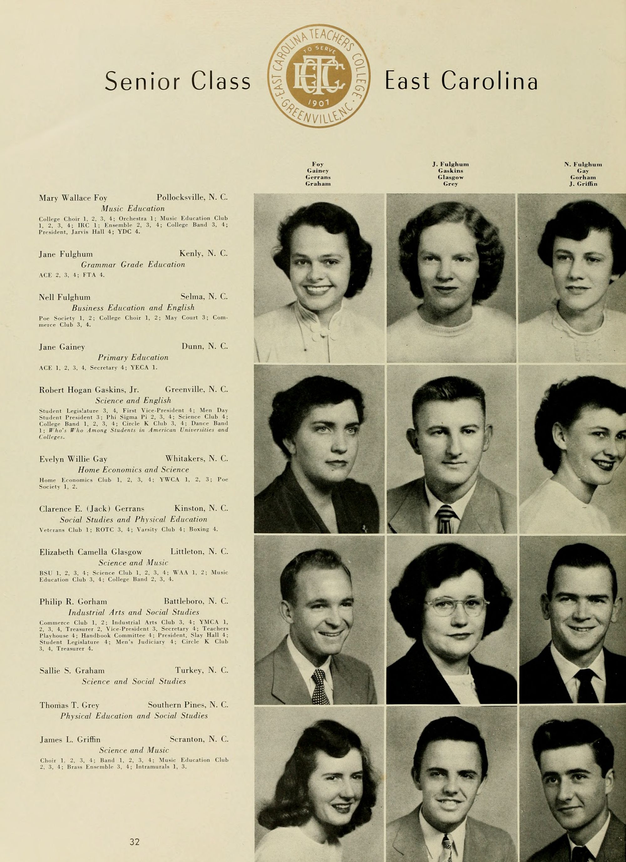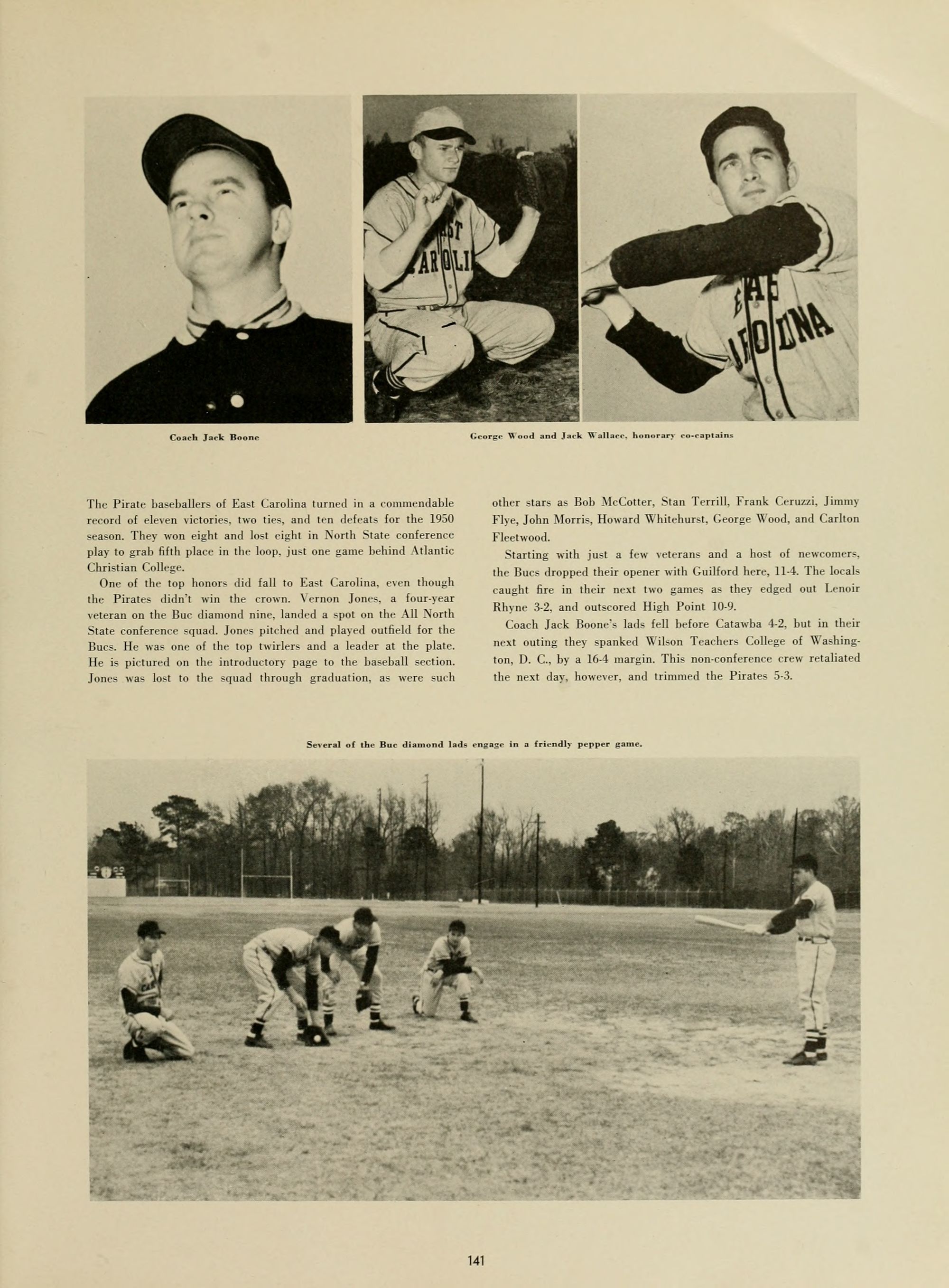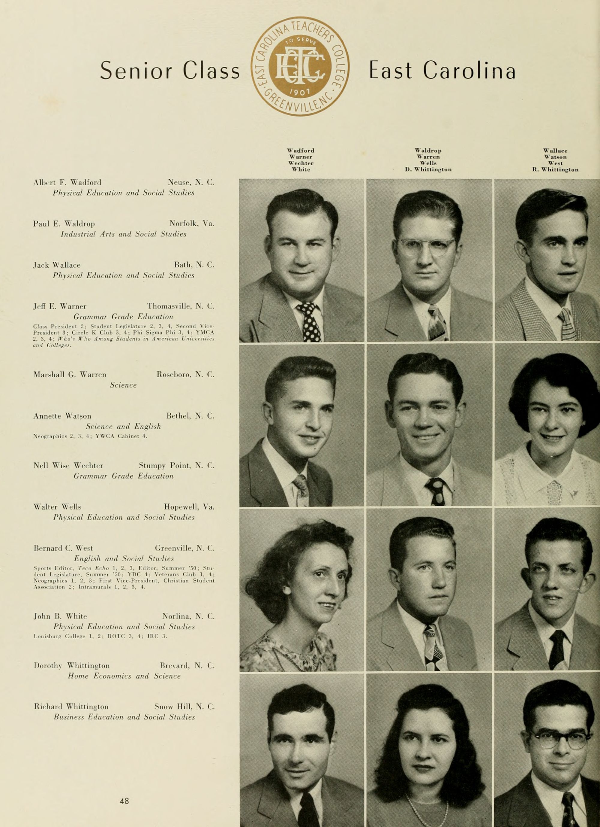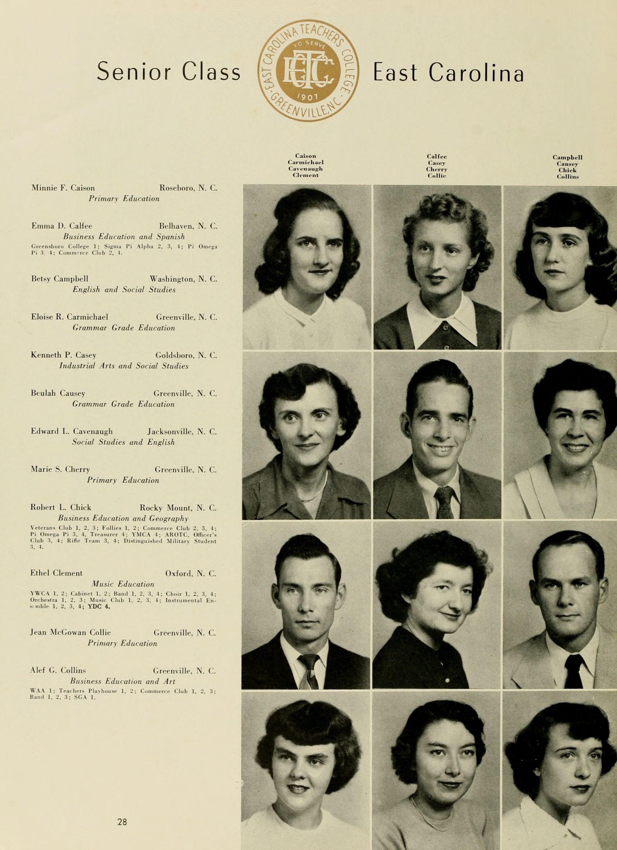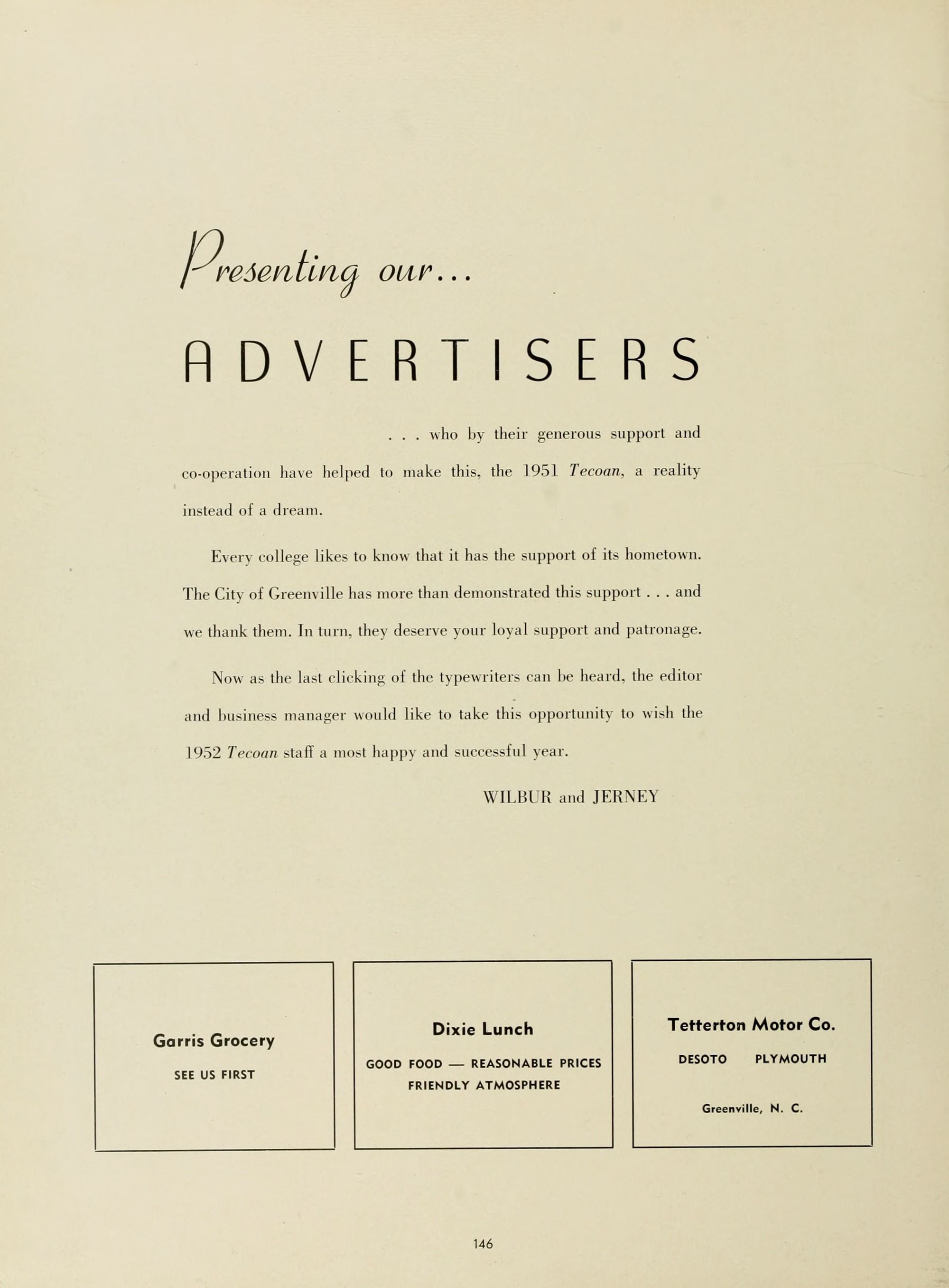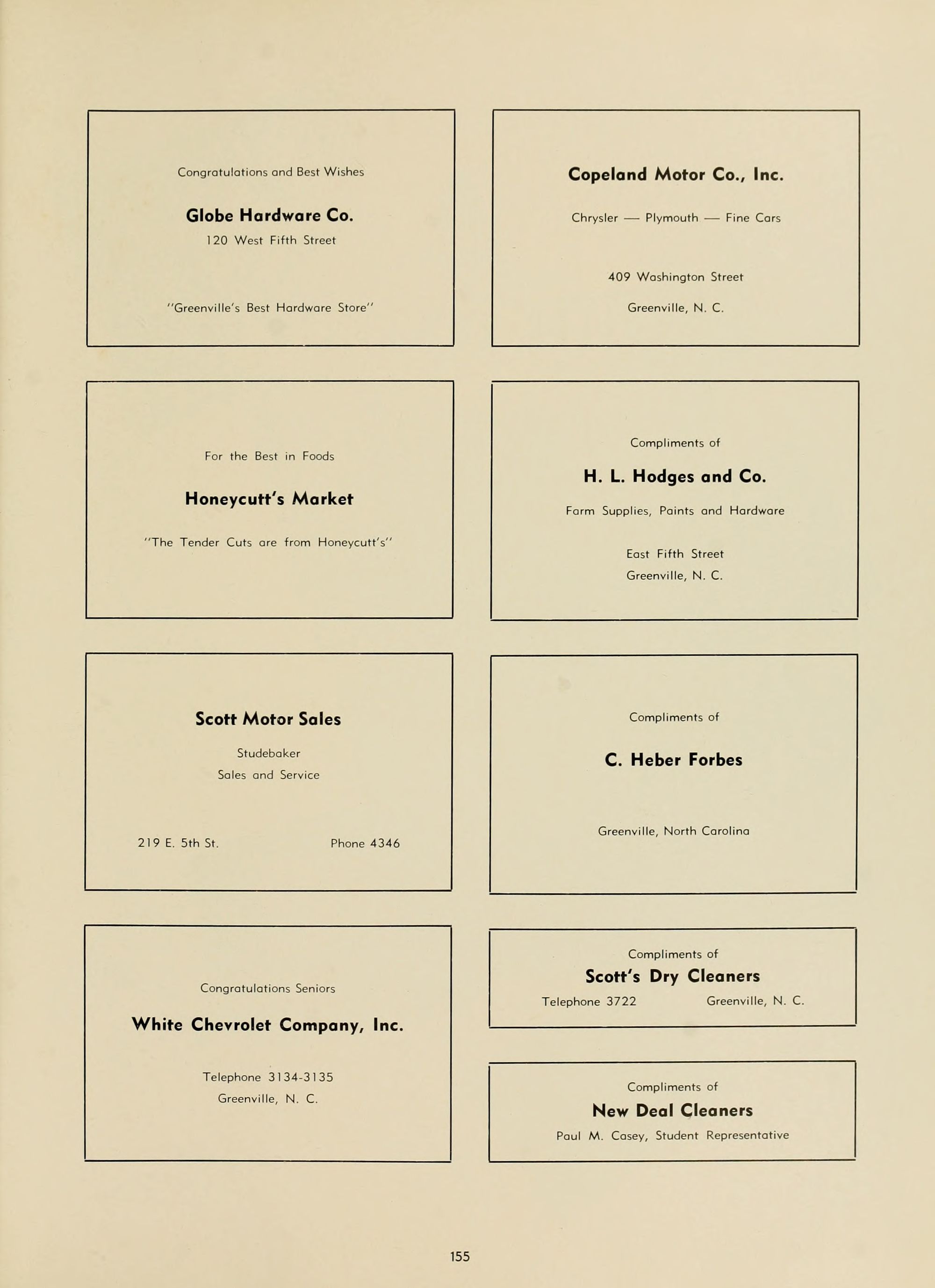 EAST CAROLINA ... the name and title which means so much to all who have trod upon her grounds ... the name which acts as a pin point, pricking and probing into the corners of one's mental machinery and bringing back phases of reminiscence that are so characteristic of well-rounded campus life. The pattern set for days and nights on the East Carolina campus sifts into a recipe of contentment and happiness. Classes in Graham, Flanagan, and grand old Austin . . . gym in Wright Building . . . crowds around post office boxes between classes, blocking the entrance to the dining hall ... the scurrying and confusion around Cotten Hall on Sunday nights when women students return to check in after week-ends off campus . . . the original jargon of the Soda Shop ciowd . . . the solemnity of the library . . . the variety of names dubbed on the men's dorms . . . these thoughts and so many more equally pleasant ones return spontaneously whenever EAST CAROLINA is mentioned. "Hail to thee, our dear ol' school!"